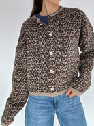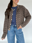 The Priscilla Leopard Cardigan is the kind of layer that instantly makes an outfit feel more fun. Designed in a soft knit with a bold leopard print, it has a structured, boxy fit that still feels cozy and relaxed. The rolled collar and button front add a little polish, while the dropped shoulders keep it easy to wear with everything from denim to wide leg sweatpants.