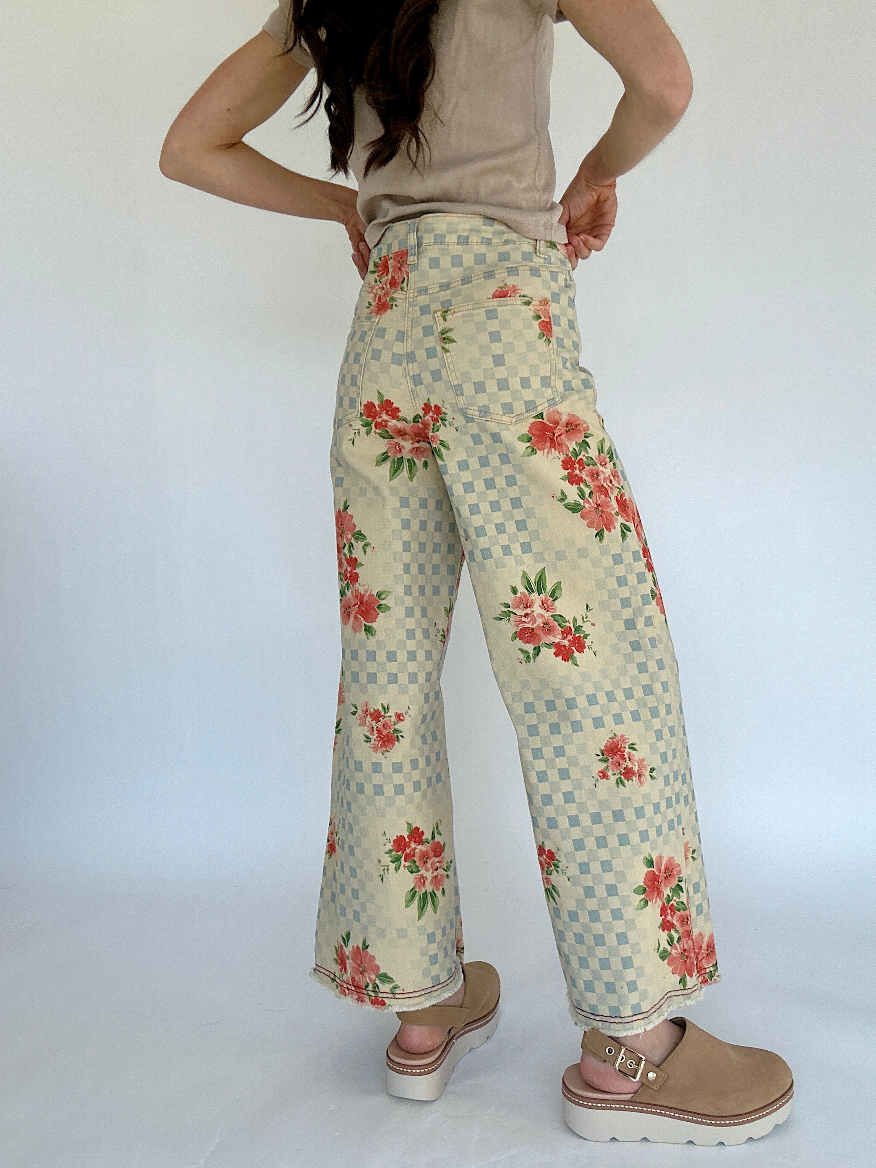From weekend brunches to city strolls, the Check For Flowers Pants are your new favorite statement piece. With a fun checker-and-floral print, cropped wide-leg silhouette, and relaxed fit, these pants make it easy to turn heads while keeping your look effortless. The washed stretch twill gives them a soft, lived-in feel, and the classic five-pocket design keeps it practical—style them with a tee, blouse, or cropped sweater for instant outfit impact.
