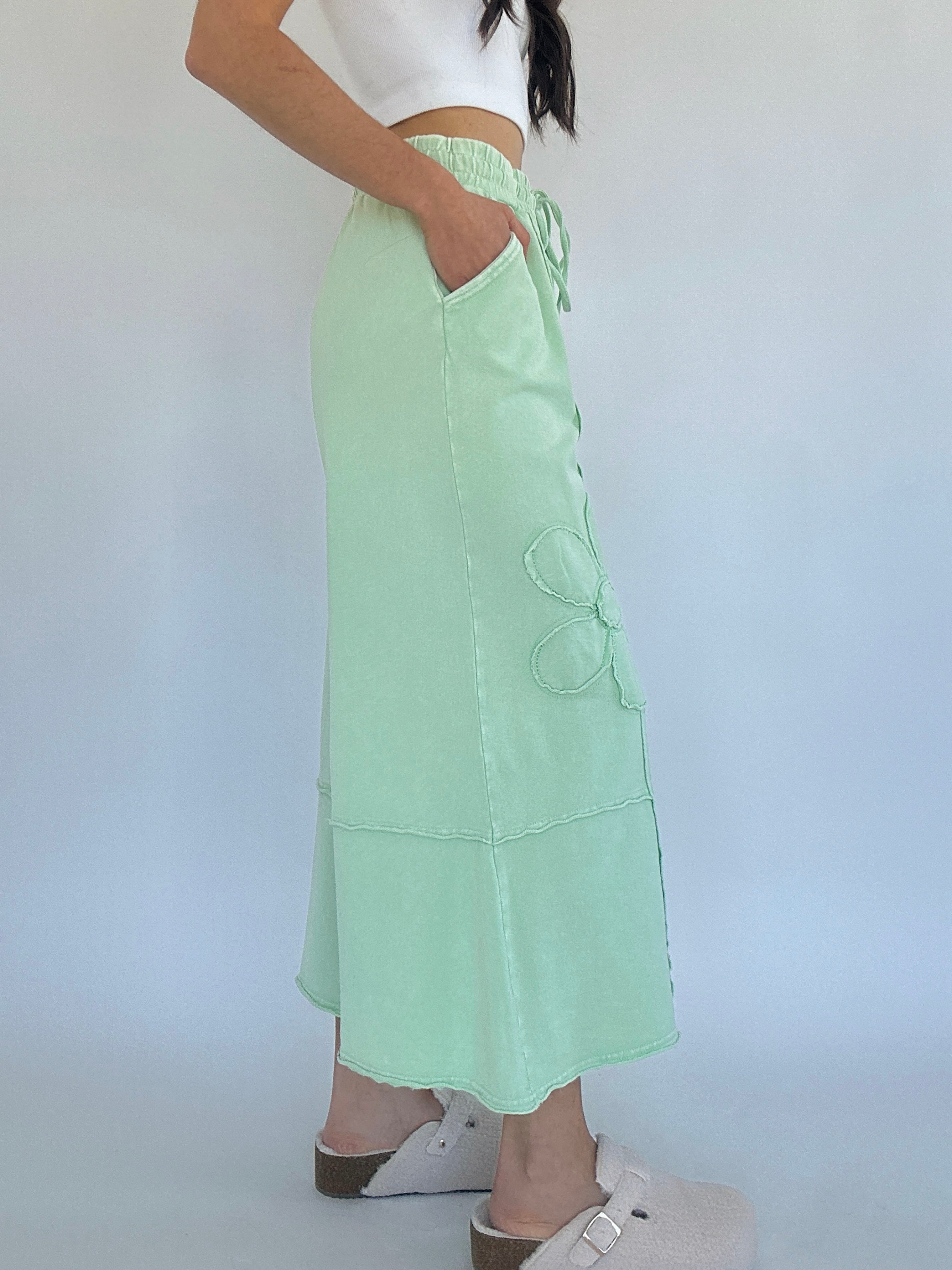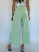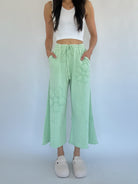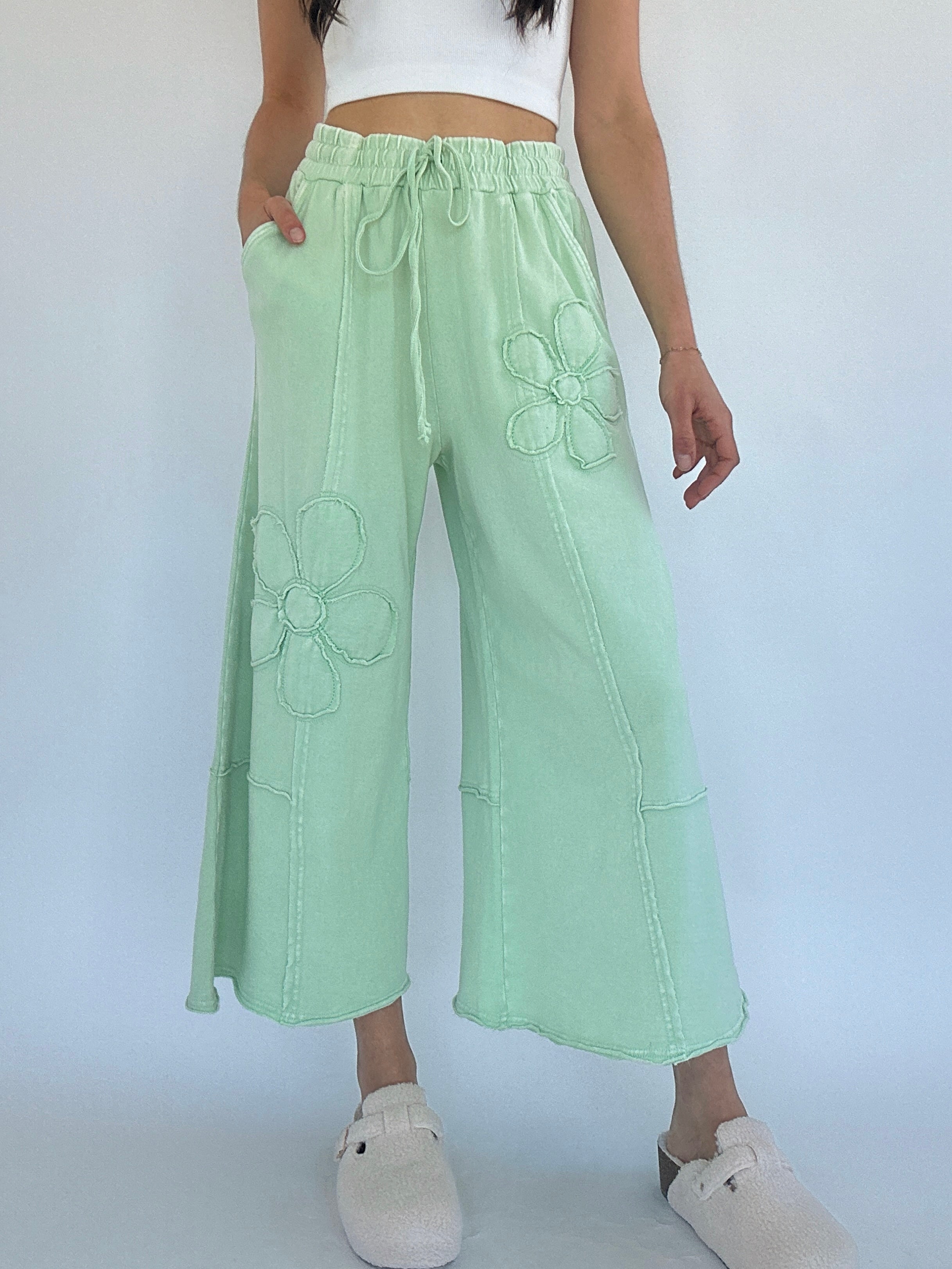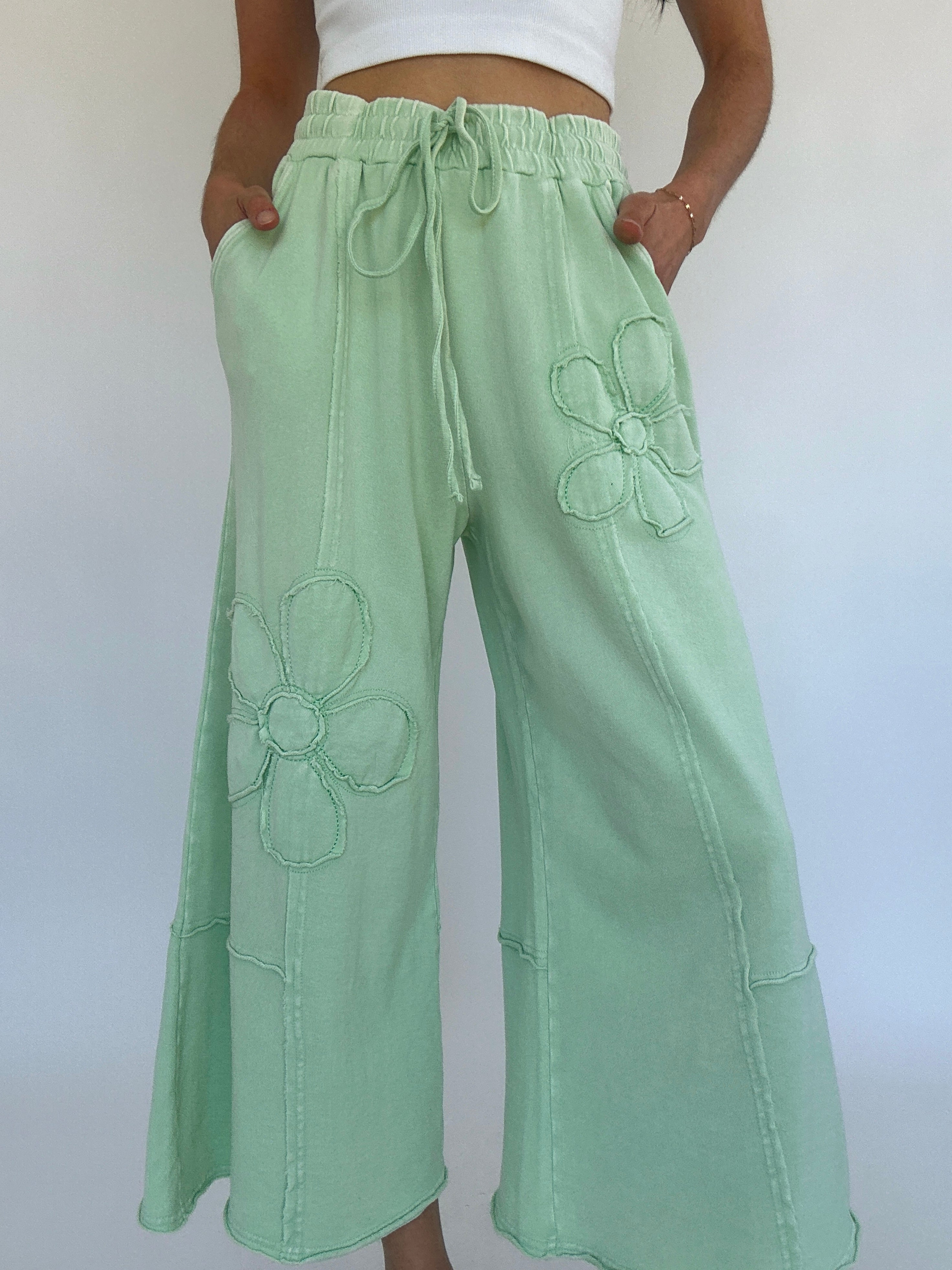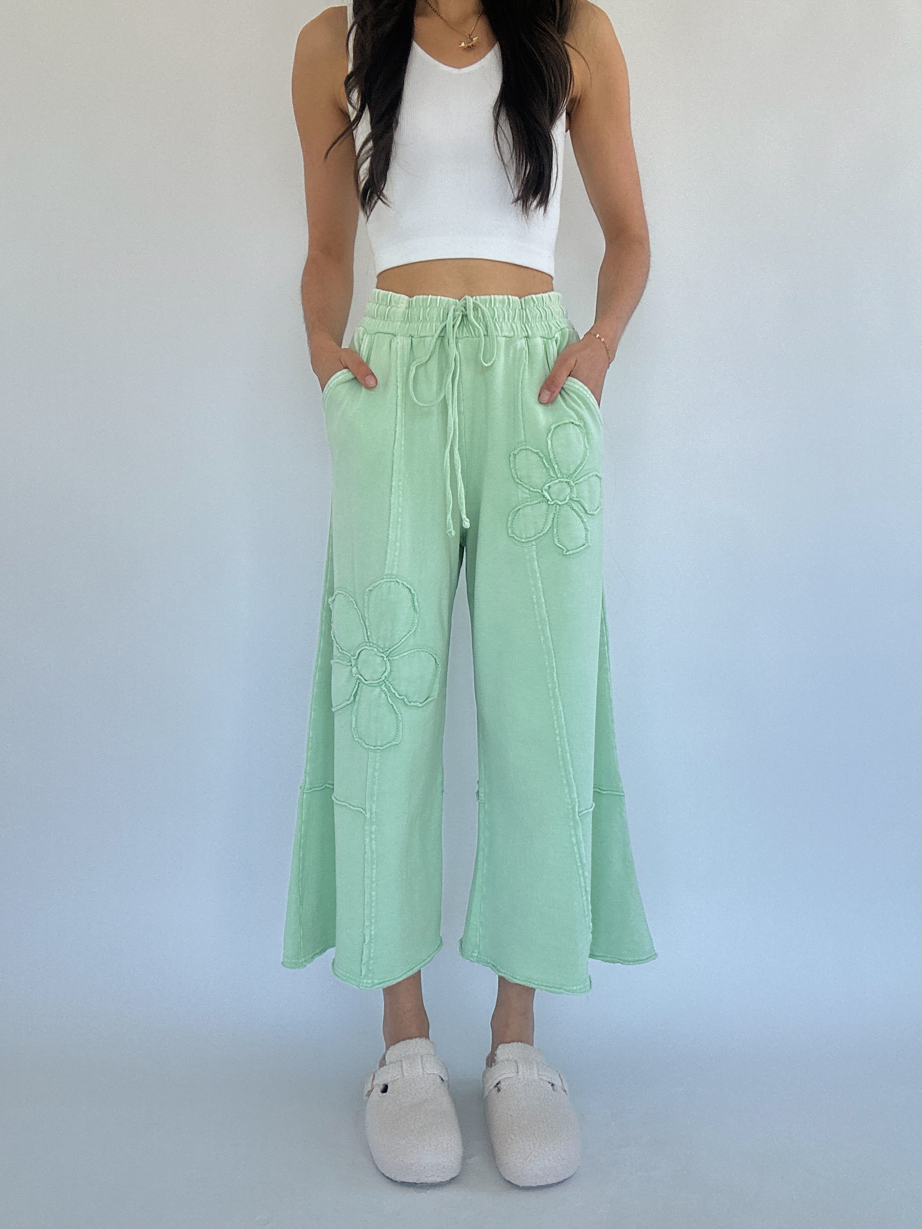 They’re cropped just above the ankle with a raw hem, plus side pockets and an adjustable drawstring waist to keep things functional and flattering. The light apple green tone is a fun pop of color to add to your wardrobe and the textured floral detailing makes them feel just a little extra—in the best way possible!