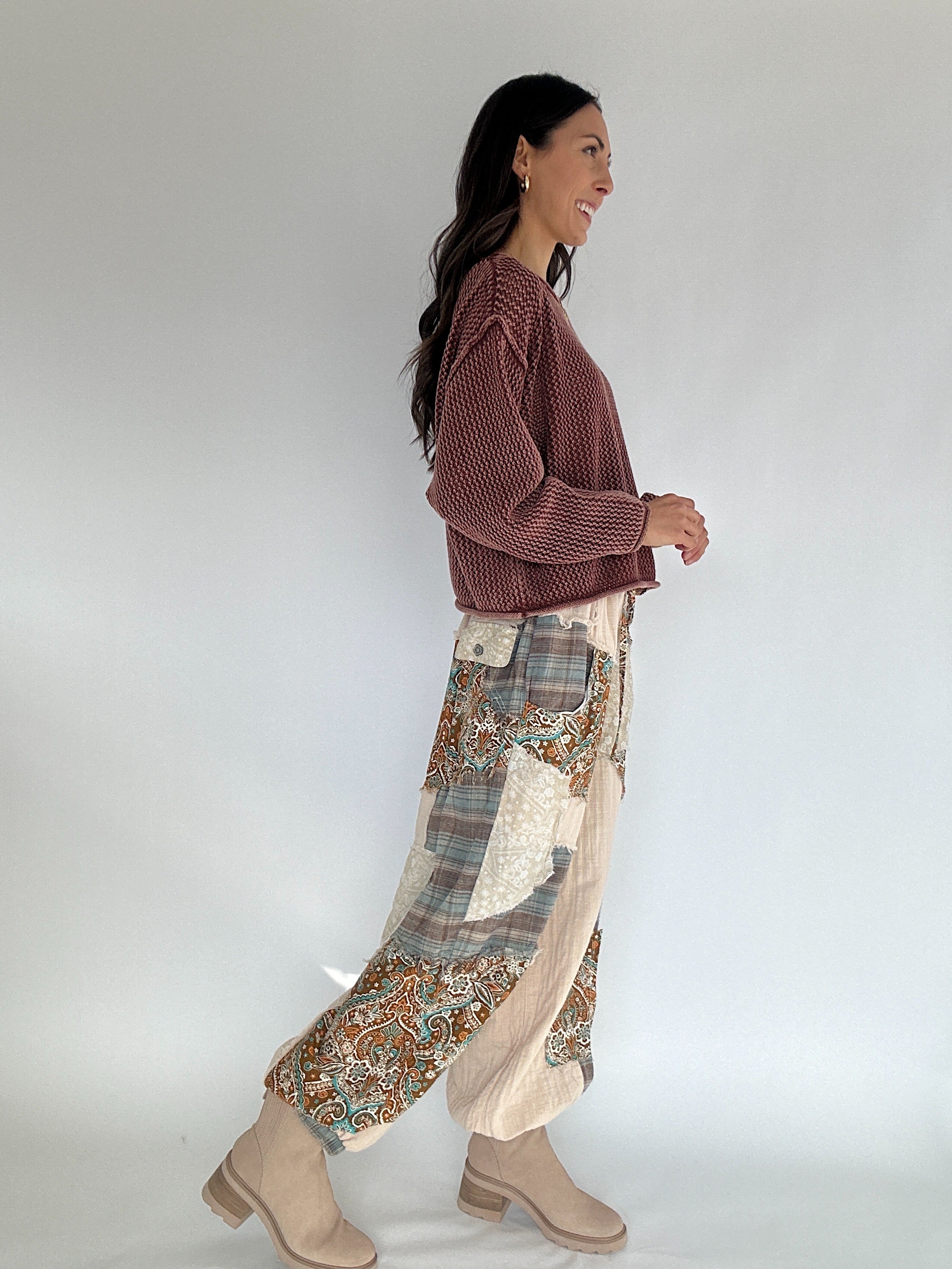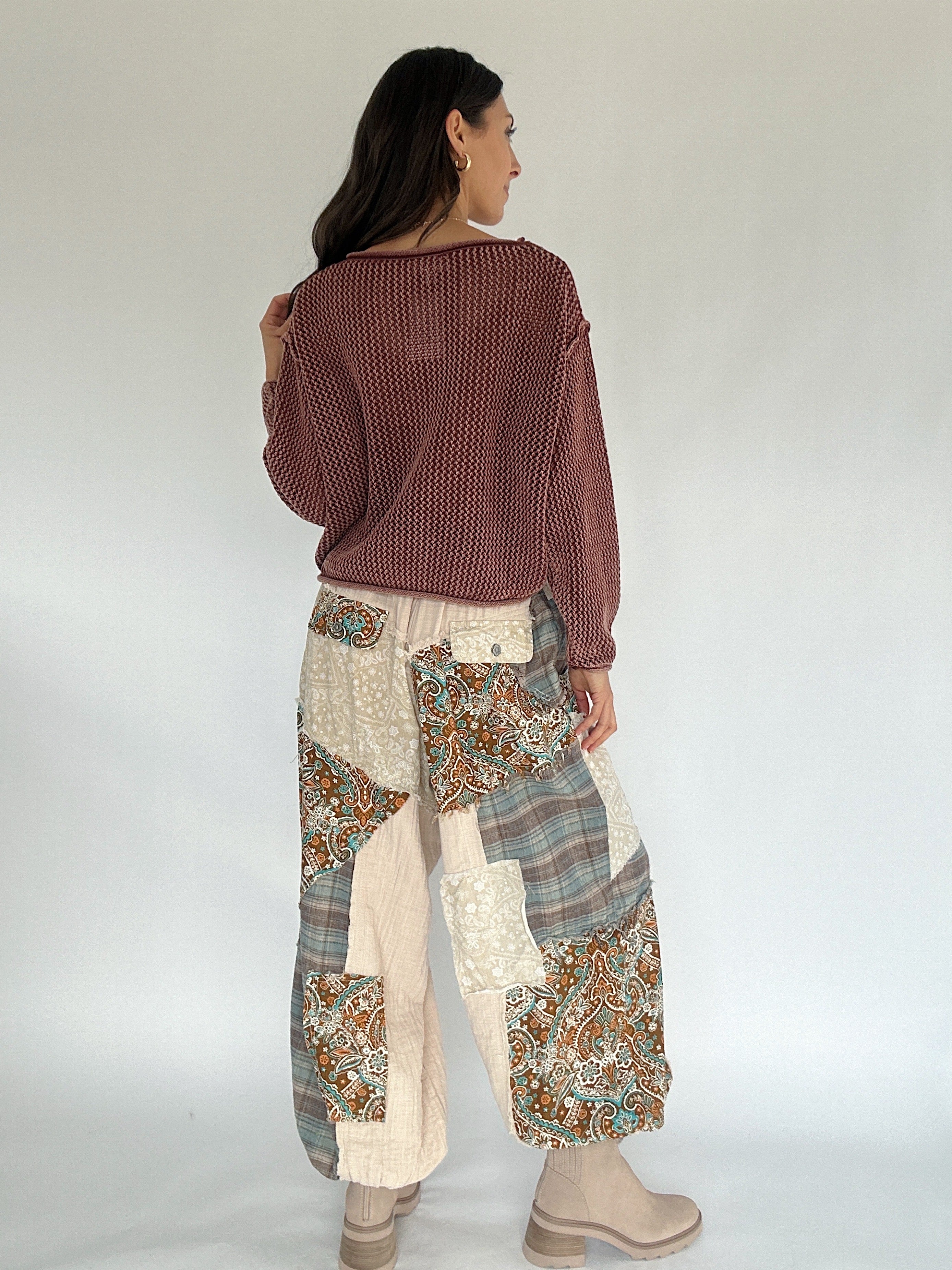 An effortless free-spirited vibe, the Janson Paisley Patch Jogger Pants bring texture, color, and comfort together in your new favorite pants. Designed in lightweight gauze, they feature pointed paisley patchwork with frayed edge details, plus added back pocket flaps for a little extra charm. Finished with an elastic waistband and drawstring, cinched hems, and side pockets, these relaxed joggers are made for laid-back days with a touch of personality.