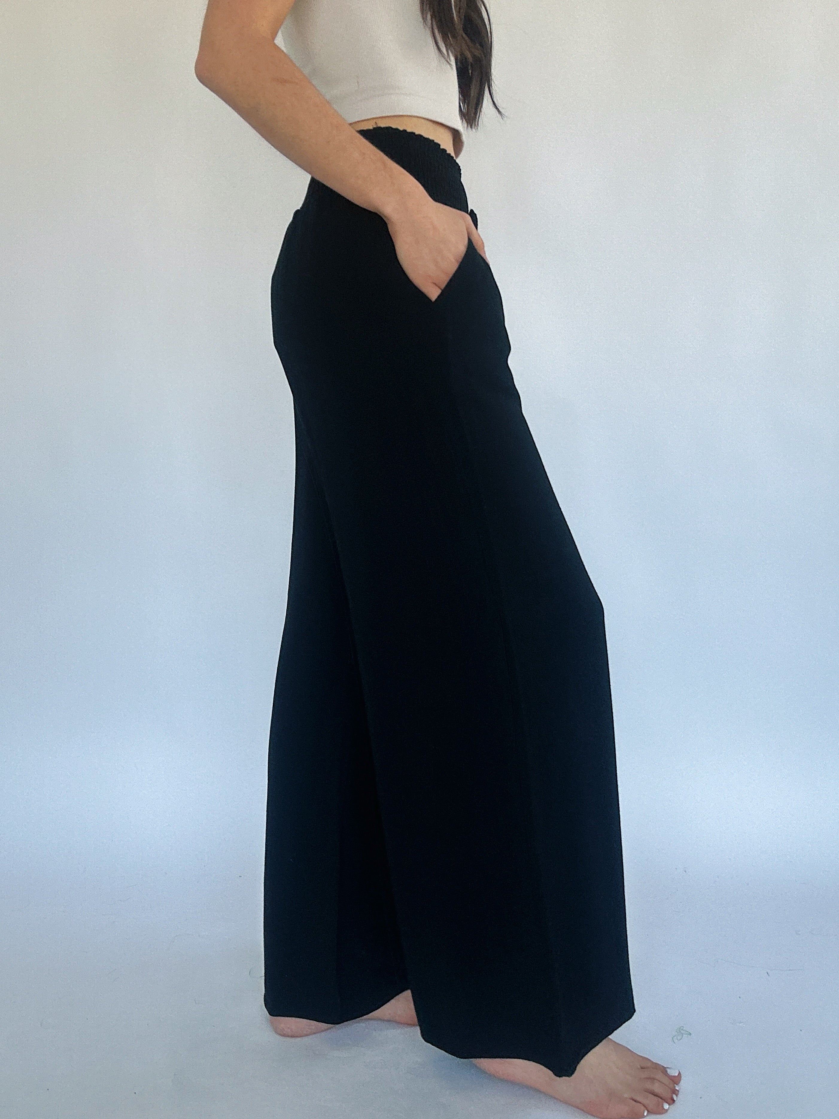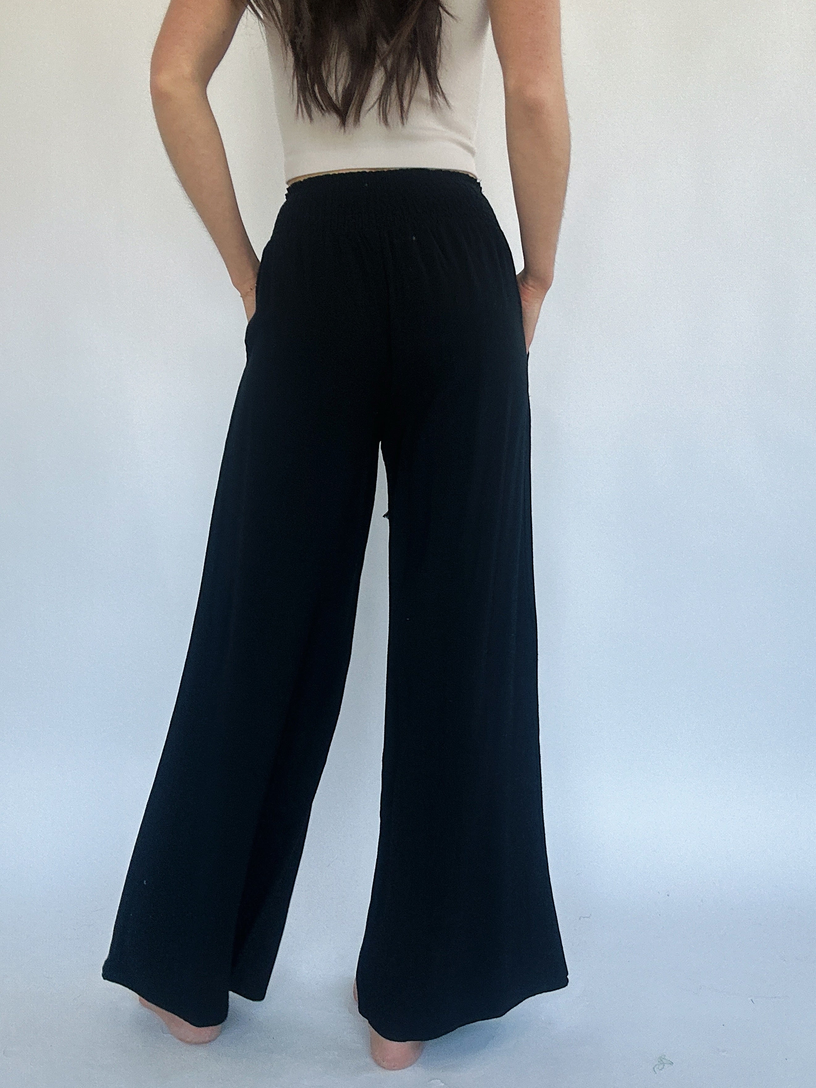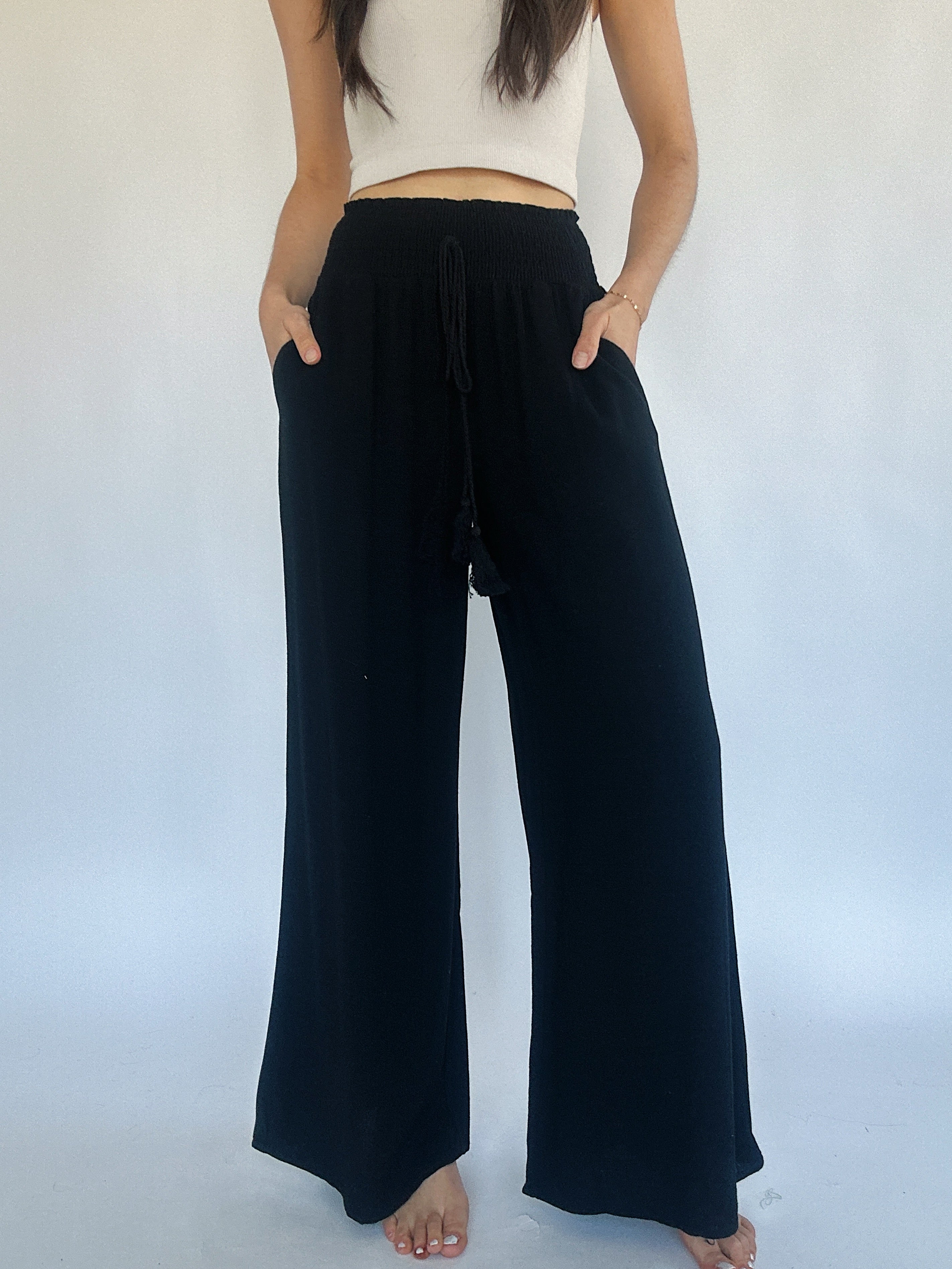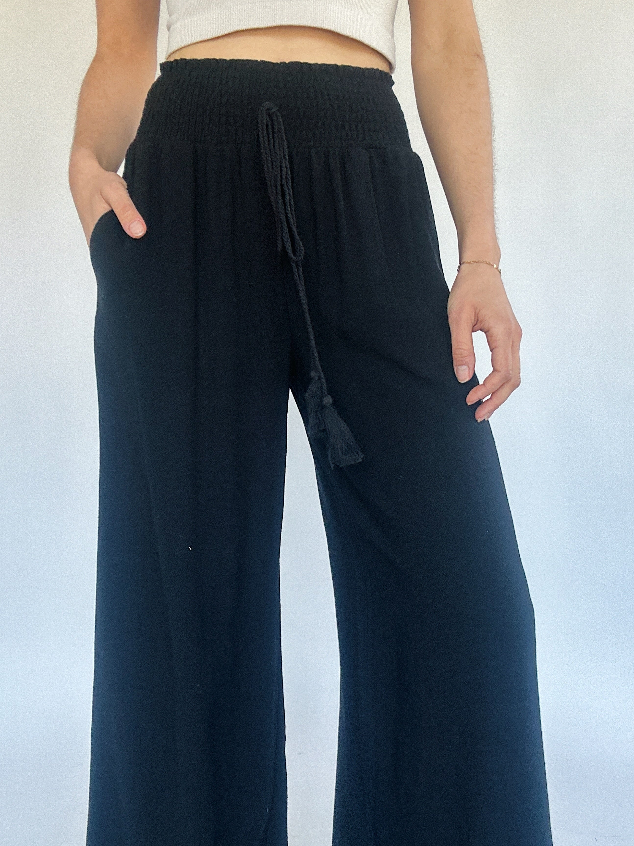 These black cotton linen pants have a wide leg fit with a smocked elastic top and tassel tie. They have a loose fit and side pockets. Easy to pair with light weight sweaters, tanks and tees!