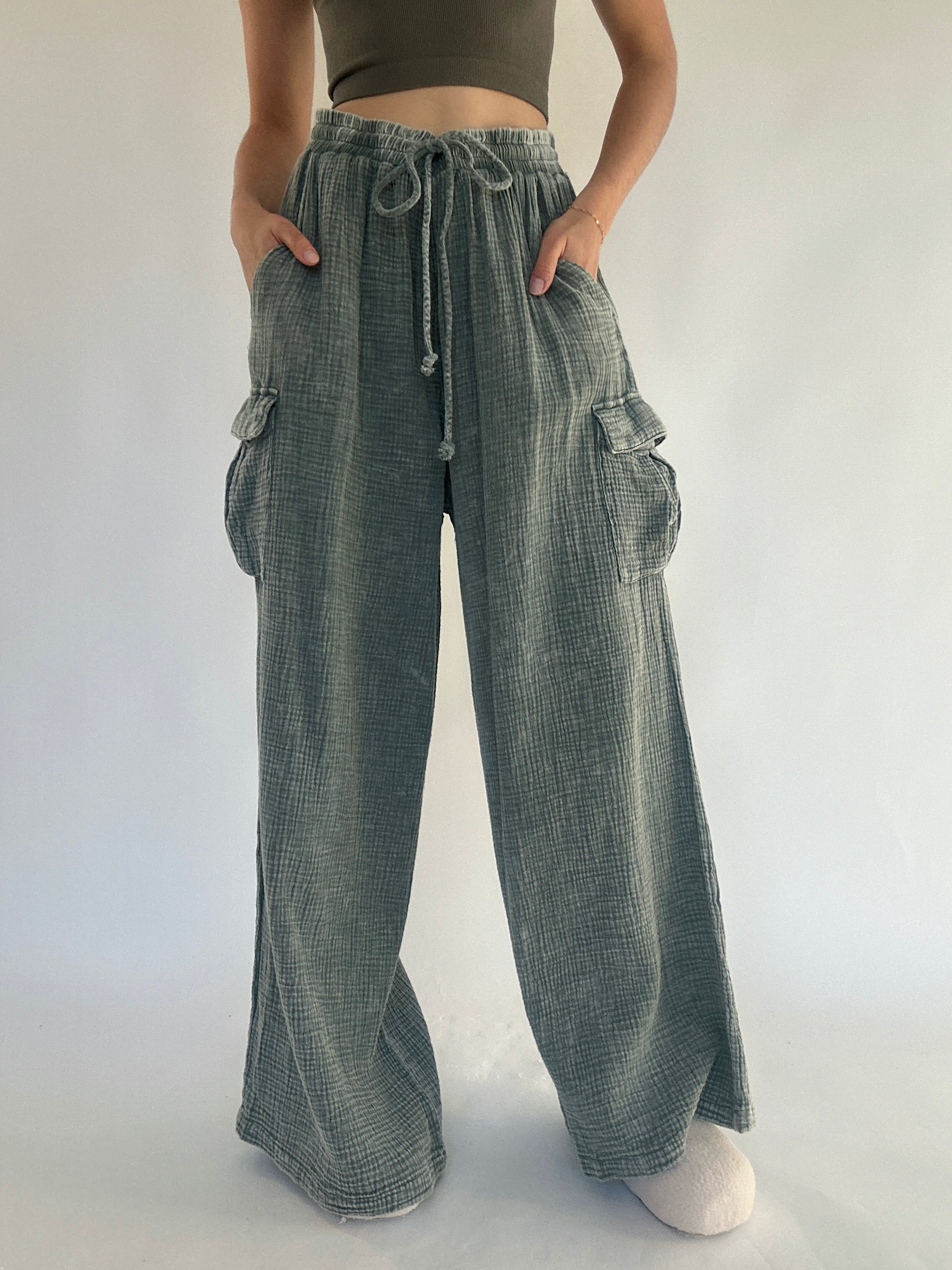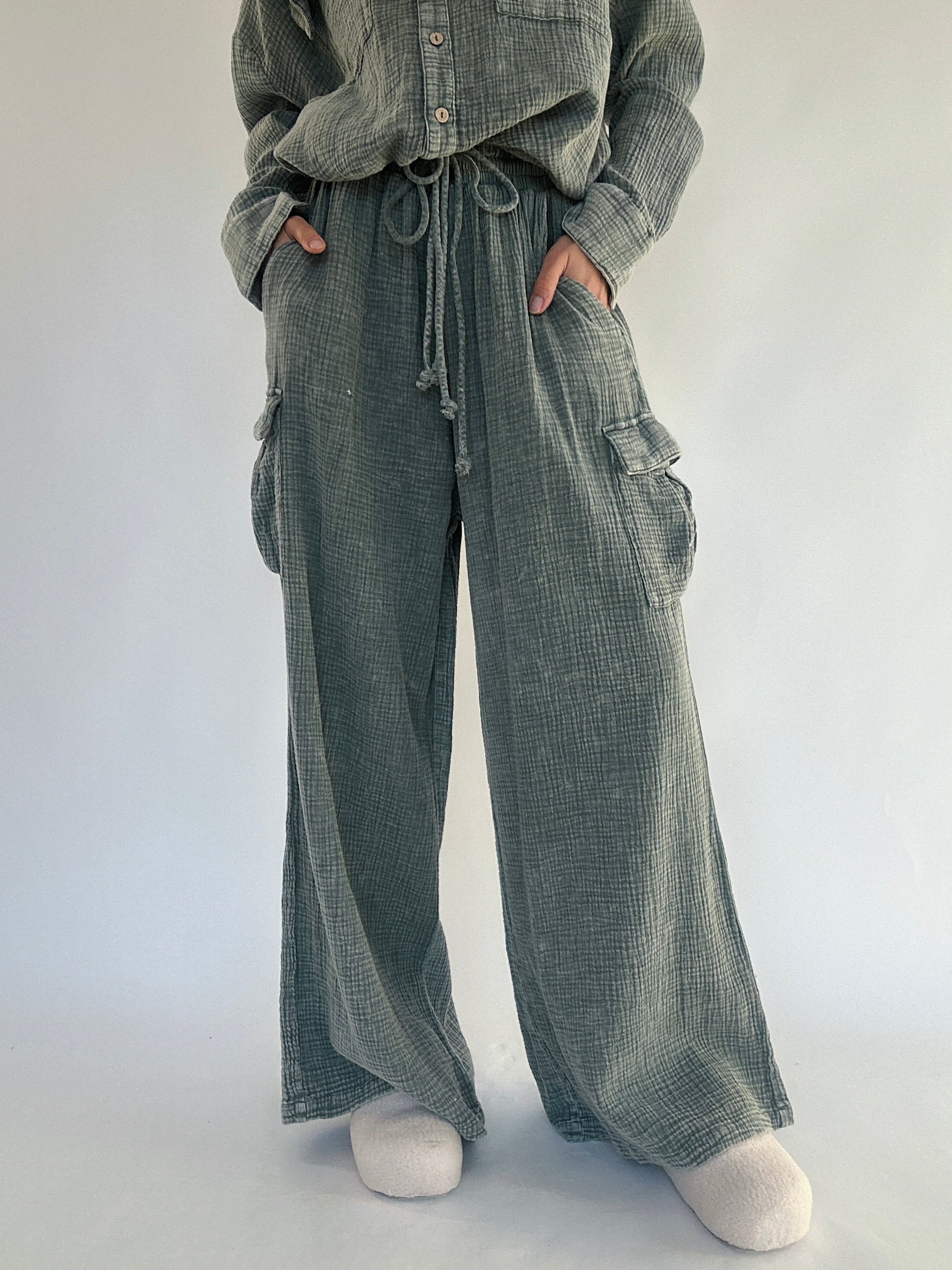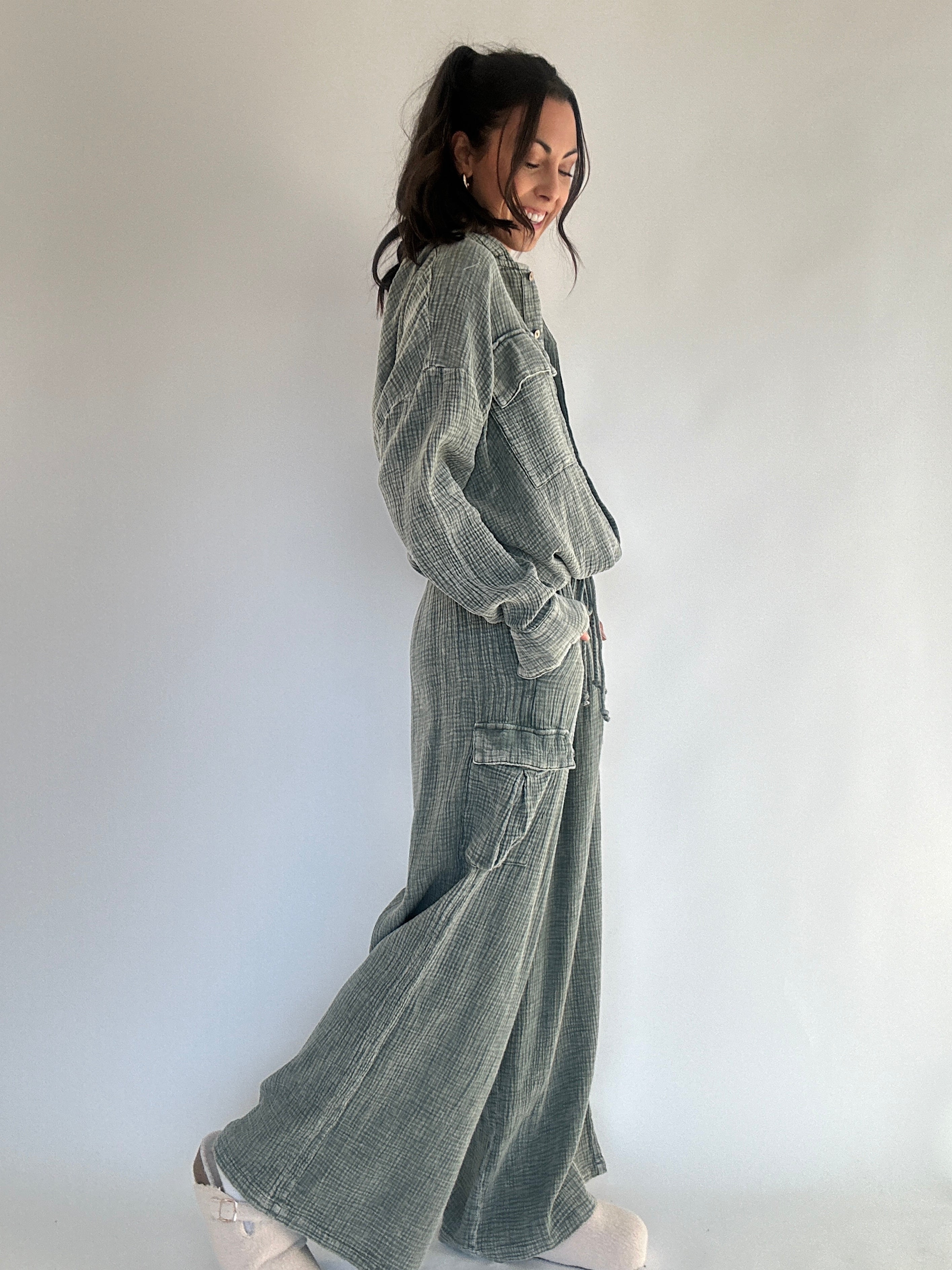 These pacific green cotton gauze wide leg pants have cargo side pockets, elastic waistband with adjustable tie and make the cutest most aesthetic set when paired with the matching North Bound Hoodie Top!