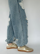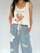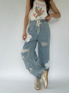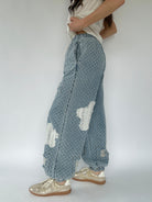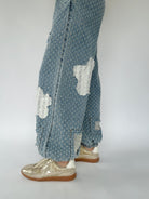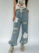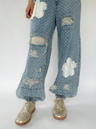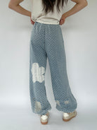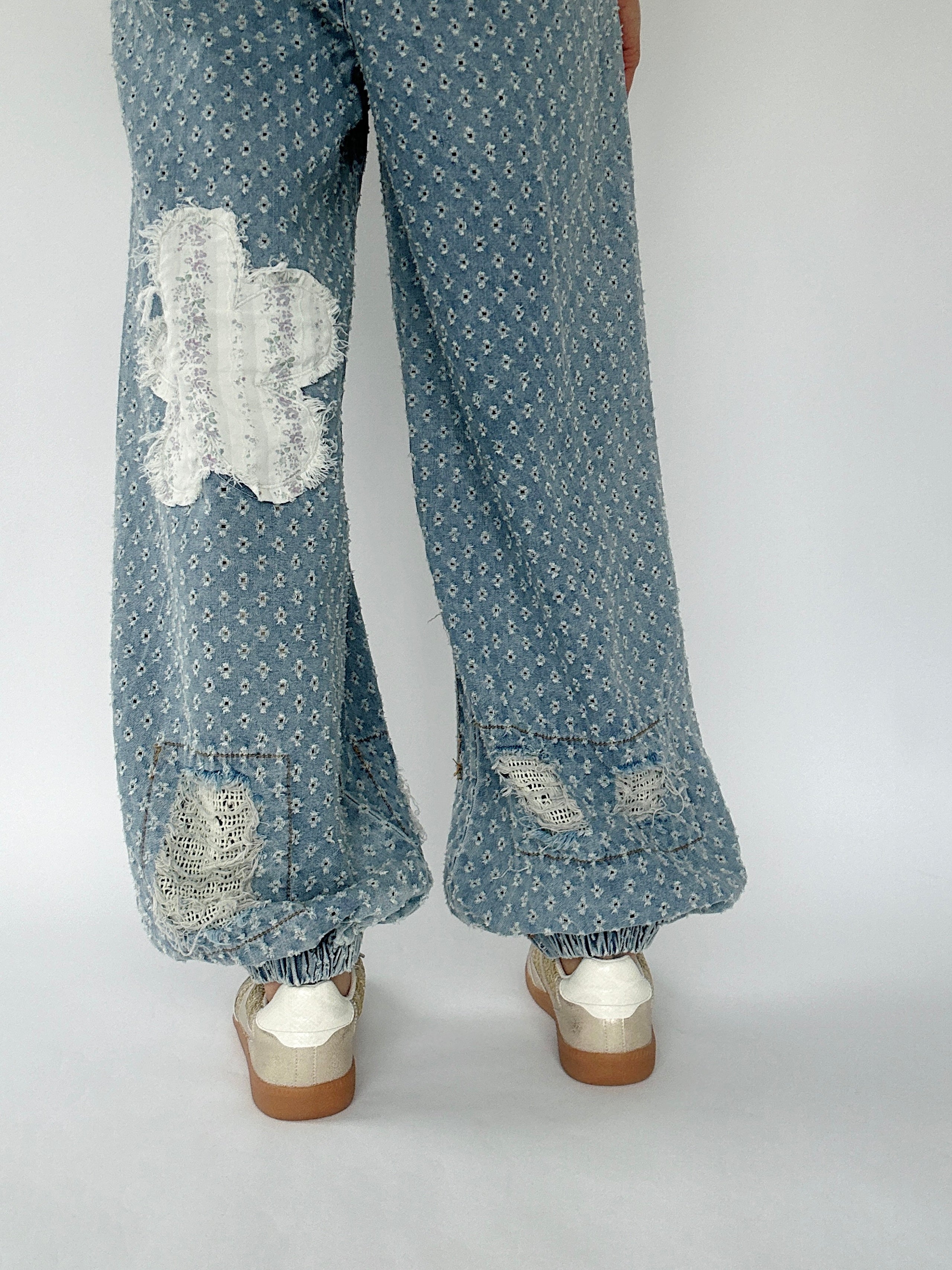 These denim pants are sure to set you apart from the rest! The textured twill has raw edge floral patches and distressing that shows a crochet patch behind. They have a wide leg silhouette with elastic bottom cuffs that give the a jogger-like fit and an elastic waist with drawstring, making them a comfy fit too!