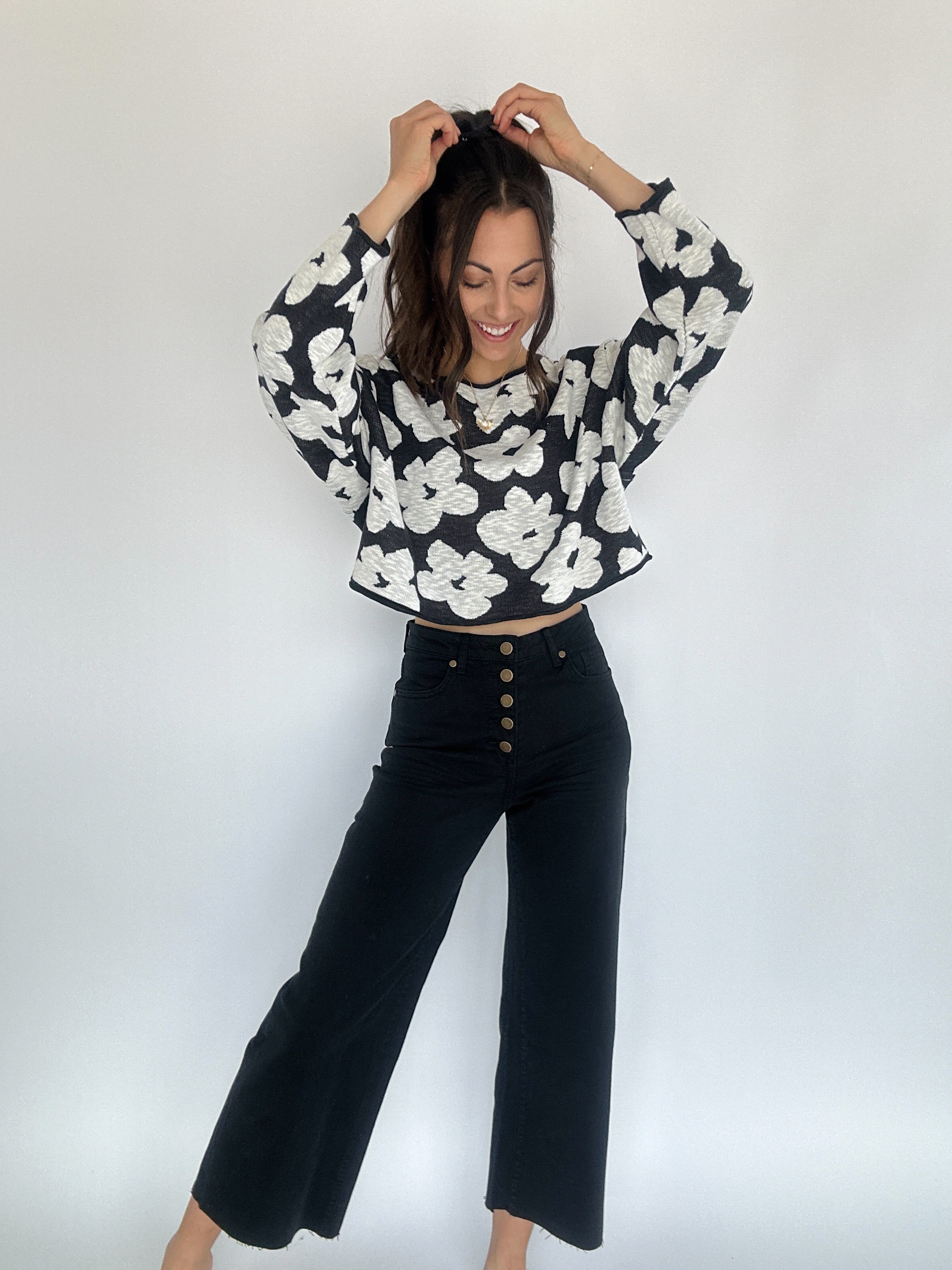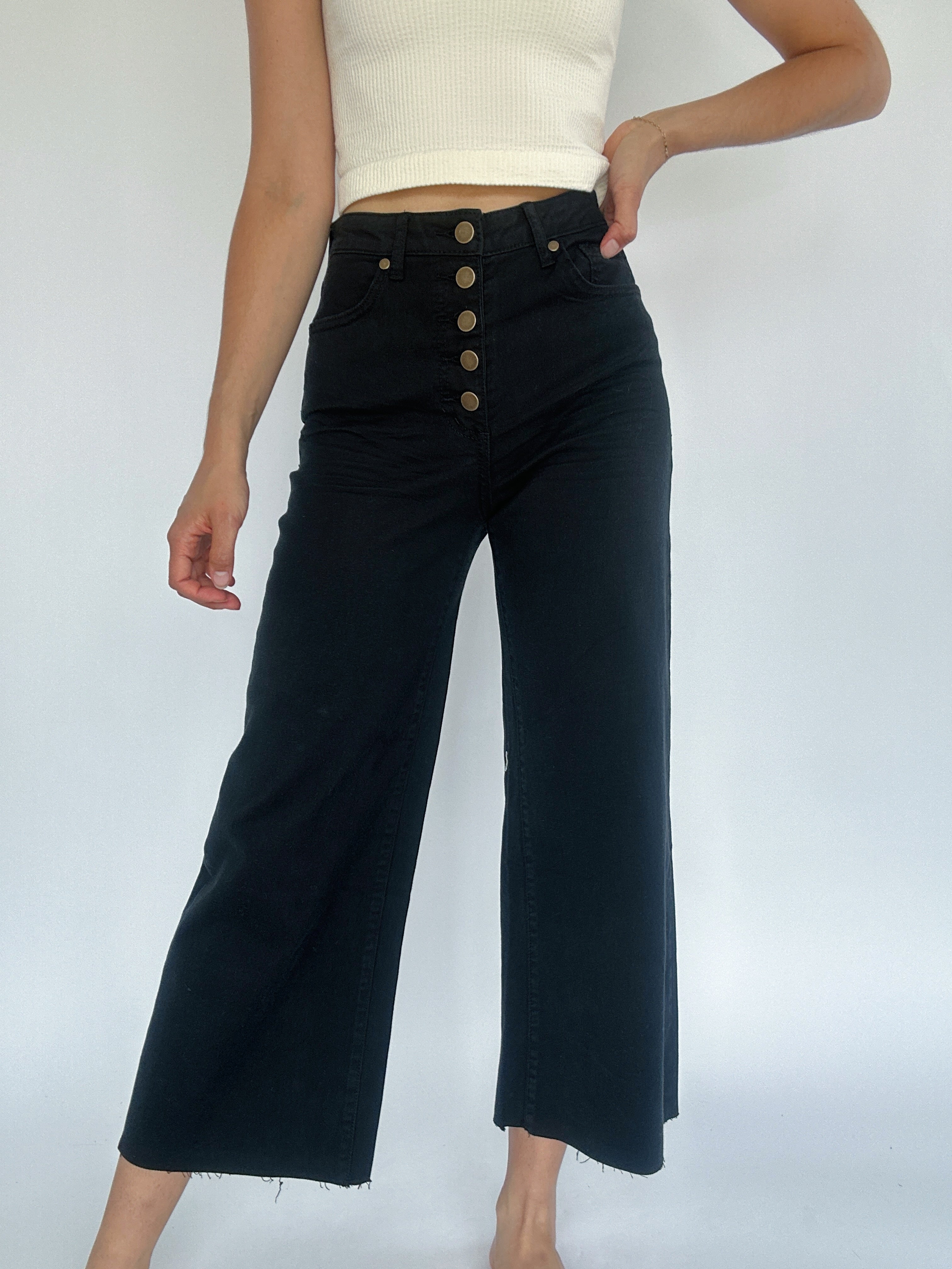These black button front high waisted pants are super stretchy with a wide leg cropped fit. The raw hem makes it easy to cut off to your favorite length!