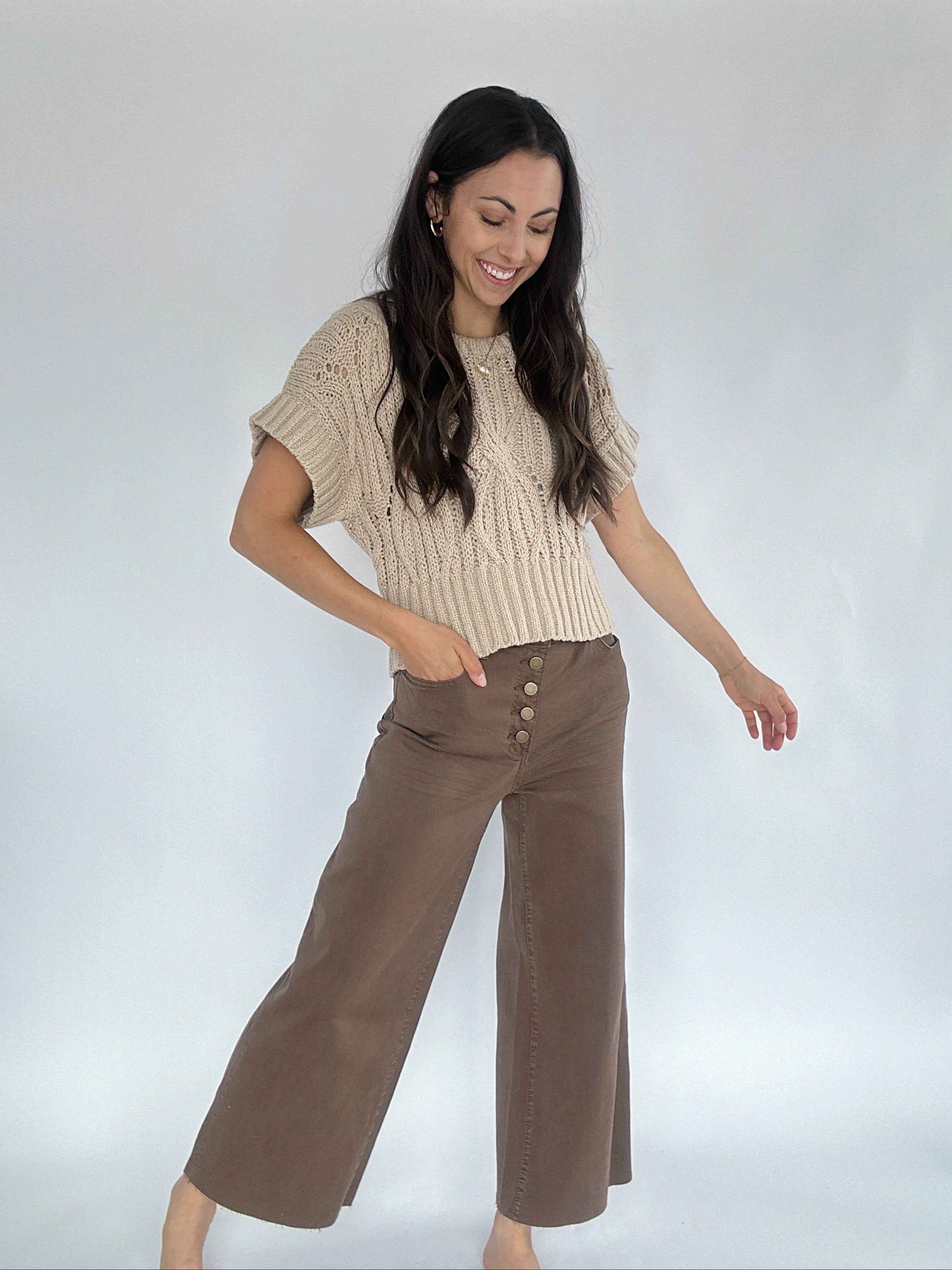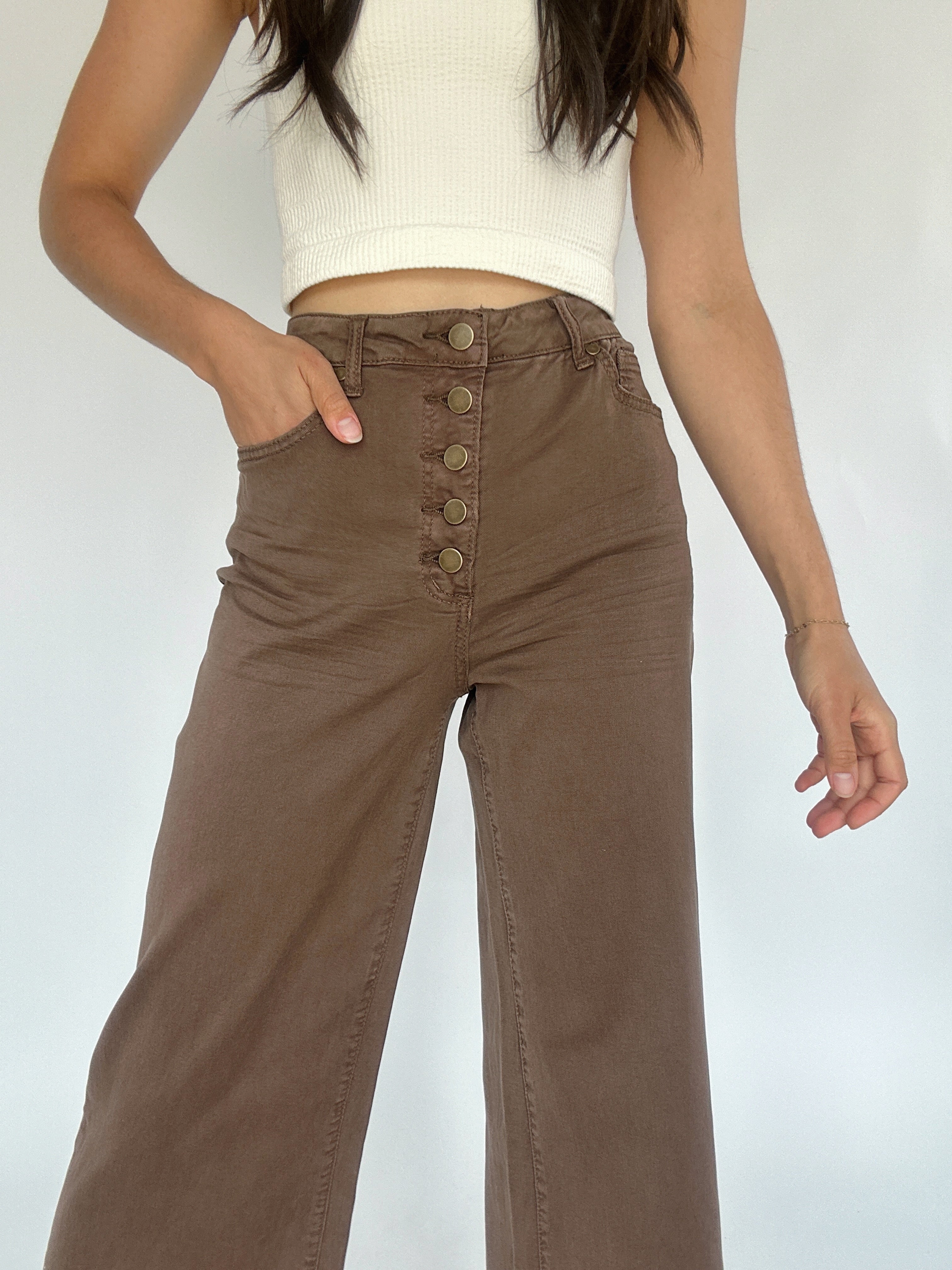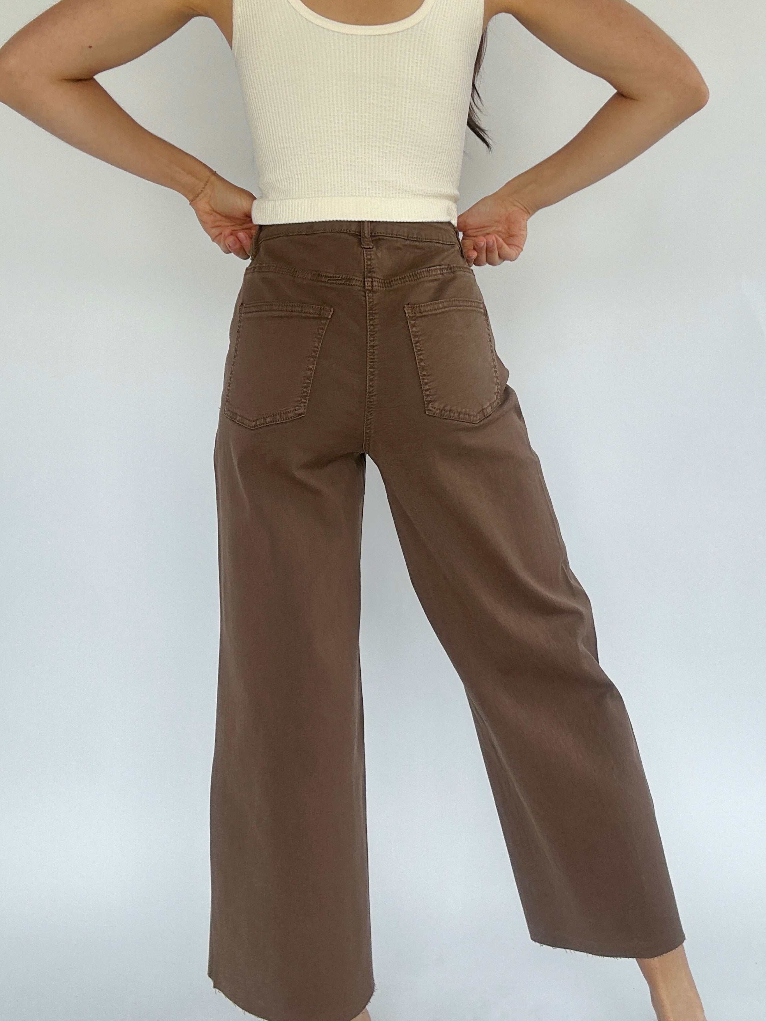 These coffee brown button front high waisted pants are super stretchy with a wide leg cropped fit. The raw hem makes it easy to cut off to your favorite length!
