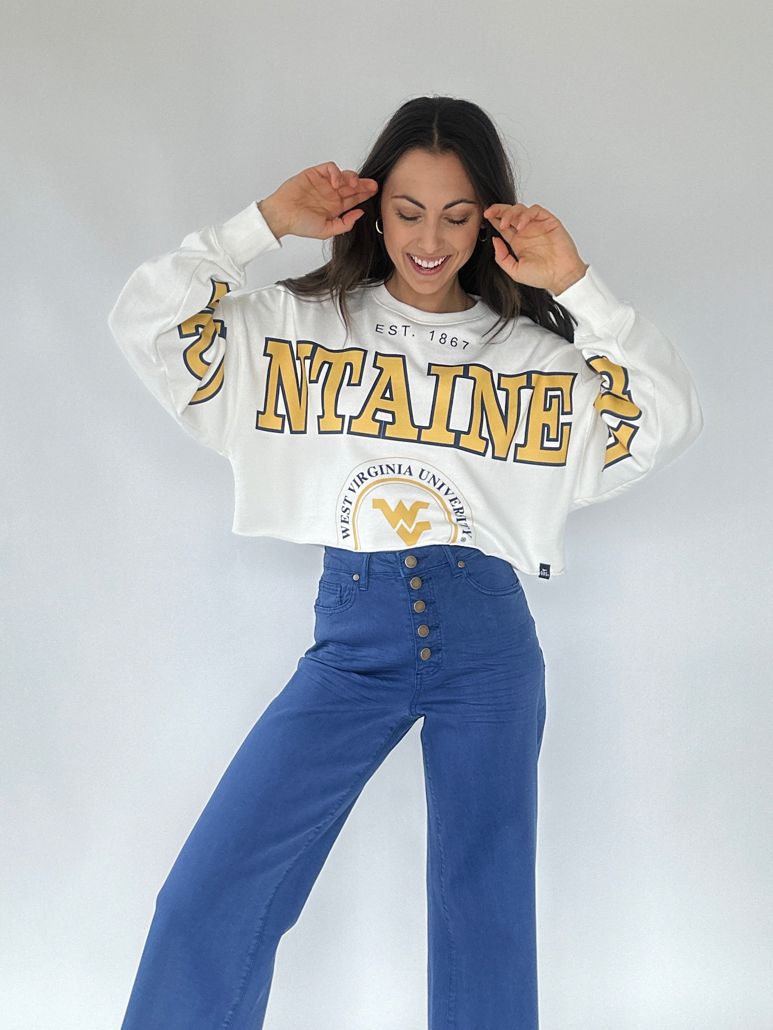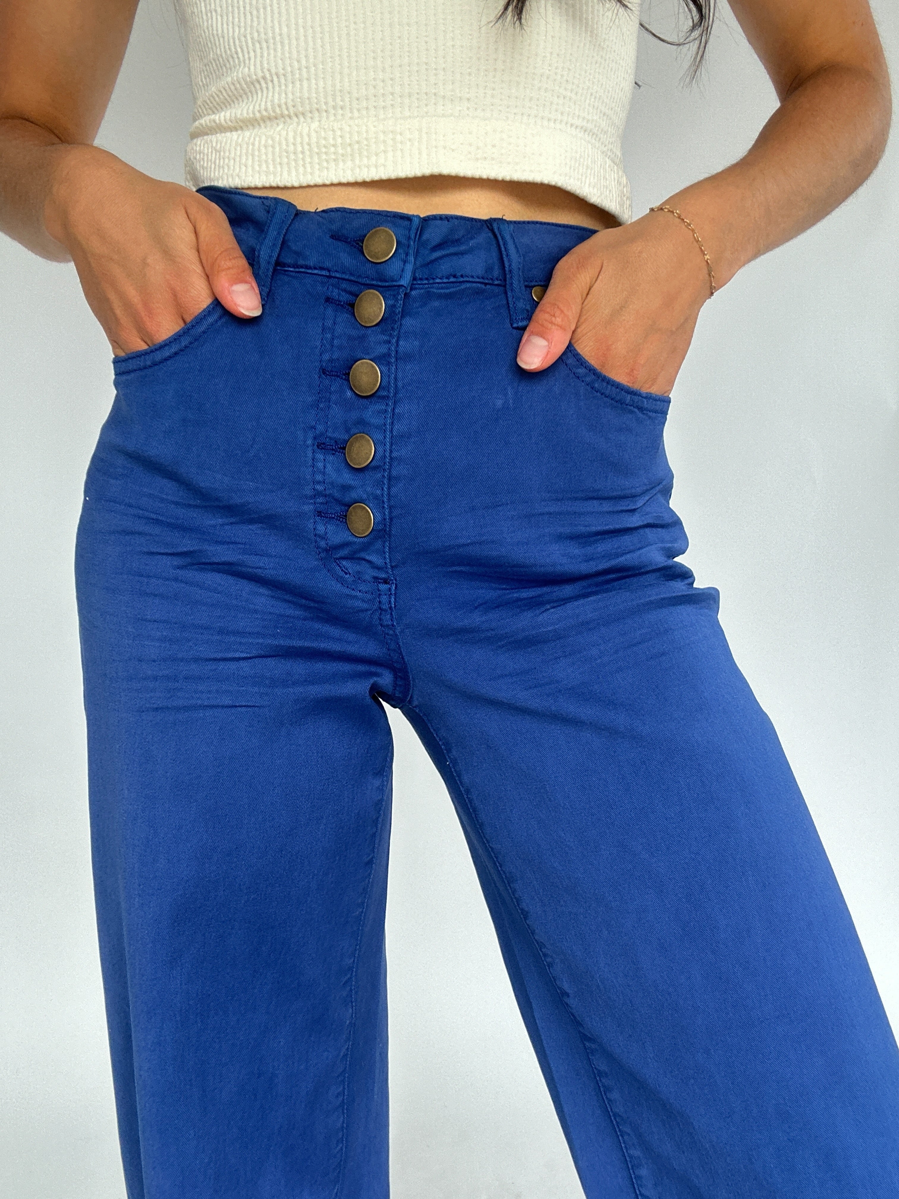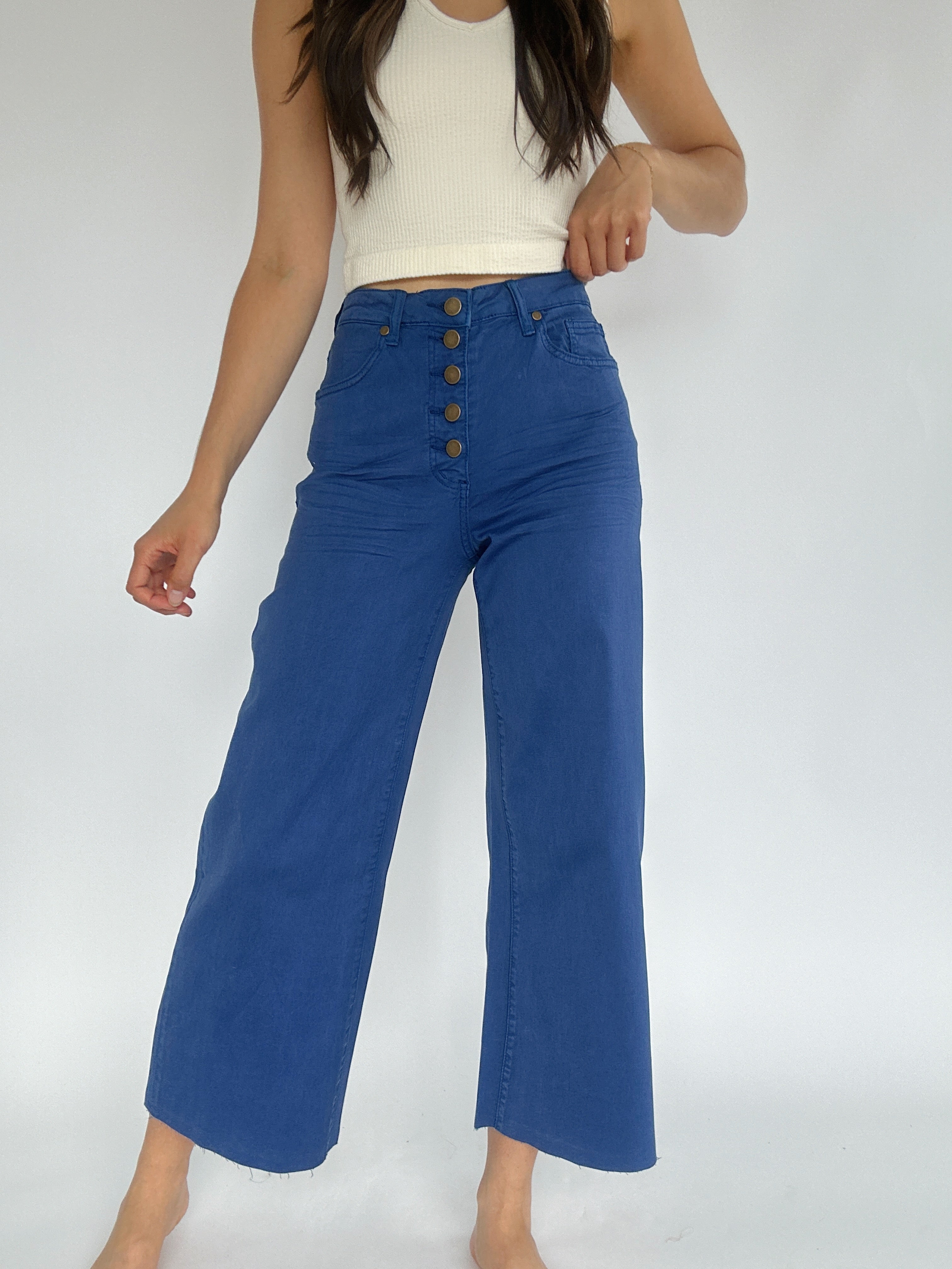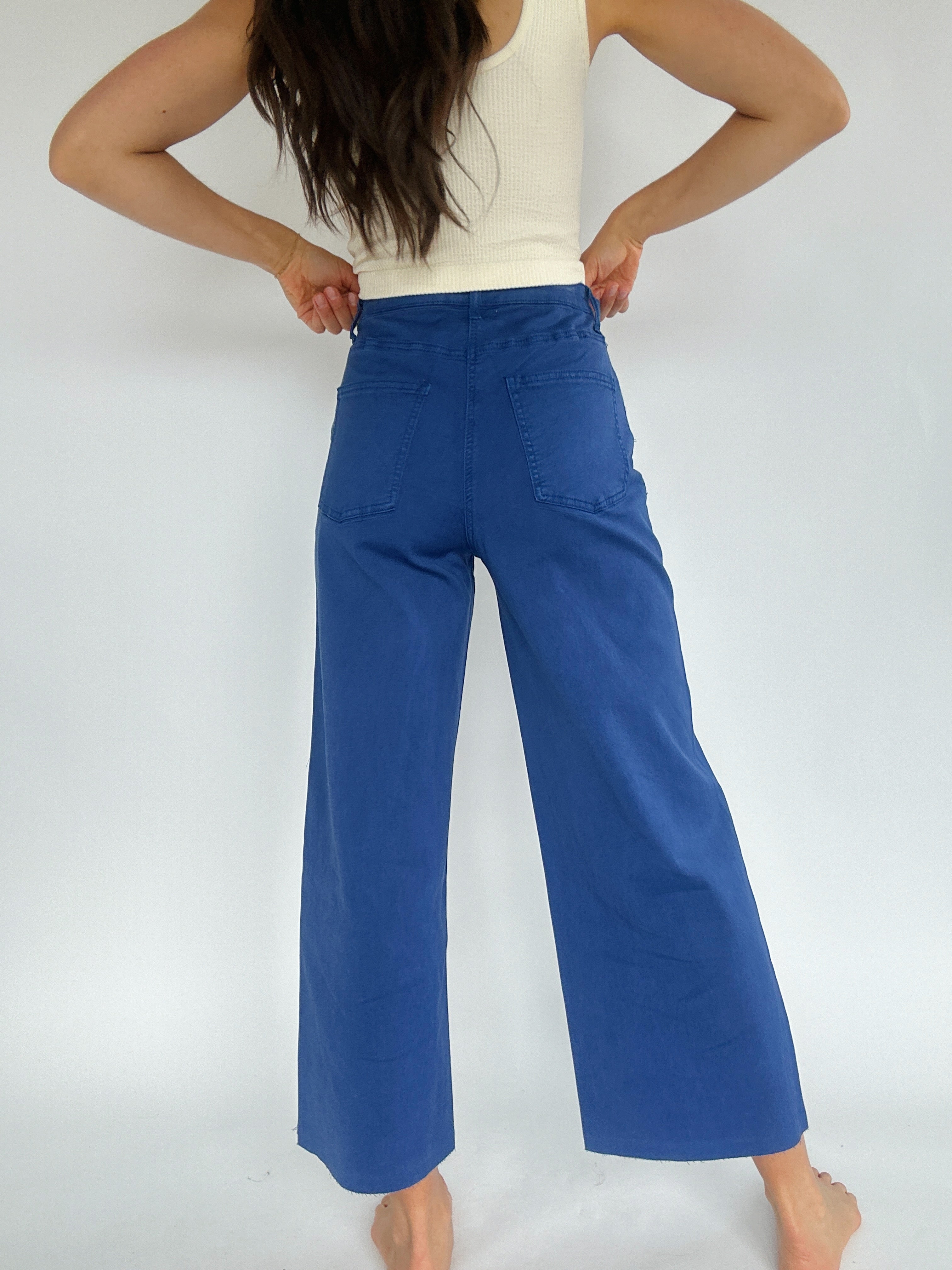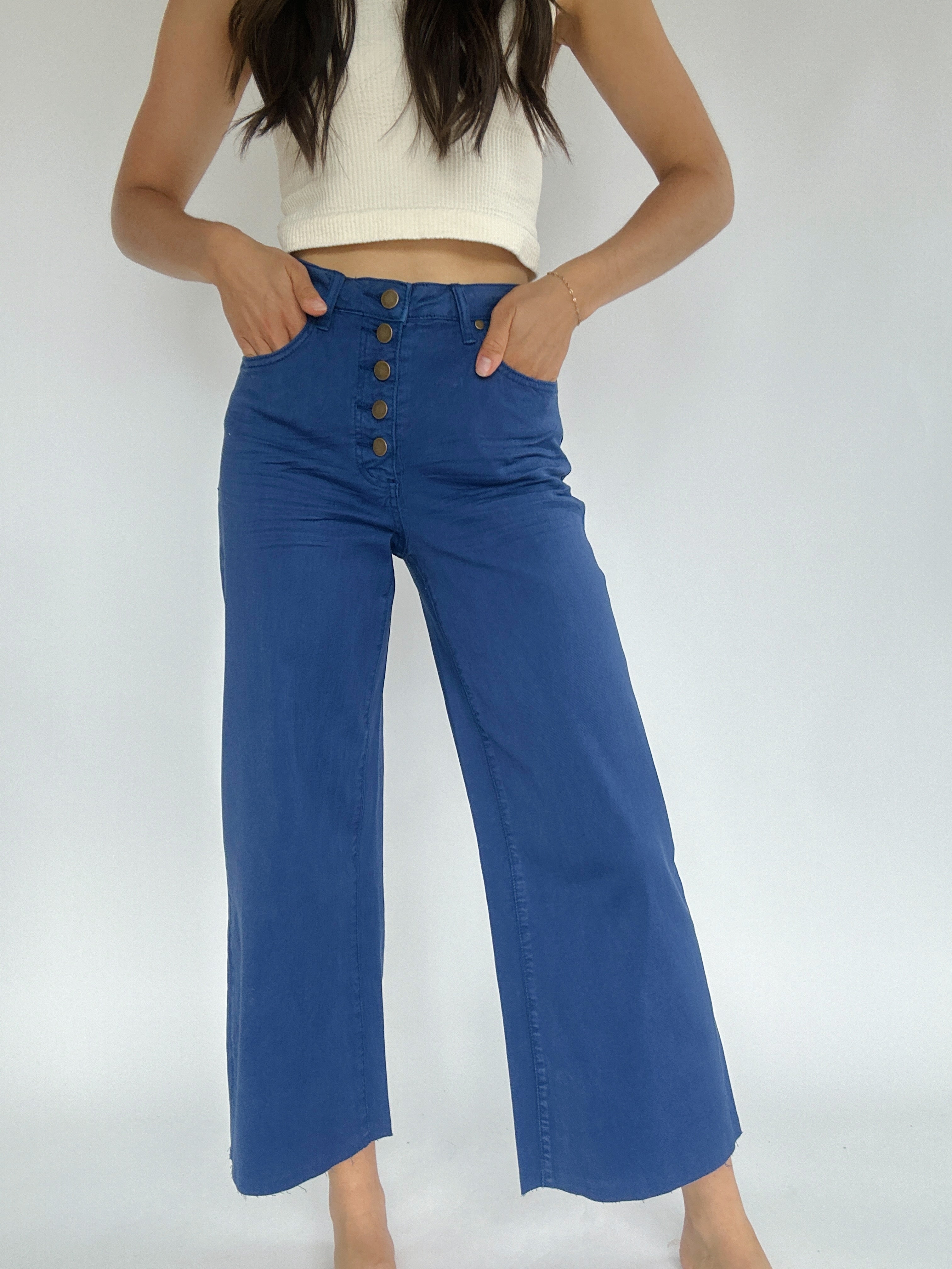 These royal blue button front high waisted pants are super stretchy with a wide leg cropped fit. The raw hem makes it easy to cut off to your favorite length!