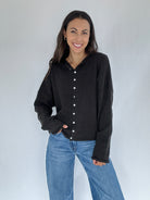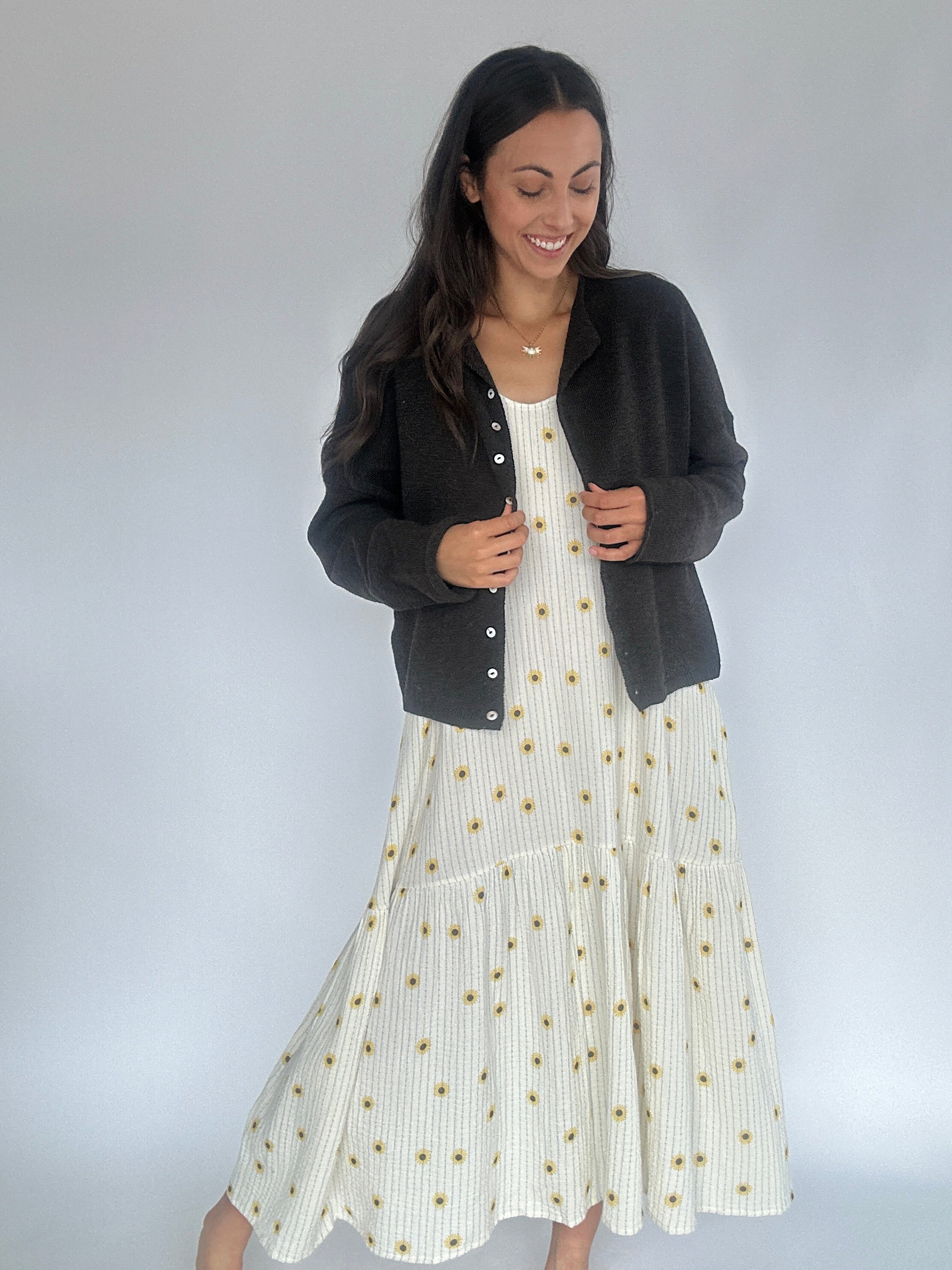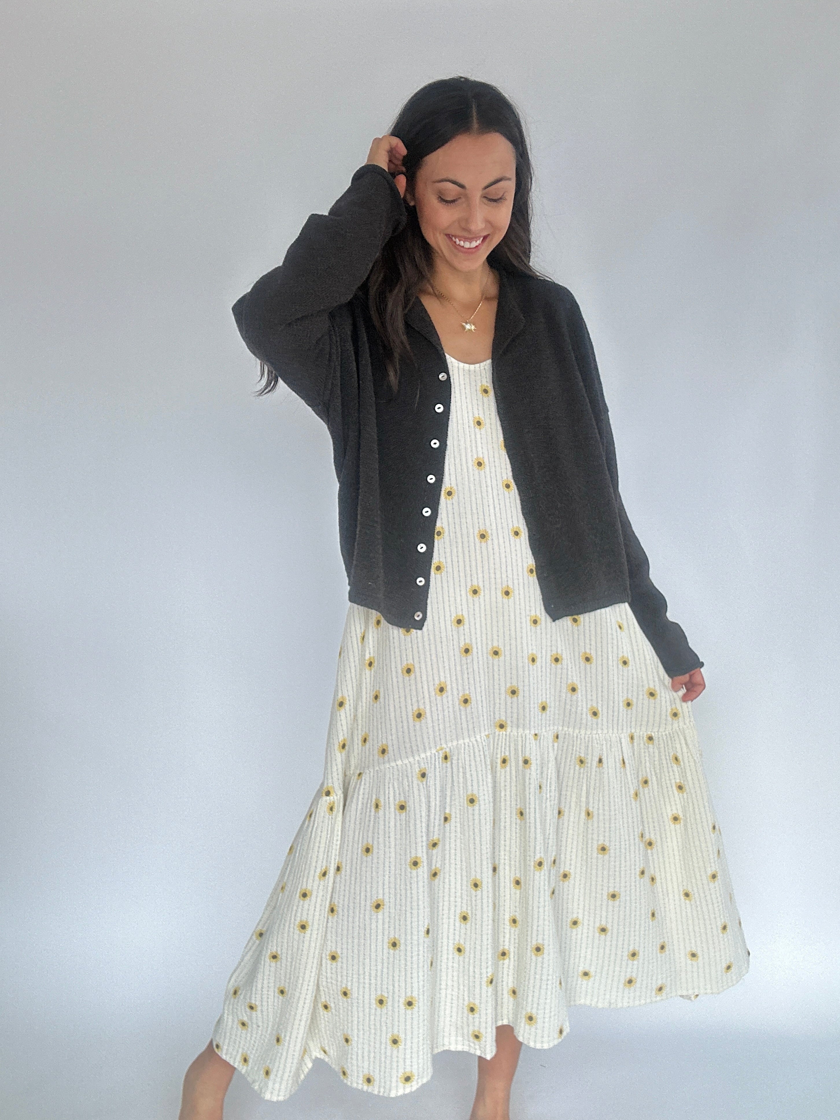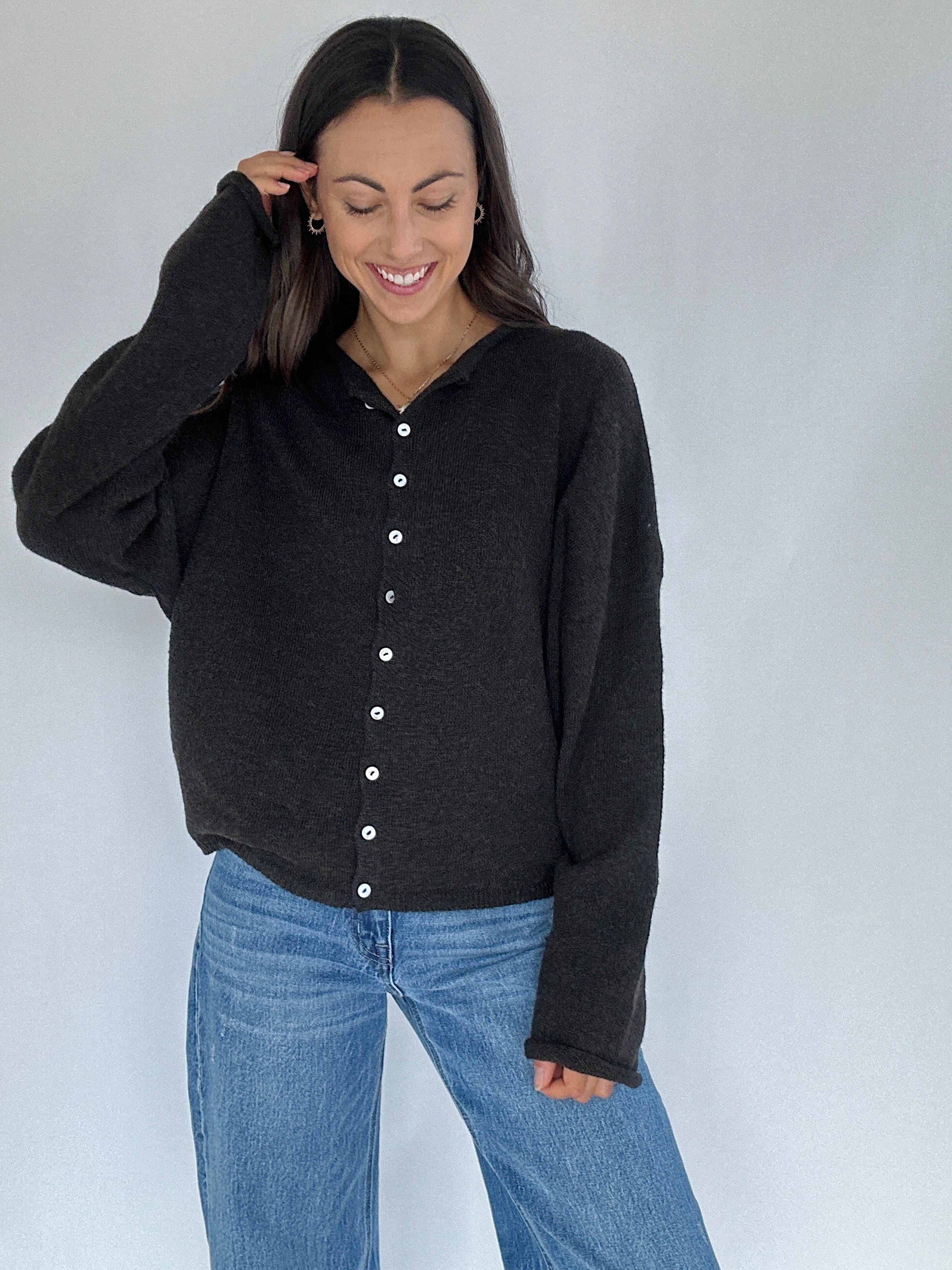 This chocolate brown cardigan is soft and light weight with a full button front and is the perfect layering piece. Or wear it alone with some jeans or wide leg pants!