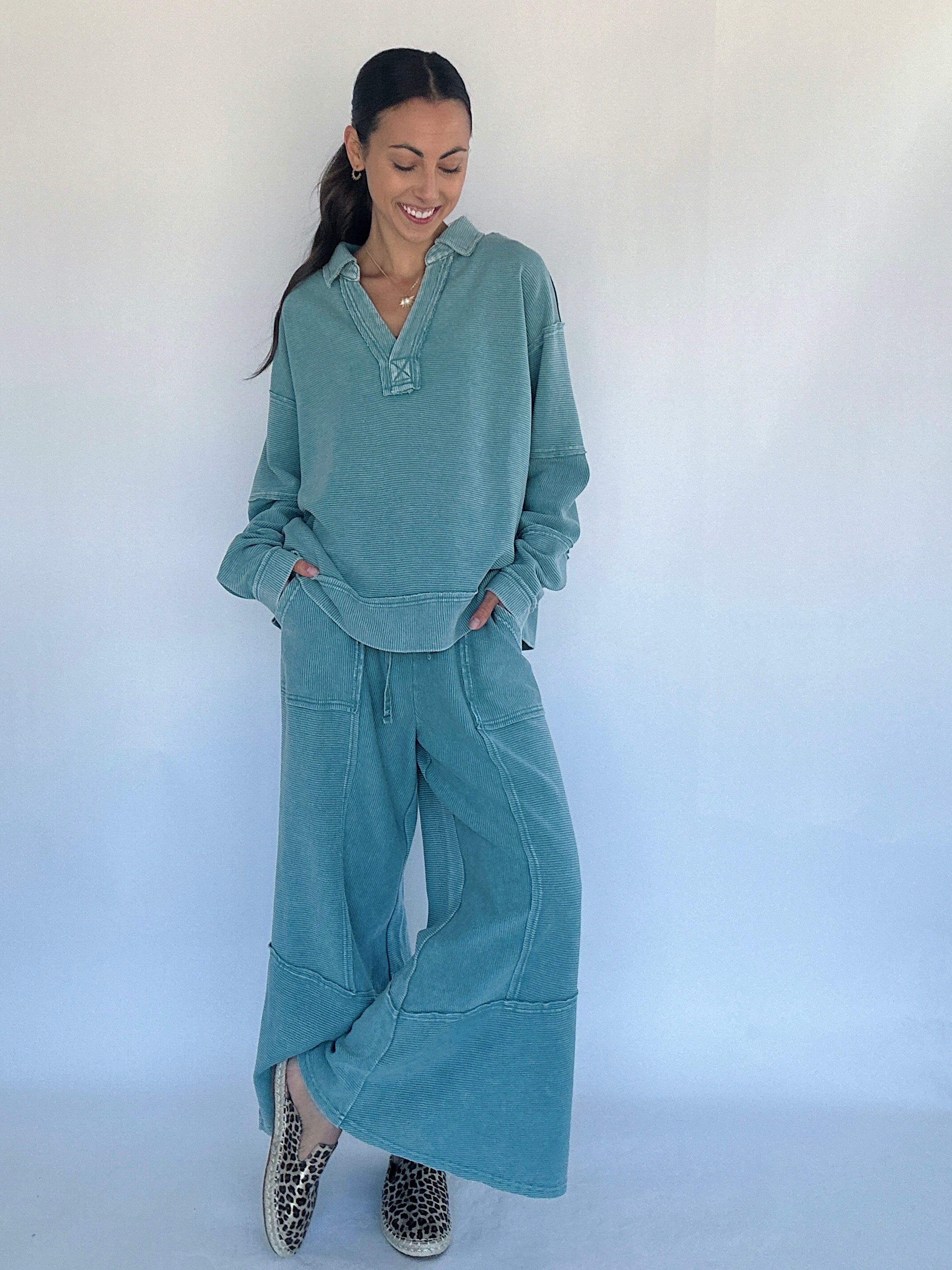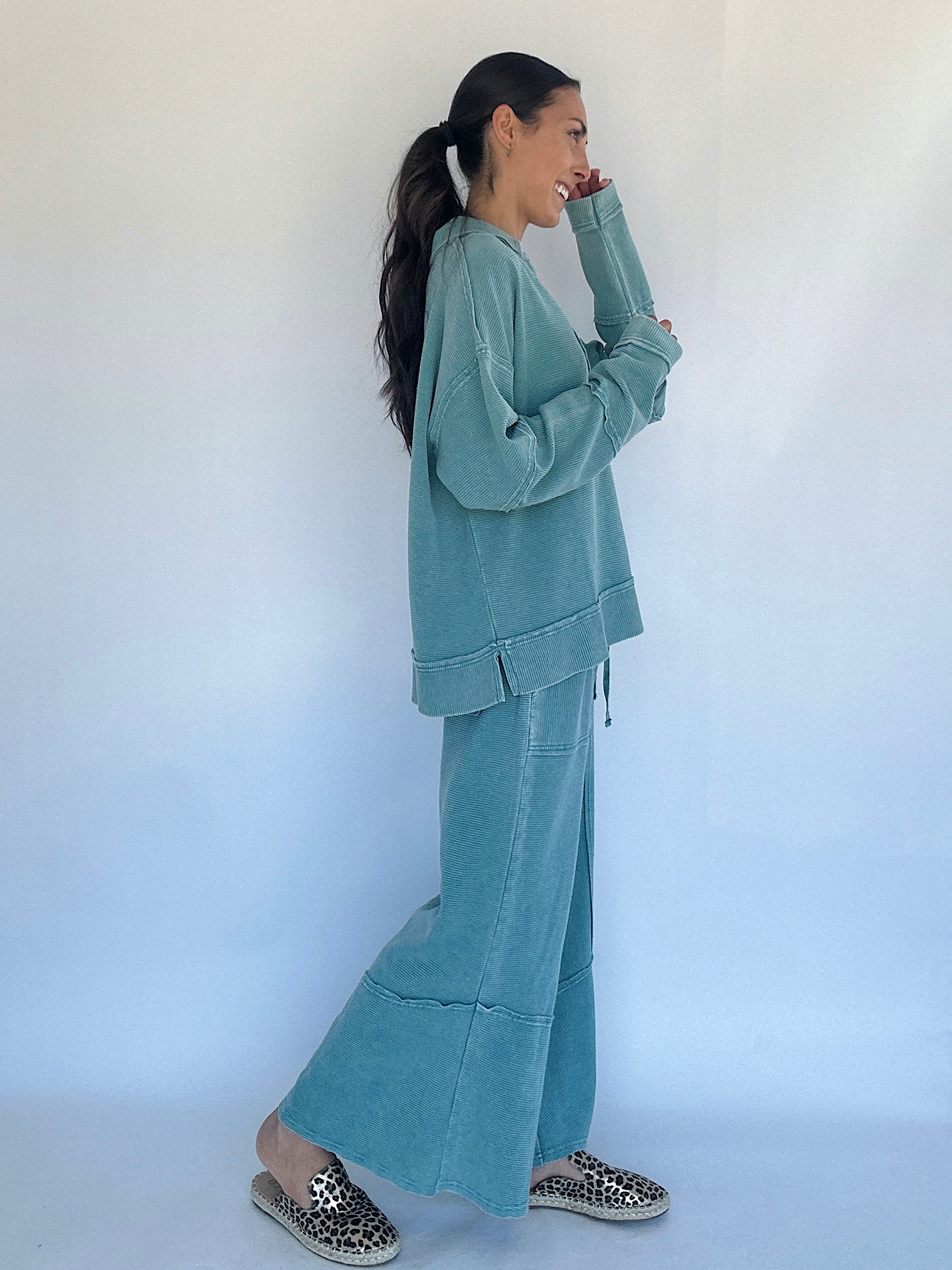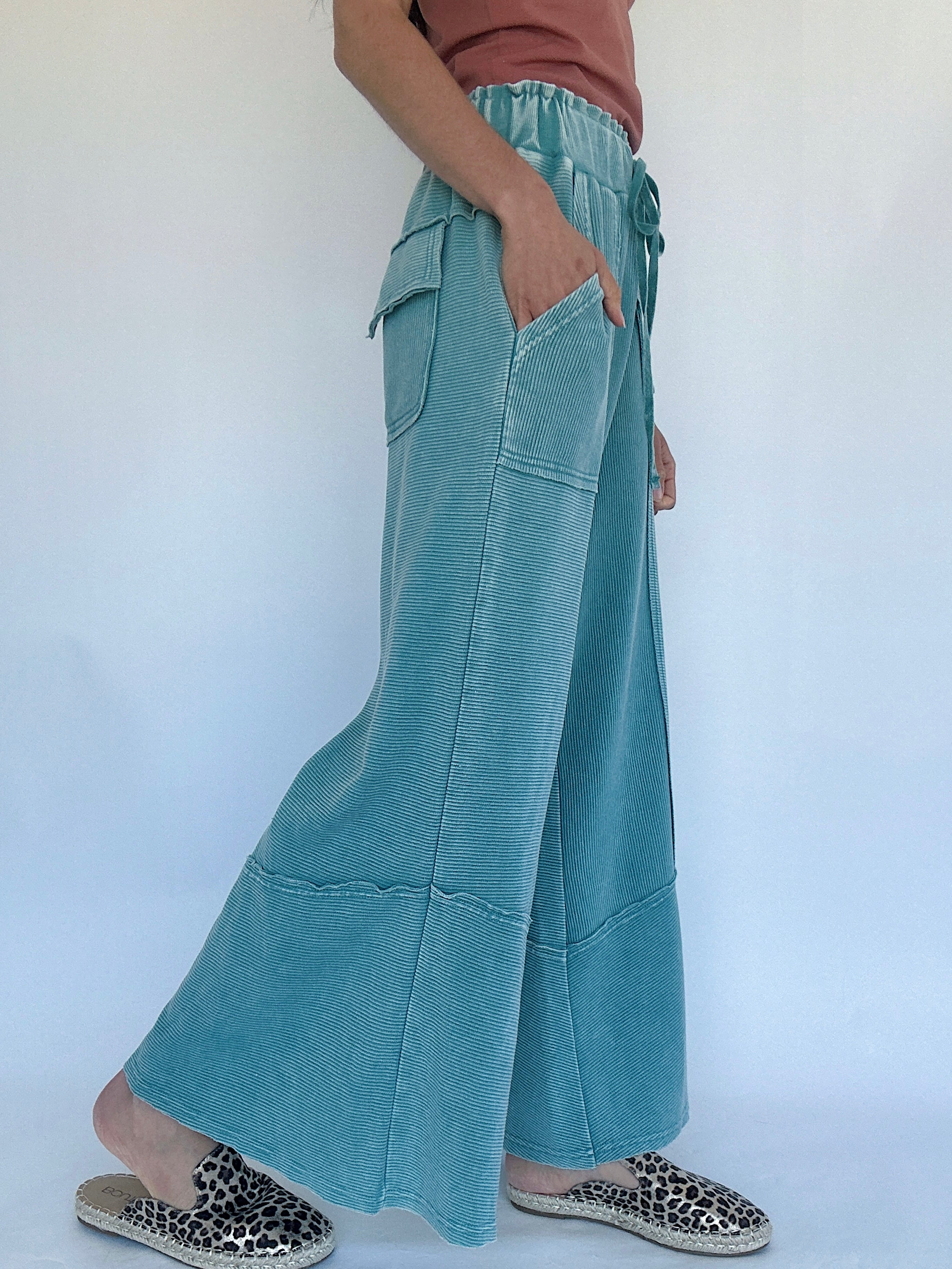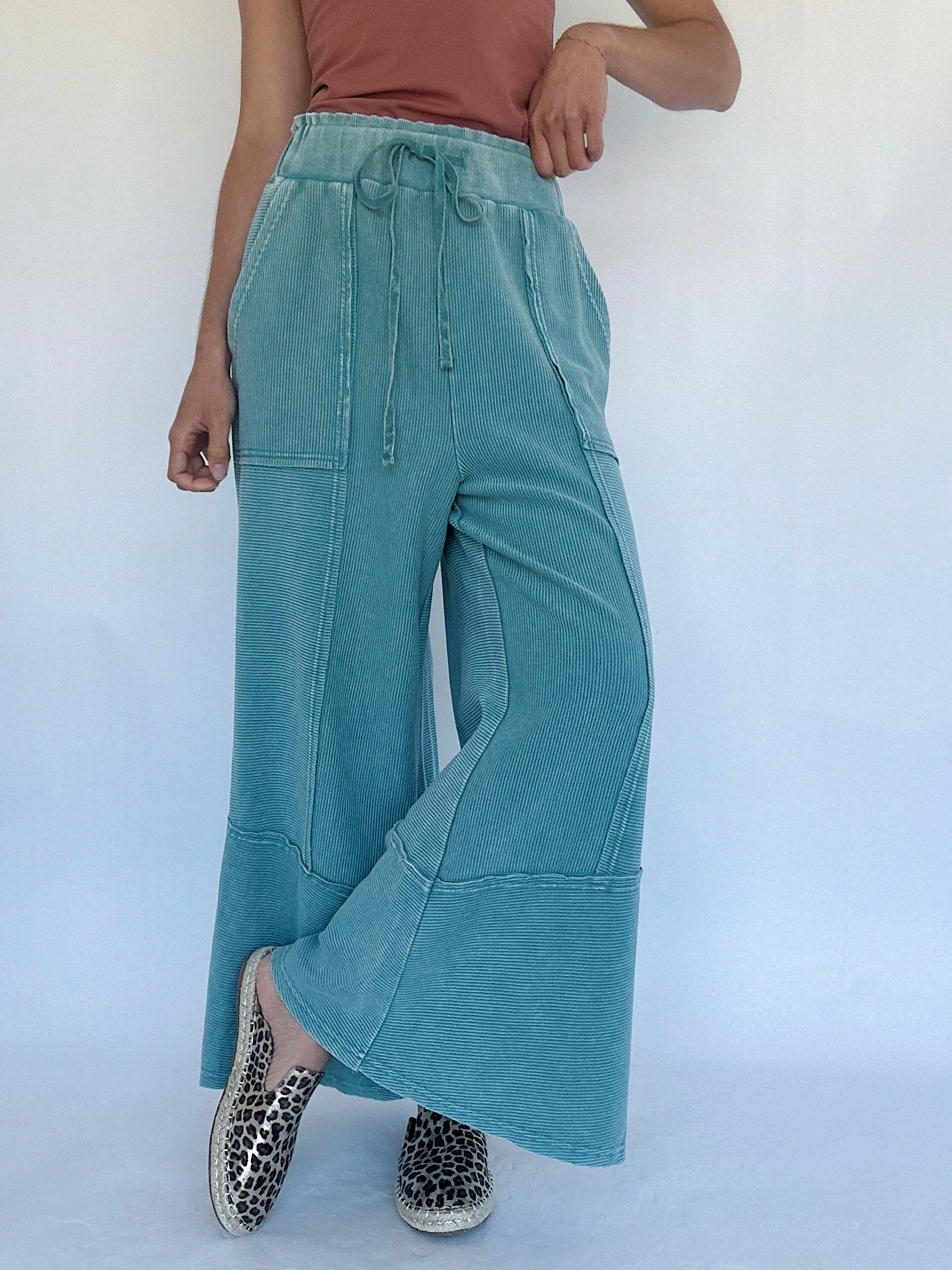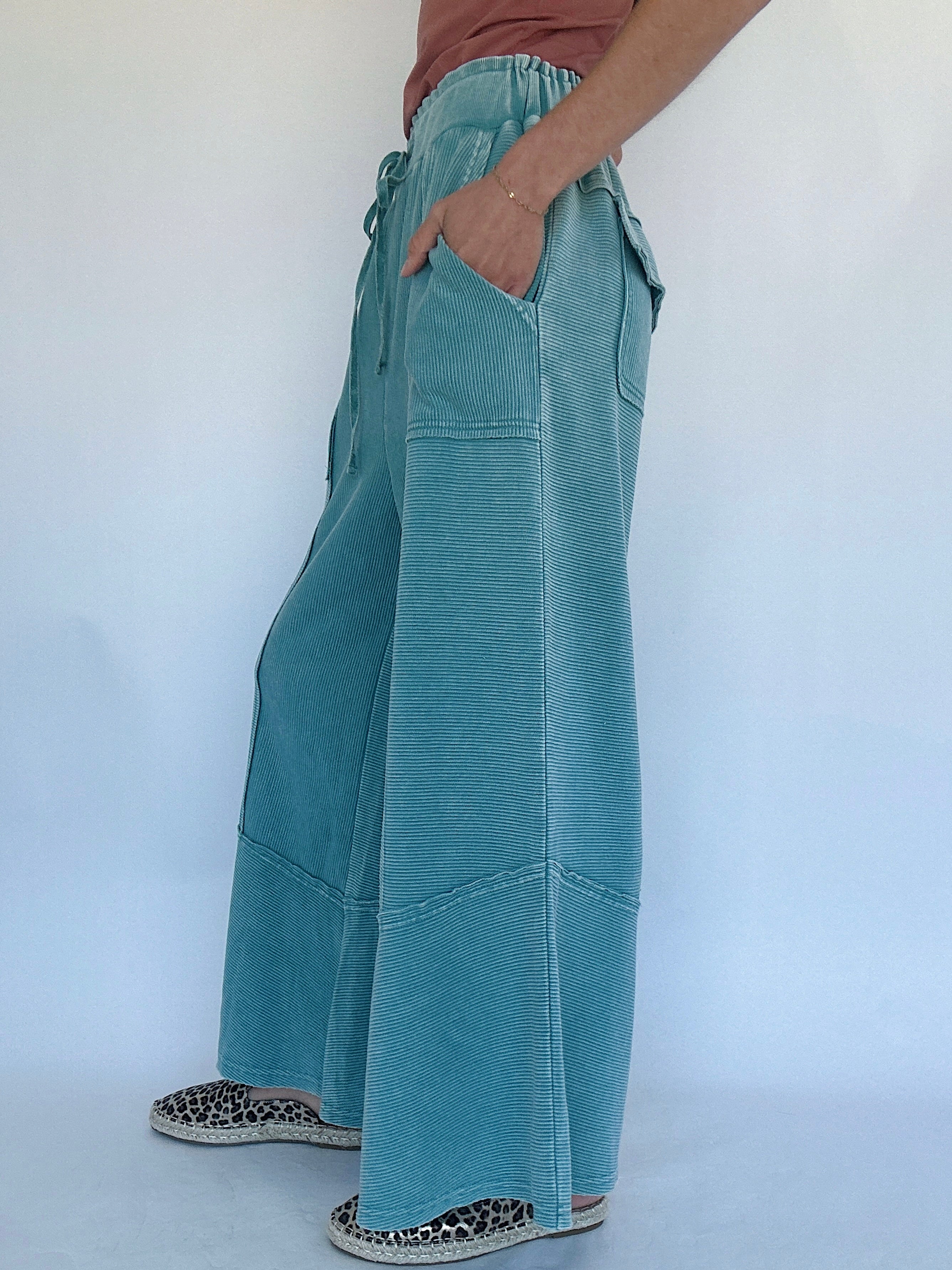 Jennie Ribbed Wide Leg Pants - Faded Teal