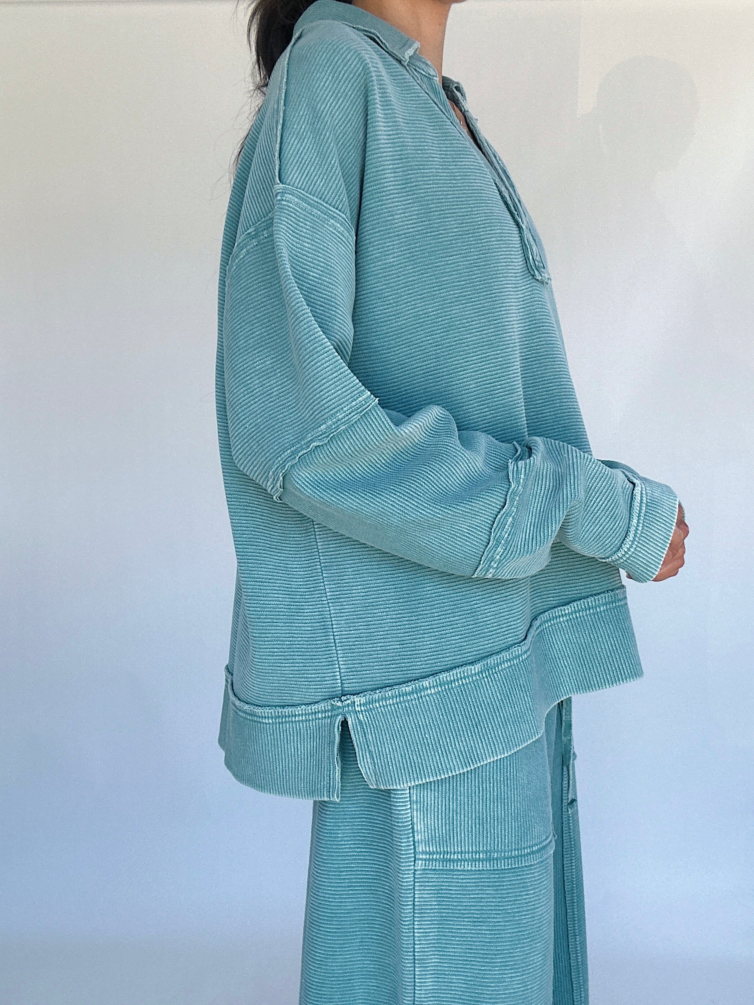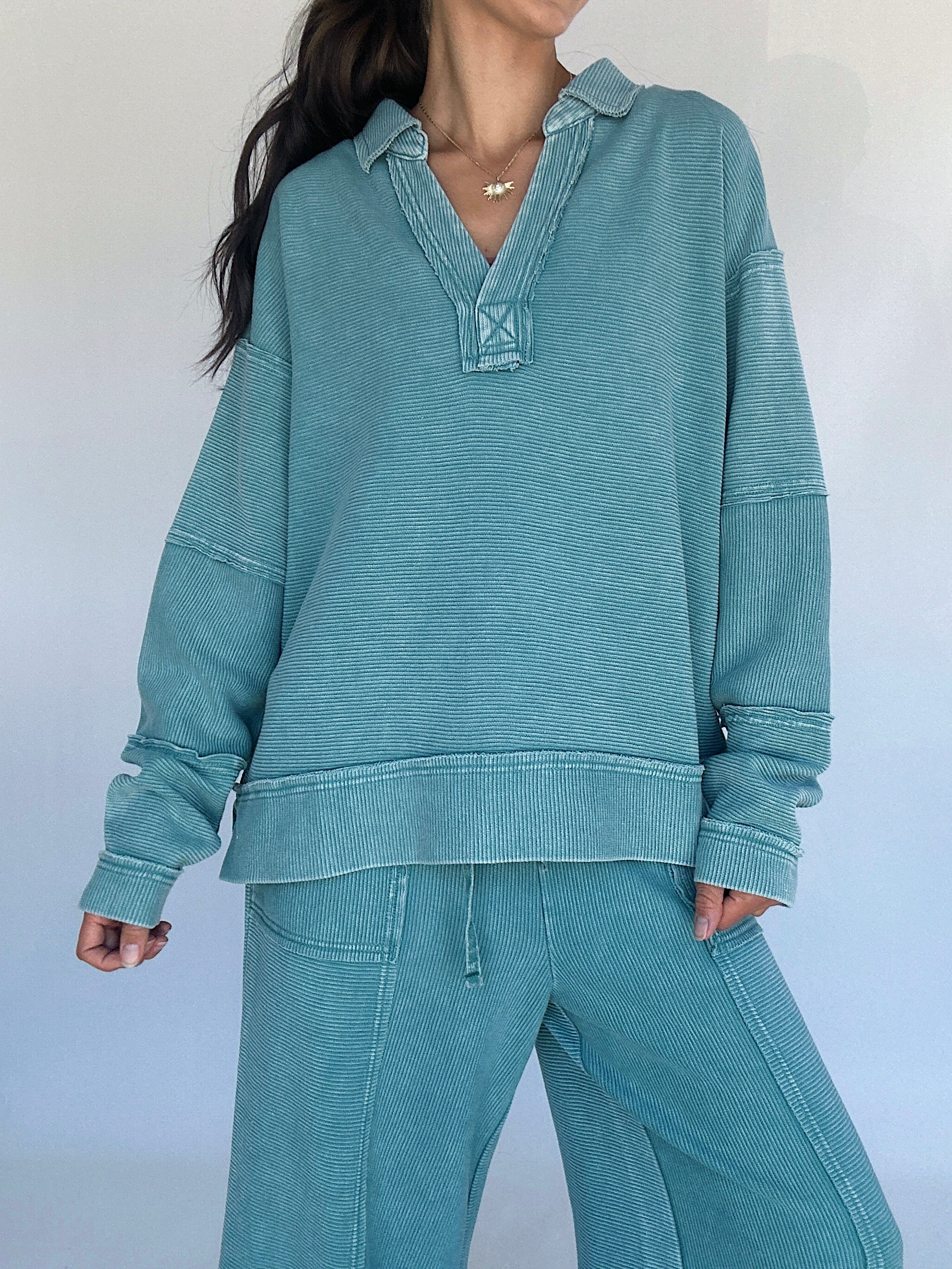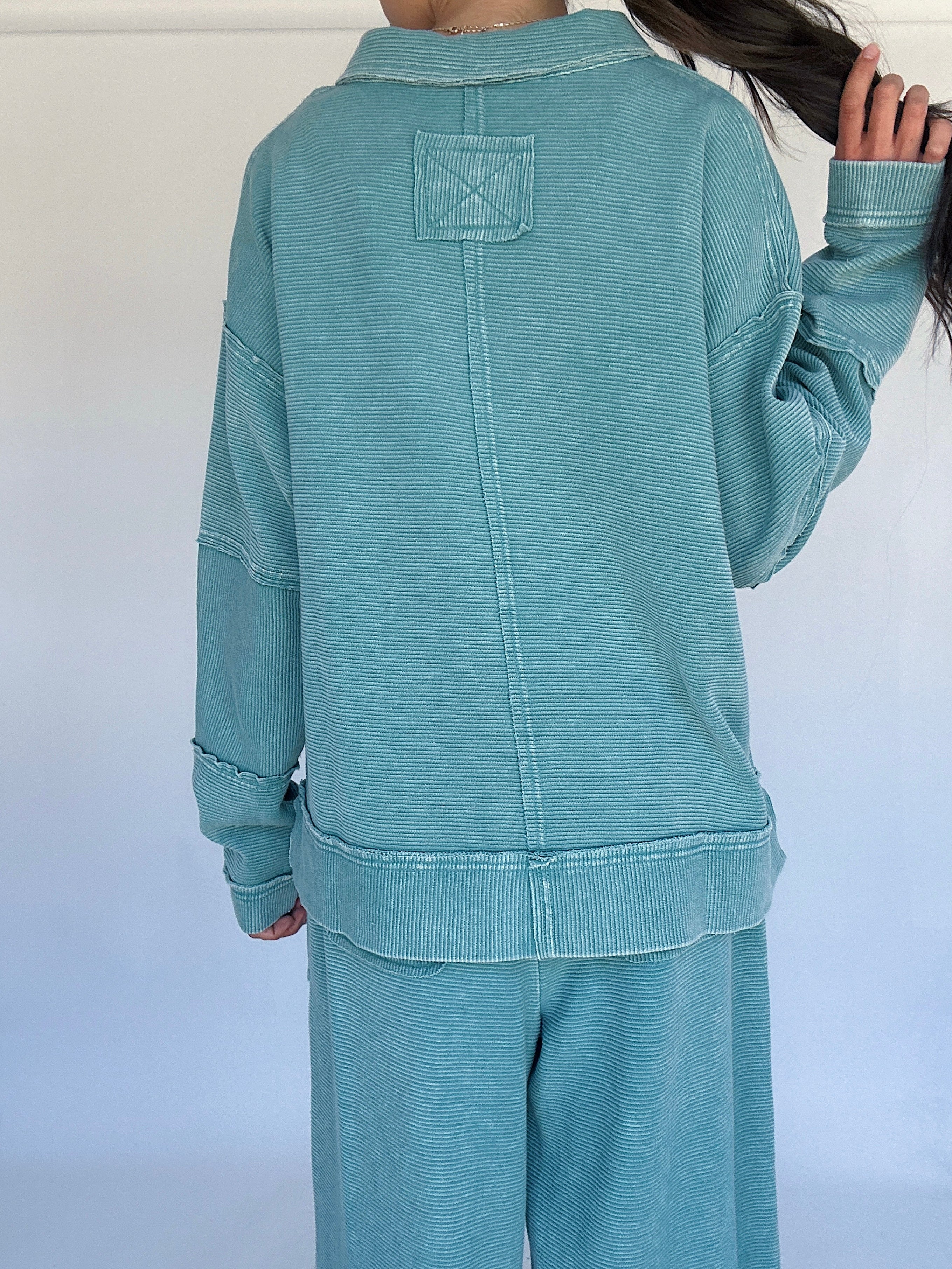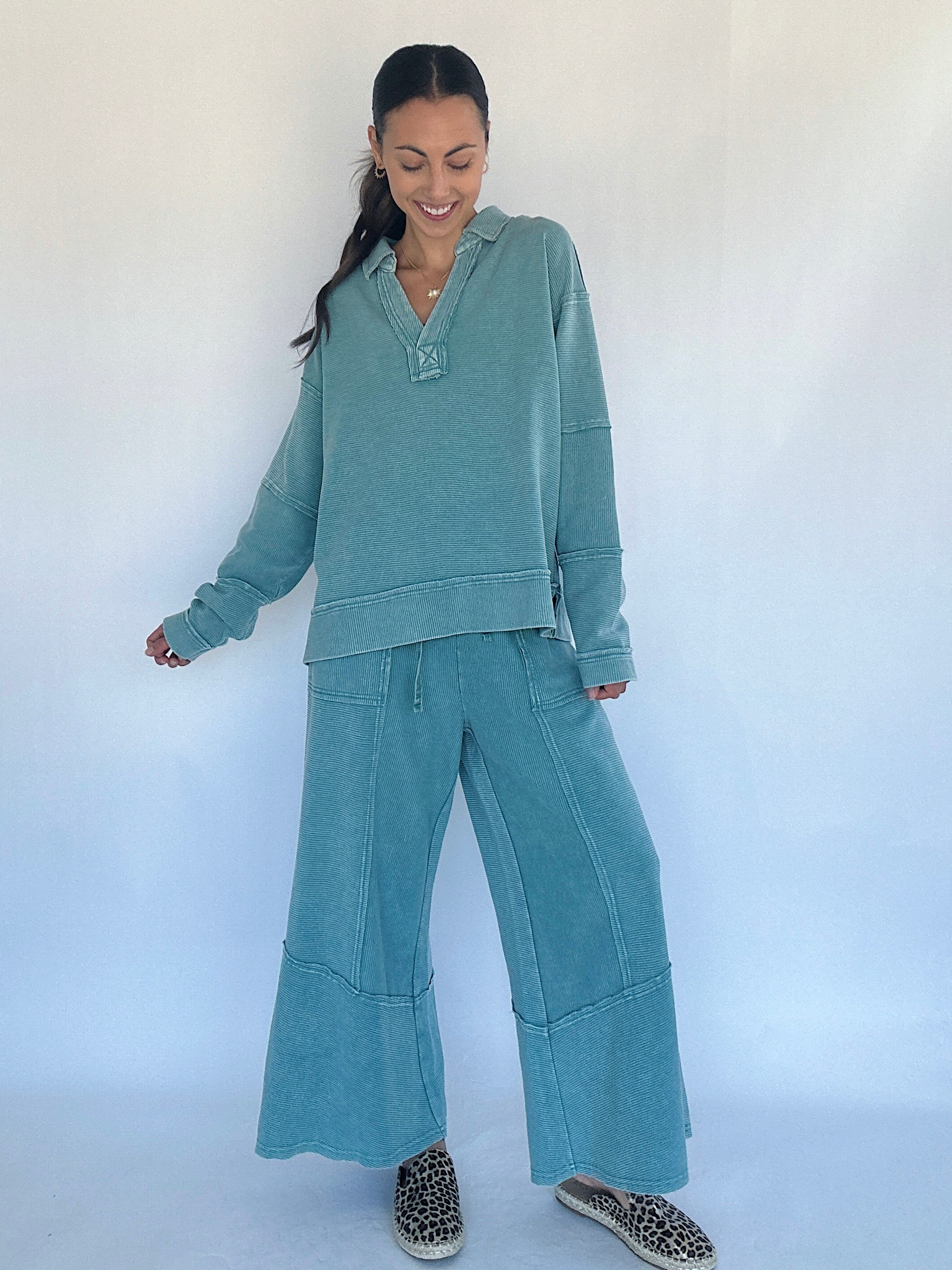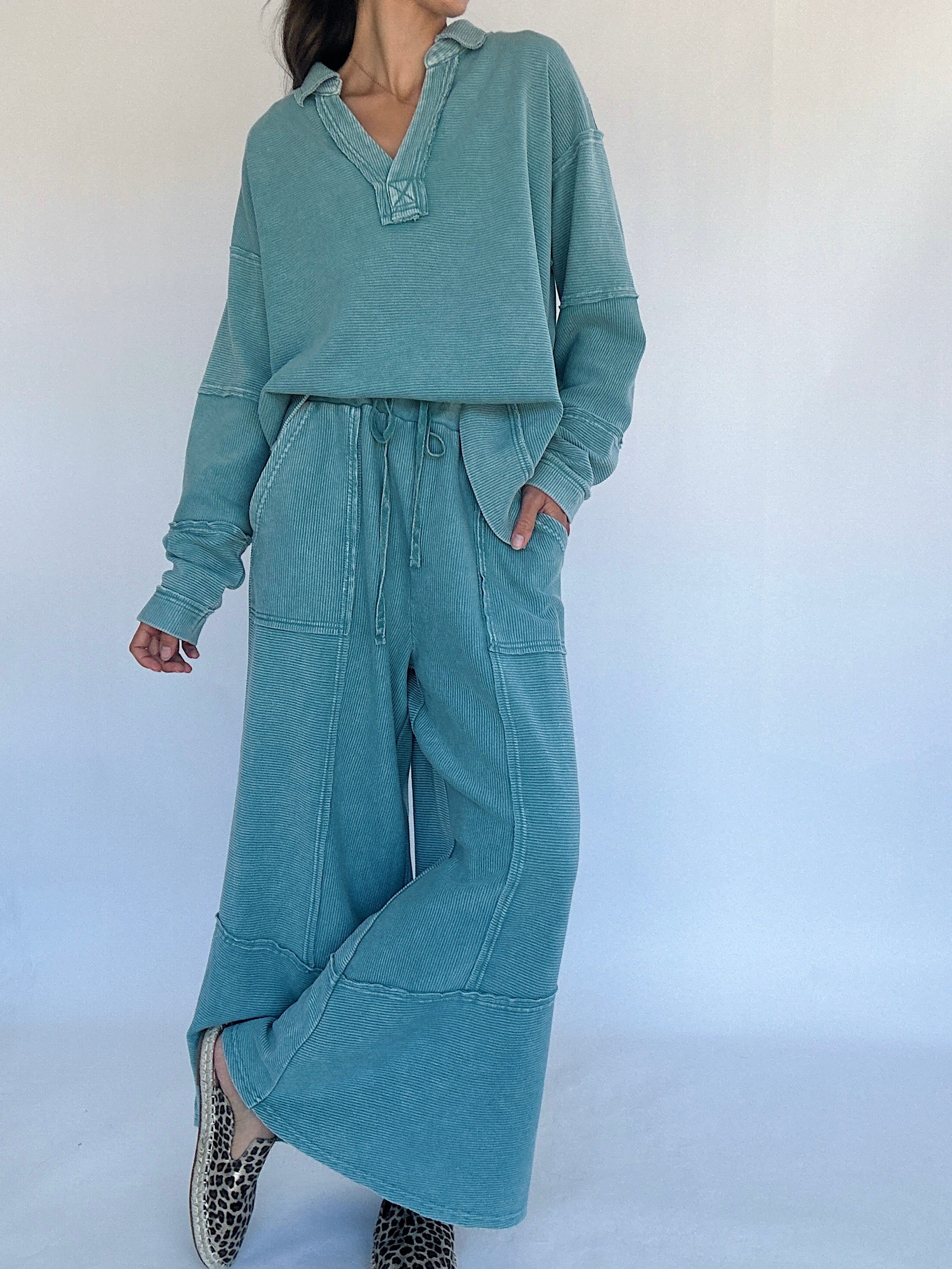 Jennie Ribbed Wide Leg Pants - Faded Teal