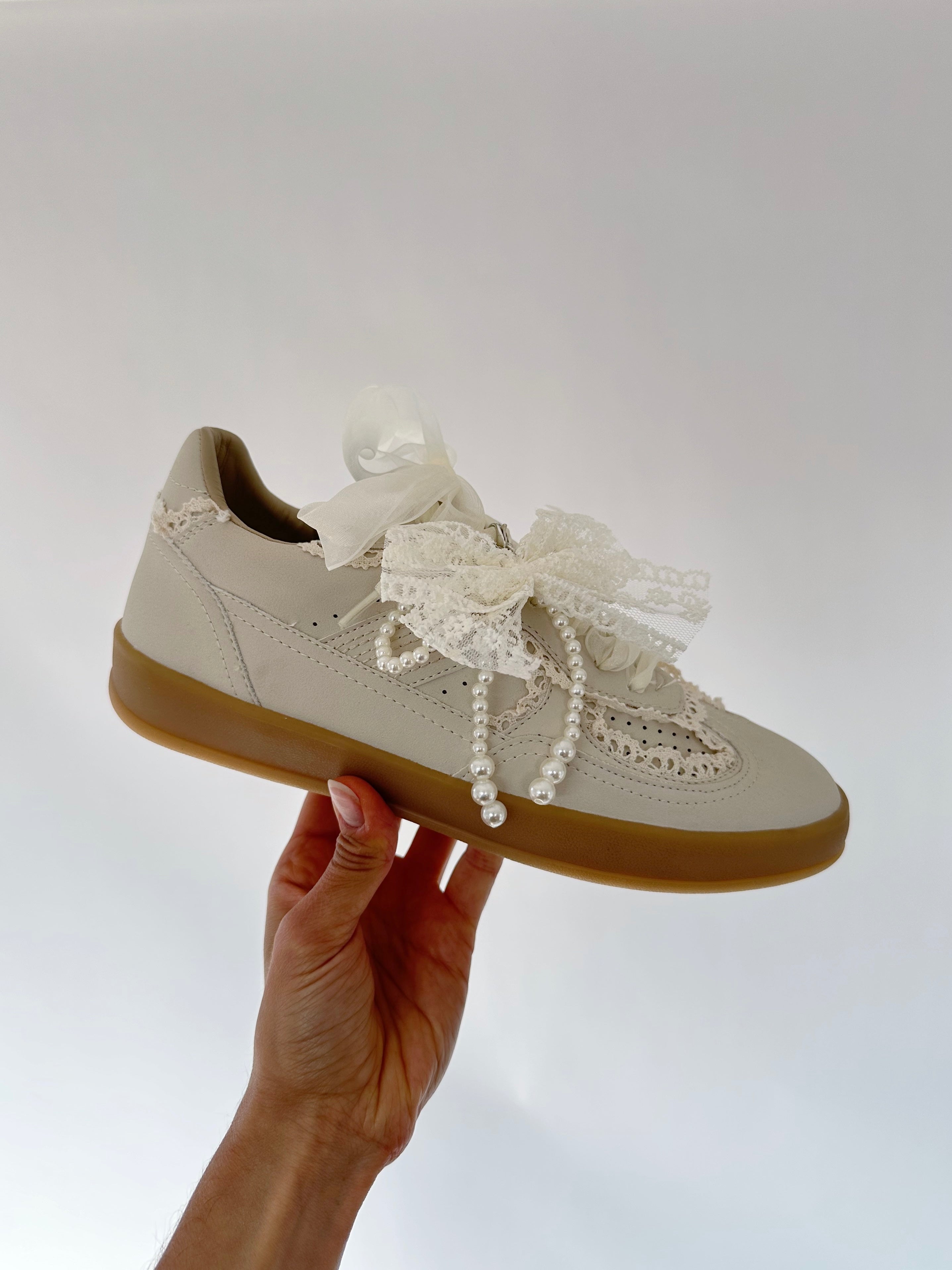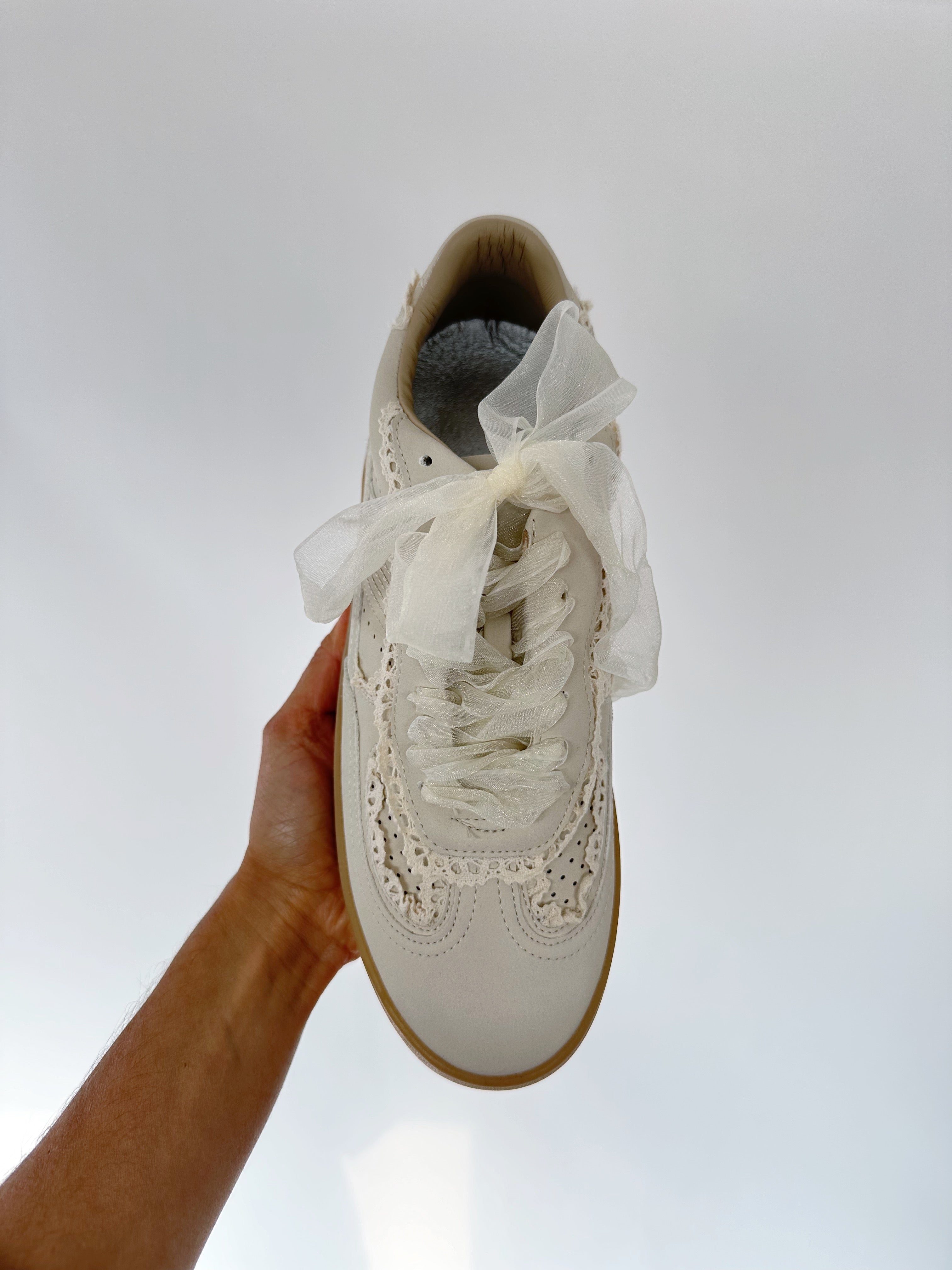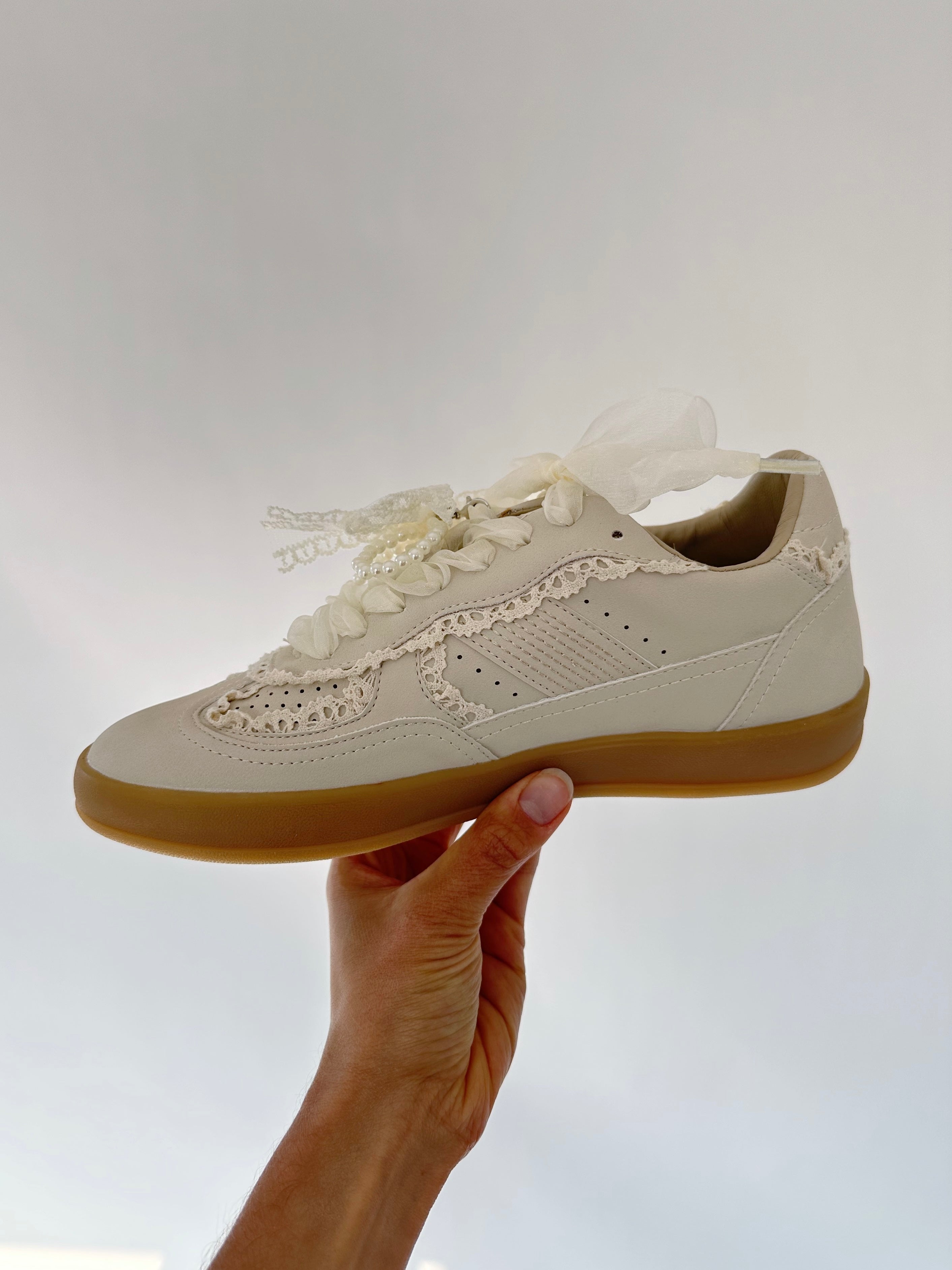 This ivory sneaker is soft, romantic, girly and casual all at the same time! With lace accent and ribbon laces (+ they come with regular laces to change out!) they are perfect to pair with dainty tops and jeans or cute dresses + skirts!