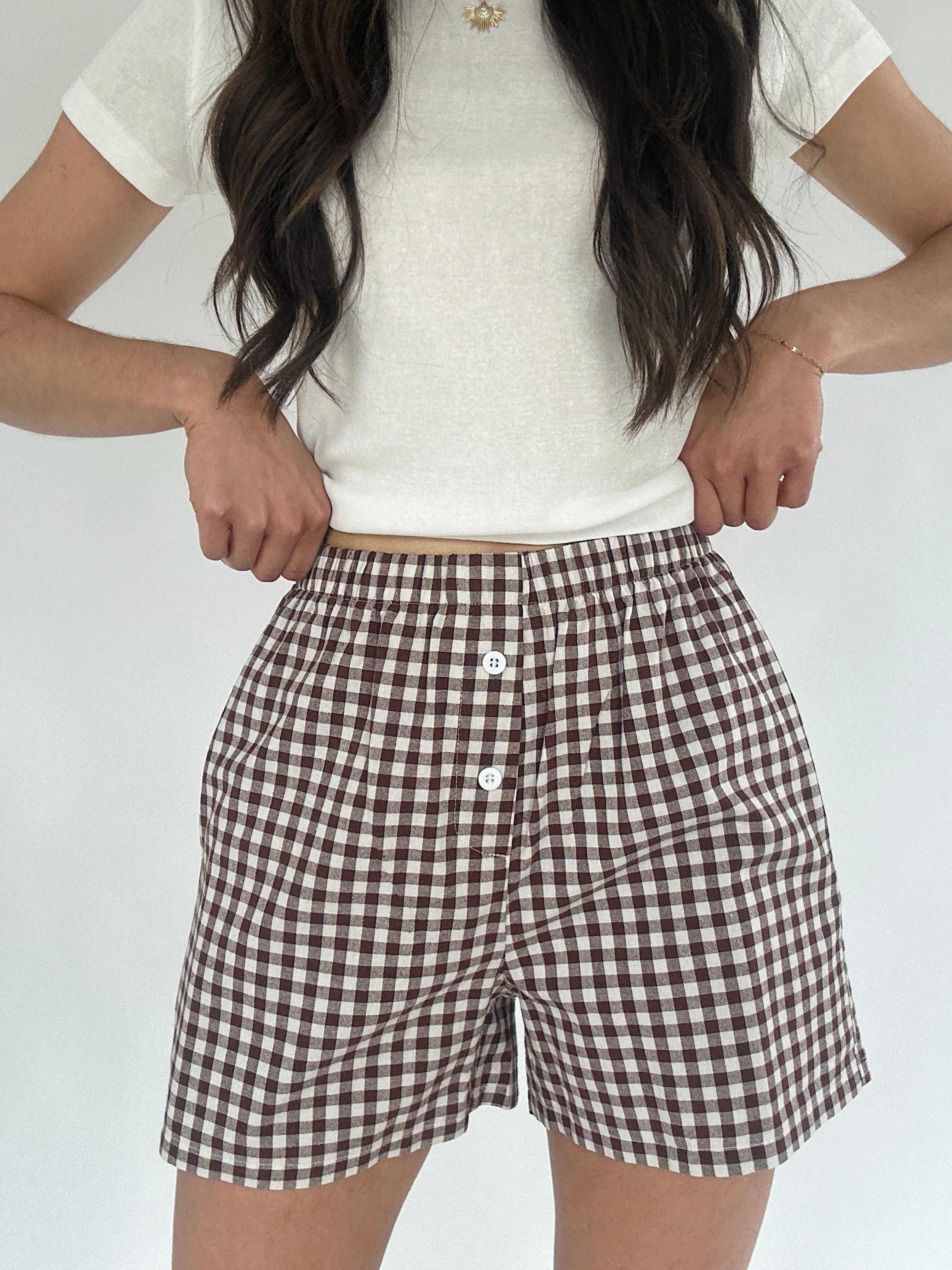 These brown and white checkered boxer style shorts are so trendy for spring and summer! They have an elastic waistband, button detail and are super comfy. Pair with cardigans and clogs to dress them up a little or graphic tees and sweatshirts to make a cute lounge outfit!