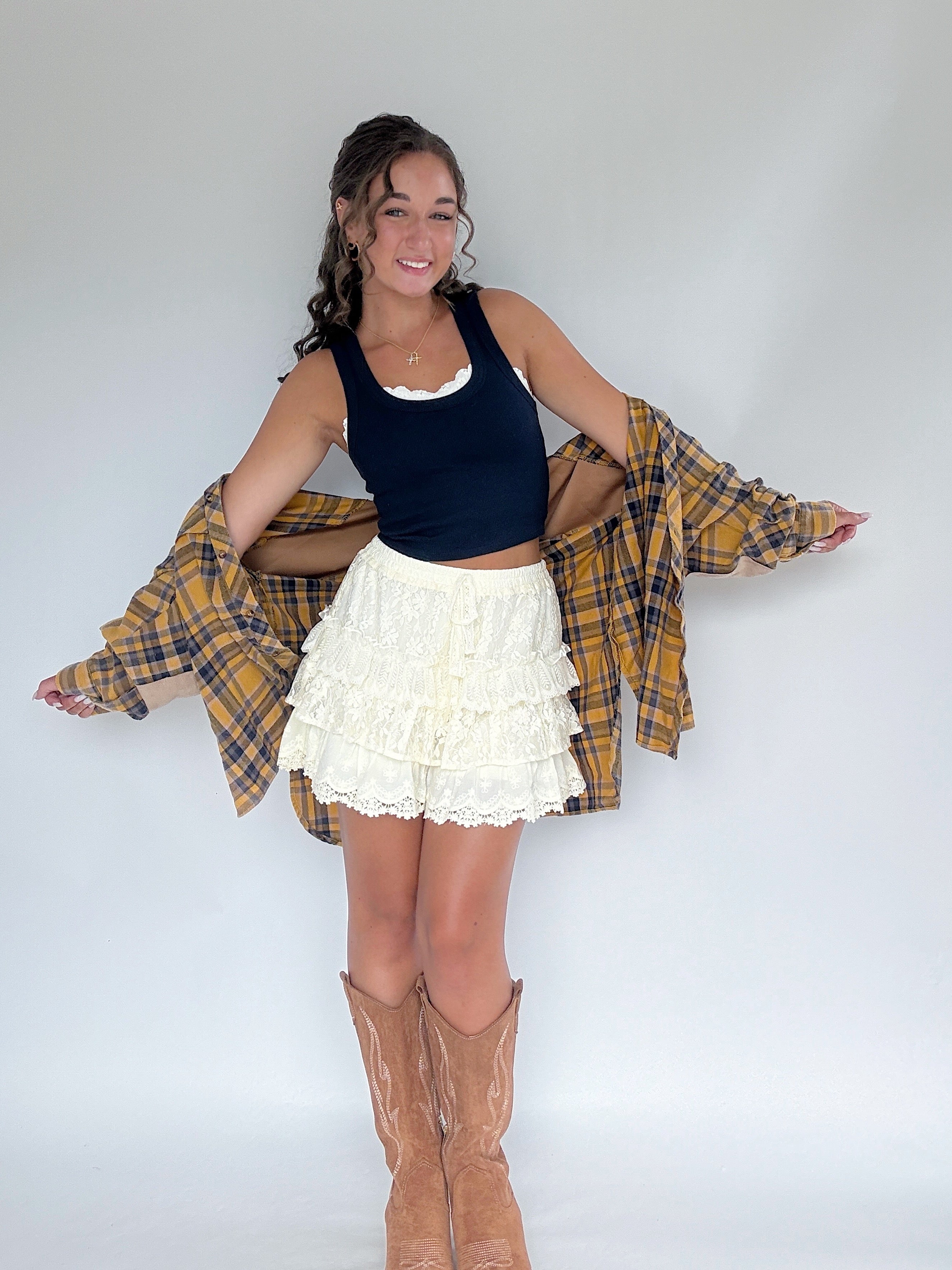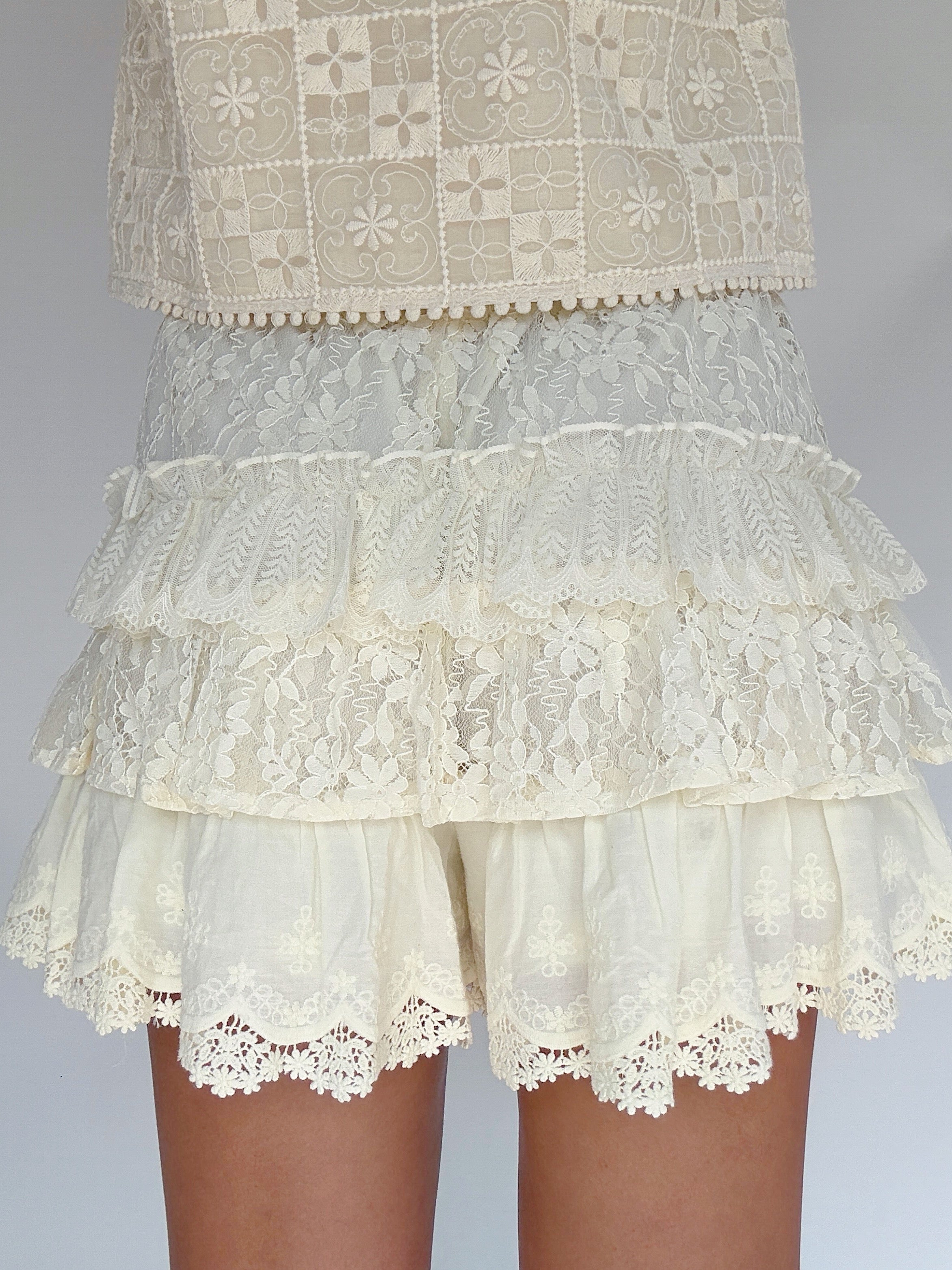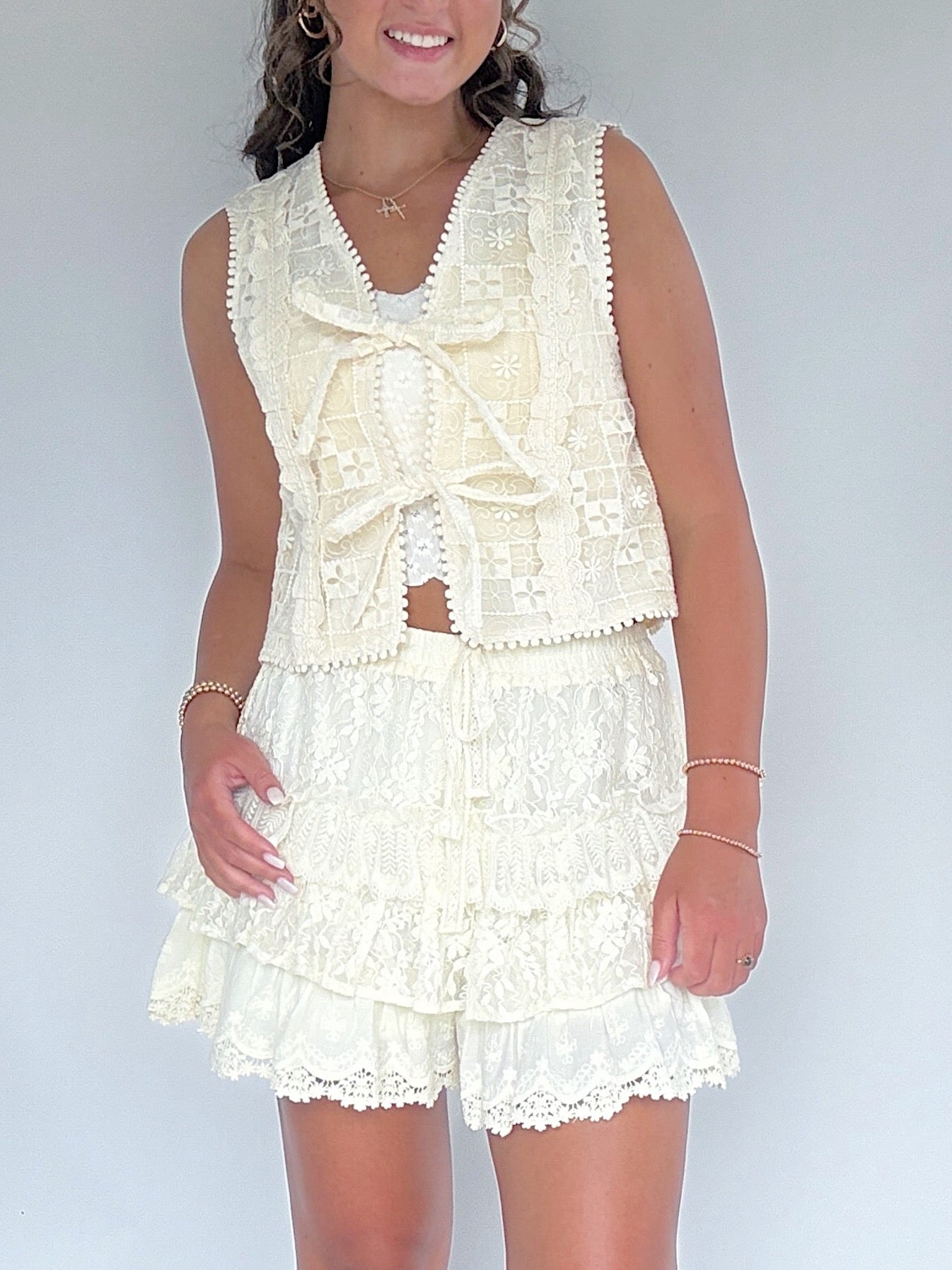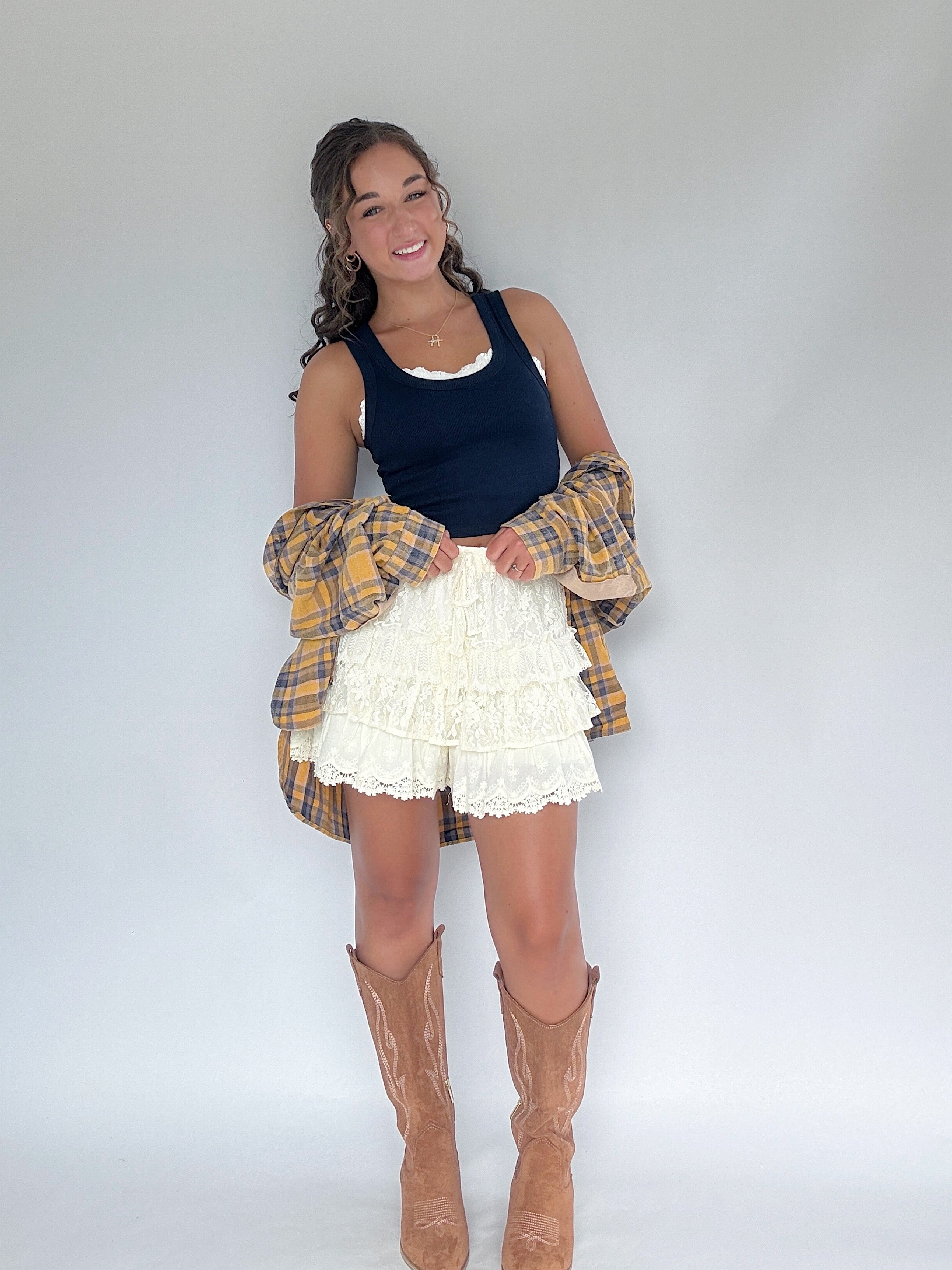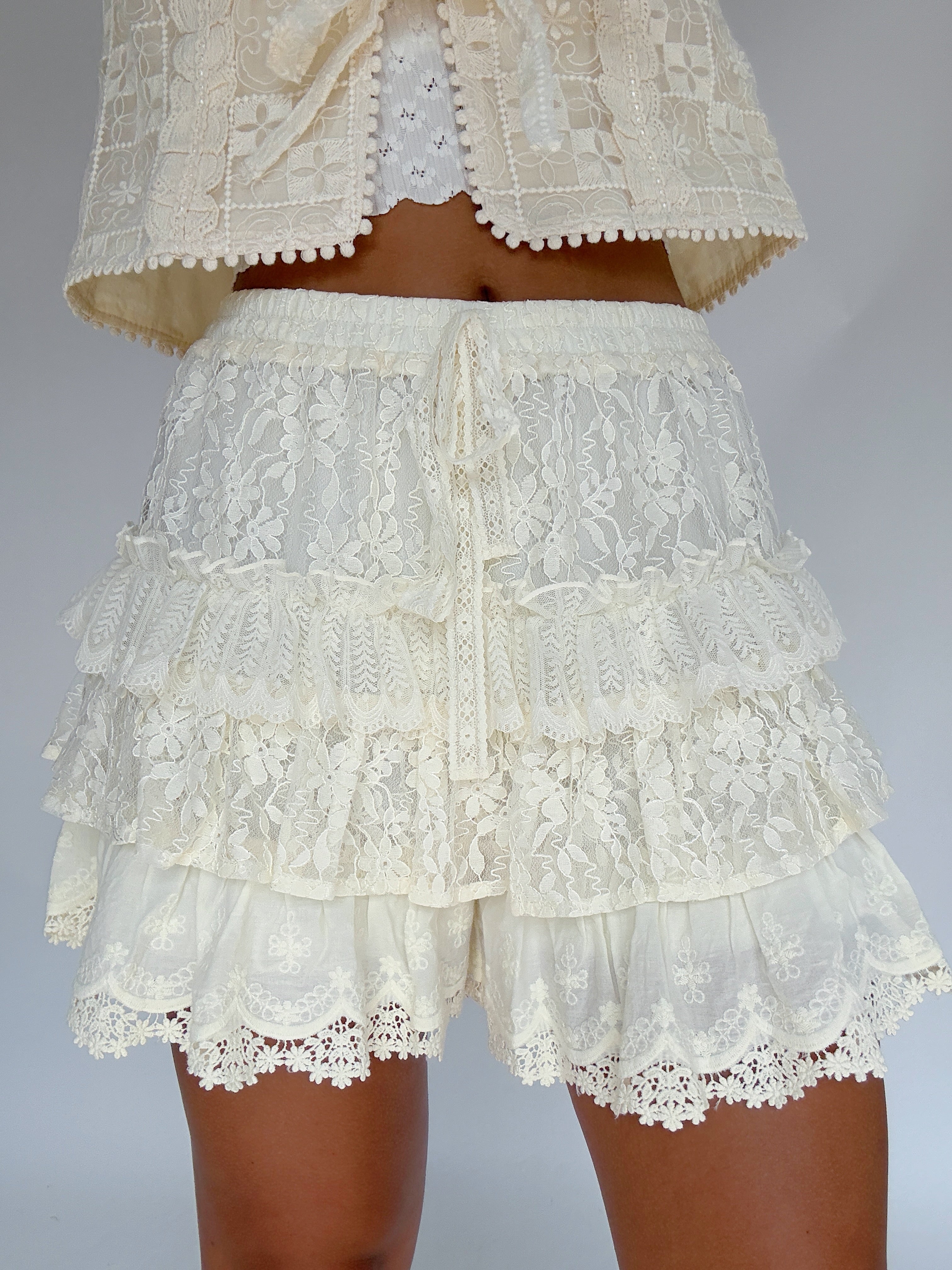 Jump on the cutest trend with these ruffled lace shorts that are perfect for concerts, outdoor BBQs or a fun day out with the girls! The mixed floral lace is ruffled and tiered to give it a flirty, feminine feel and has a comfy fit with an elastic waistband and front tie. Pair them with a graphic tee and boots for a concert or a delicate blouse for a dreamy, romantic style!