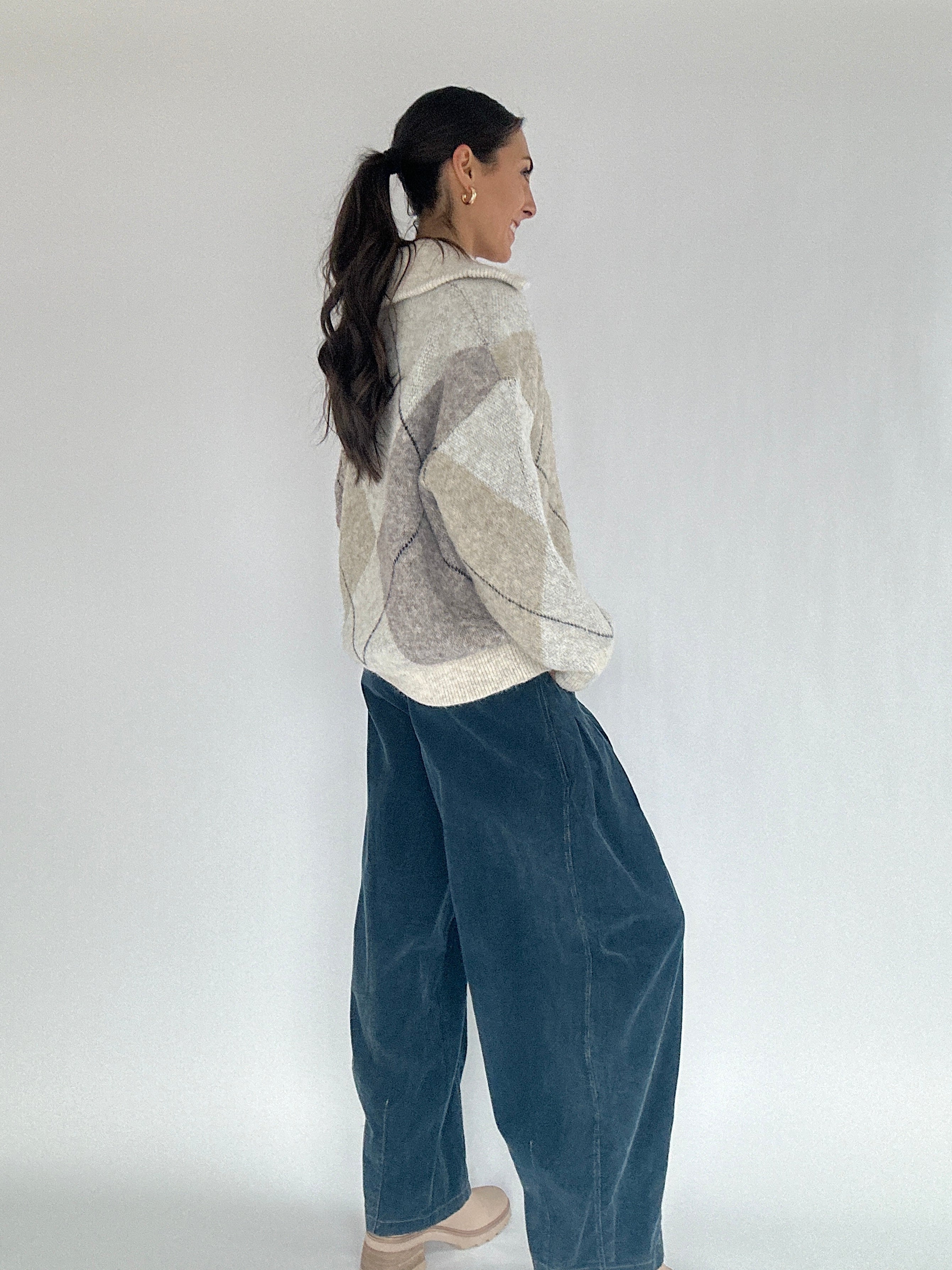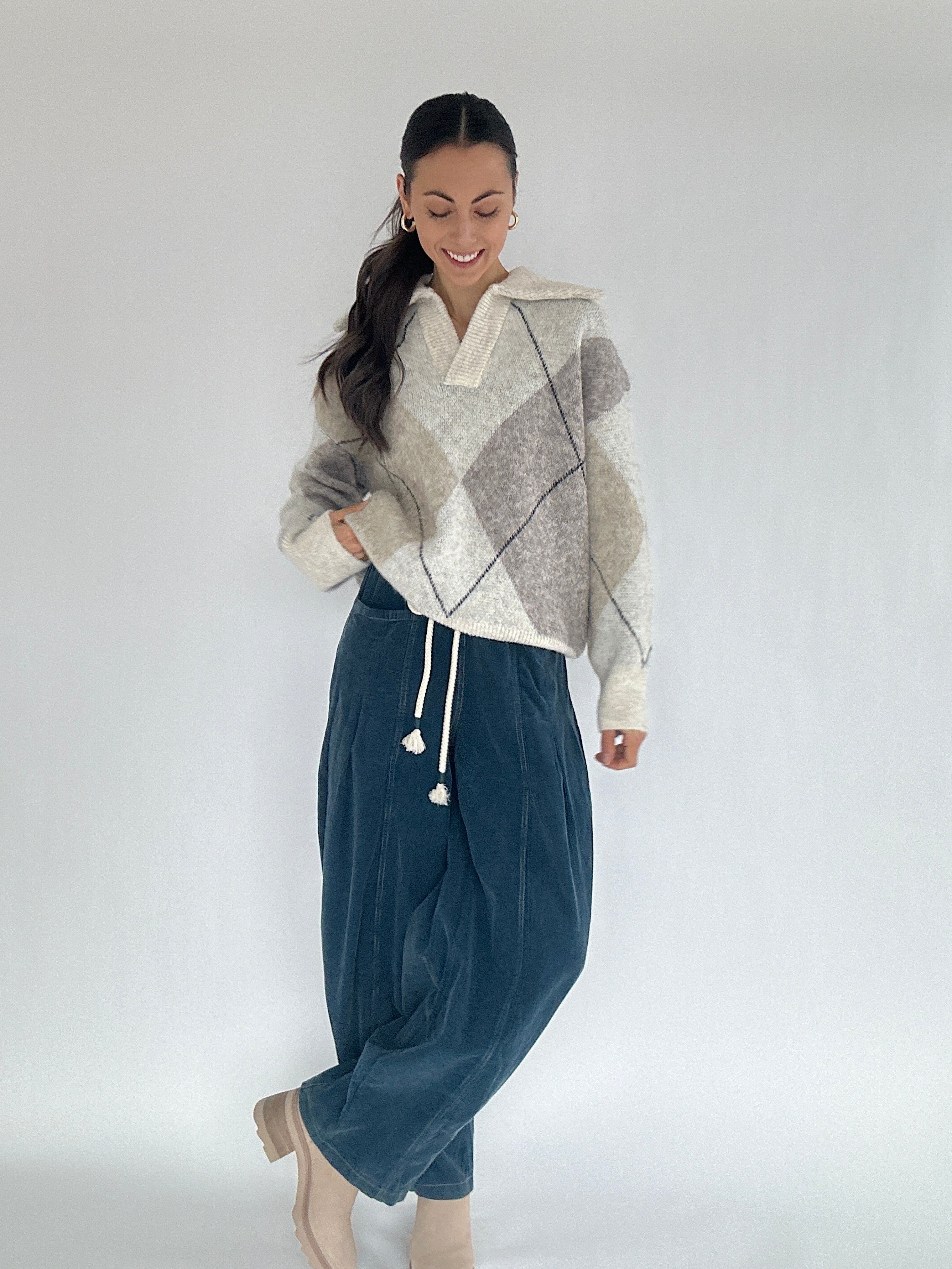 Send Me Signs Argyle Sweater – A cozy staple you’ll want to wear all season, this oatmeal-colored argyle sweater is perfect for casual outings, weekend coffee runs, or layering for cooler days. The split V-neckline and oversized collar add subtle interest, while the long sleeves and drop shoulders create a relaxed, comfortable fit that pairs effortlessly with jeans, skirts, or trousers.