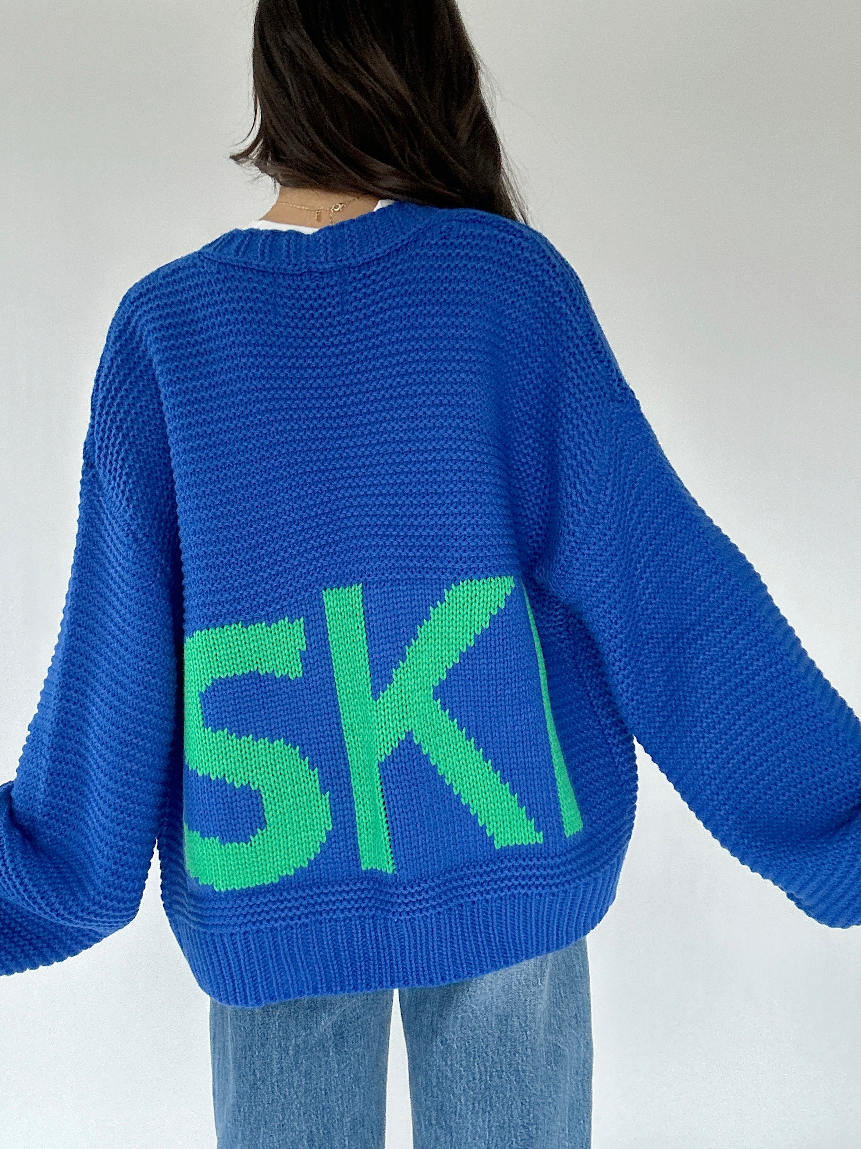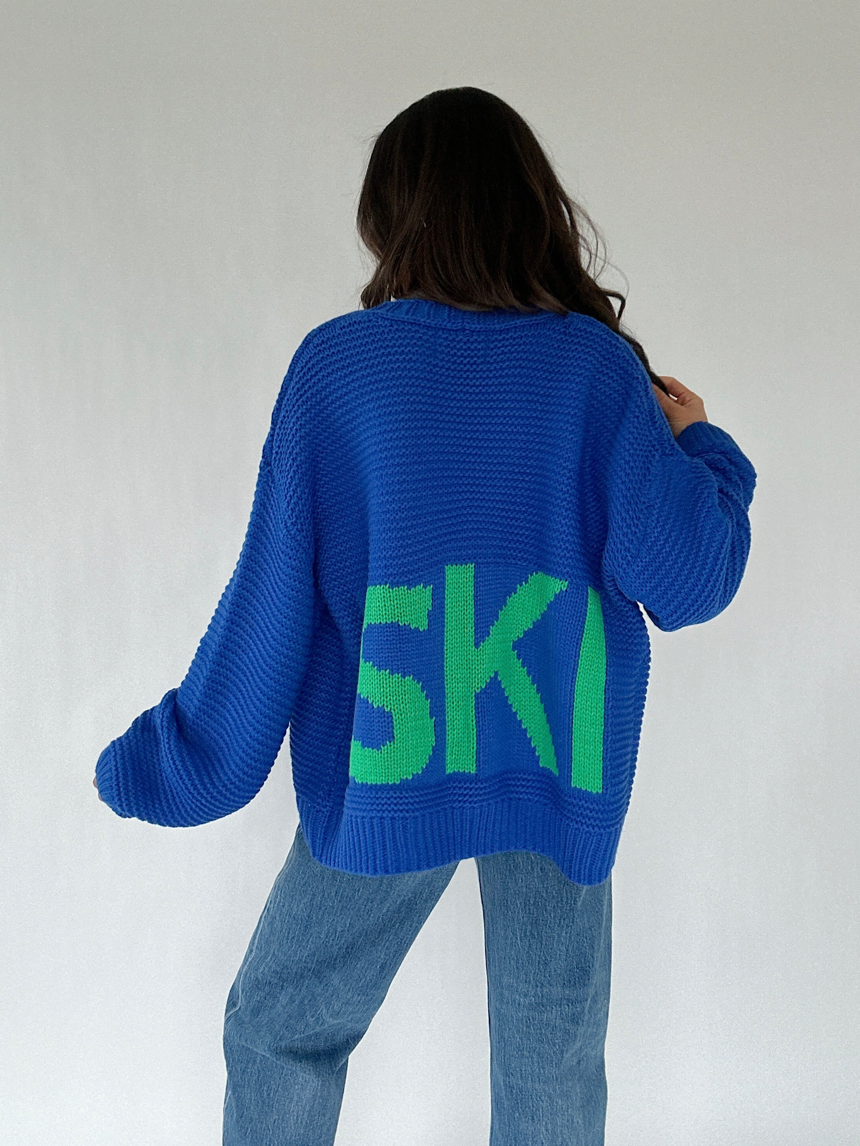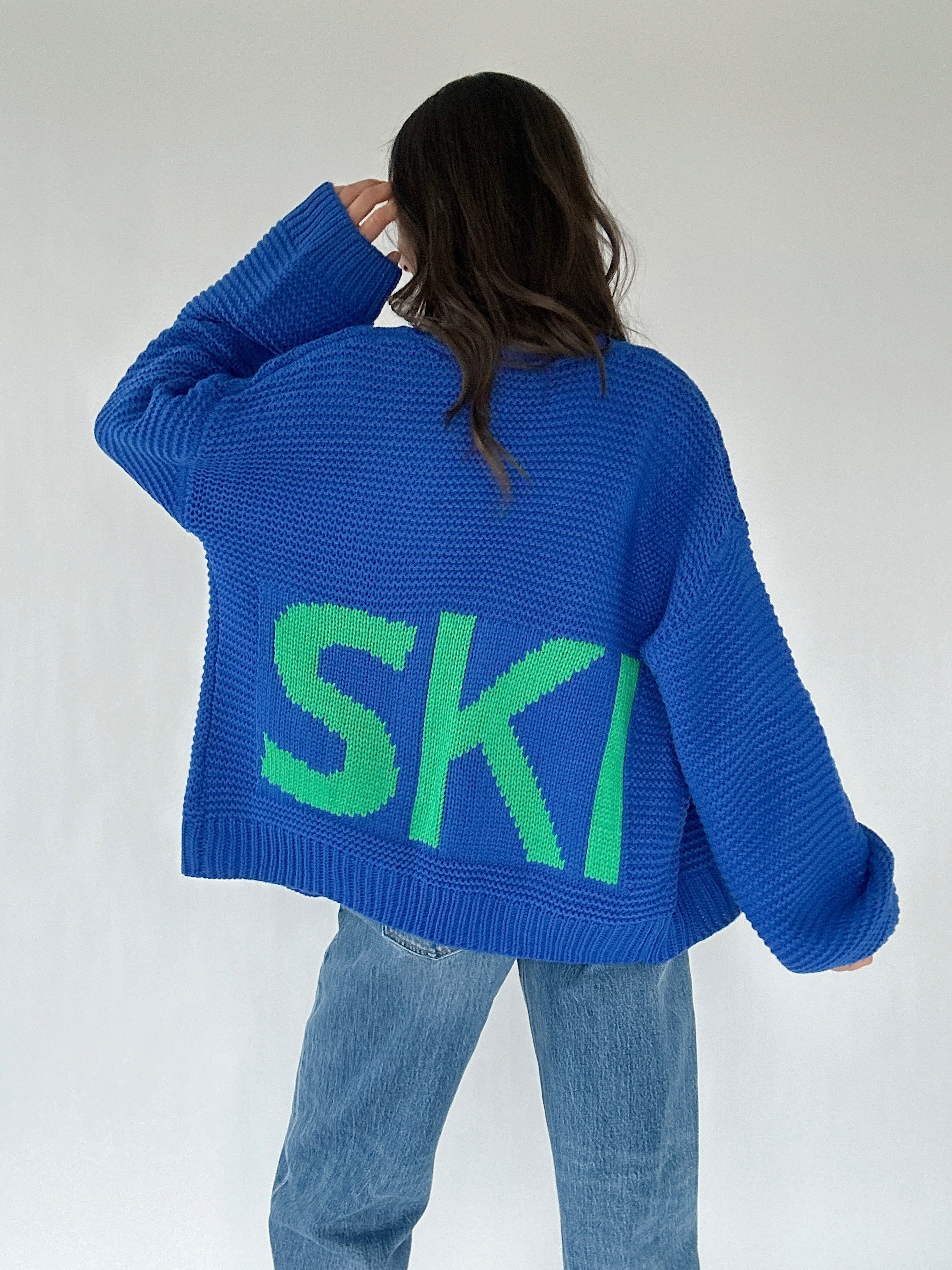 ✶ Bold cobalt blue knit with bright green “SKI” embroidery on back