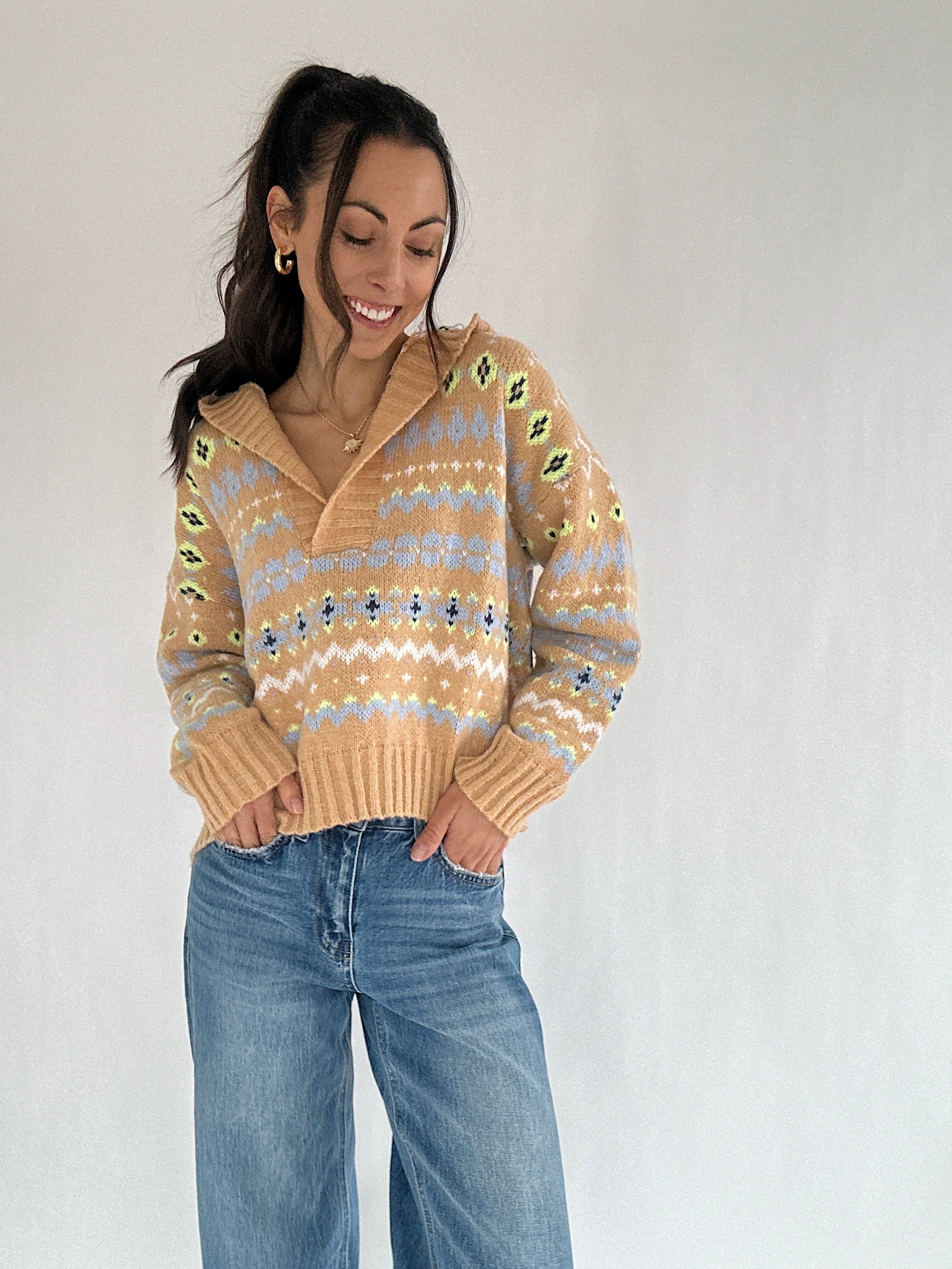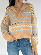 Cozy up in the We Could Just Go Hooded Sweater, a camel brown knit with playful blue, green, and ivory patterns throughout. The v-neckline and hood add a winter charm, while the relaxed fit makes it easy to style with jeans or pair with wide-leg sweatpants for an effortlessly comfy outfit.
