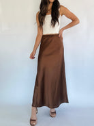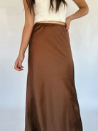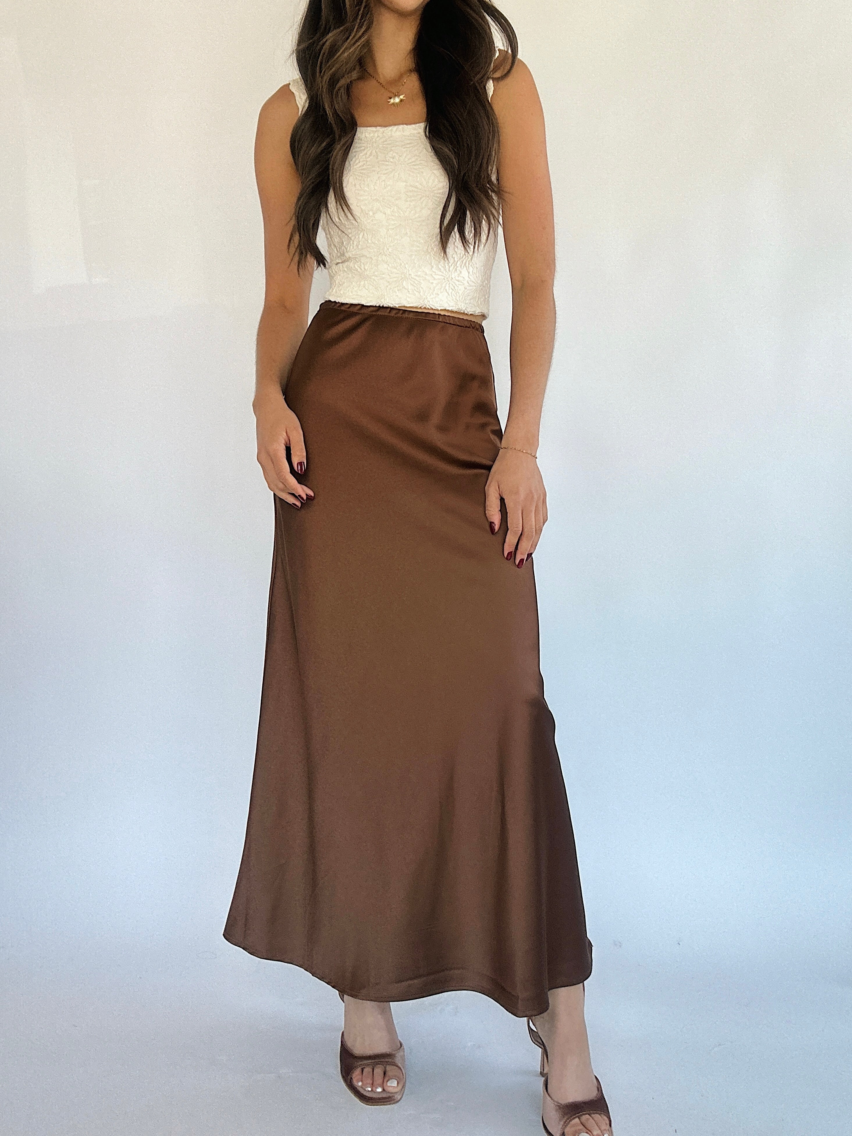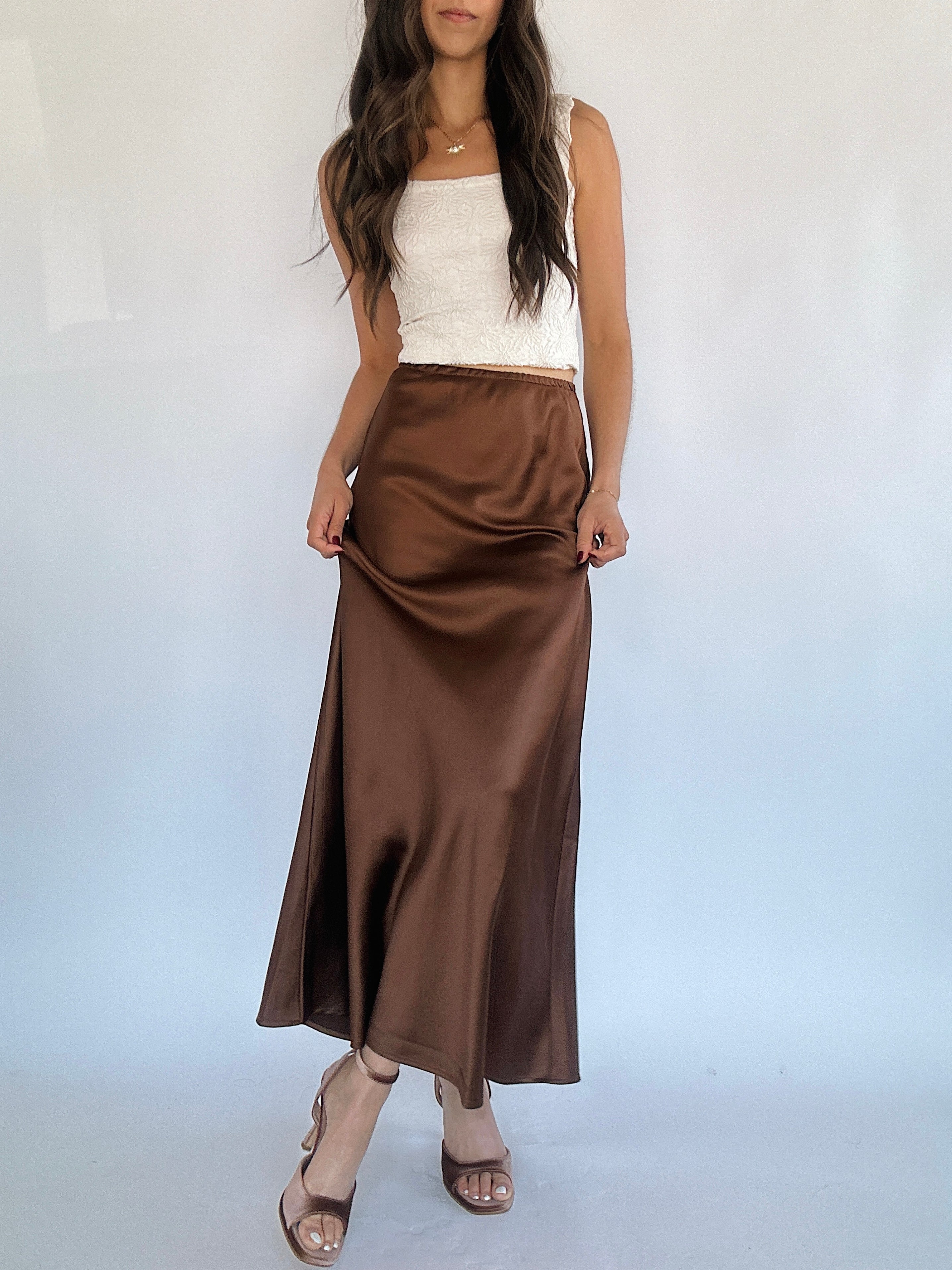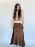 This brown satin slip midi skirt has an elastic waist and is the cutest basic piece to have in your closet to wear with sweaters, cardigans and graphic tees this season!
