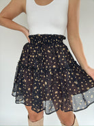This navy and yellow floral and dot printed mini skirt has a flirty ruffle hem, an elastic waist and is fully lined. Pair with a sweater and boots or a graphic tee and sneakers!