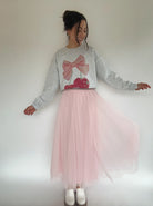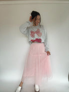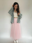 This light pink maxi skirt is chic and fun at the same time! It has an elastic waistband with a full lining and tulle overlay. Dress it down with a sweatshirt or graphic tee and dress it up with a sweater and heels for your next event!