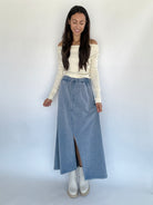 This washed denim blue french terry maxi skirt has a cute fit and is SO comfy! It has an elastic waist with drawstring, side pockets and front slits.