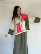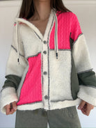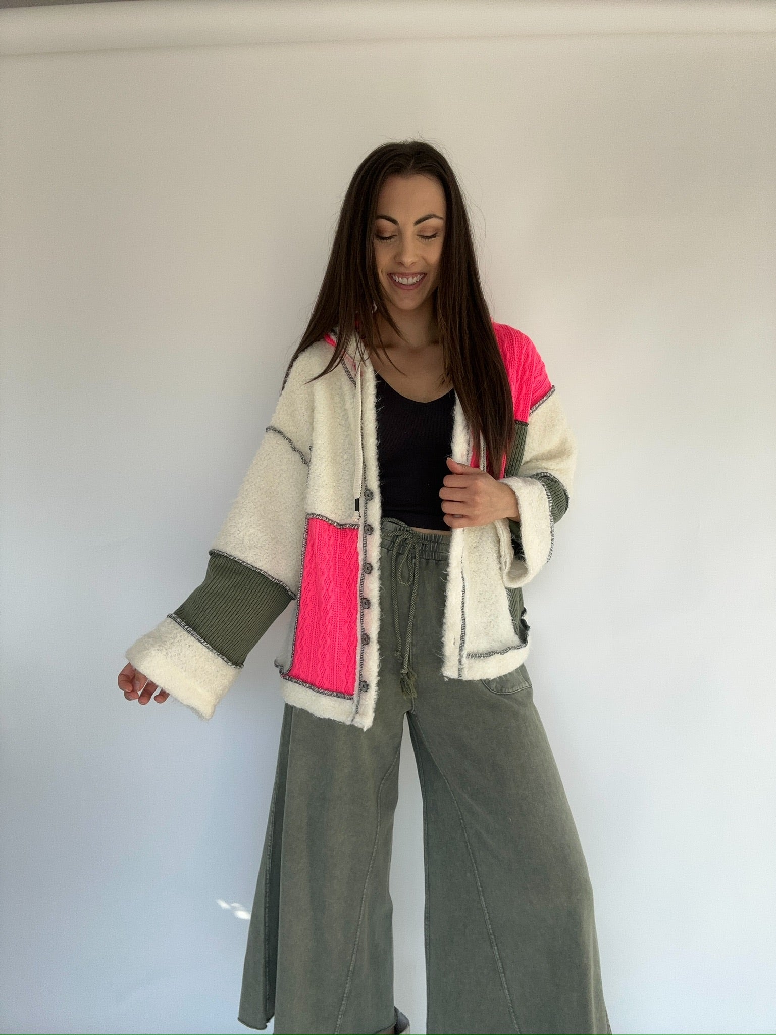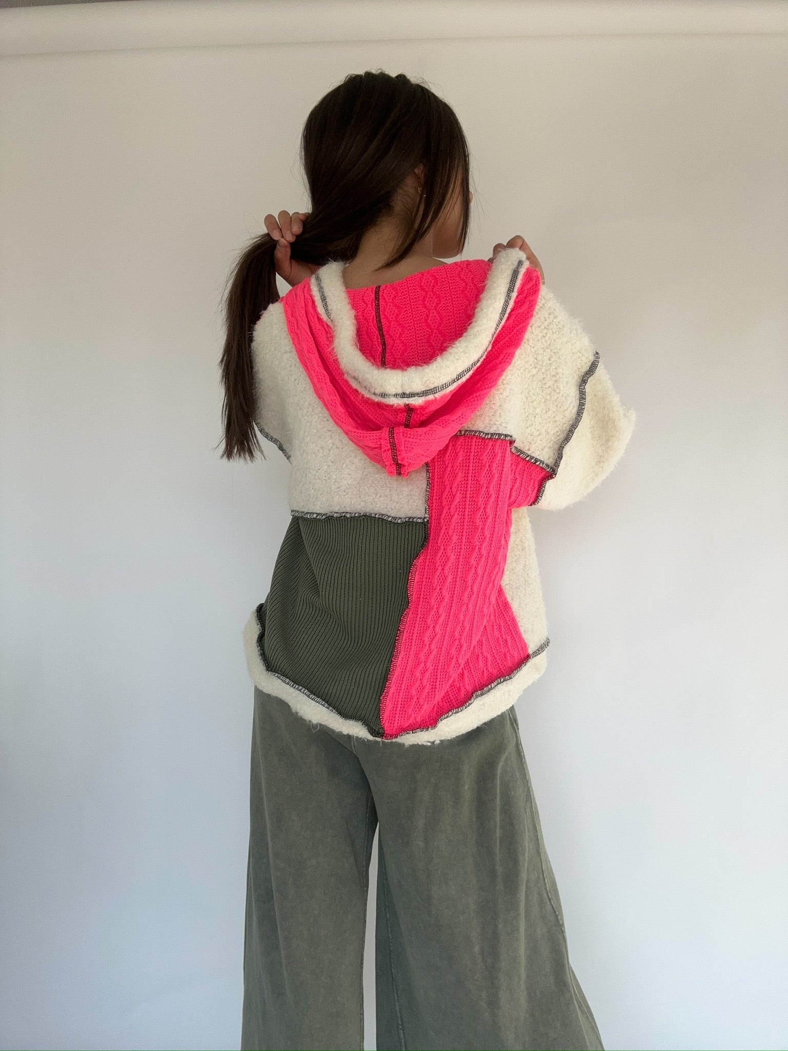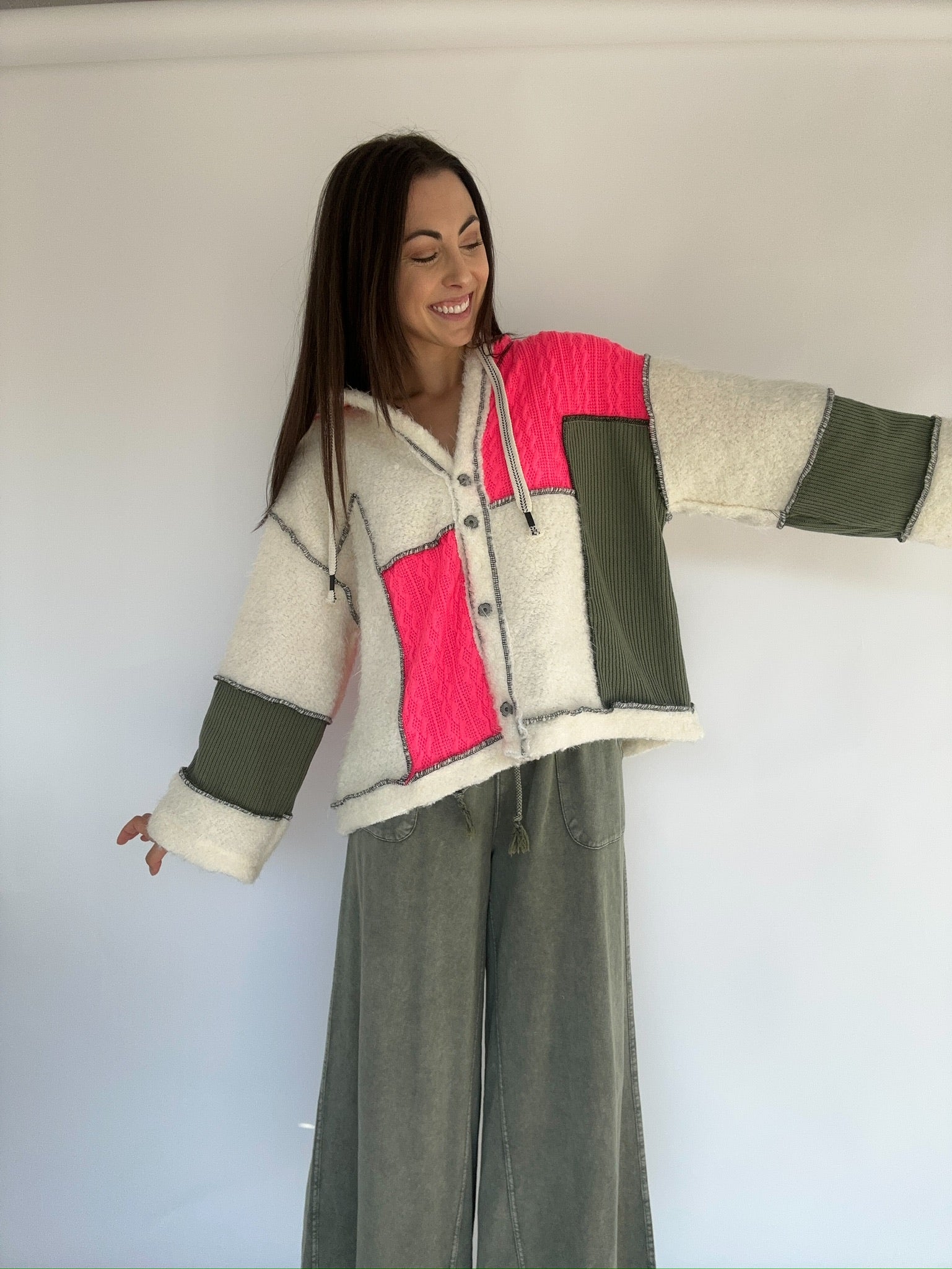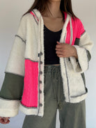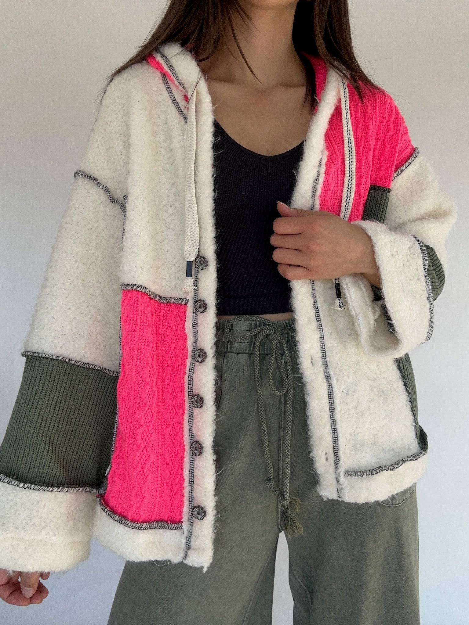 This color blocked ivory, green and pink sherpa fleece cardigan is hooded with a v-neckline, snap button front and oversized fit. Wear it buttoned like a sweater or open like a cardigan.