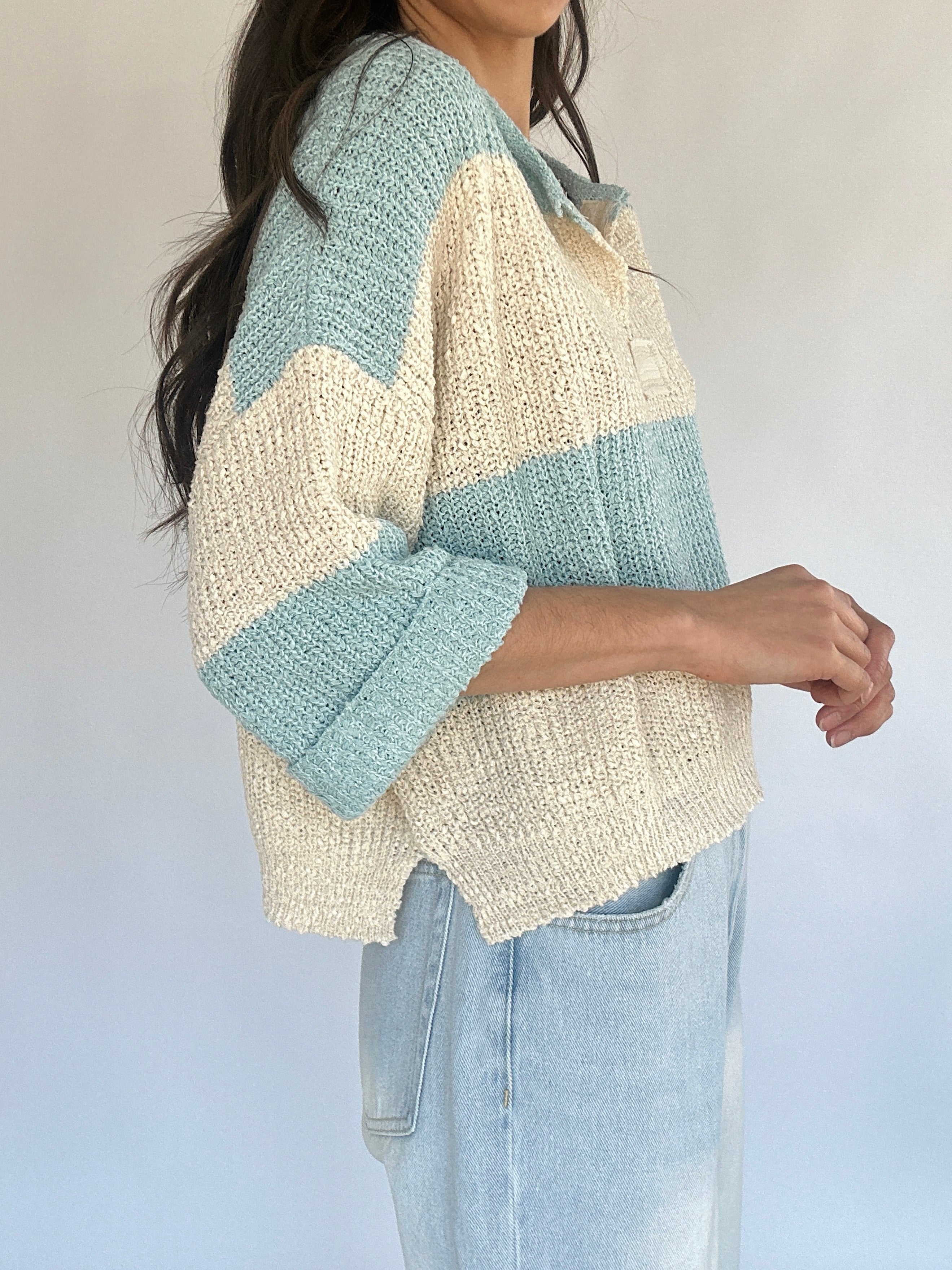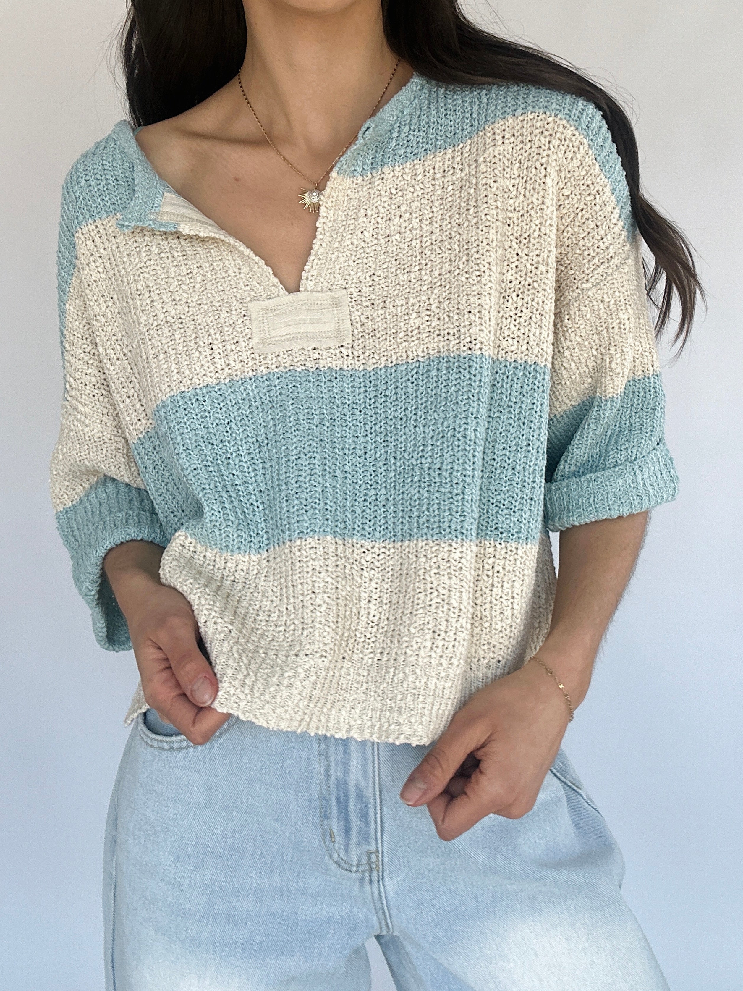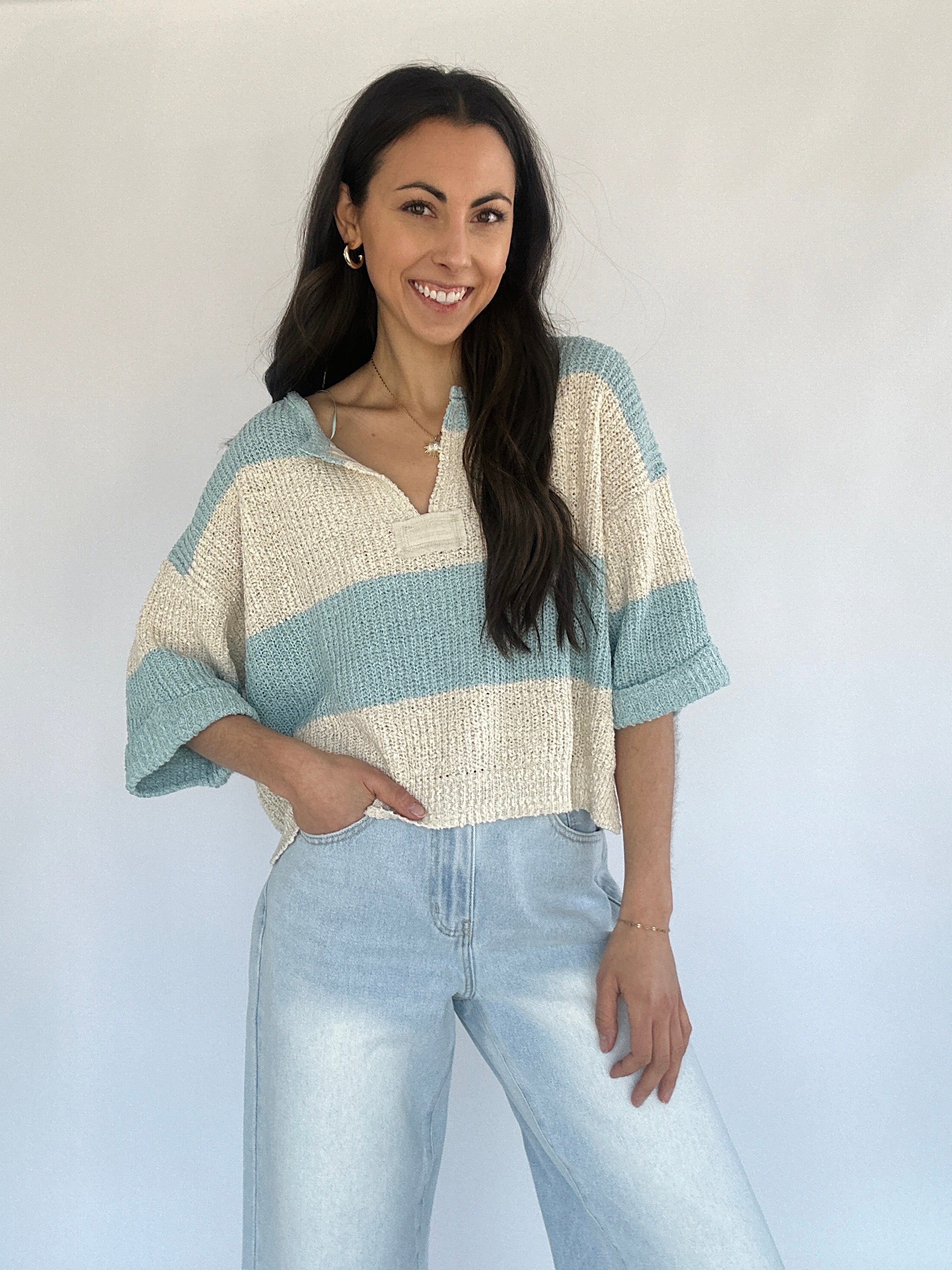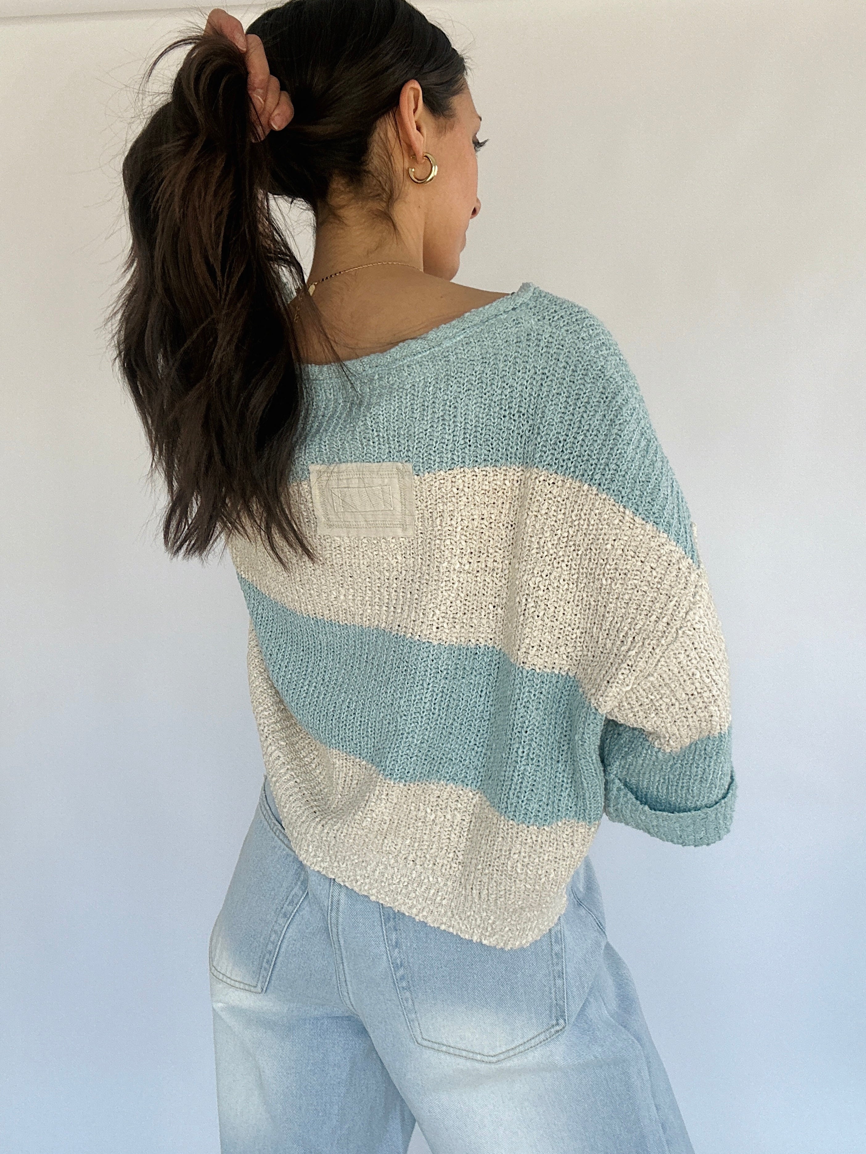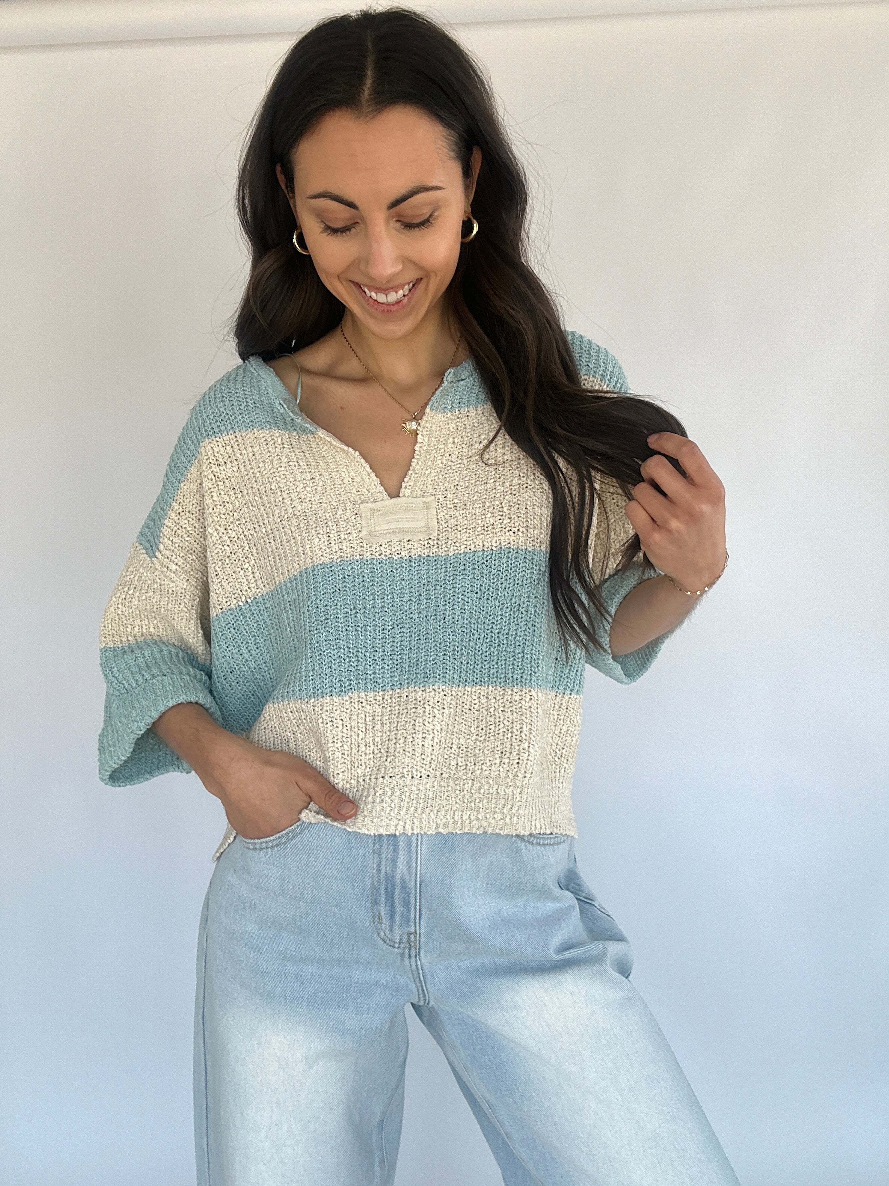 This ecru and mint blue knit striped sweater has a notched v-neckline, rolled 3/4 sleeves and slightly cropped fit. It's light weight and makes such an easy outfit with your fave denim!