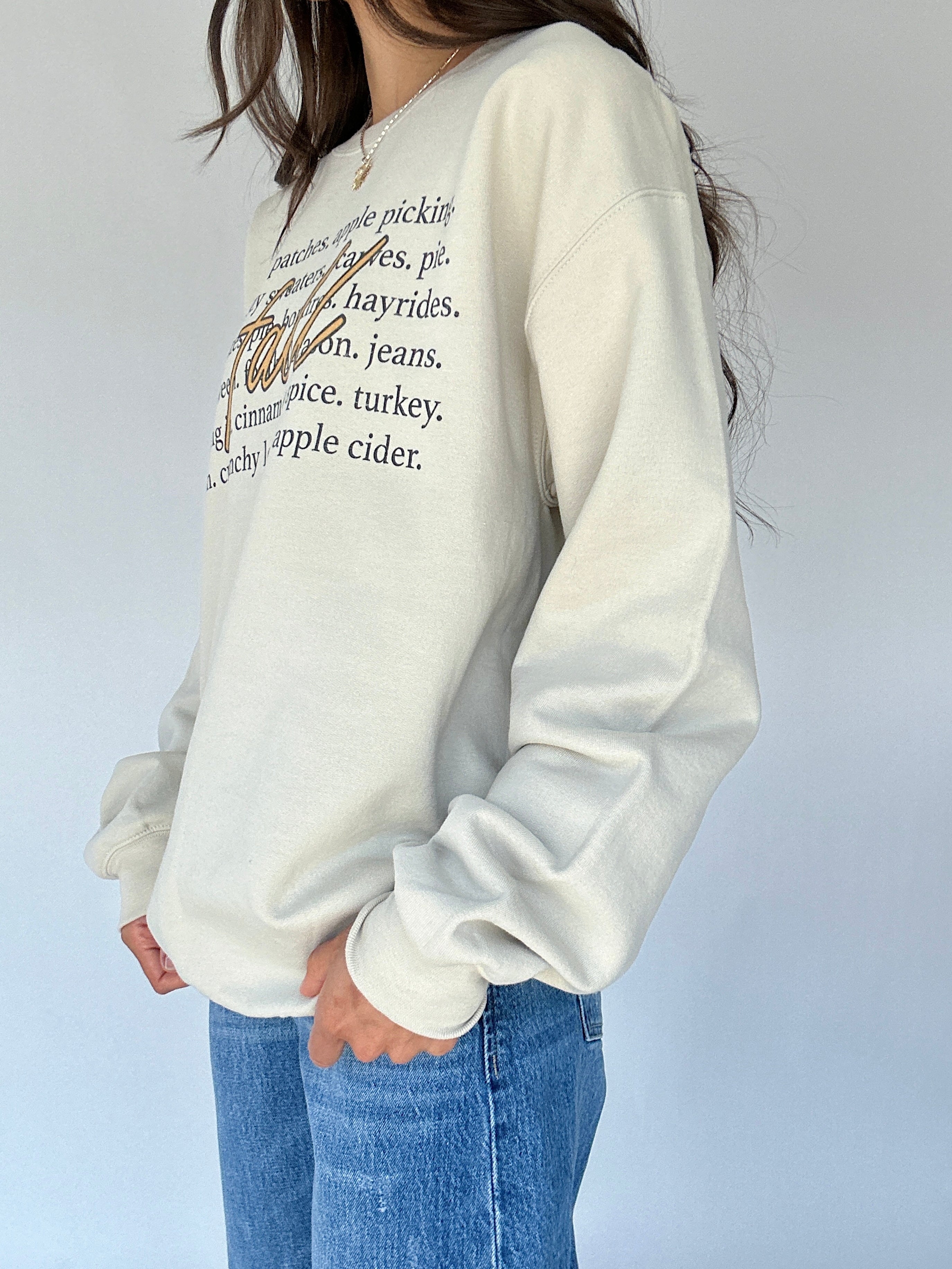 All the fall favorites spelled out on a sand oversized fit crewneck sweatshirt.