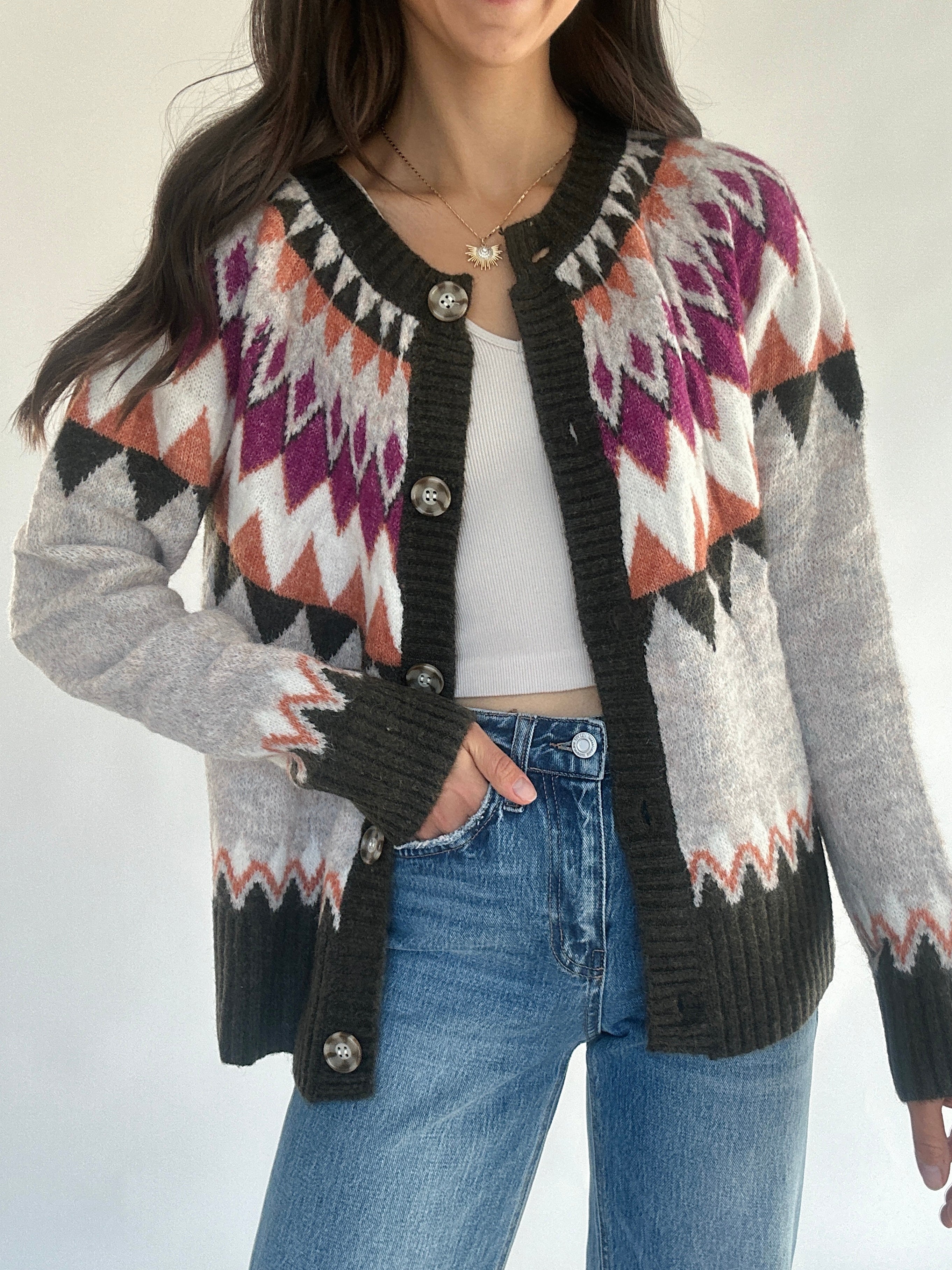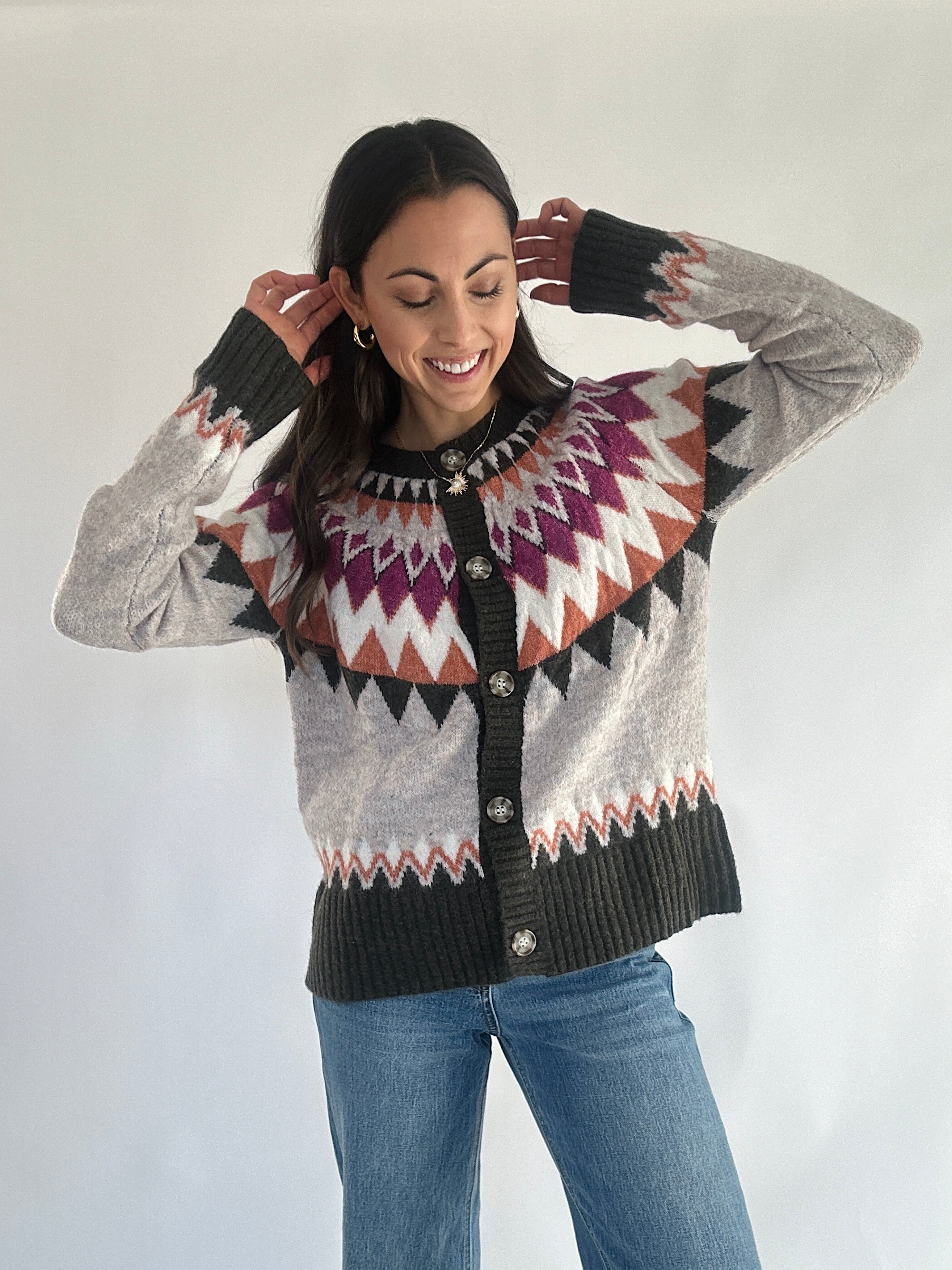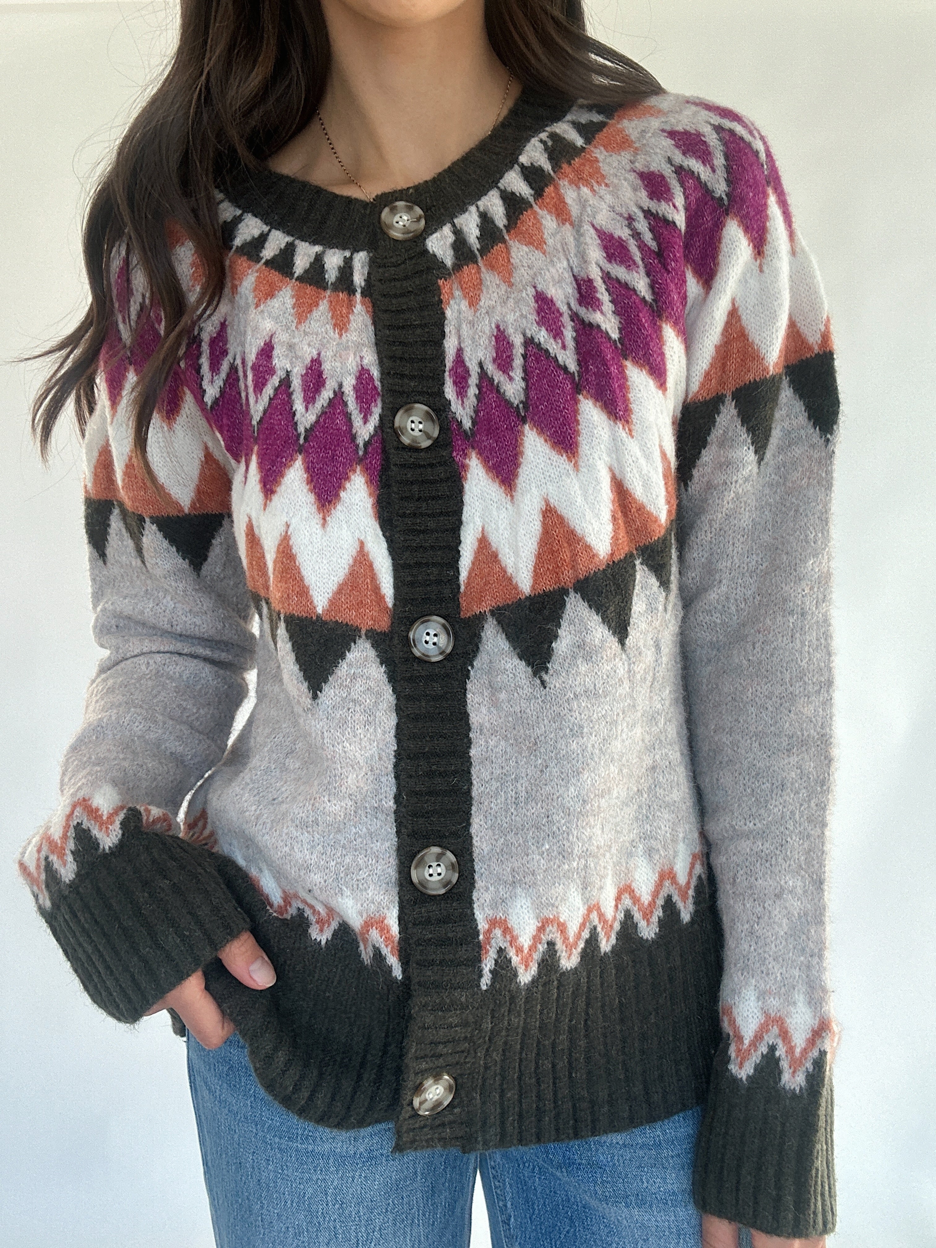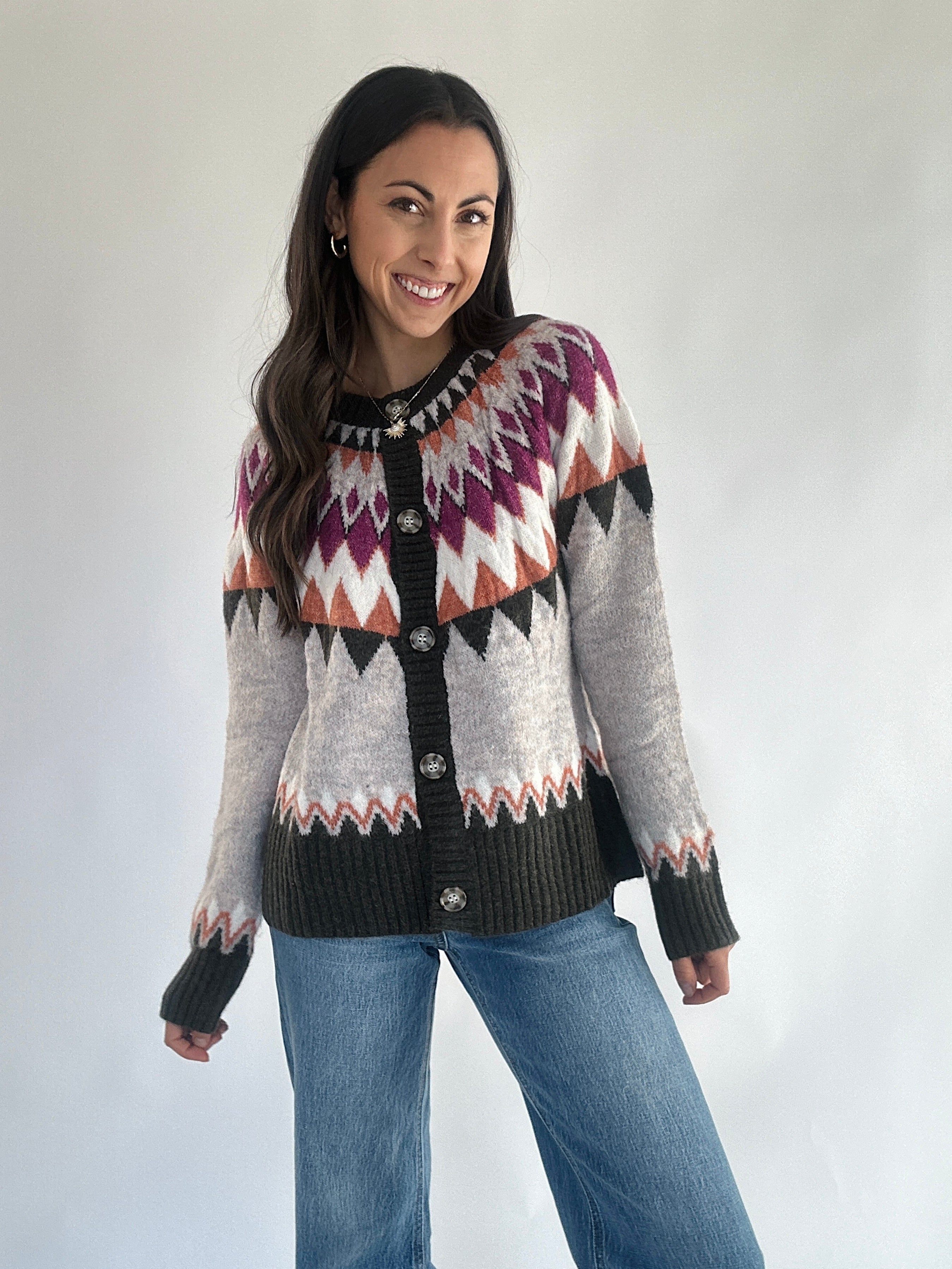 This dark olive, grey and pink sweater cardigan has a fun argyle pattern and a button front. The ribbed neckline hems and cuffs makes it a must have for the season!