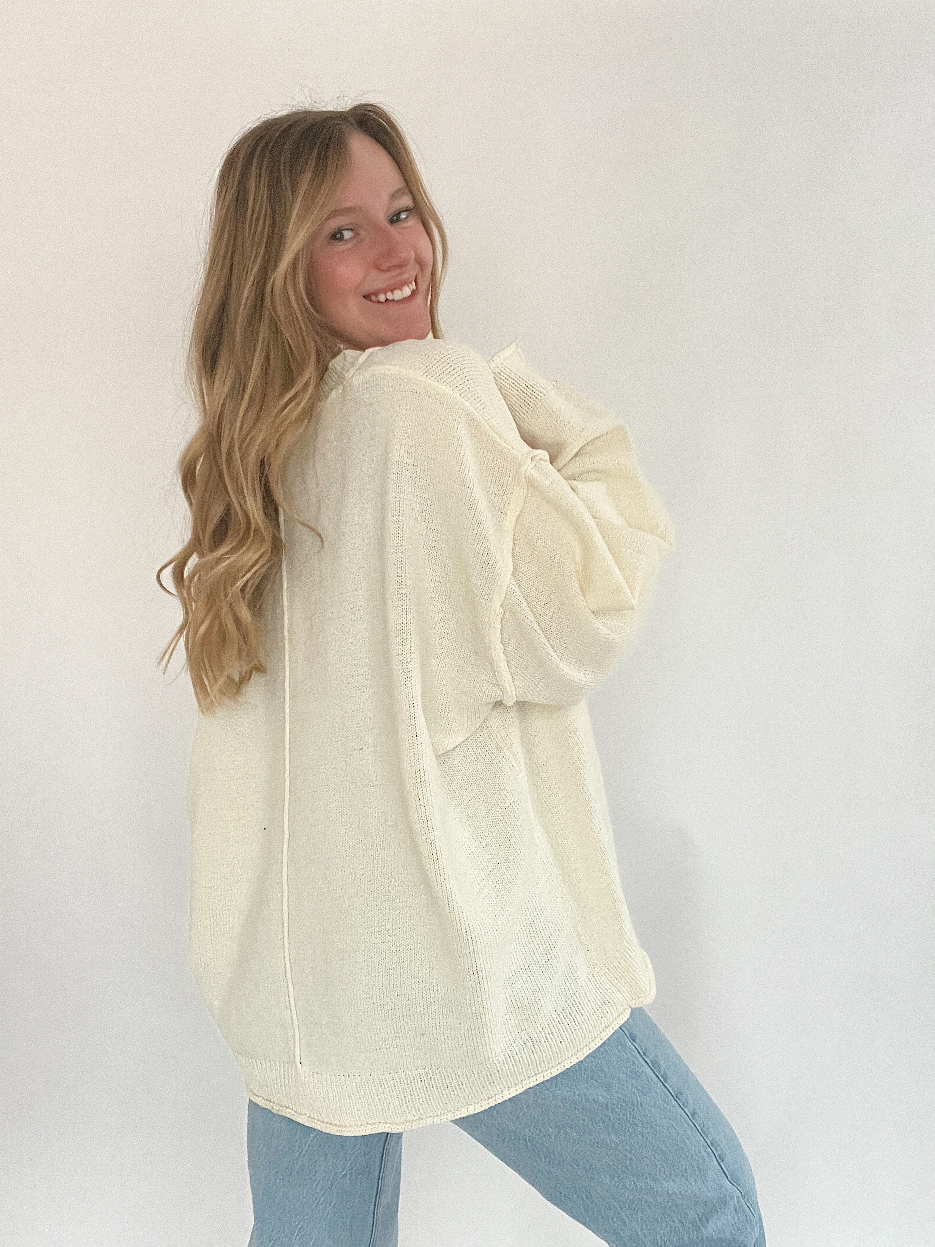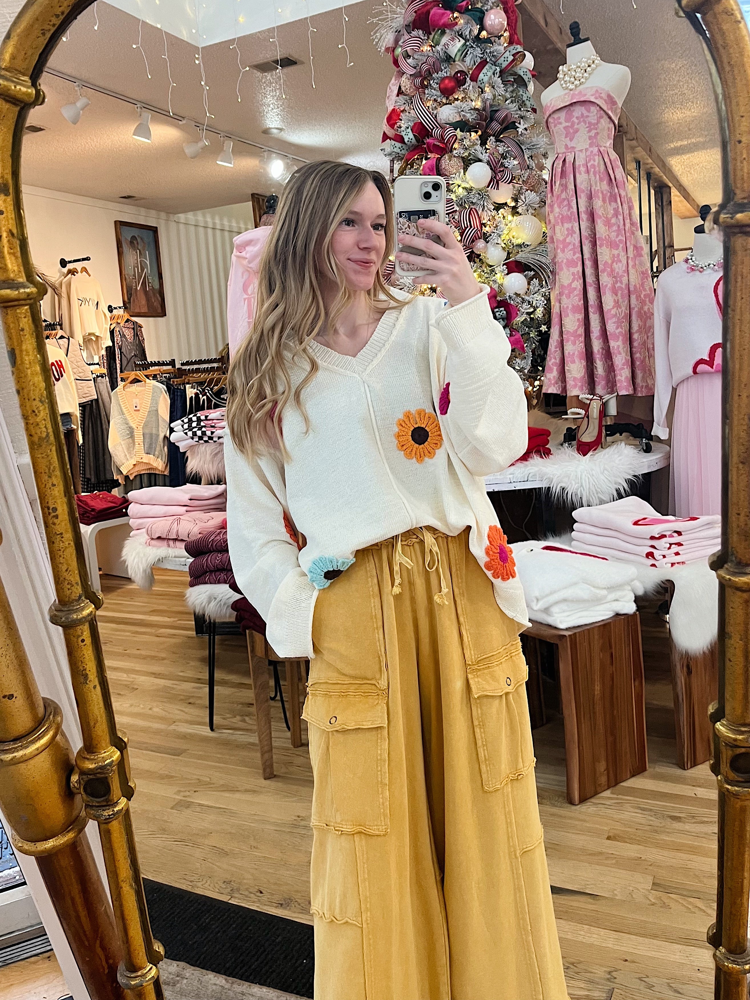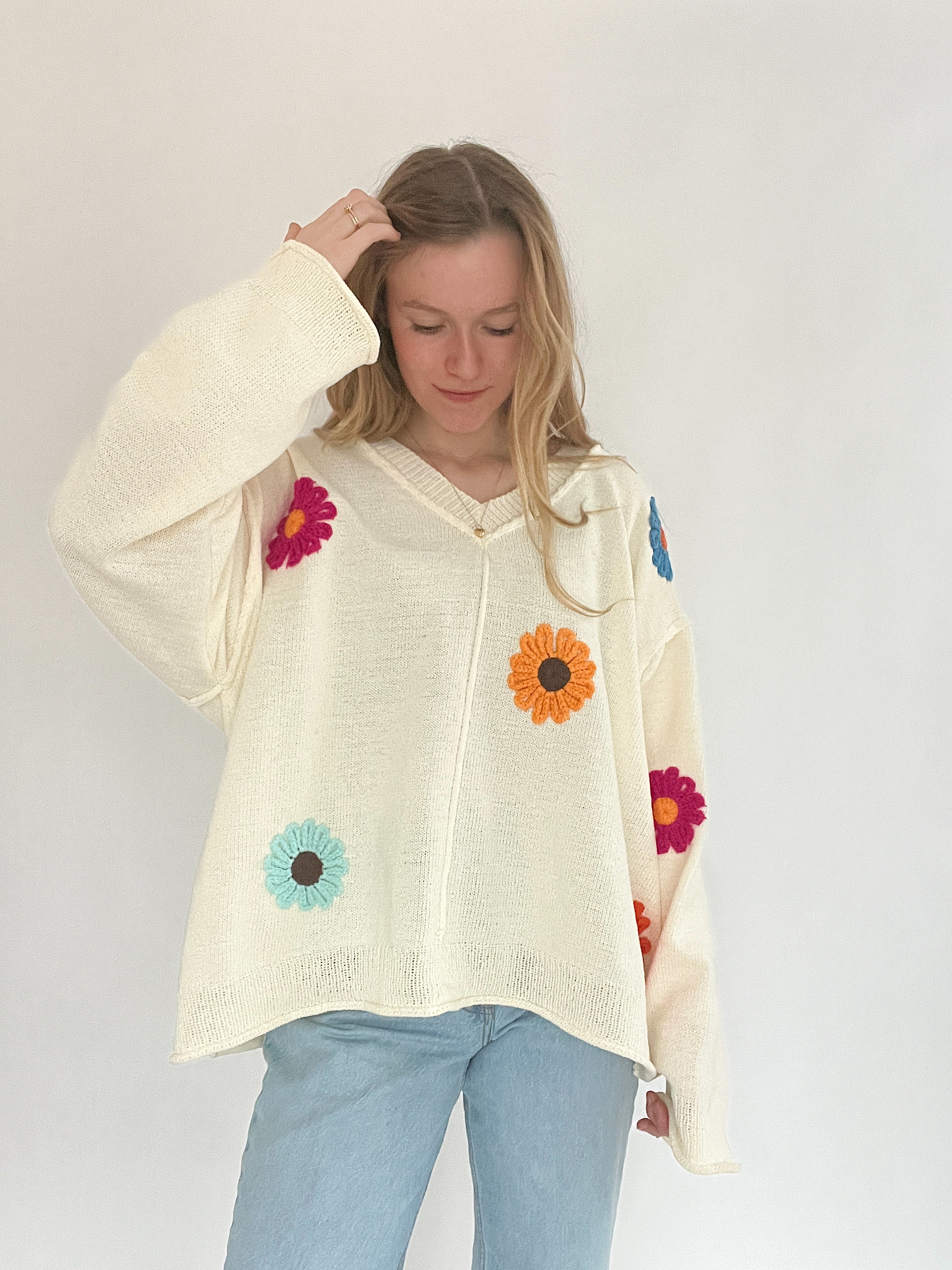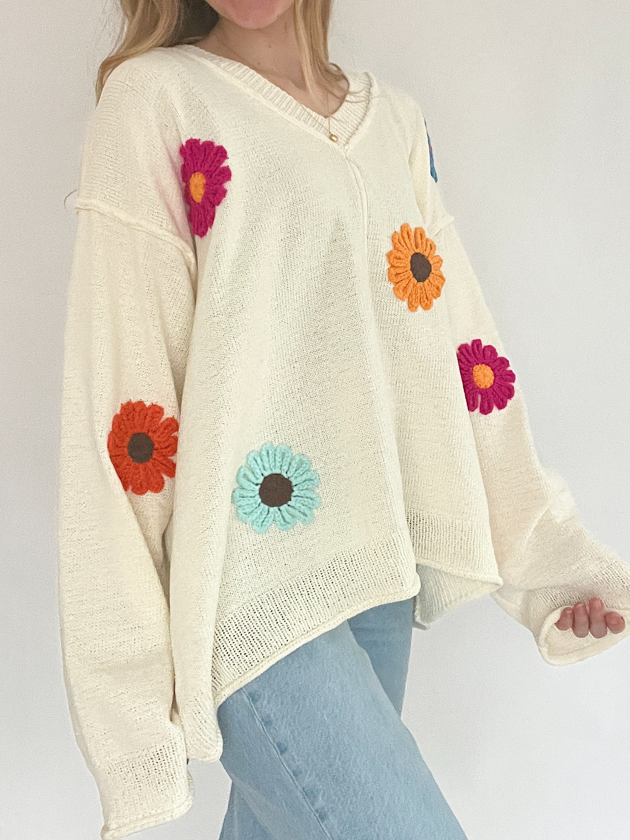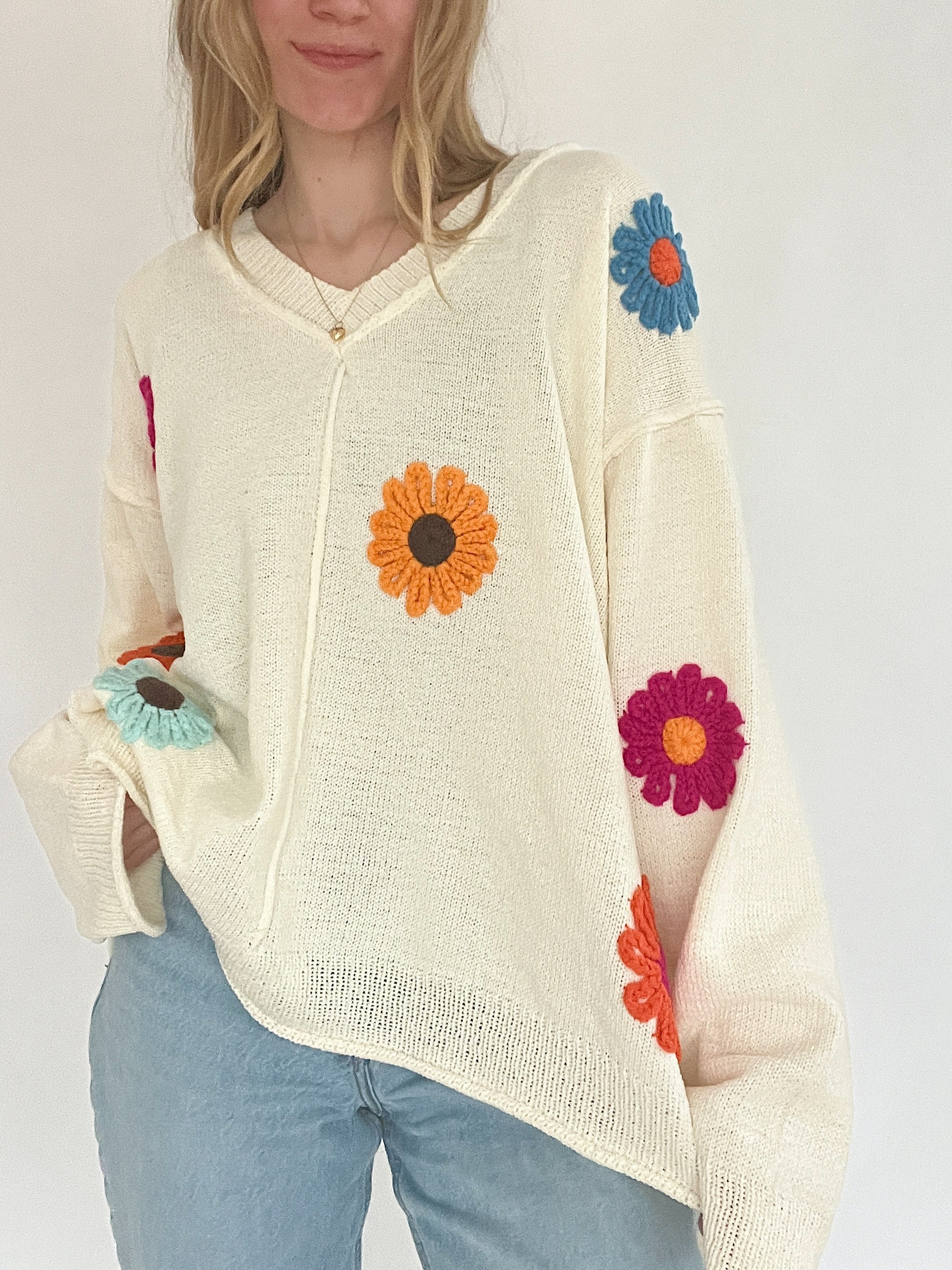 This cream chenille pullover sweater has cute colorful flower embroidered patches throughout with exposed seams. It's so soft and has dropped shoulders that give it a slouchy, oversized fit.