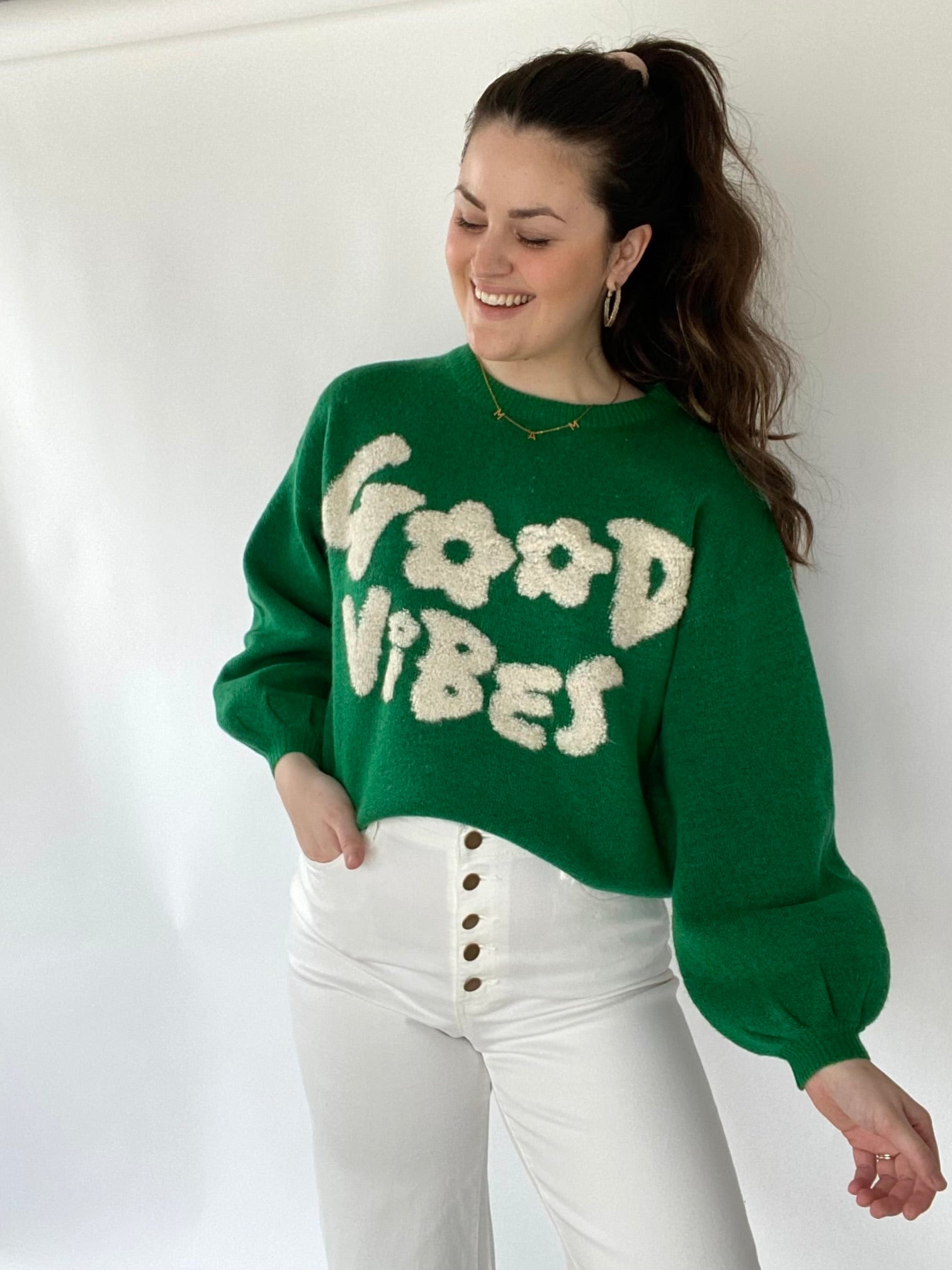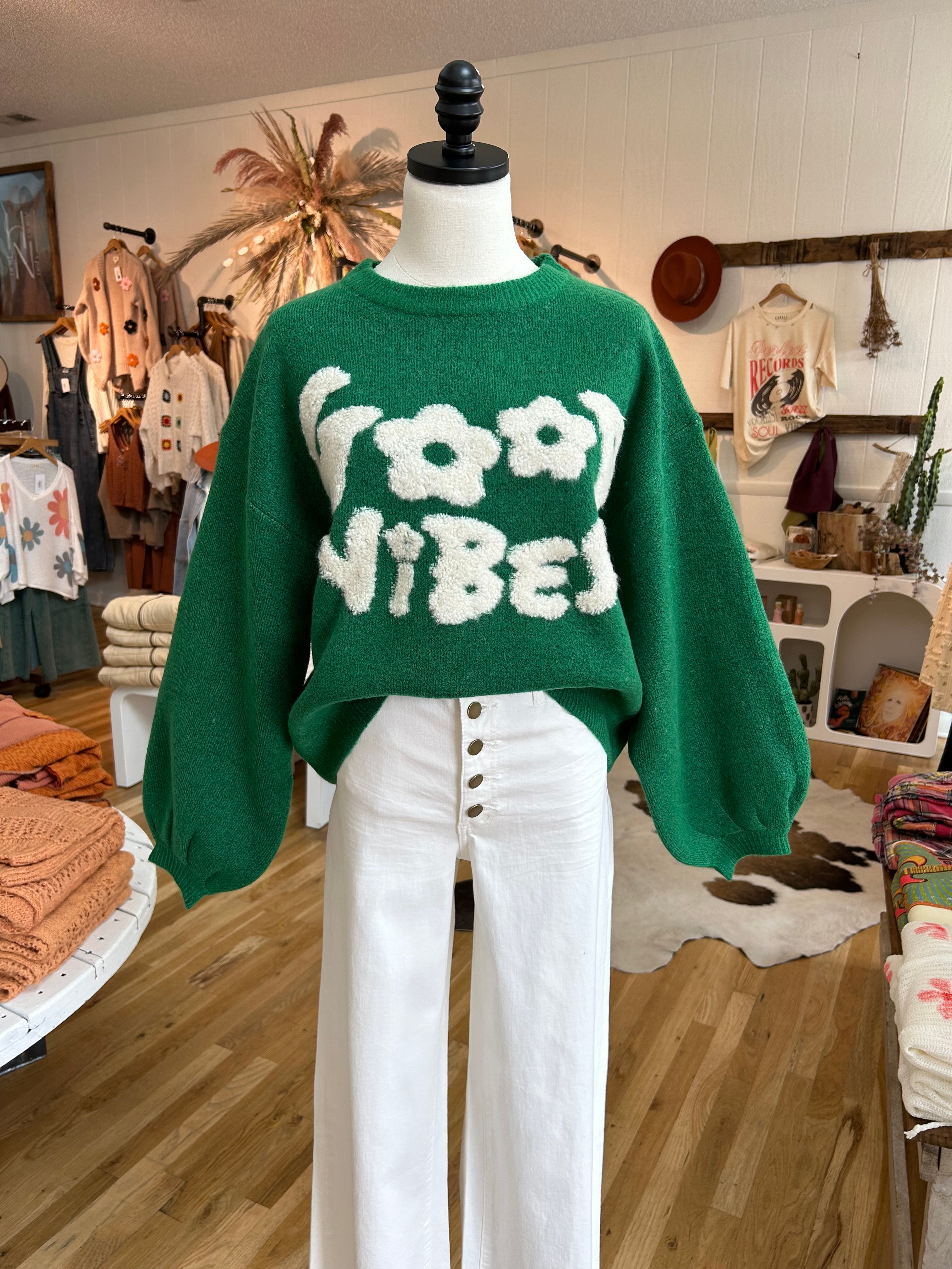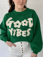This hunter green sweater has cute retro inspired ivory fuzzy lettering. It has a cozy fit and is so cute with your favorite denim!