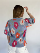 This light blue and floral knit top has short puff sleeves, a v-neckline and ribbed edges. So cute paired with any of our wide leg sweatpants, white pants or denim!