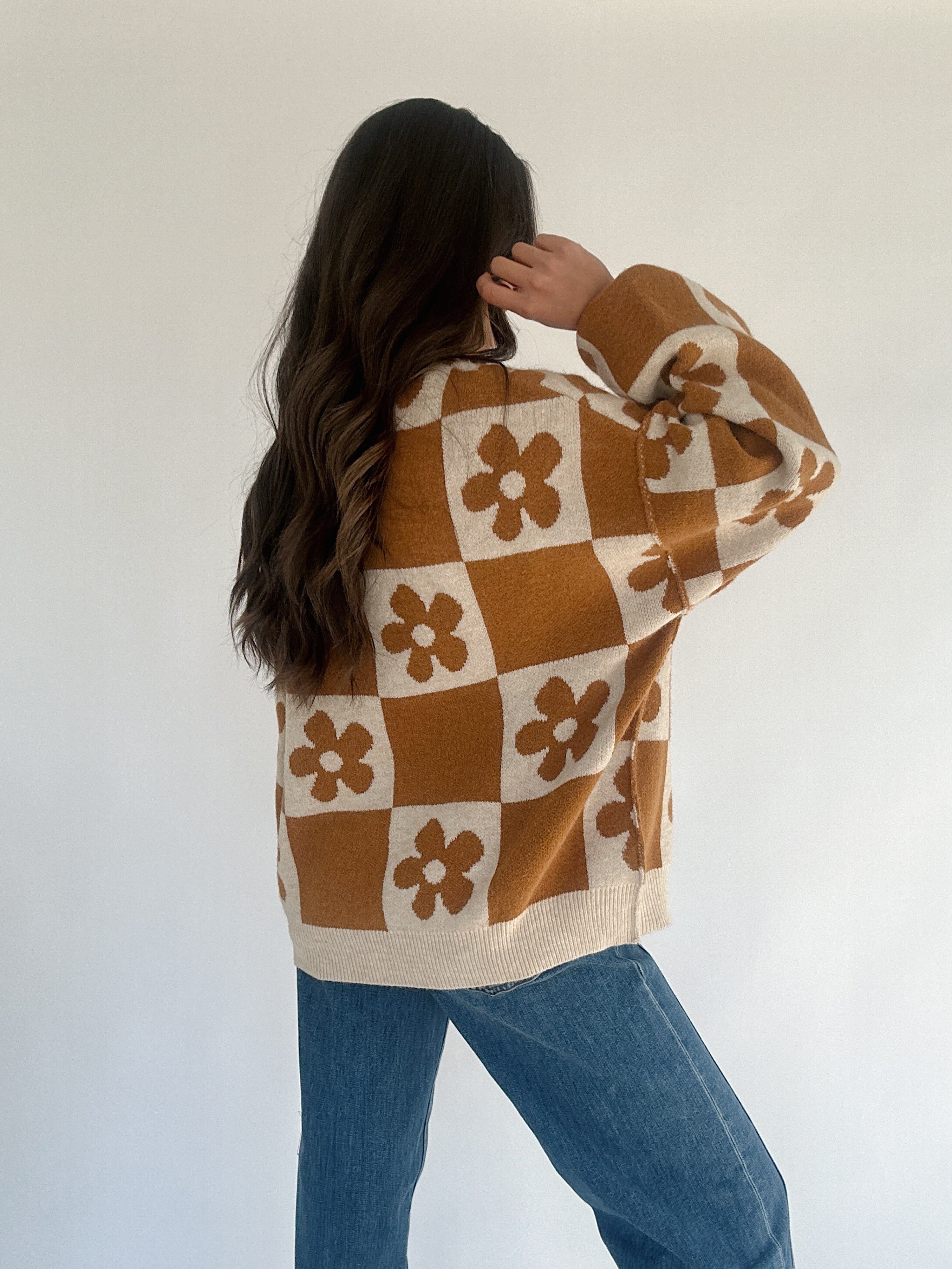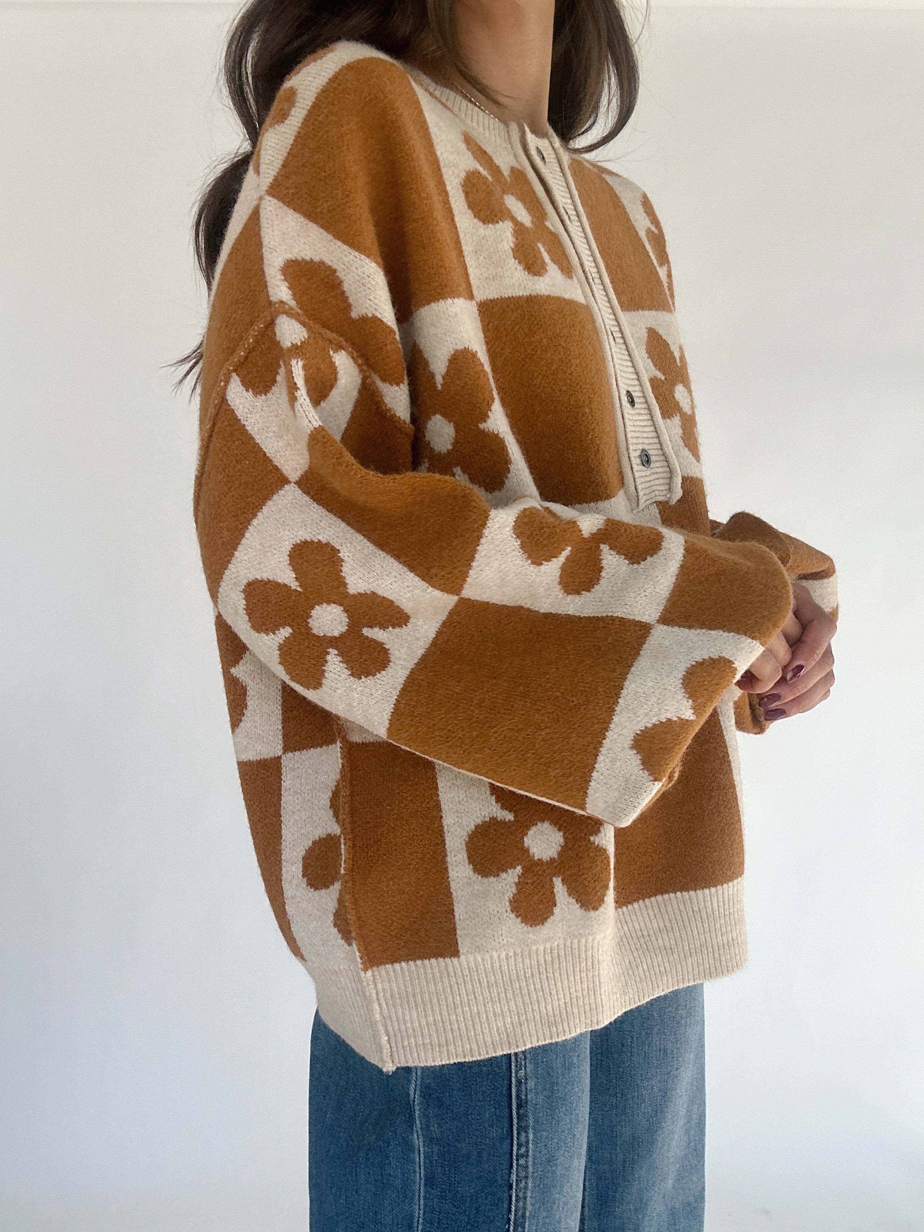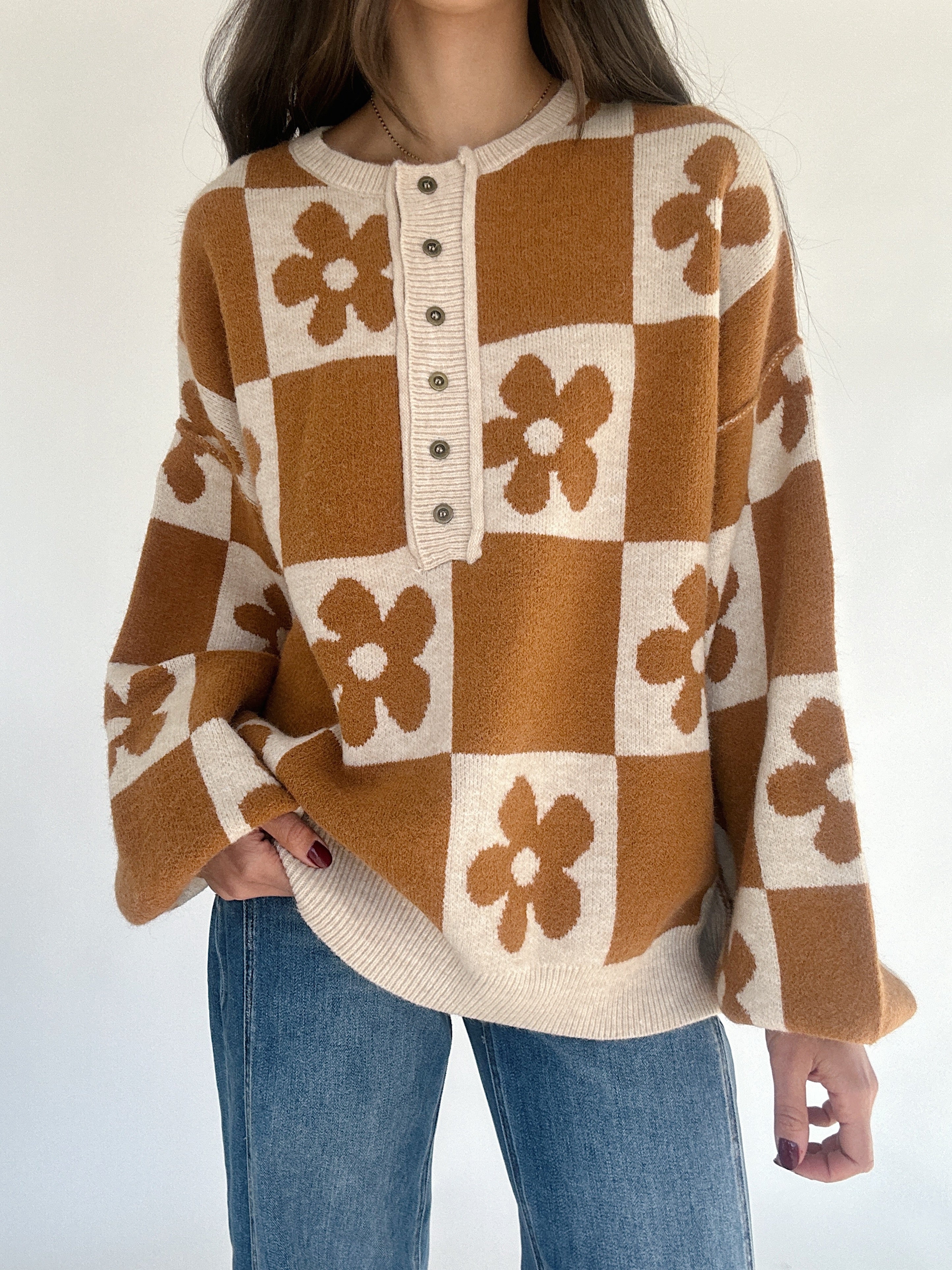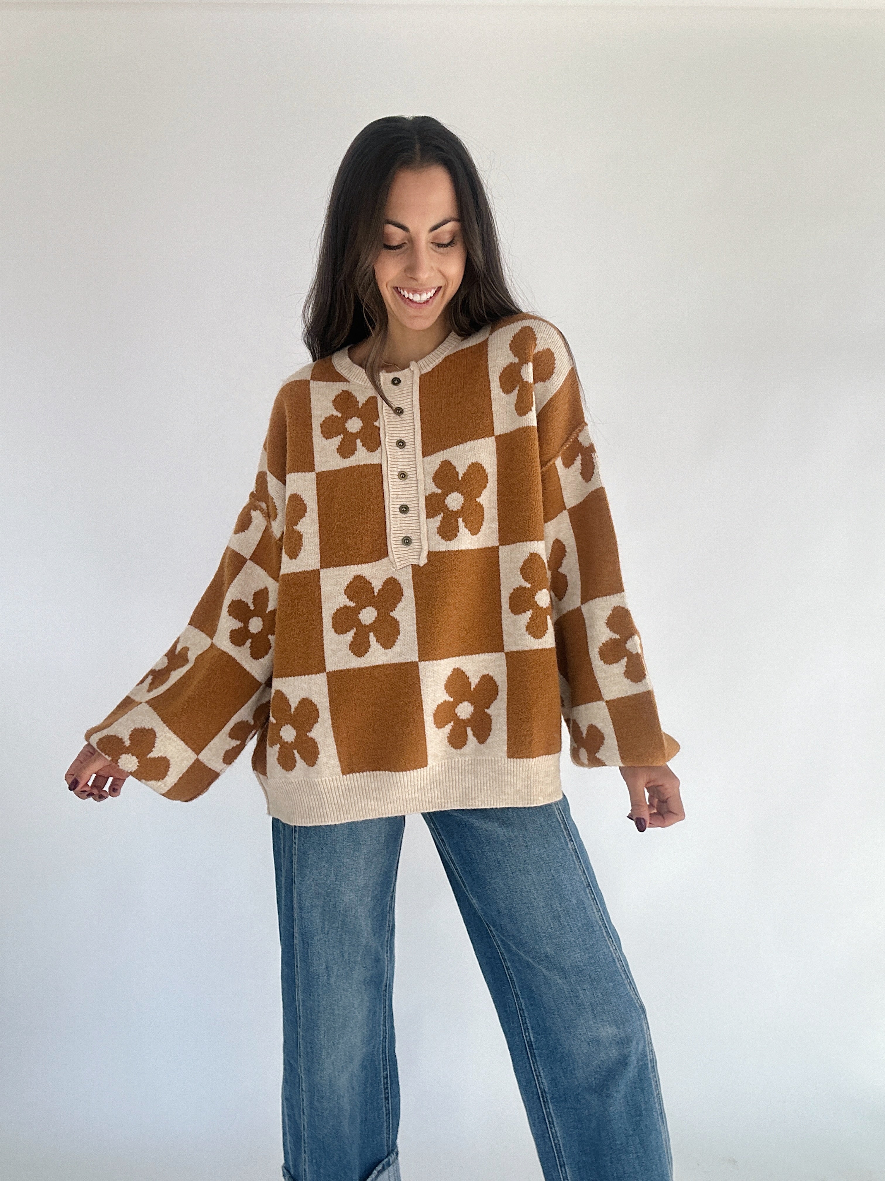 This brown and cream checkered sweater with retro flowers is a total vibe! It features a henley button top, dropped bubble sleeves and has the comfiest, relaxed fit.