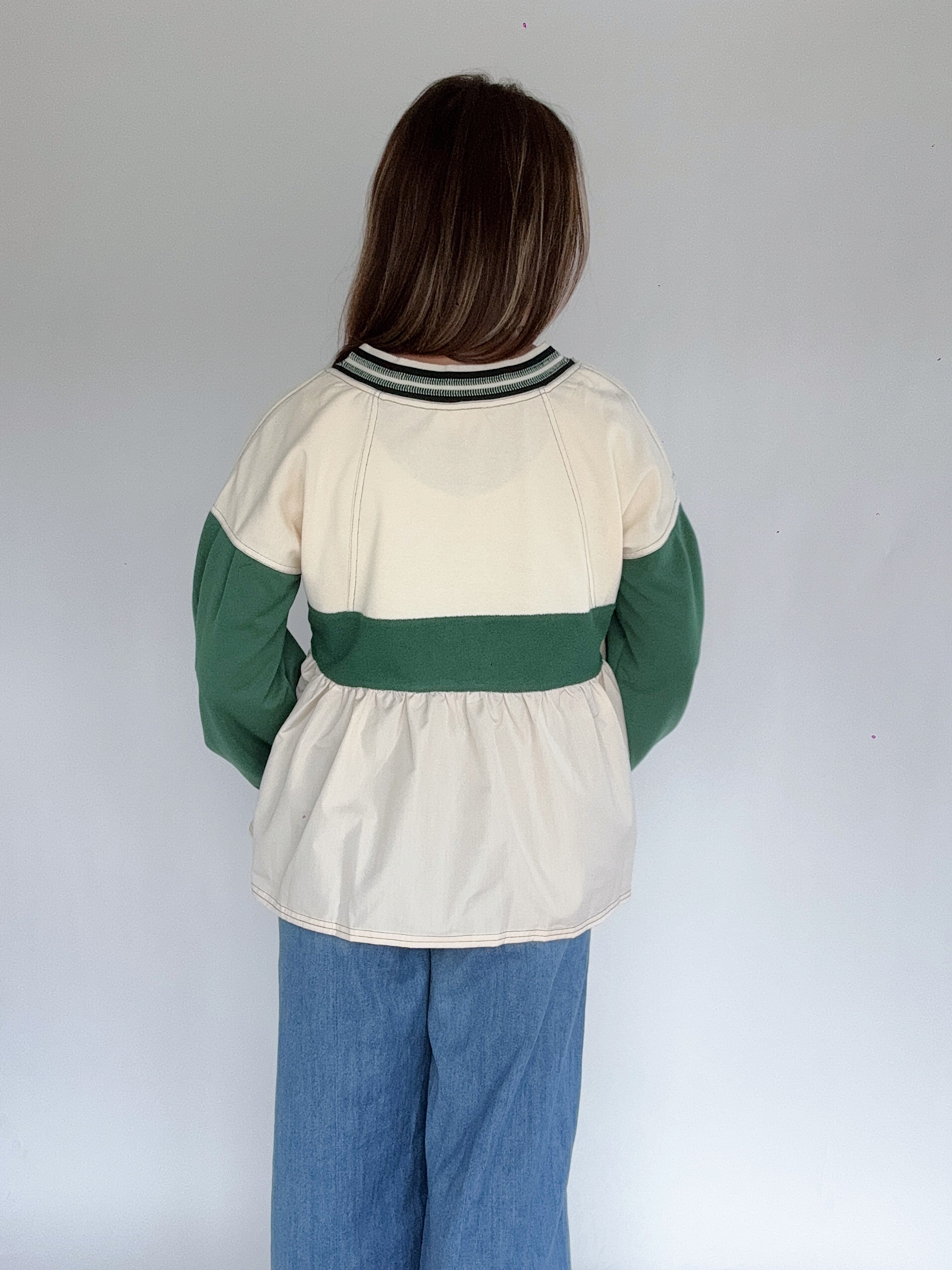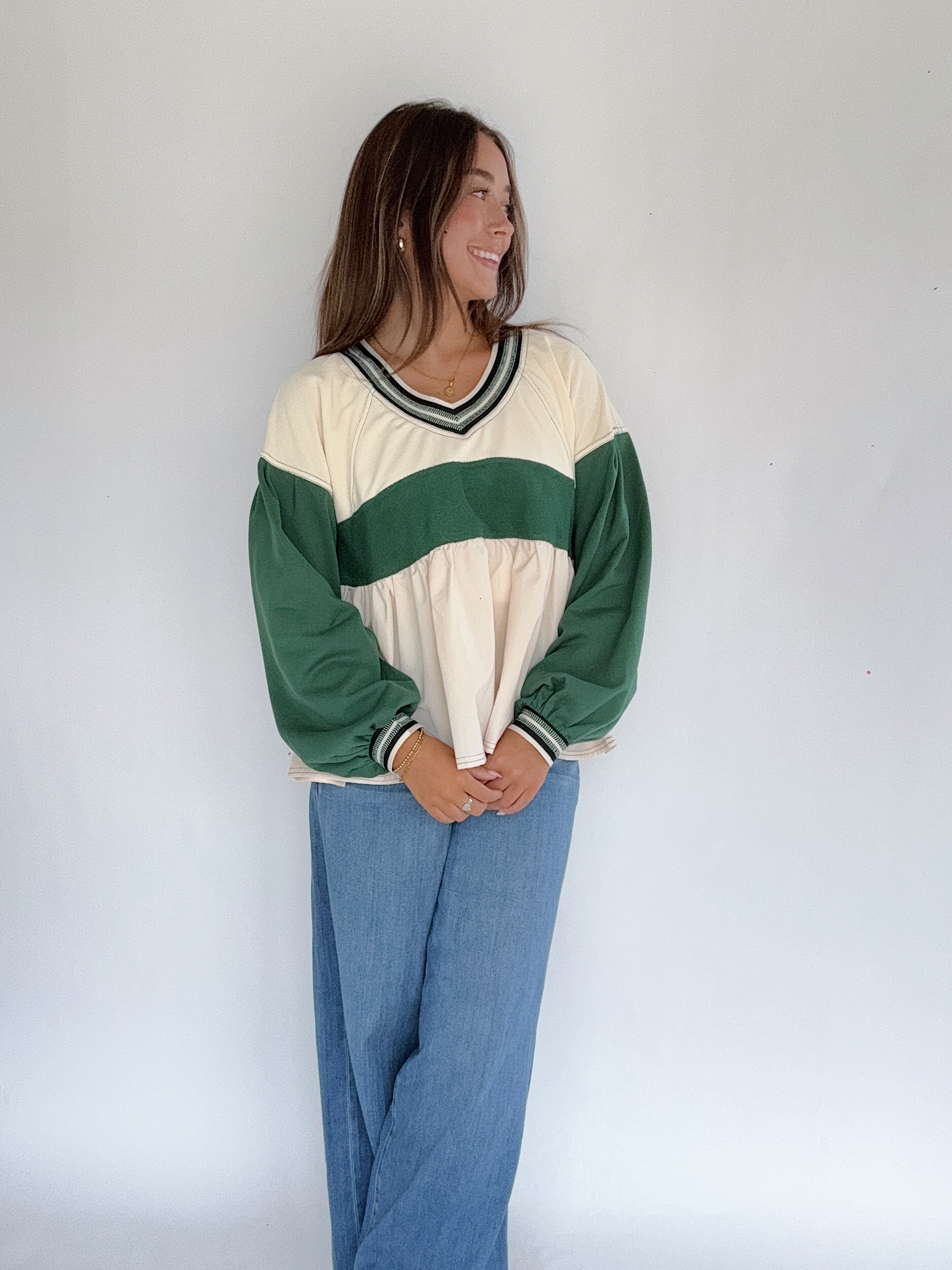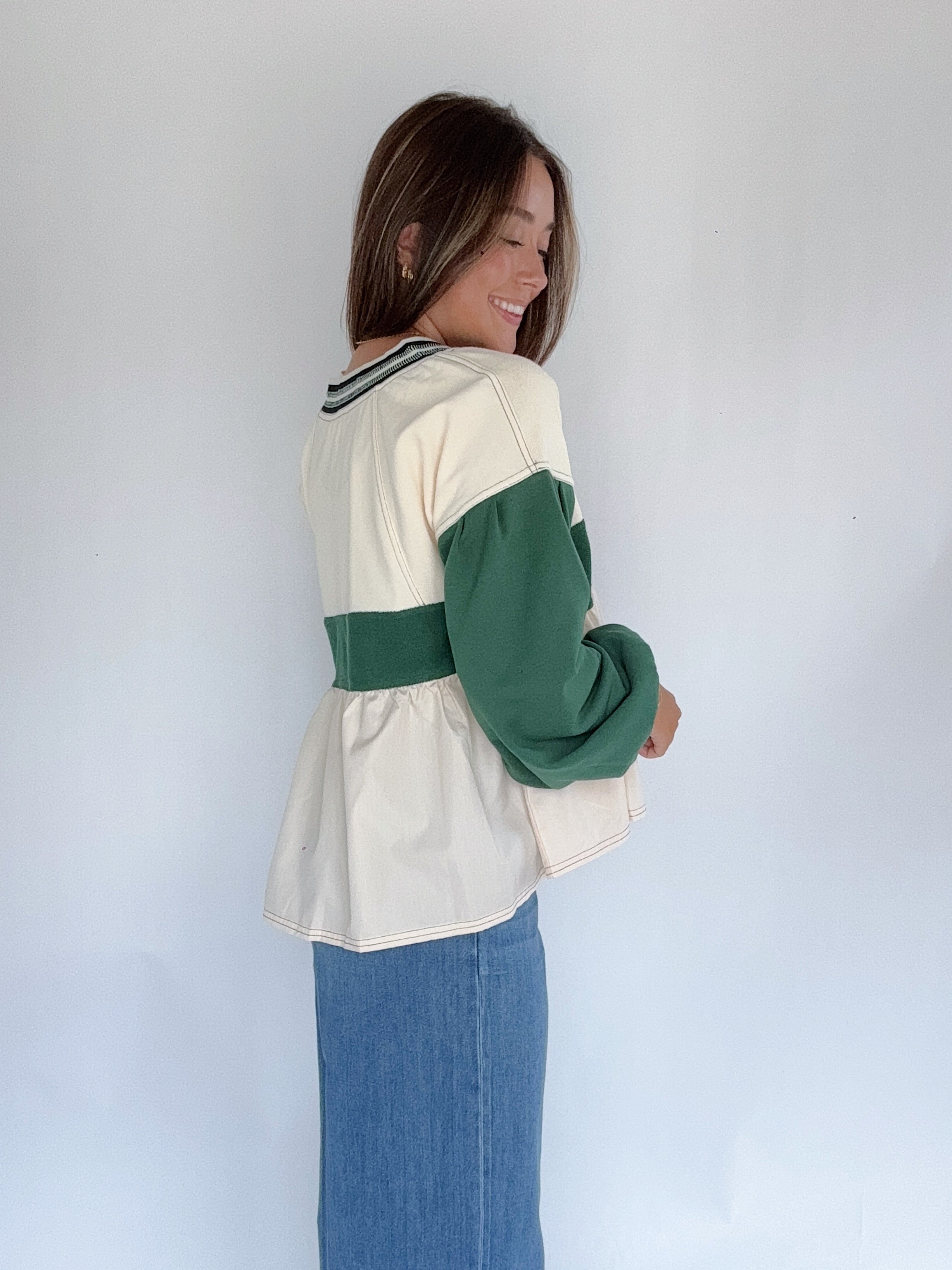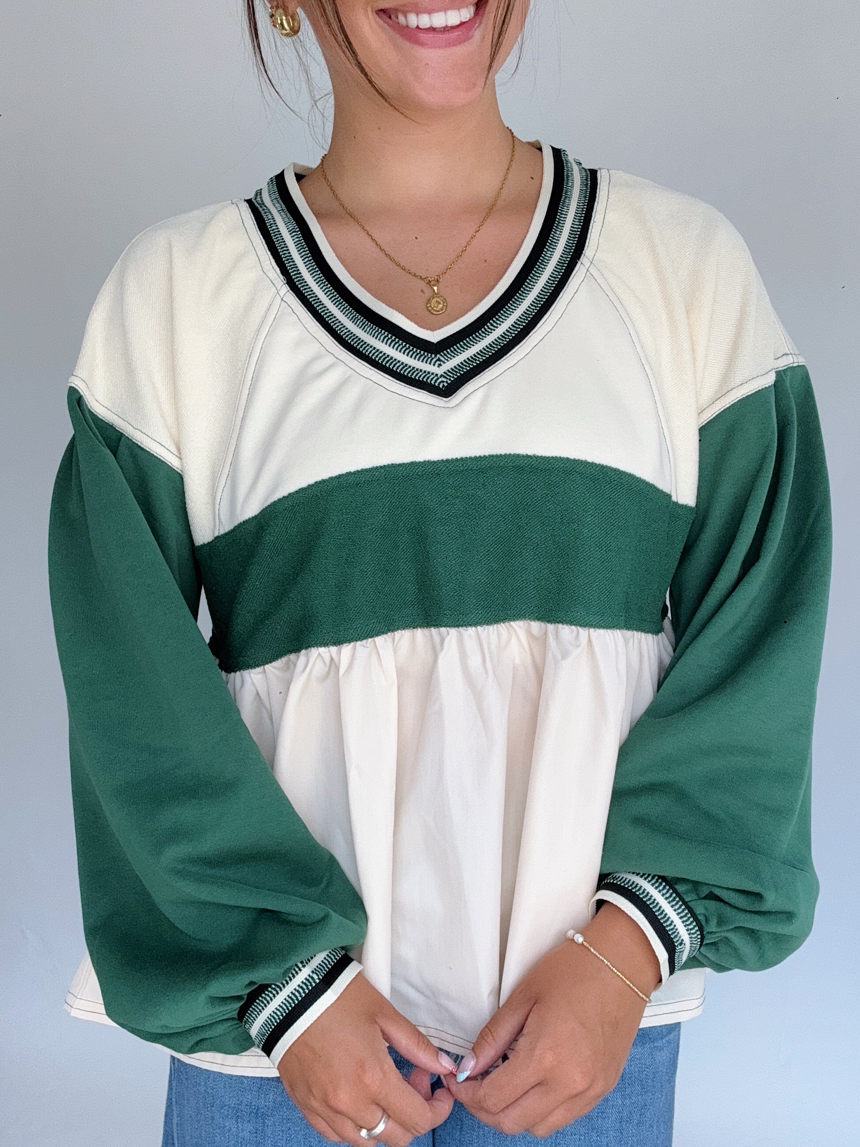 The perfect mix of comfortable, cute + casual - the Way Out Pullover Top mixes a hunter green and cream with color blocking details that just pop. With terry knit sweatshirt style top and blouse style ruffle bottom it has just the right amount of feminine! Pair with denim shorts or your favorite jeans for a casual day out and about or for game day, rooting on your favorite team!