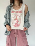 "Nashville Music City, USA" vintage inspired pink graphic on off white relaxed fit racerback style tank.