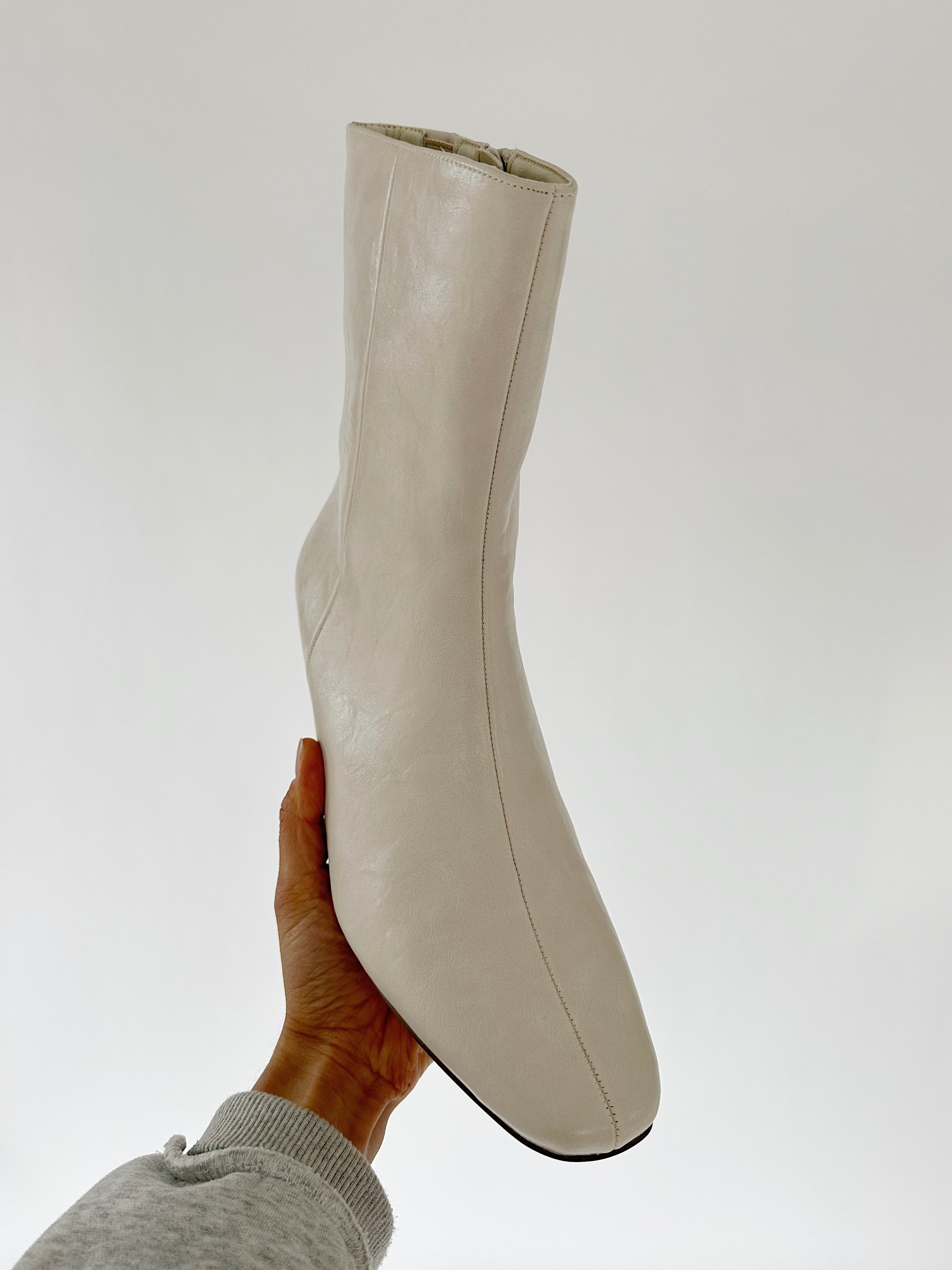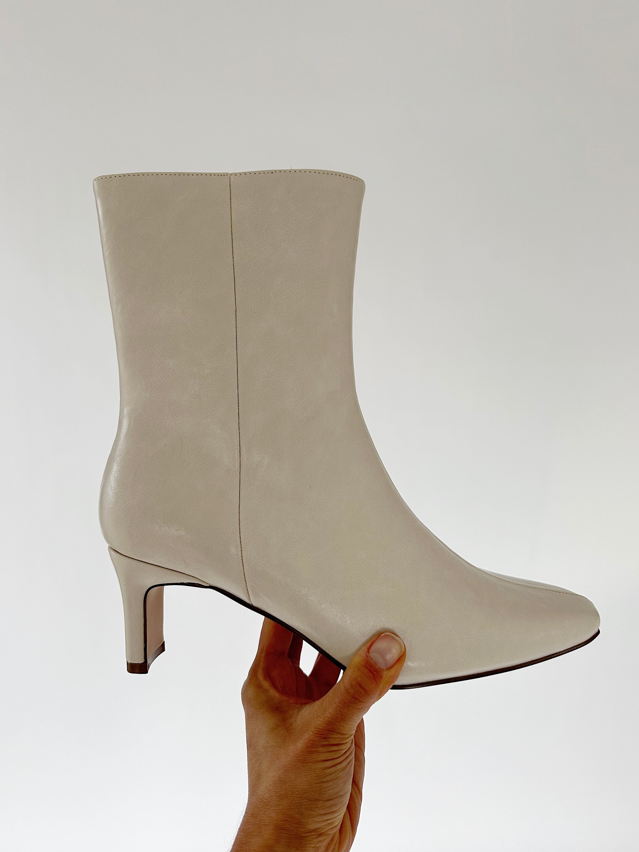 Vegan faux leather ankle boot with a pointed toe, slim mid-heel, and minimalist silhouette.
