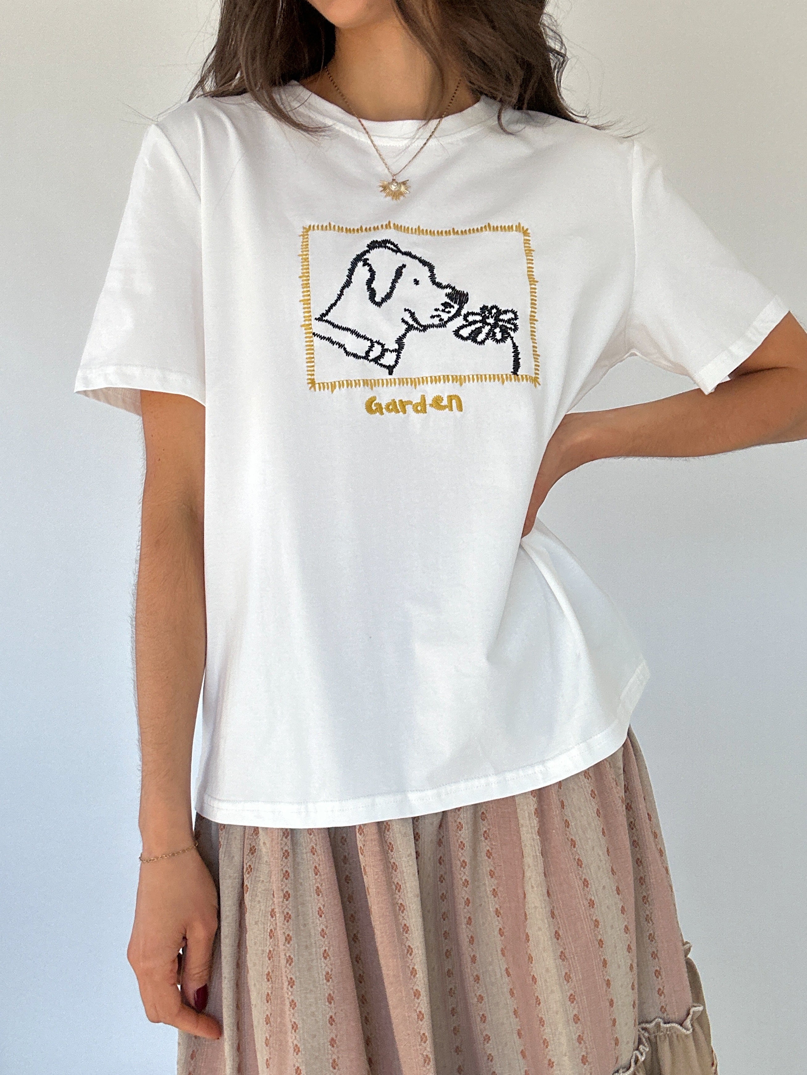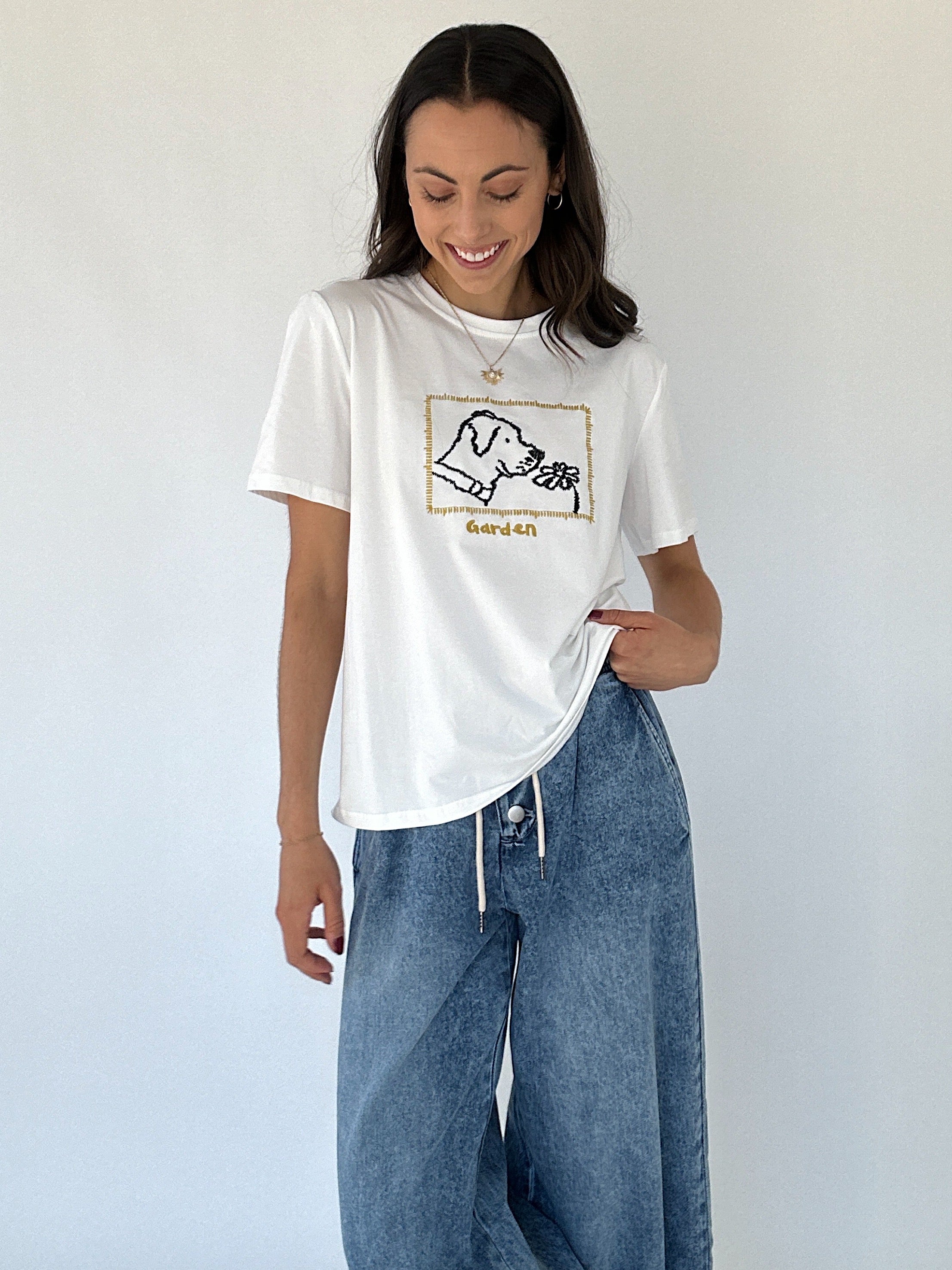 Cute, comfy, and full of charm — the Garden Embroidered Dog Tee is your new go-to for casual days. Made in classic white cotton, it features playful embroidery with a sweet dog and flower design that adds just the right touch of sweetness. The relaxed, slightly oversized fit makes it perfect for easy layering or everyday wear.