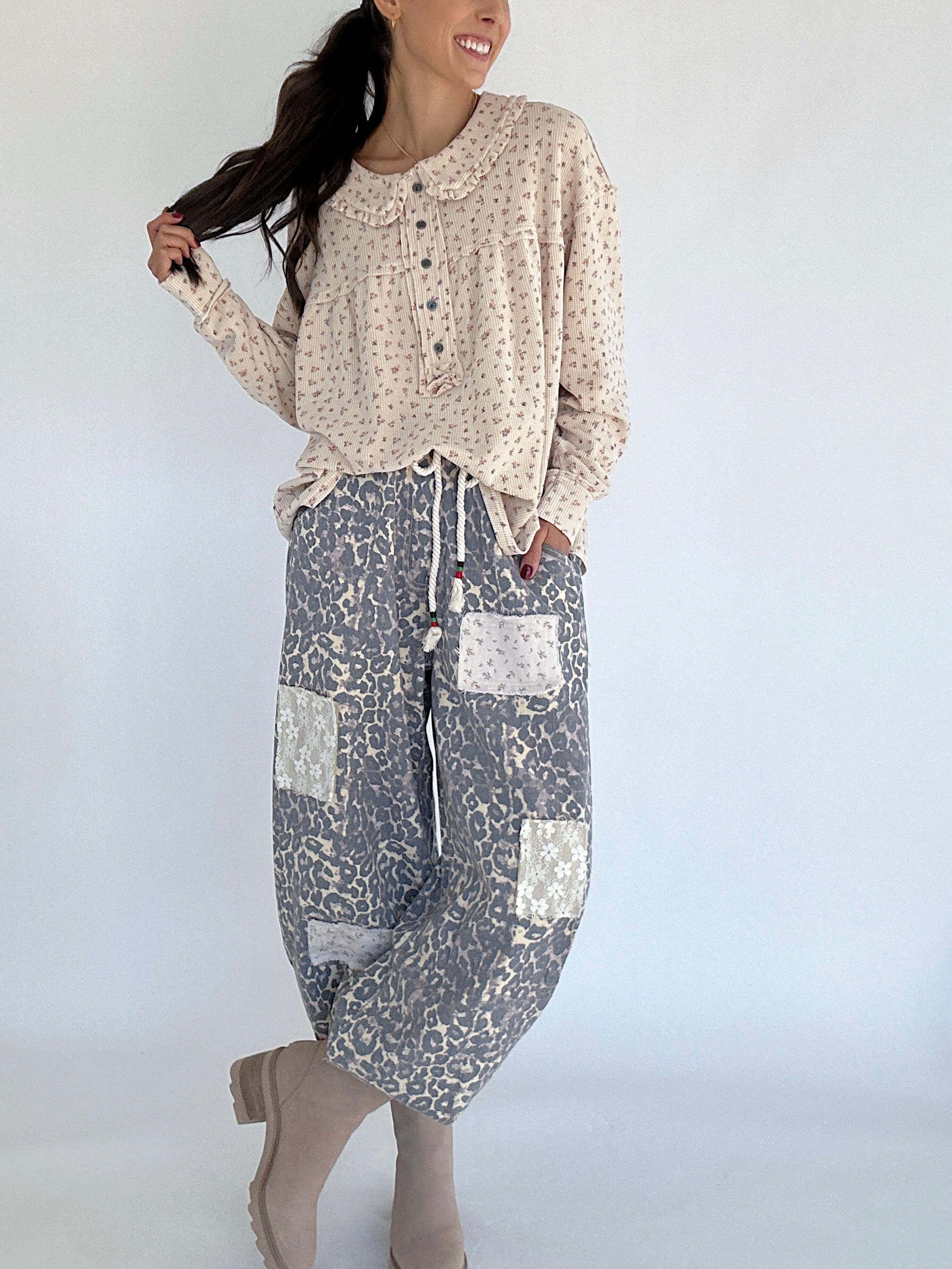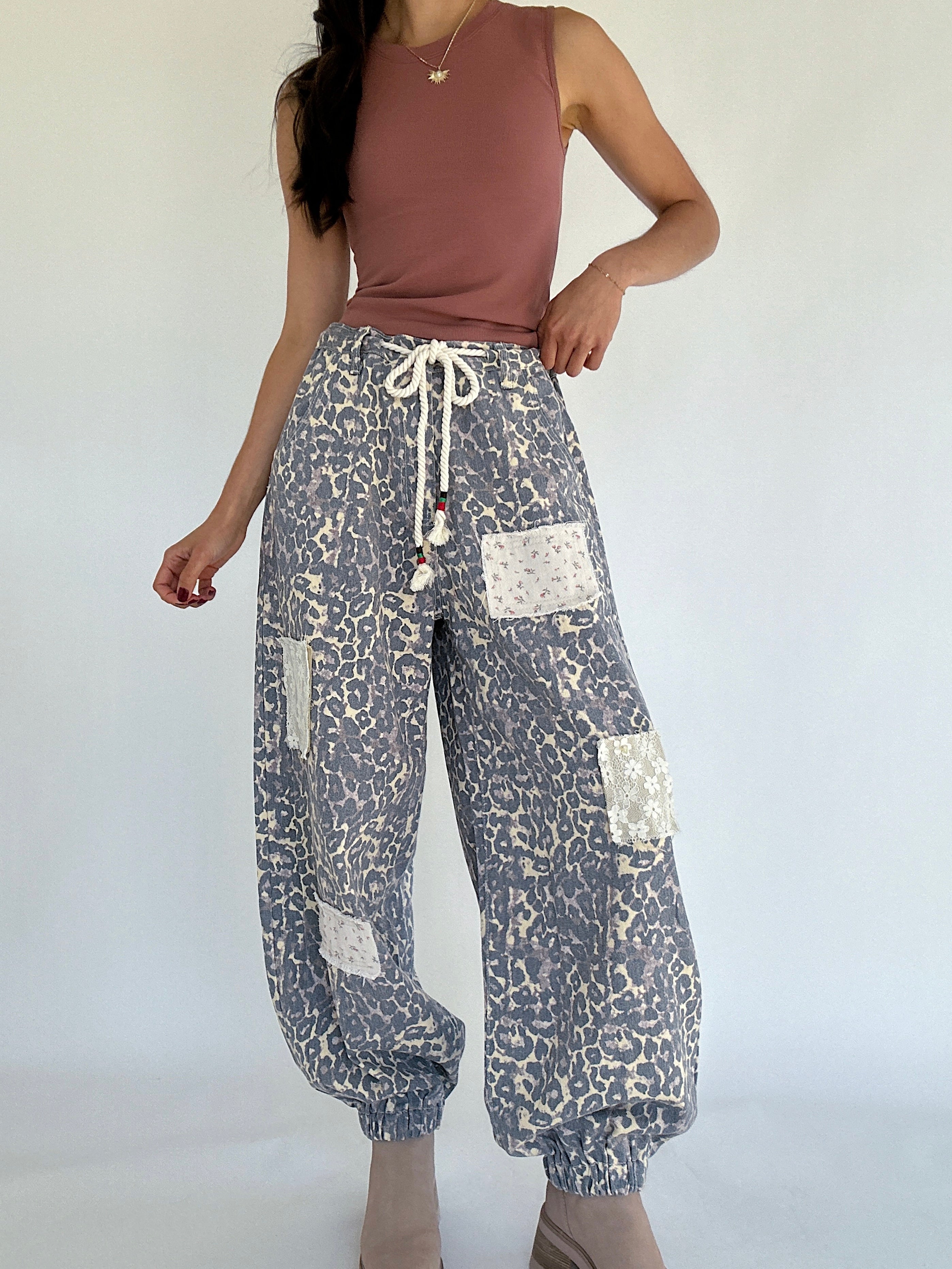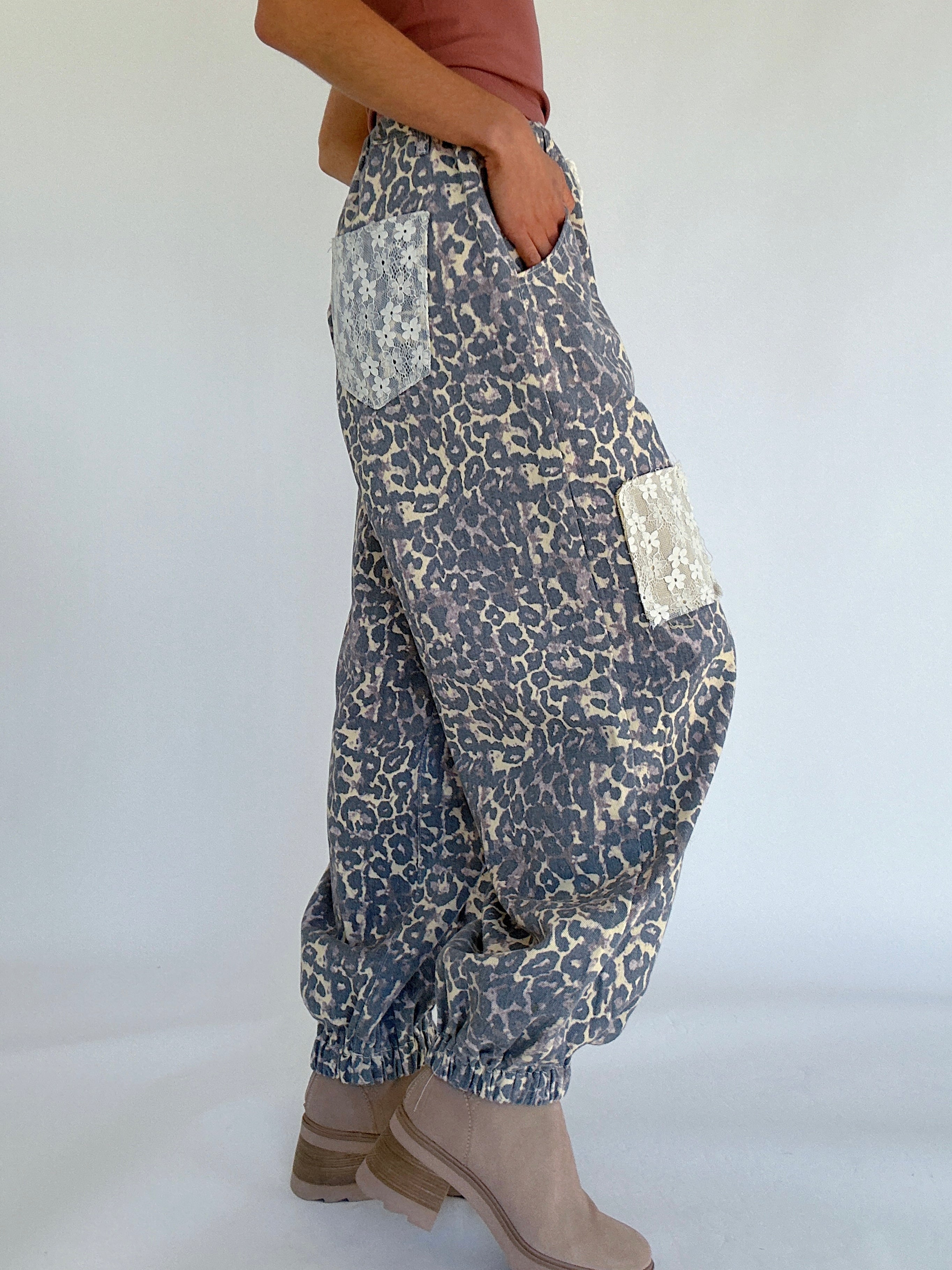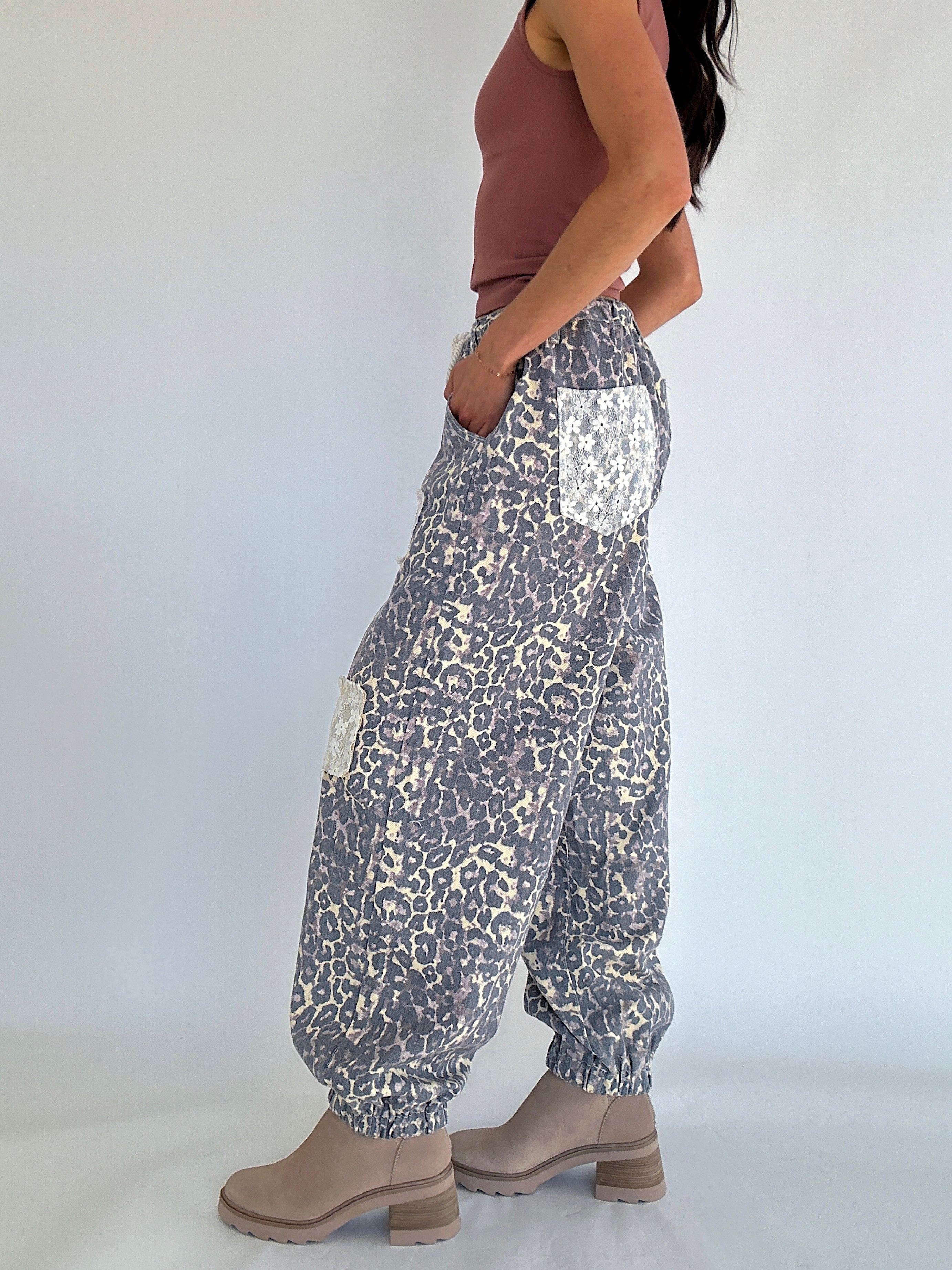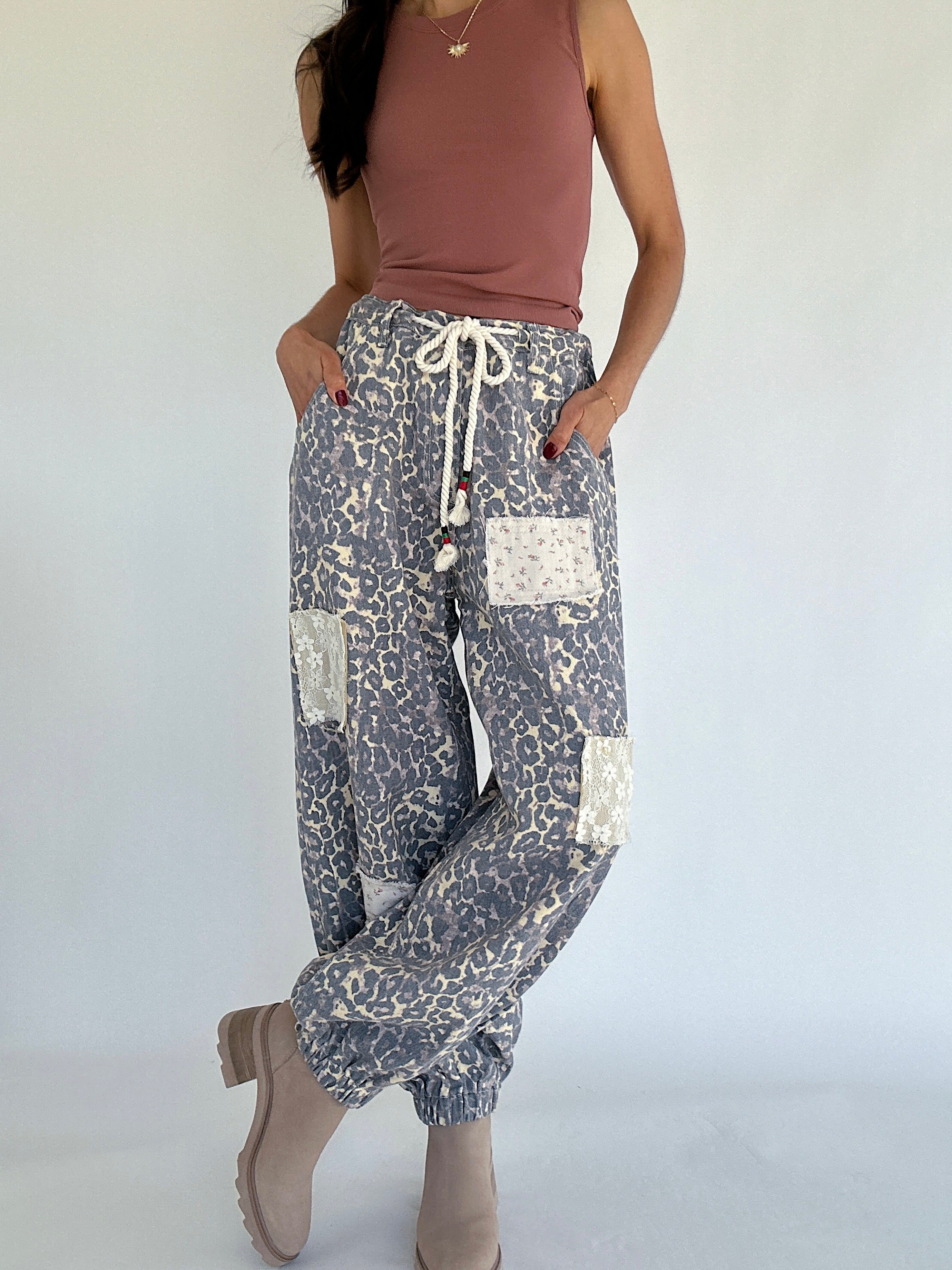 The Good Living Leopard Jogger Pants are where comfort meets edgy. Made in a leopard-print twill, these pants have a roomy, easy fit with a mix of lace and floral patchwork that gives them that one-of-a-kind, lived-in feel. The cinched jogger hem and drawstring waist keep things comfy, while the pockets and belt loops make them totally practical for day-to-day wear. Whether you’re running errands or styling them up for a casual outing, these pants bring a fun twist to your laid-back looks!