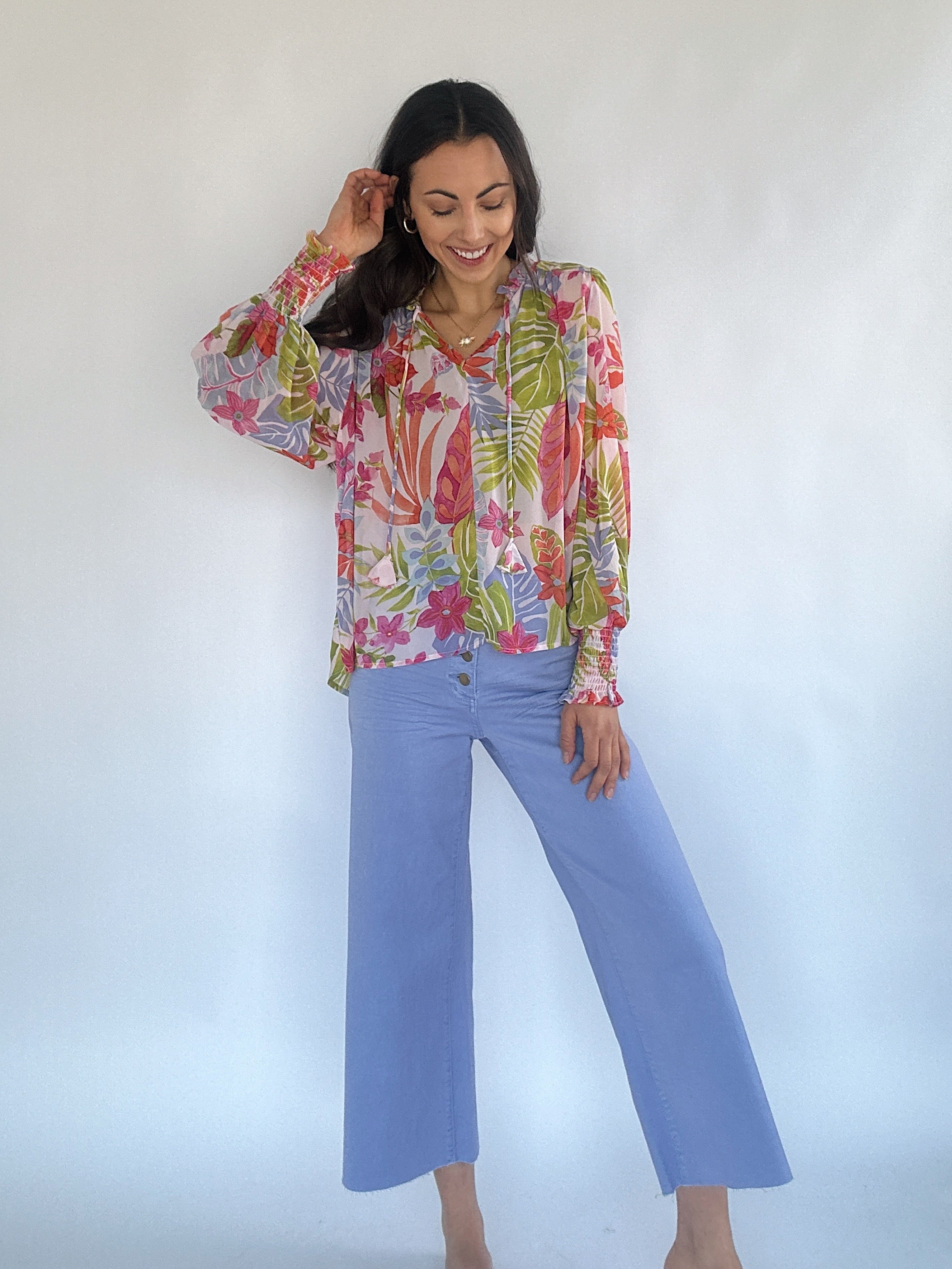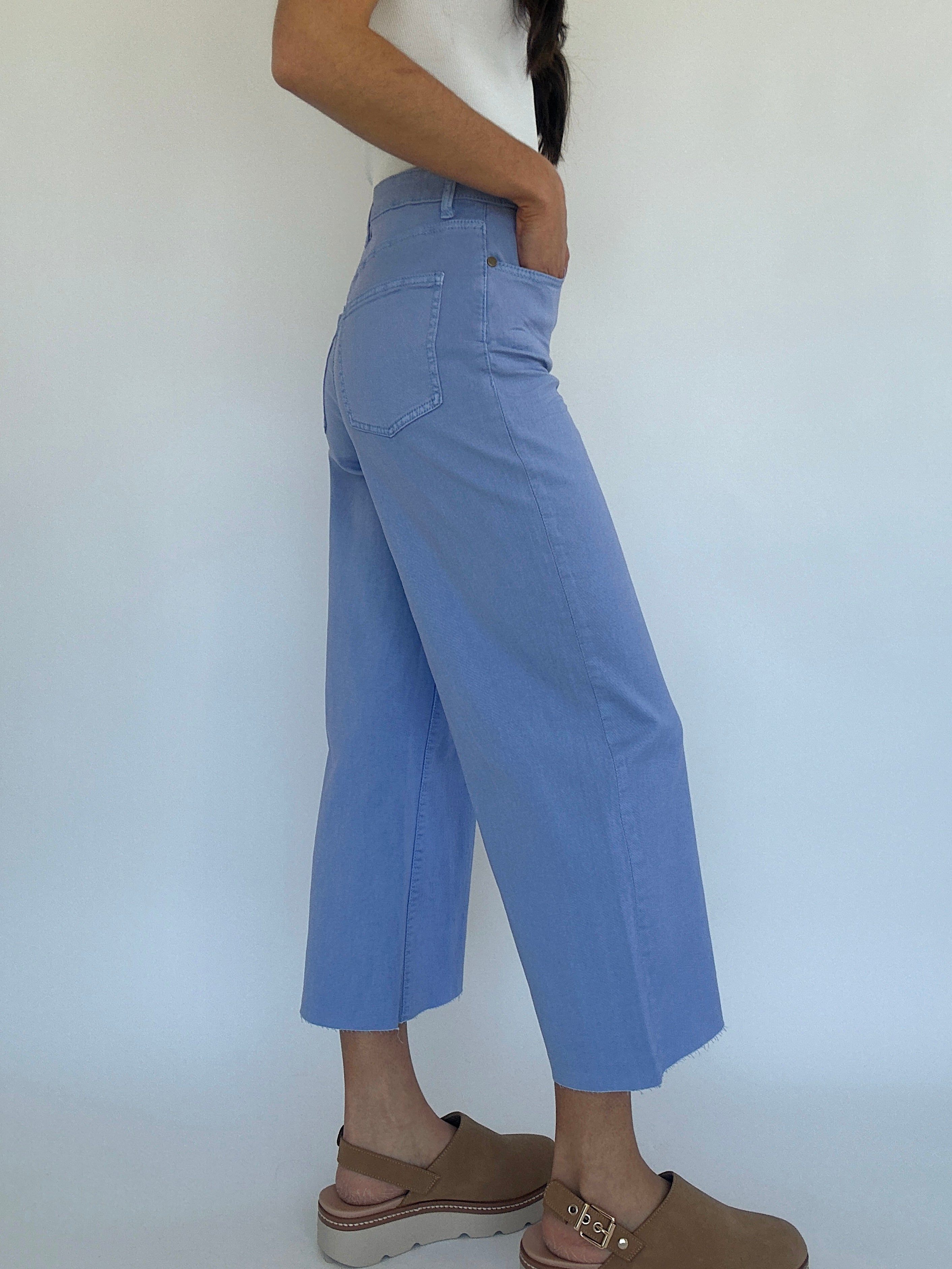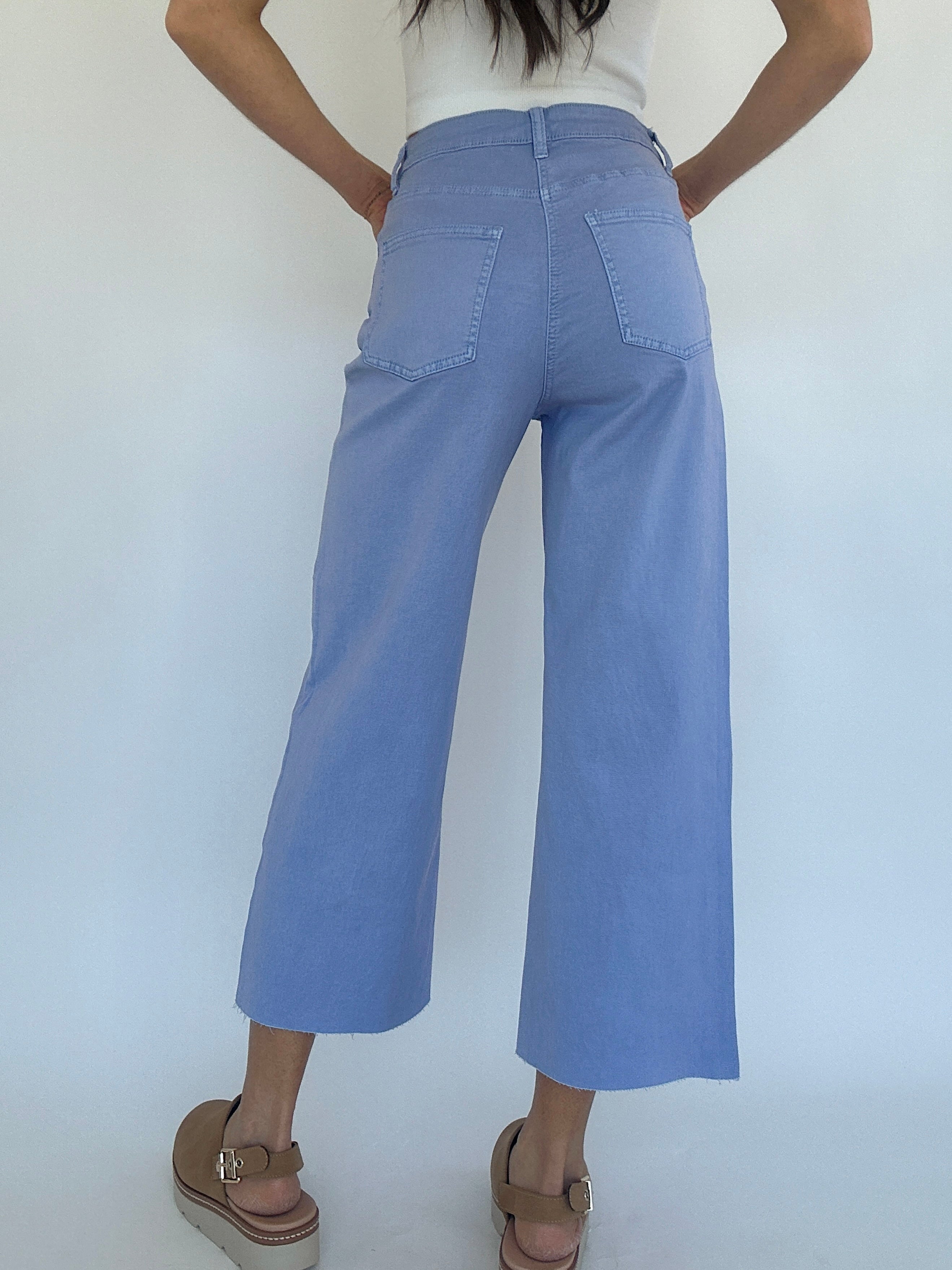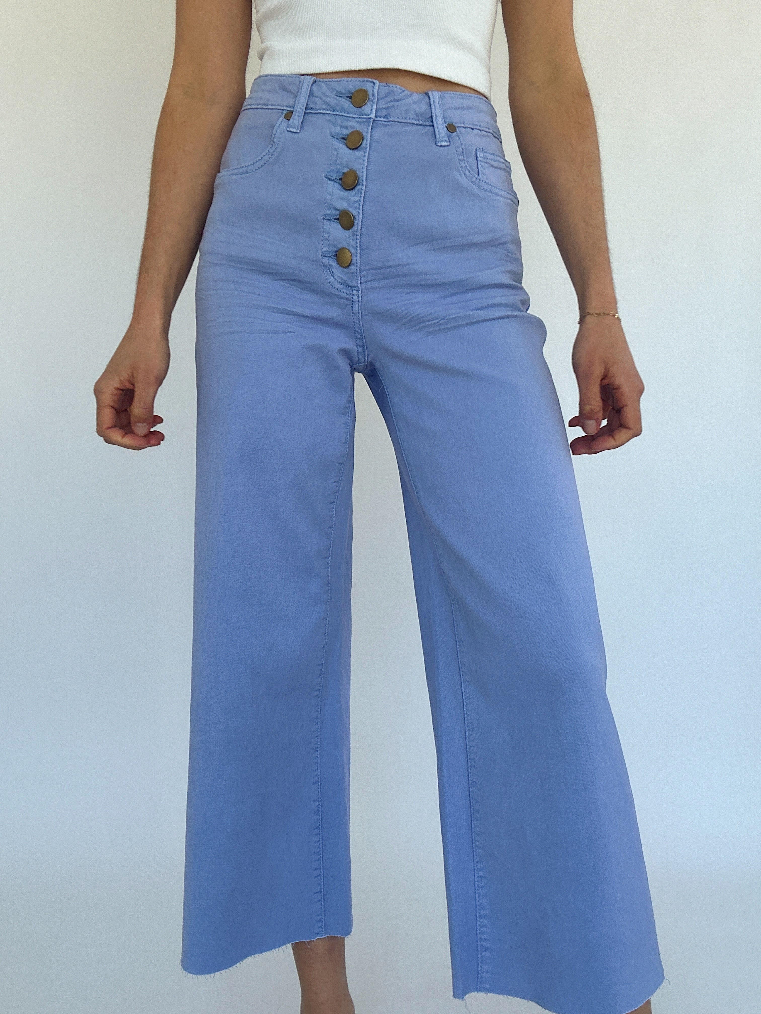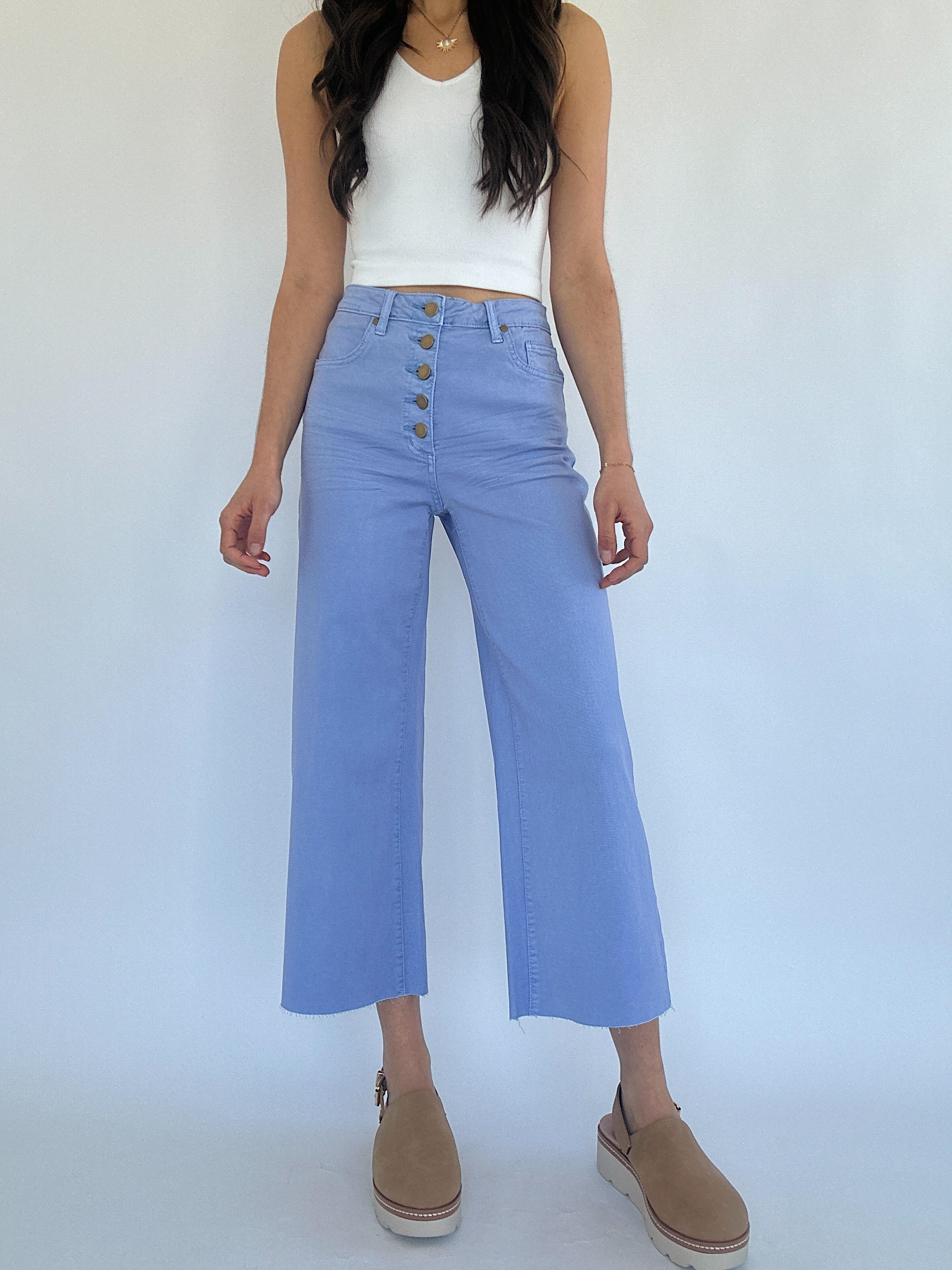 These periwinkle blue button front high waisted pants are super stretchy with a wide leg cropped fit. The raw hem makes it easy to cut off to your favorite length!