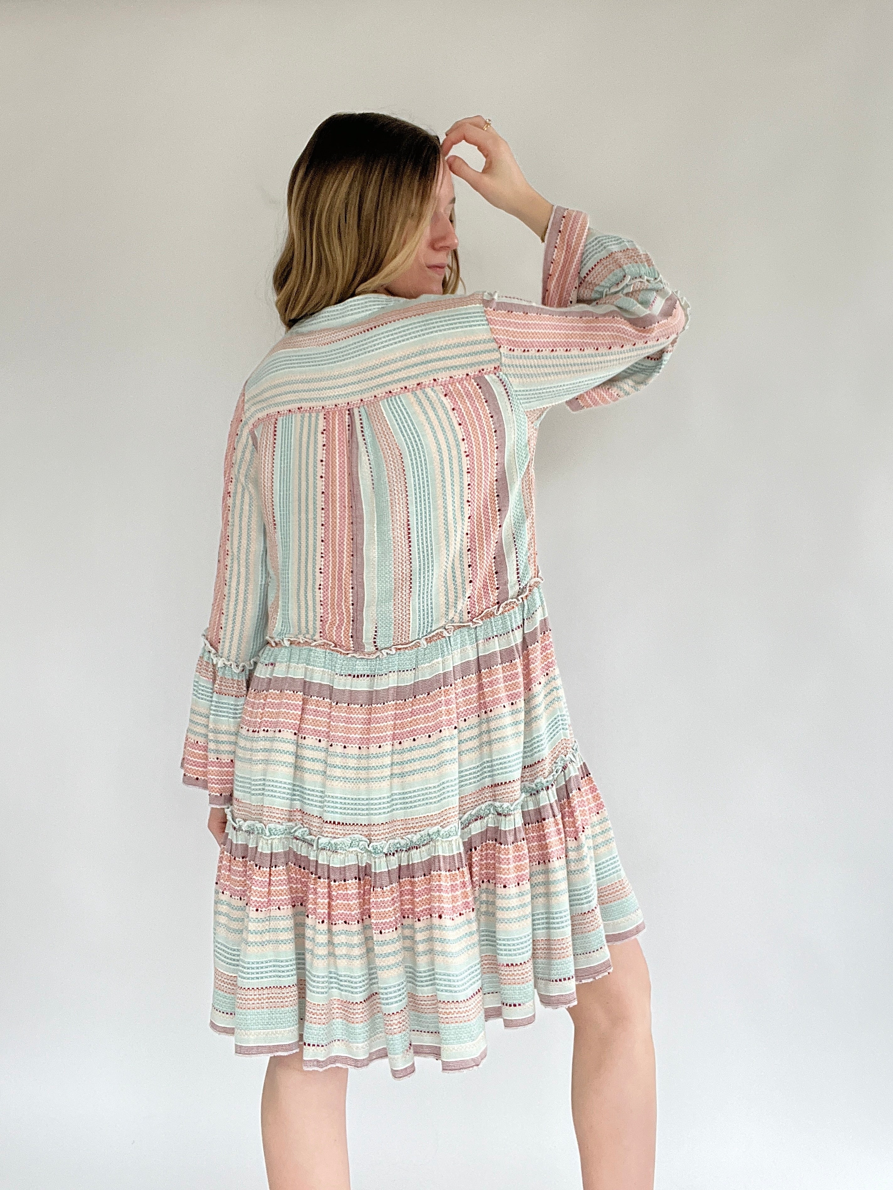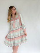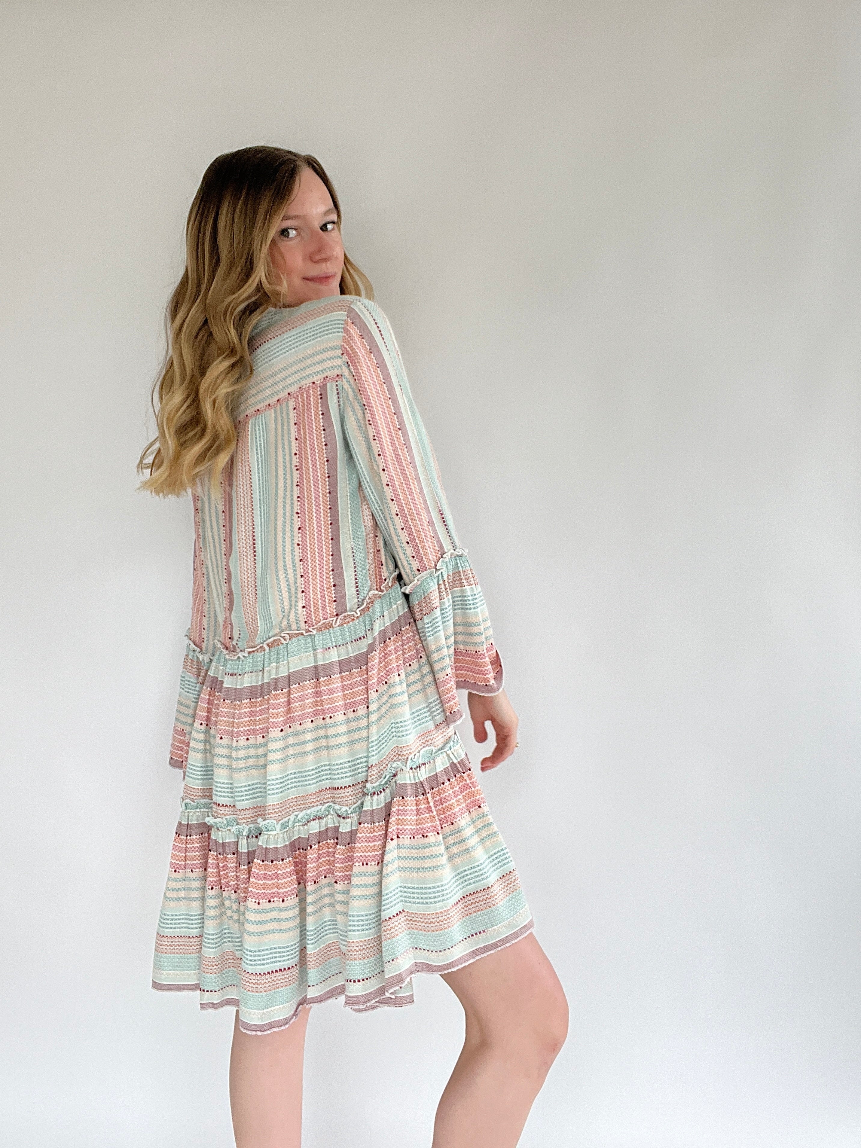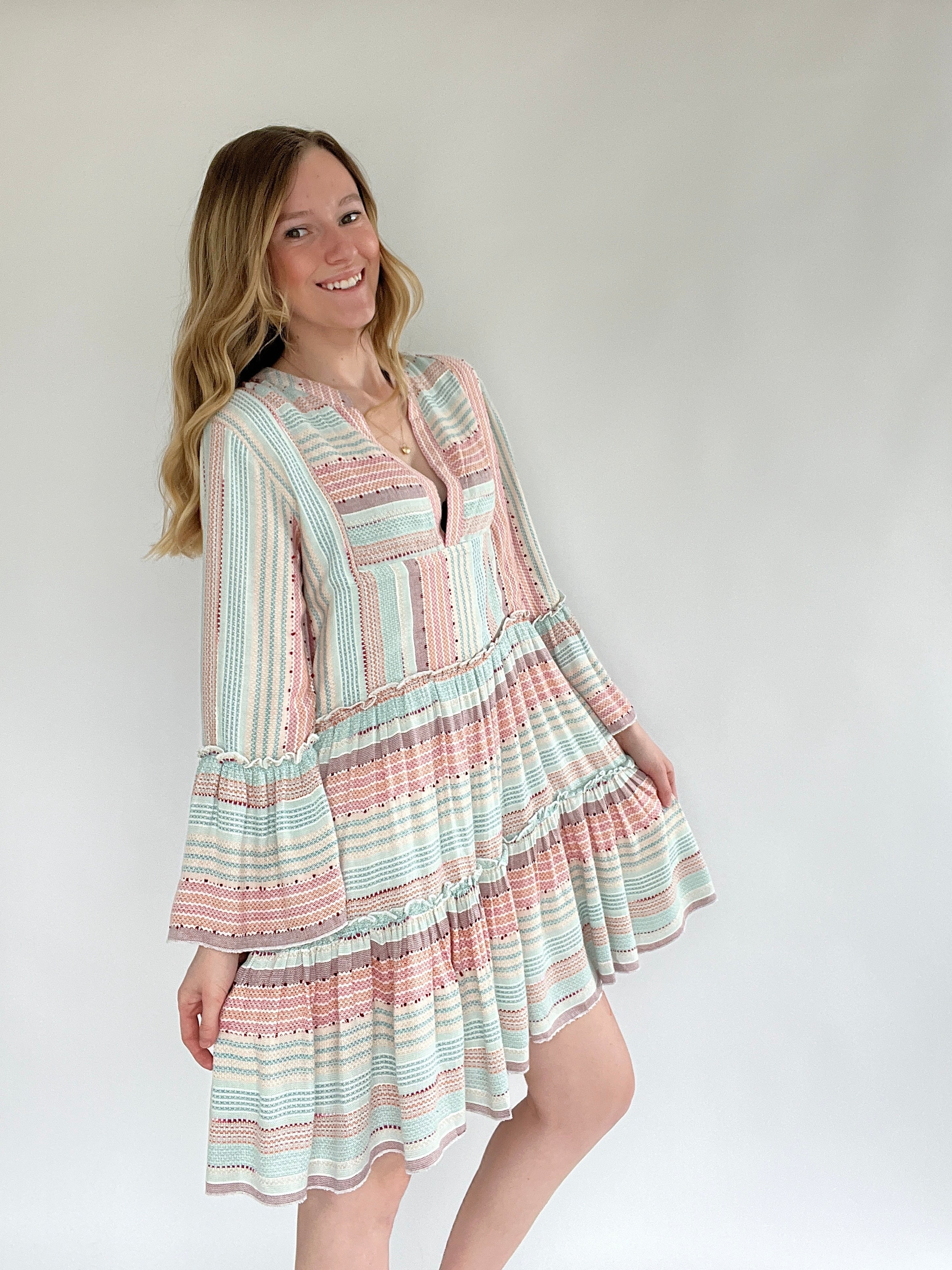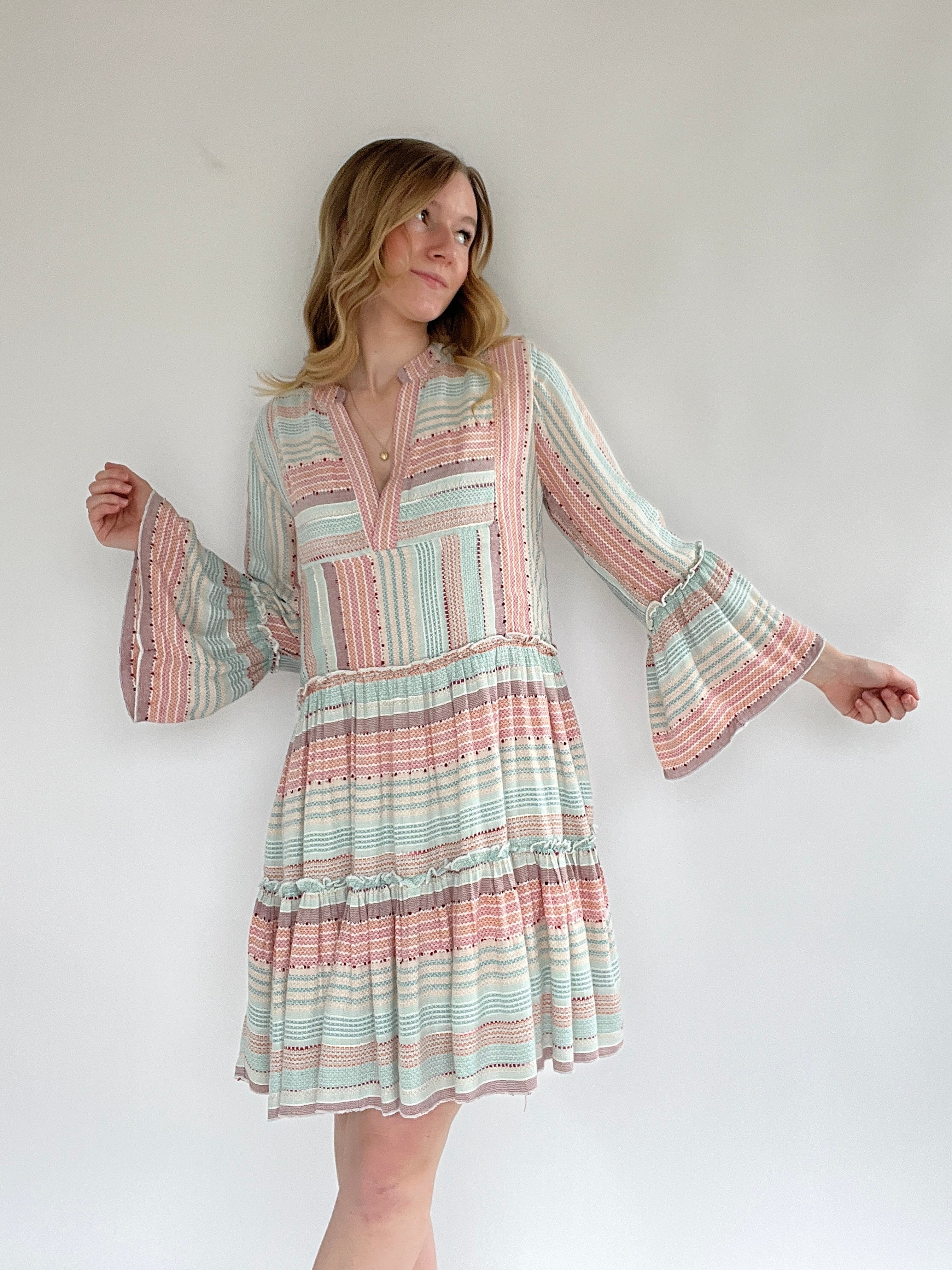 This light blue and red multi striped mini dress is a cute casual dress for running around town or even to church! It has a notched v-neckline with bell sleeves and tiered bottom with ruffle accents. Pair with sandals, sneakers or even boots!