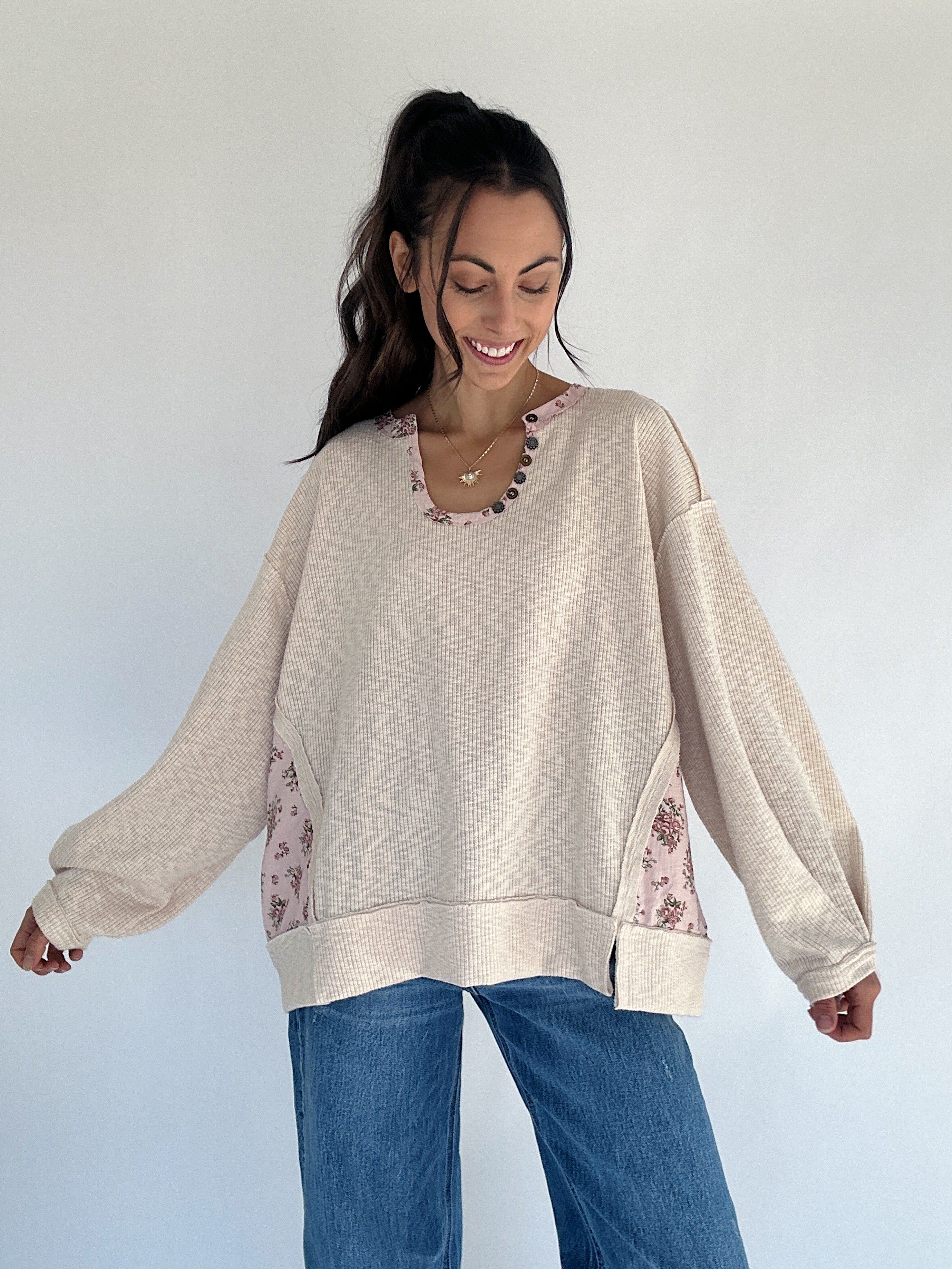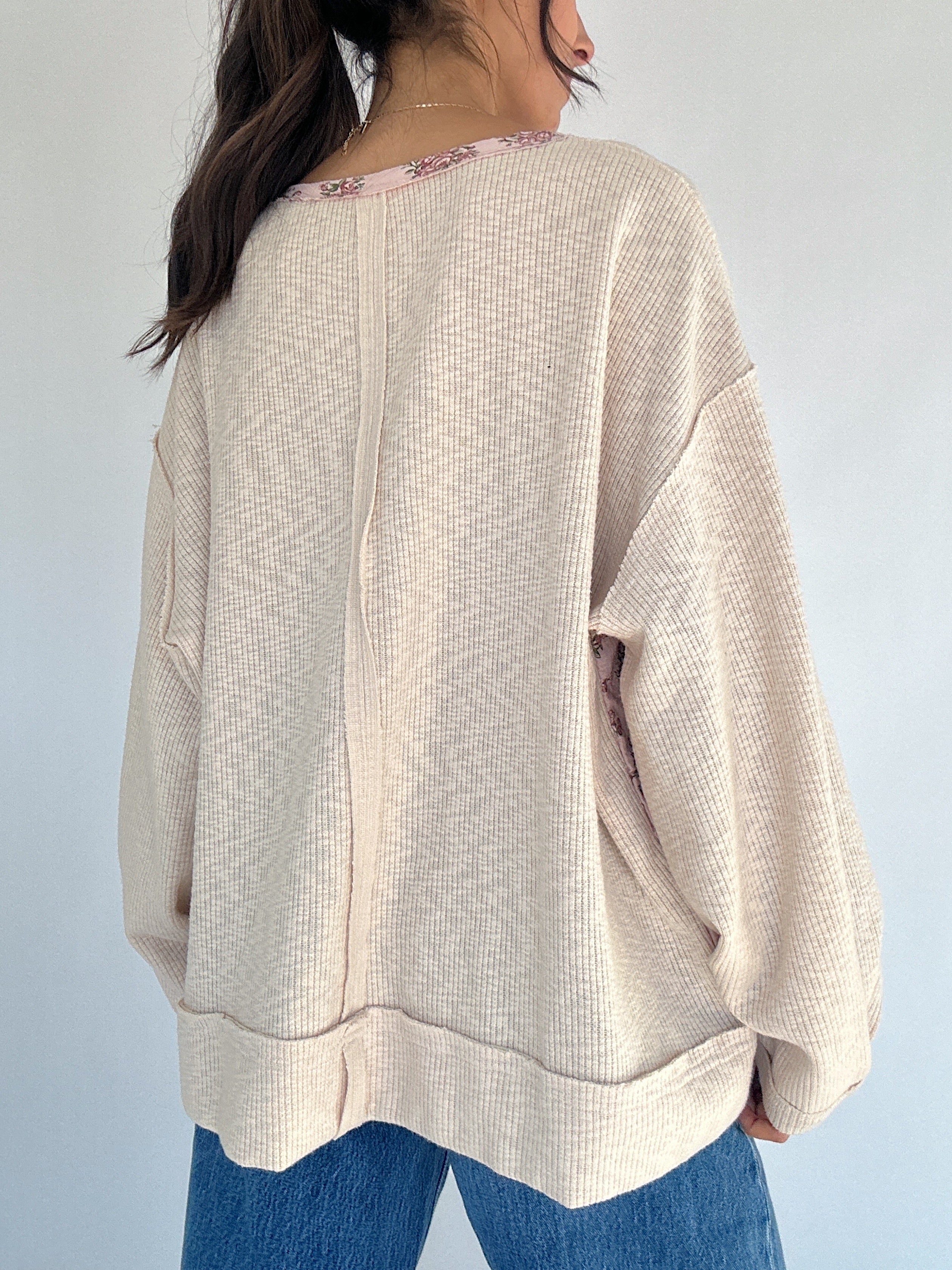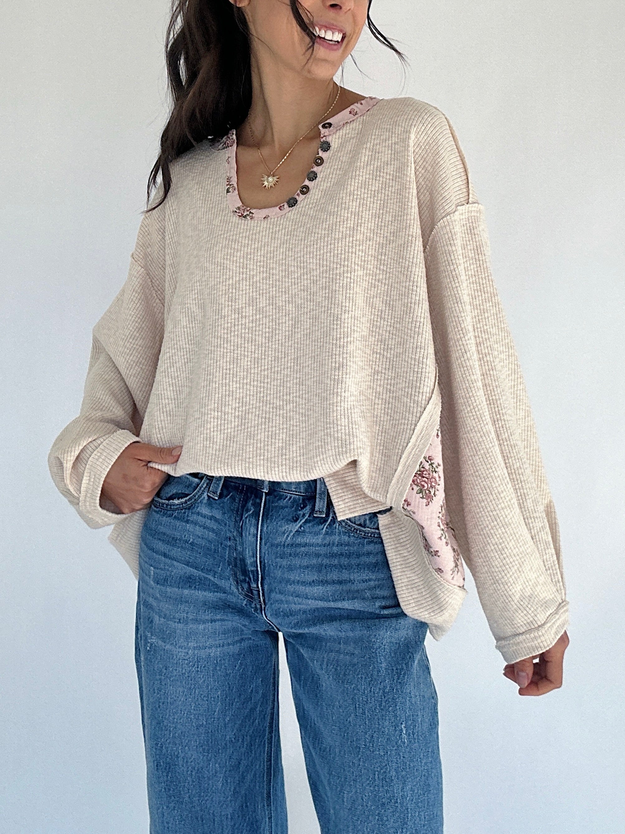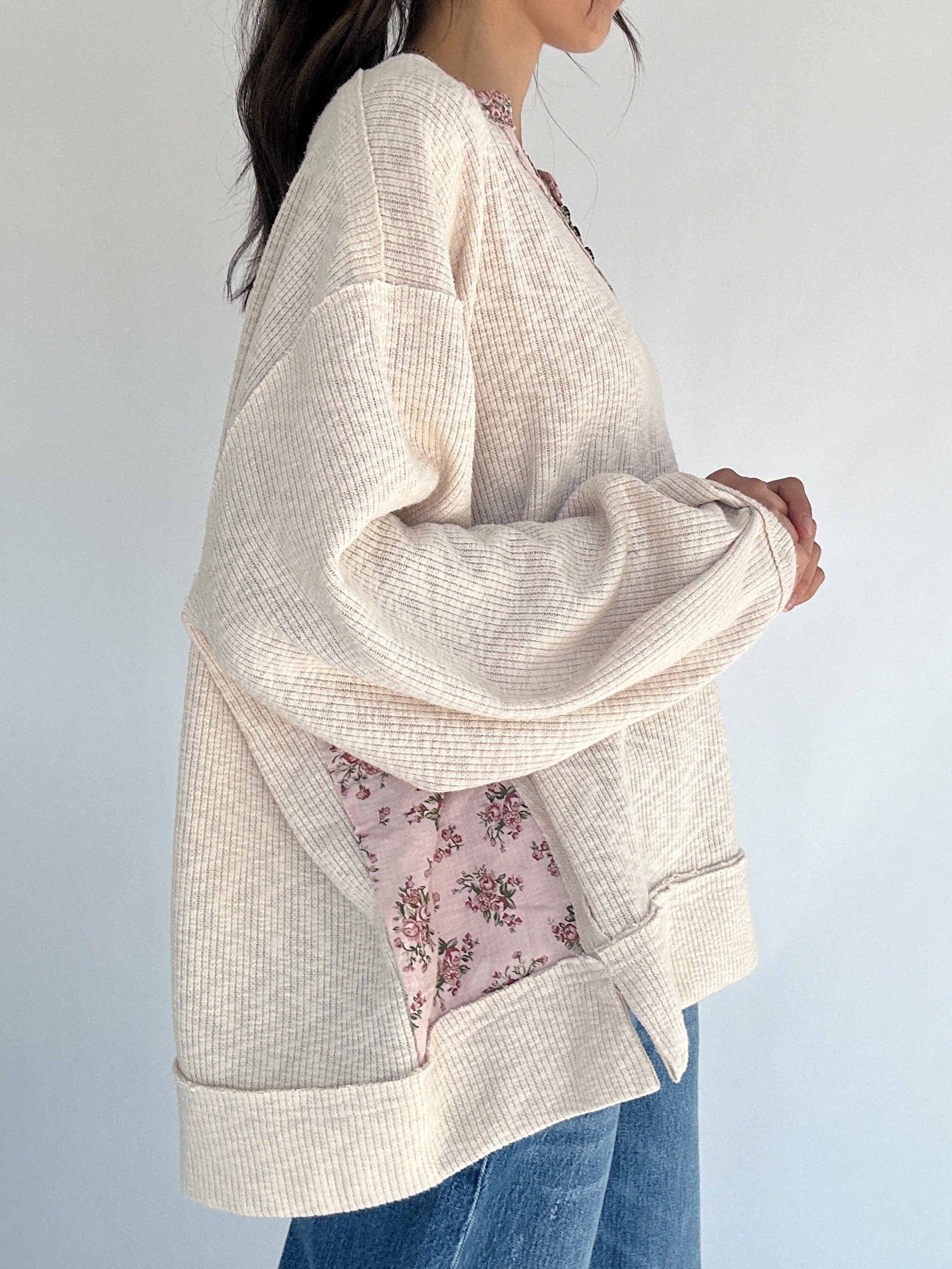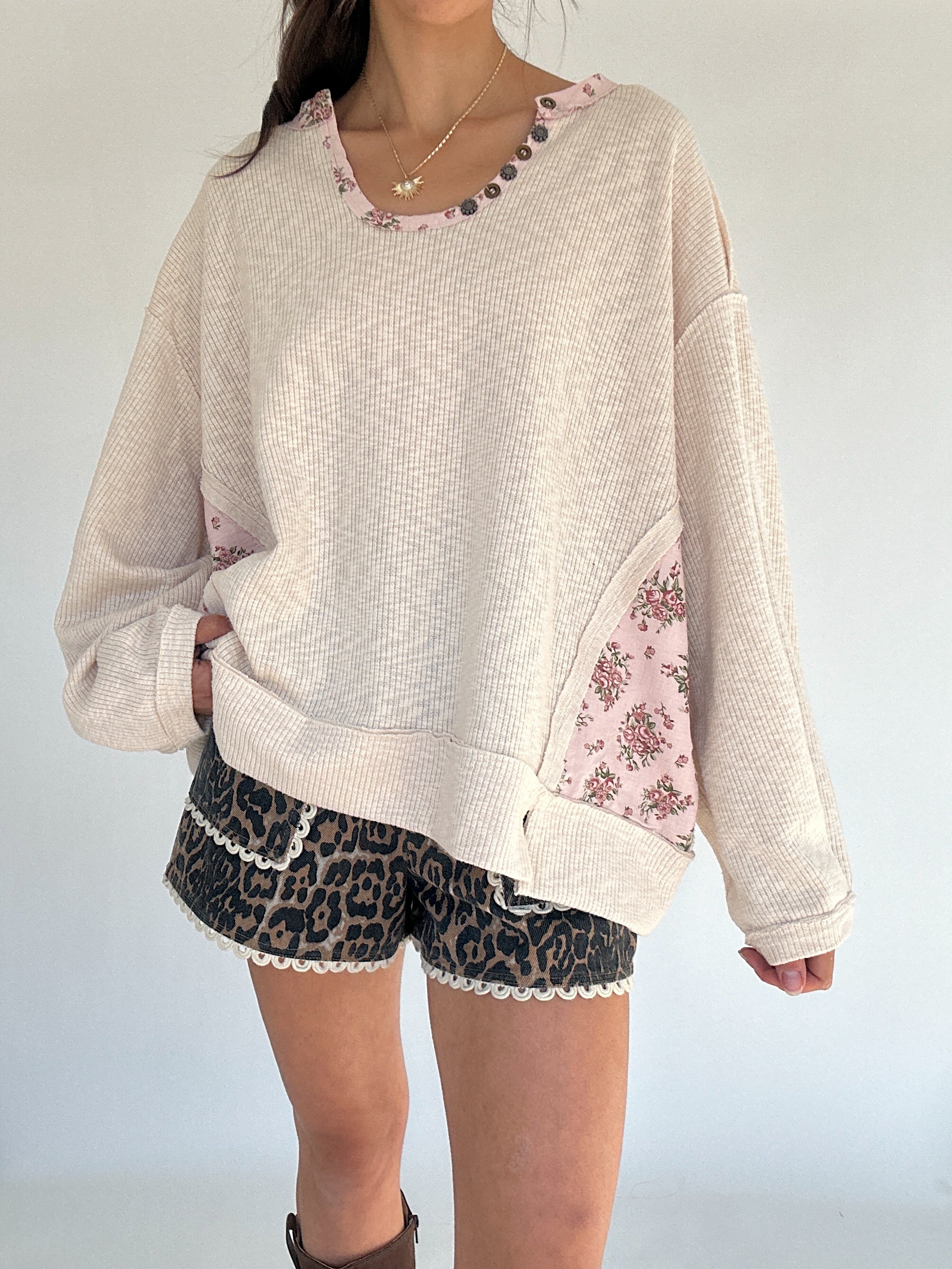✶ Oatmeal ribbed knit with floral trim + side panel patches