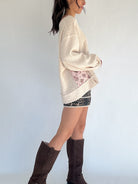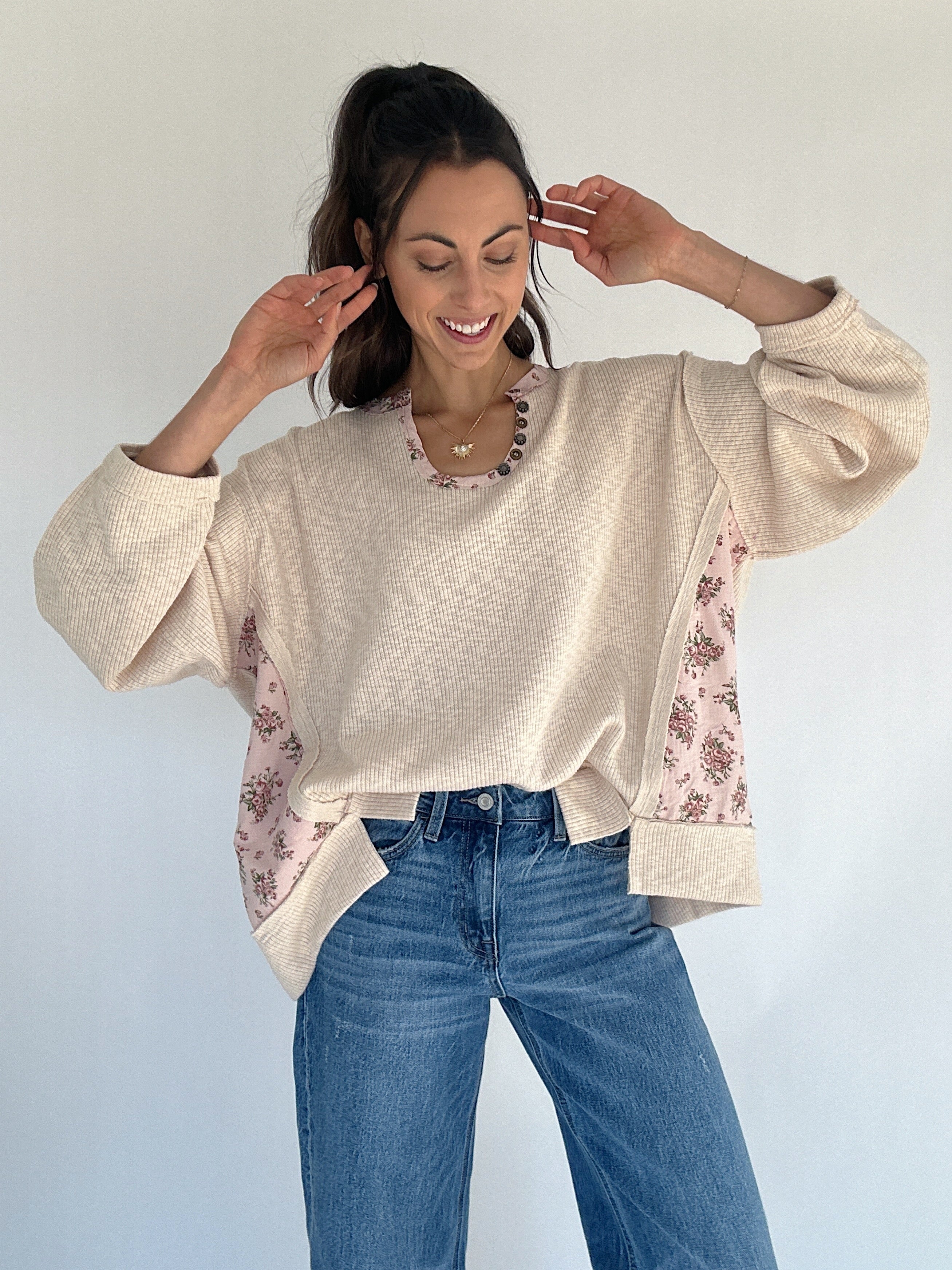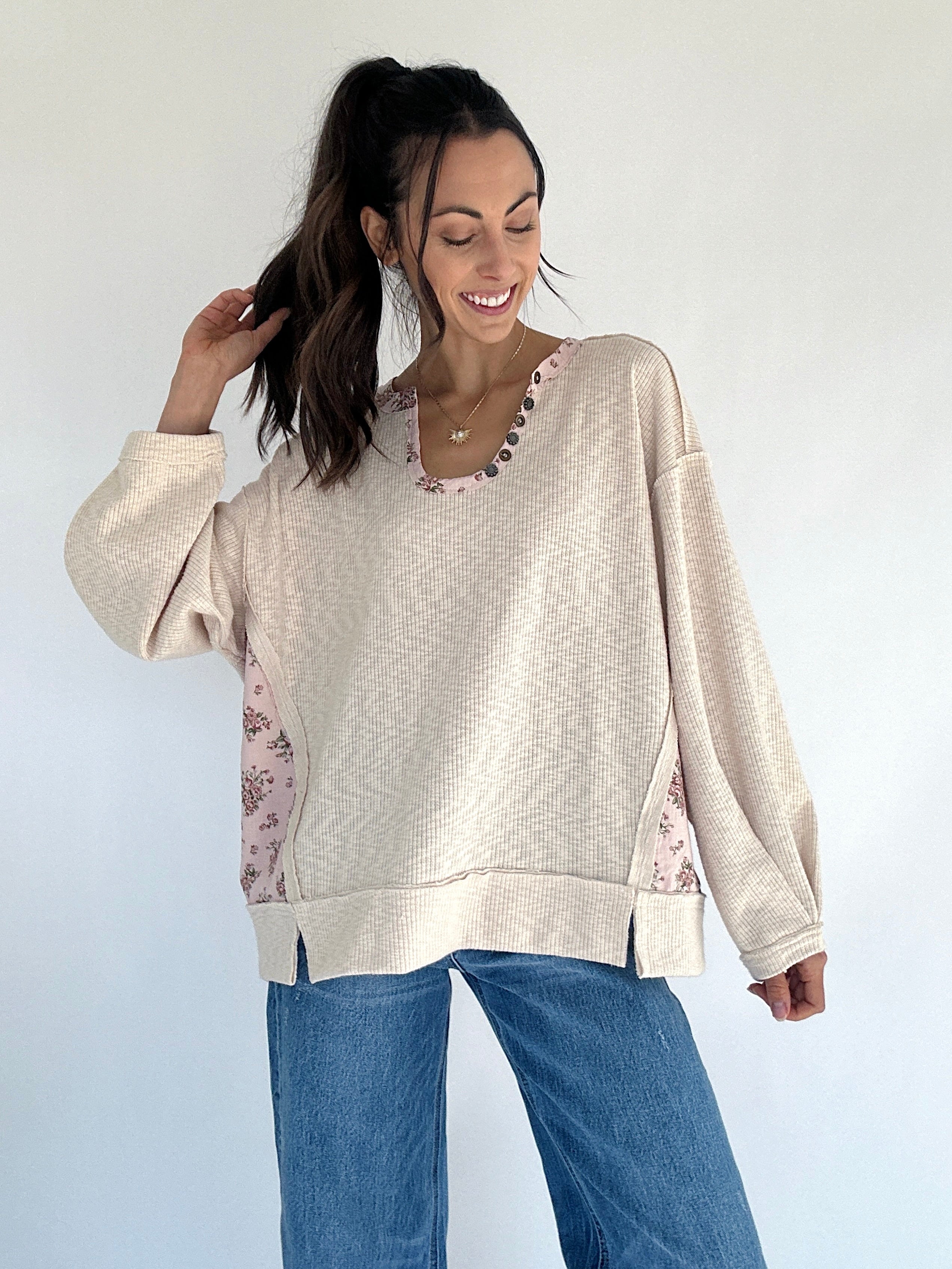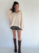 The Wherever You Are Pullover is that cozy, romantic layer you’ll reach for again and again. Made from soft oatmeal ribbed knit, it features sweet floral accents along the neckline and side panels for a feminine touch. The scoop neckline with button detail, dropped shoulders, and slight balloon sleeves create a relaxed, oversized fit that feels effortlessly cozy and put together all at once.