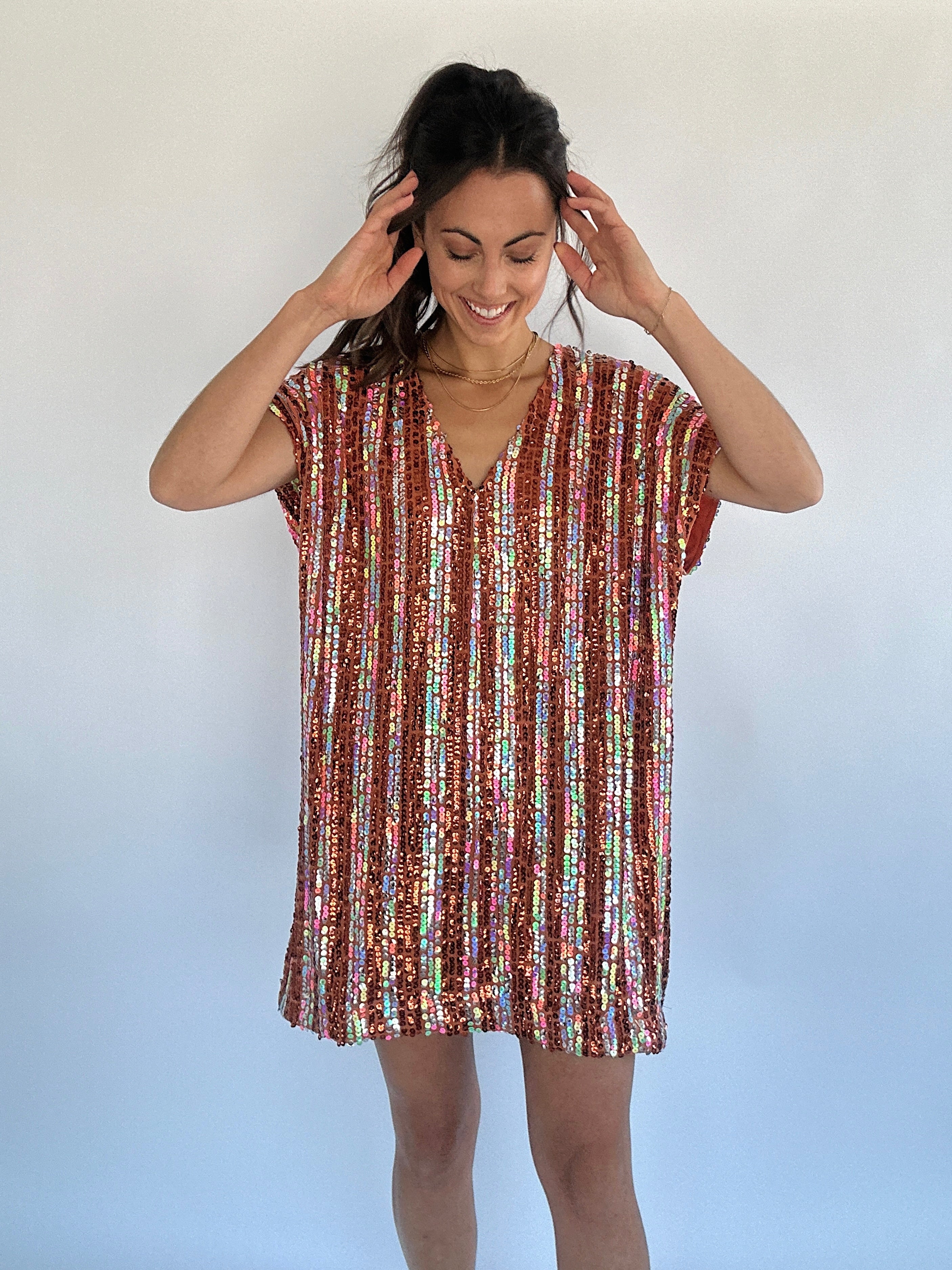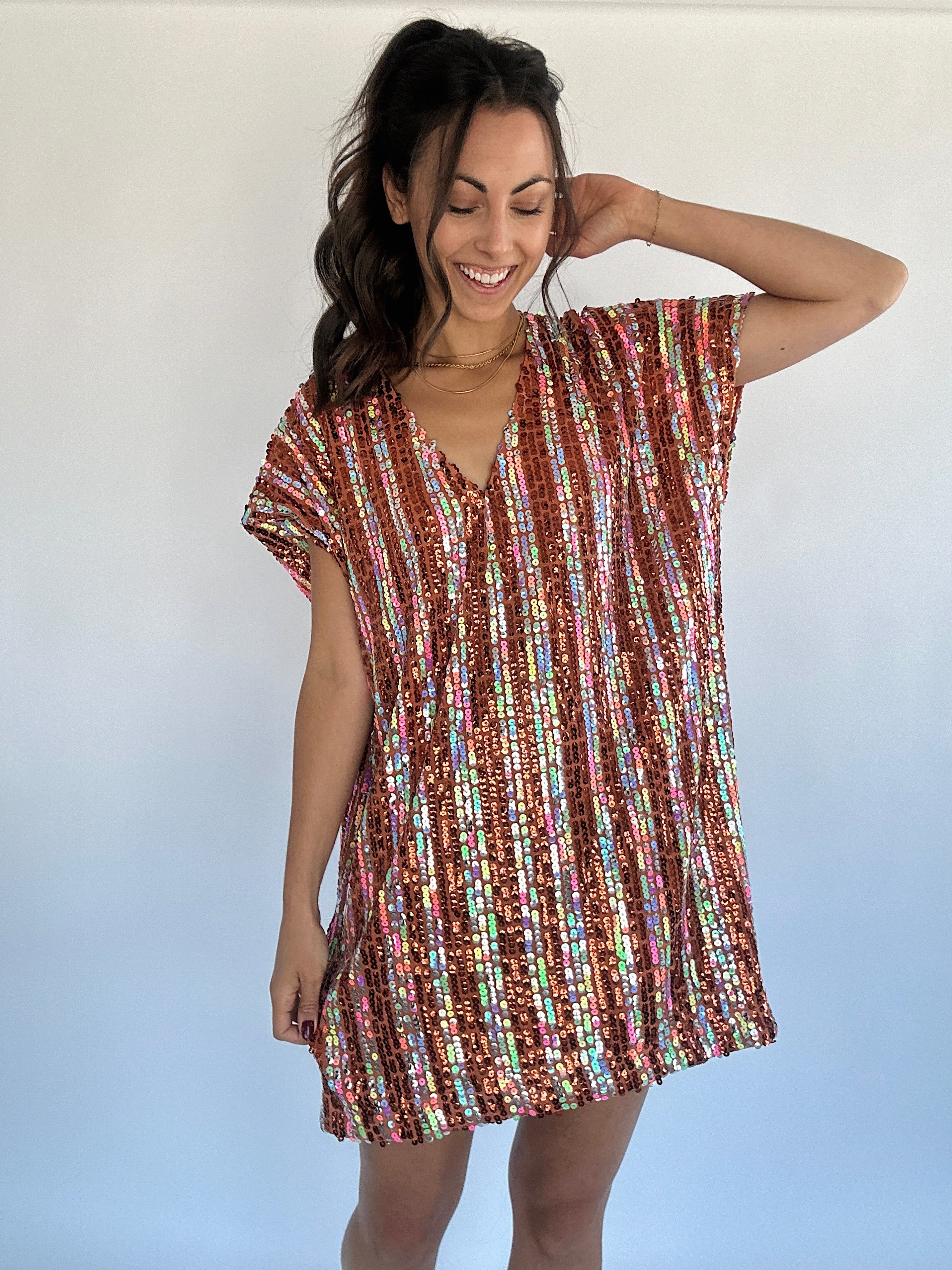 The perfect pick for holiday paries, concerts, bachelorette nights, and any moment you want a little sparkle! This burnt orange sequin t-shirt dress brings all the fun with its striped pattern and deep V-neckline, all wrapped up in an easy, relaxed fit you can dance in all night!