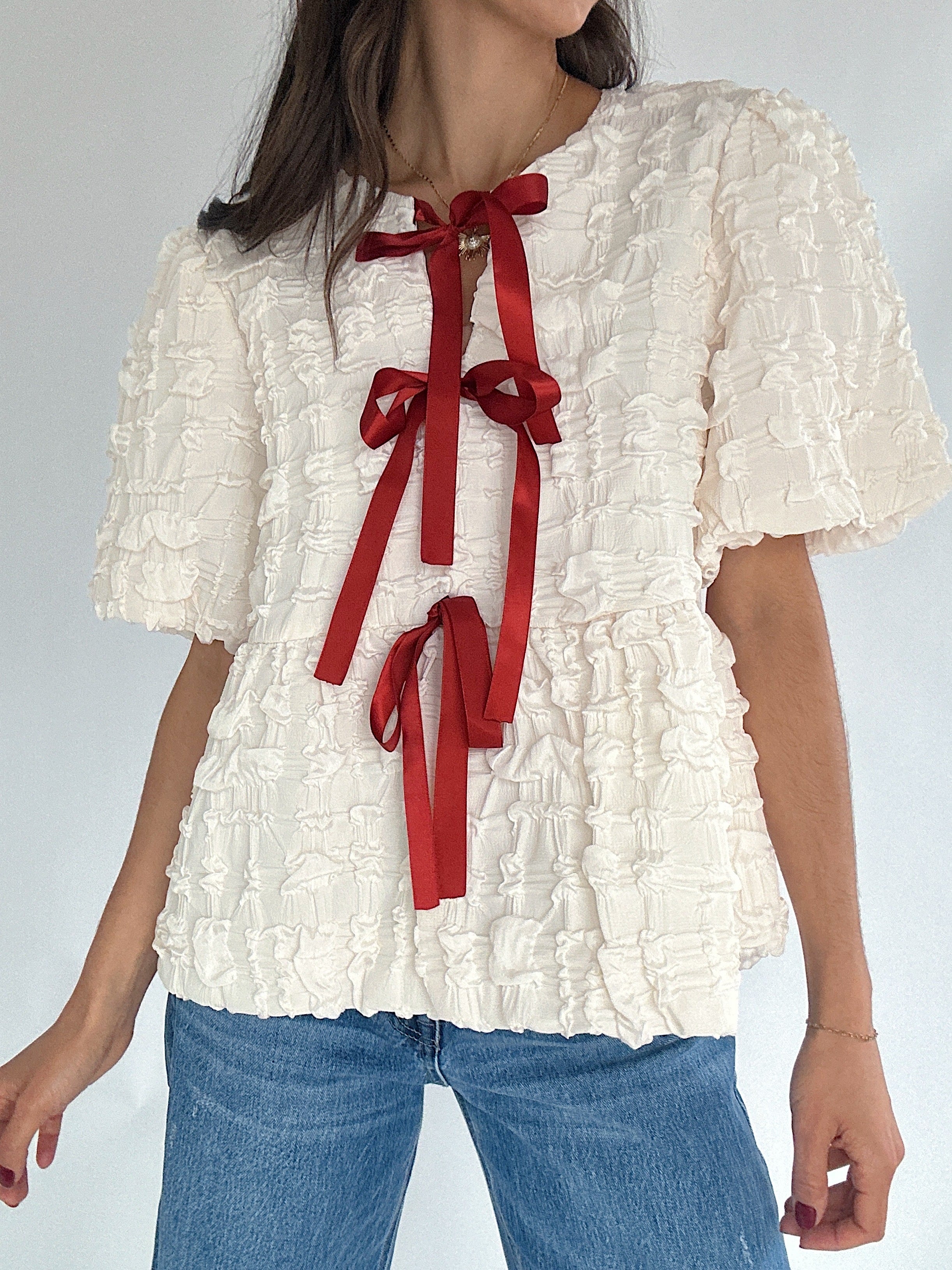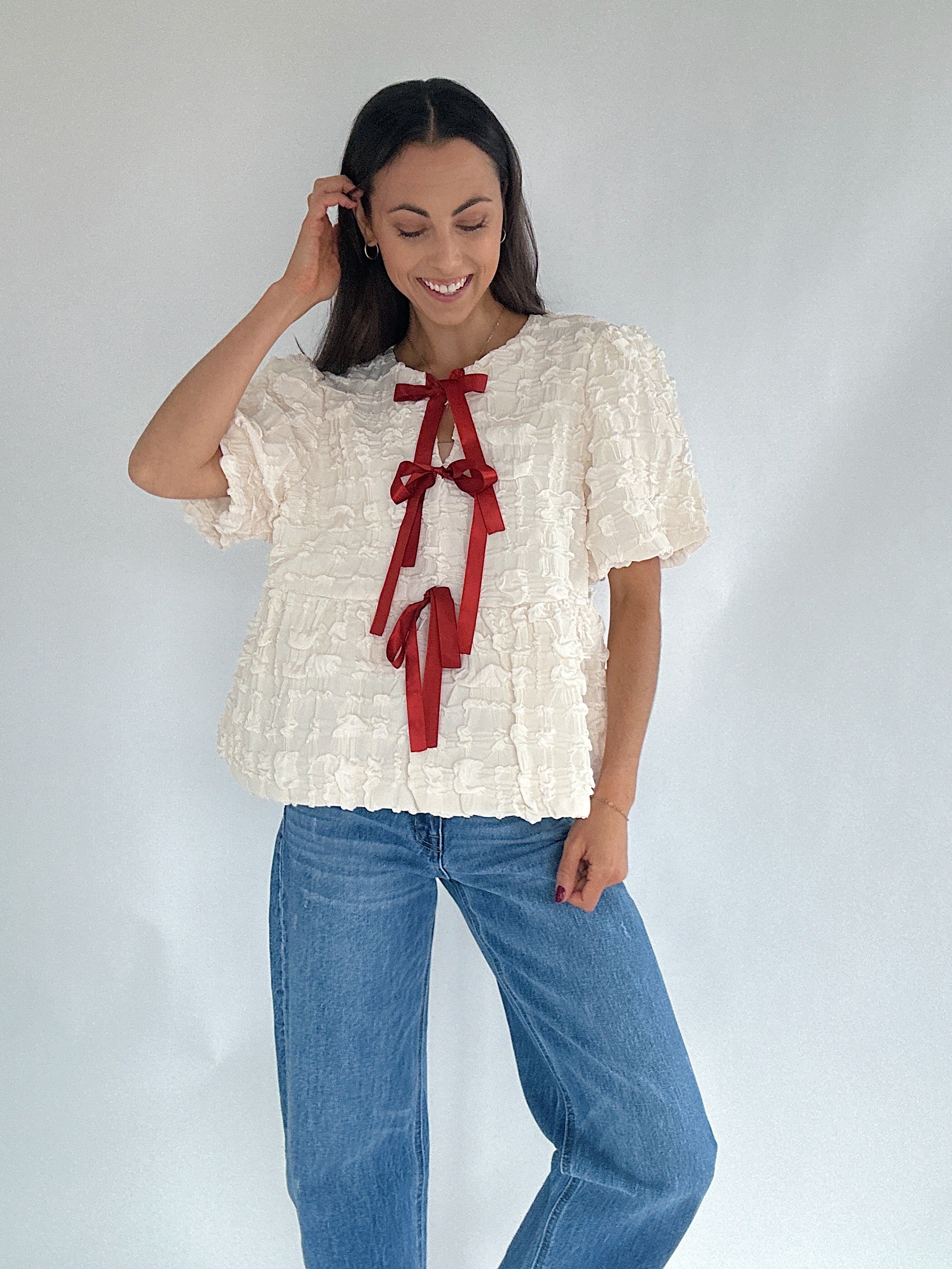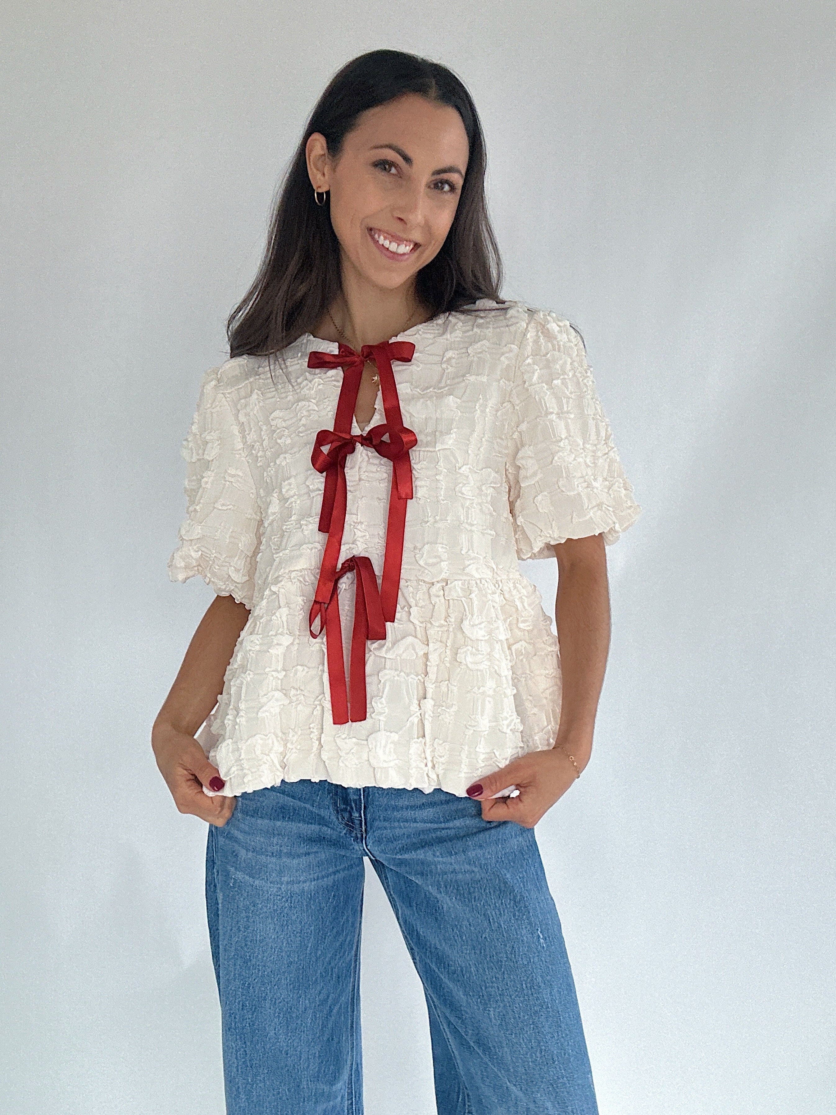 This cream textured top has a slight peplum silhouette with puff sleeves and red bow tie accents. Pair with denim jeans and some red slingbacks for a sweet and classic outfit!