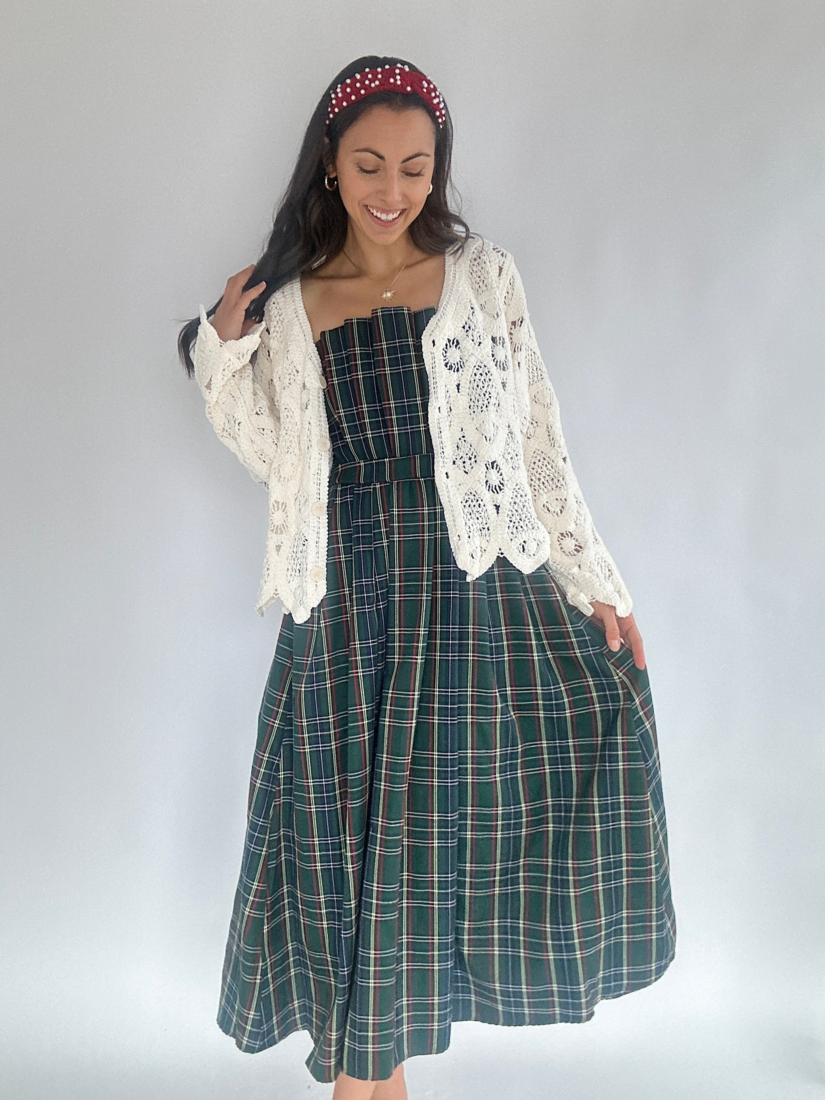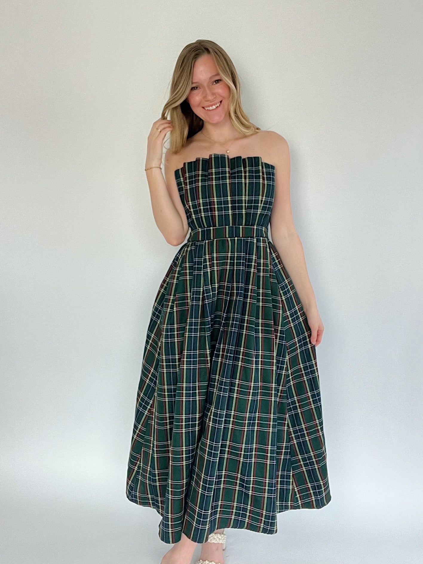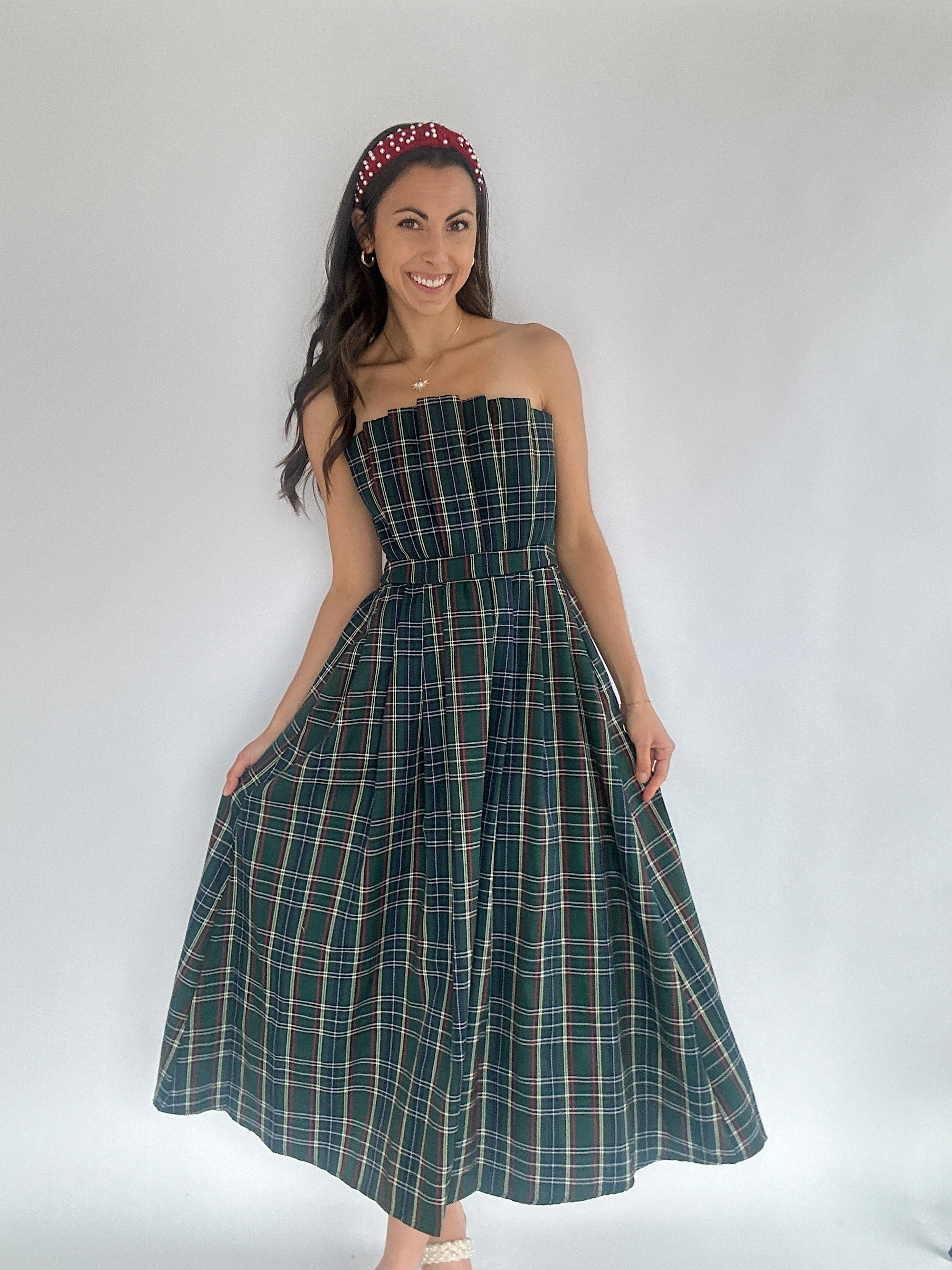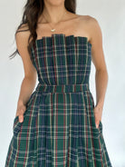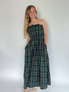 Be the talk of your holiday party in this green plaid strapless midi dress! It features a pleat detail at bust, smocking and zipper closure at back with pockets at sides. It's a comfortable fit that you'll be able to wear dancing into the night!