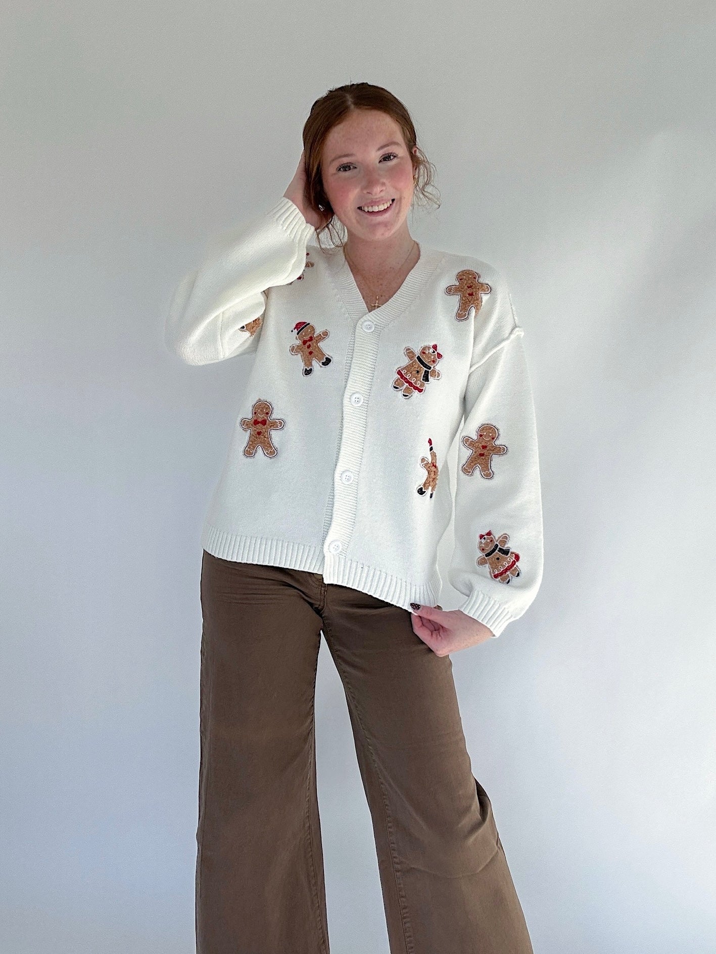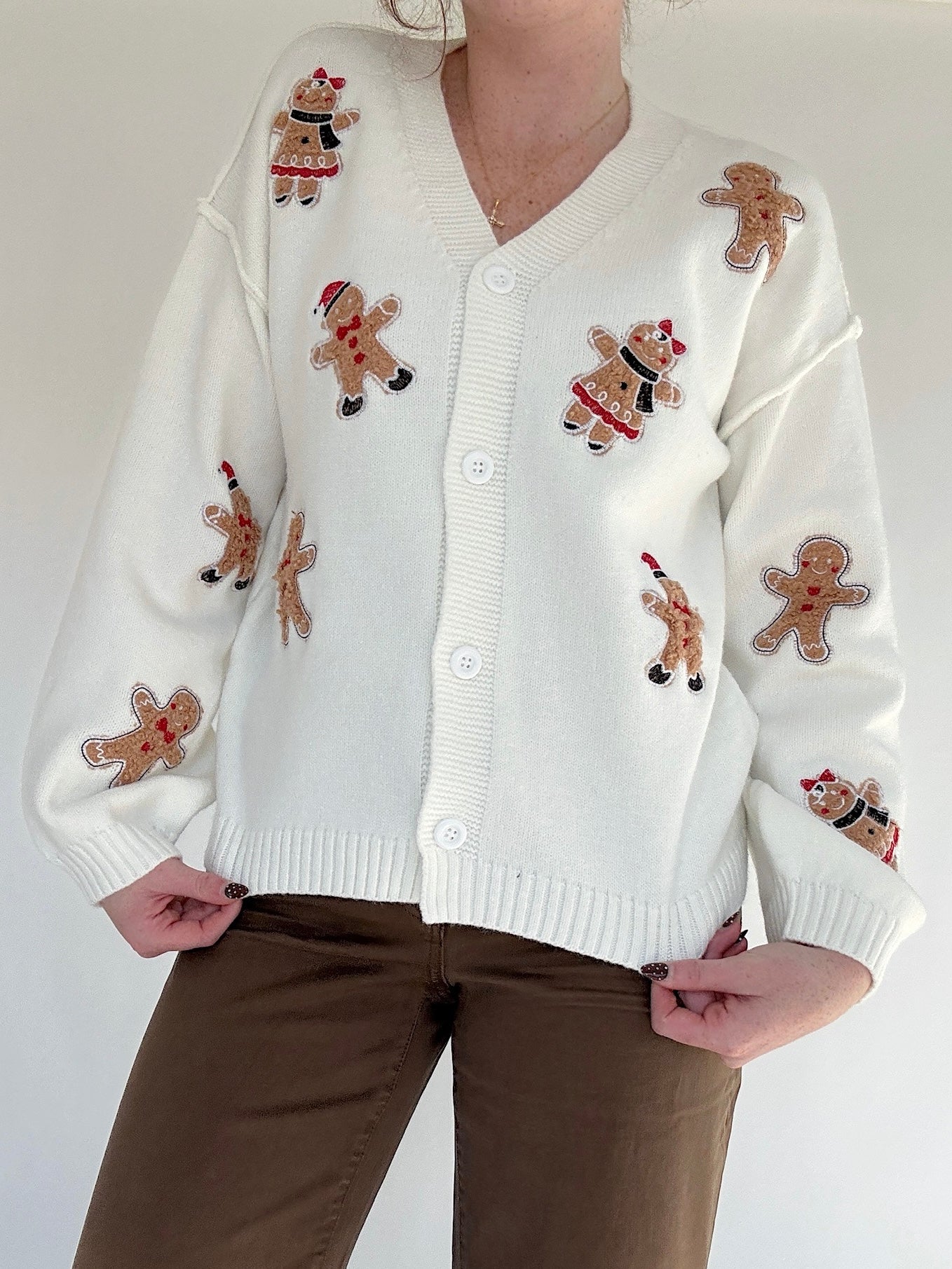 Cozy, festive, and just the right amount of holiday cheer—the Gingy Patch Cardigan is made for cookie baking days, coffee runs, and every “throw it on and feel cute” moment in between. The ivory knit keeps it soft and neutral, while playful gingerbread patches add a little extra joy—some dressed like Santa, some as sweet skirted gingerbread girls, and some just their classic cookie selves. With a relaxed fit and button-front design, it’s an easy layer you’ll reach for all season long.
