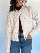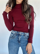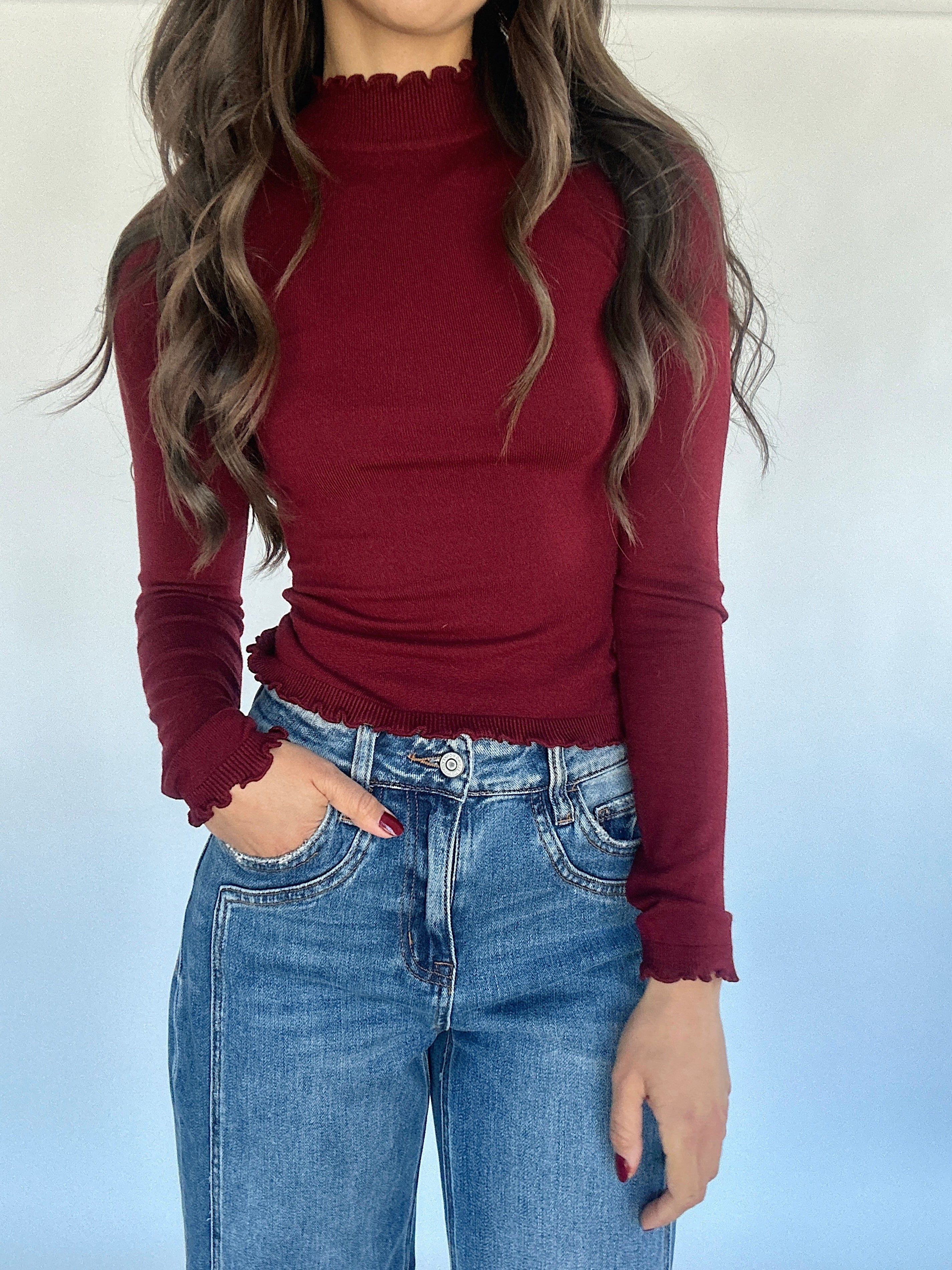 This fitted knit mock neck top has the cutest ruffled edge detail along the hems and cuffs. It's perfect for layering under vests, jackets and jumpers!