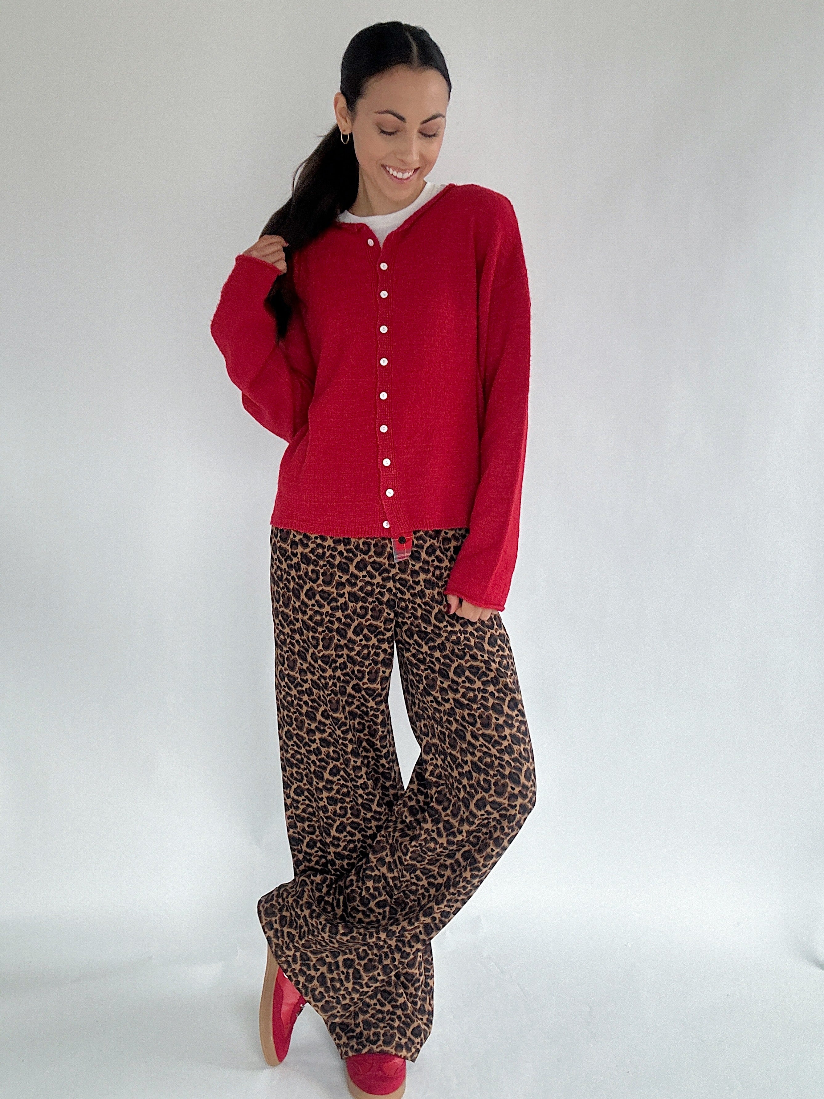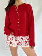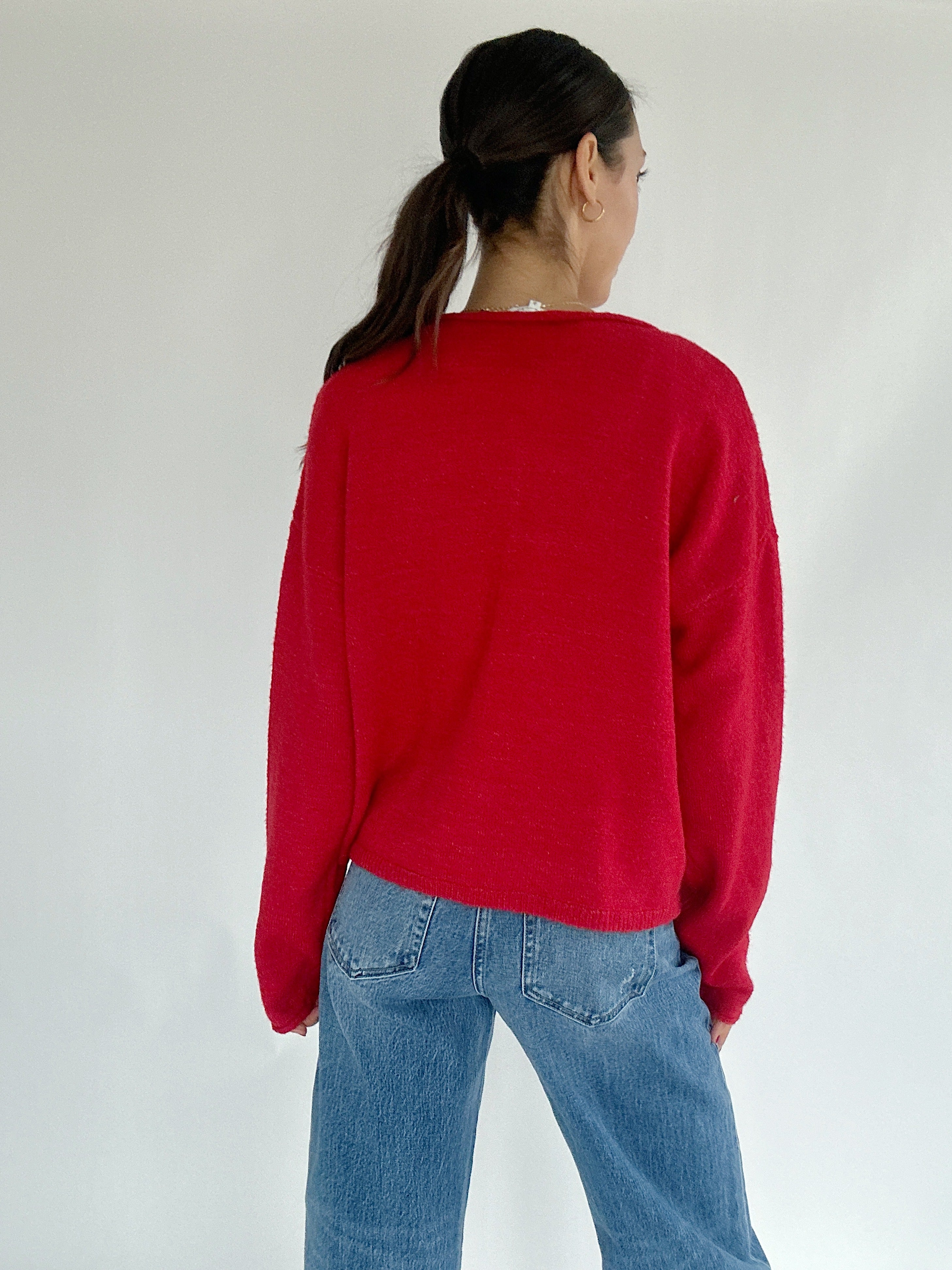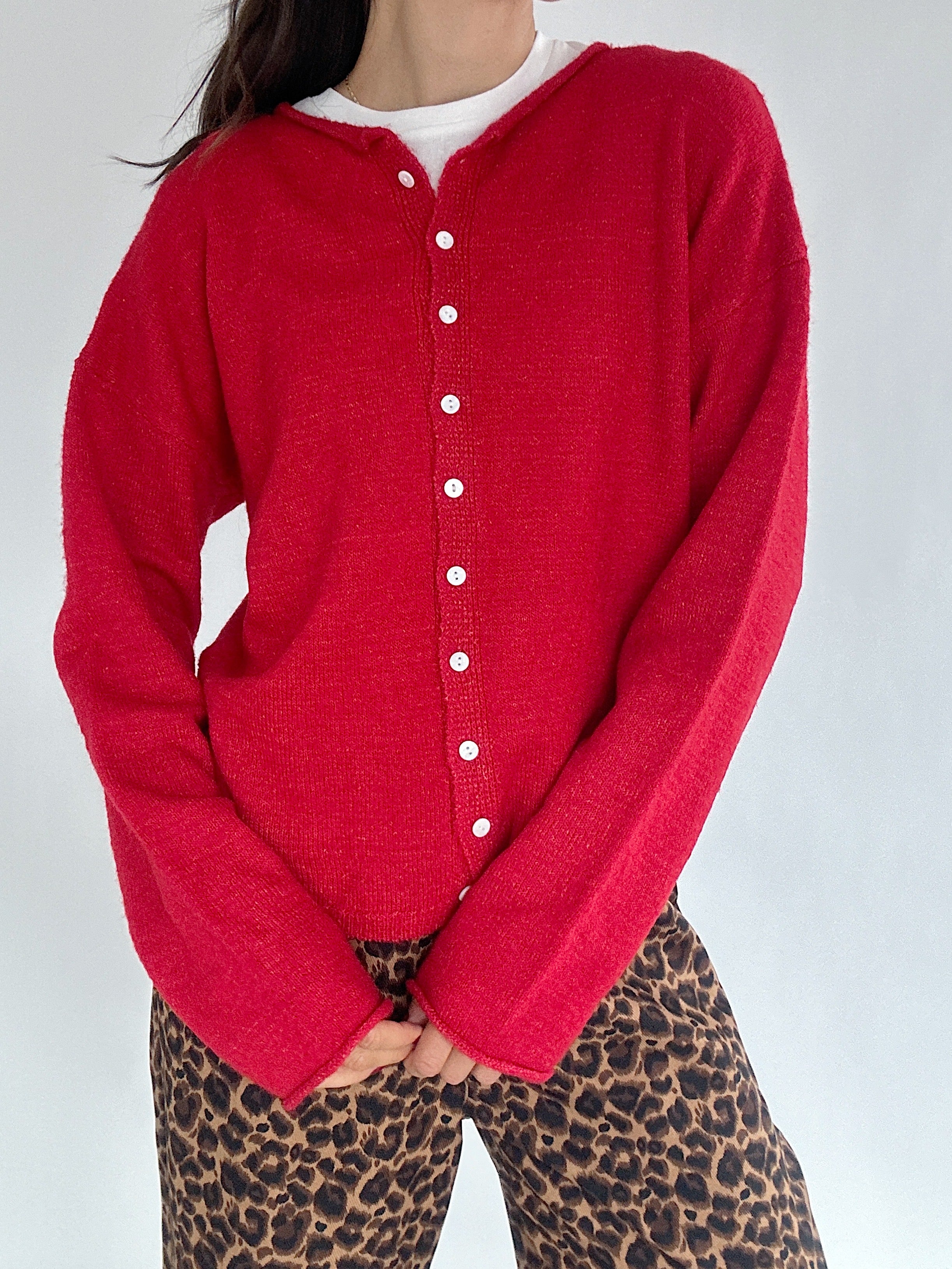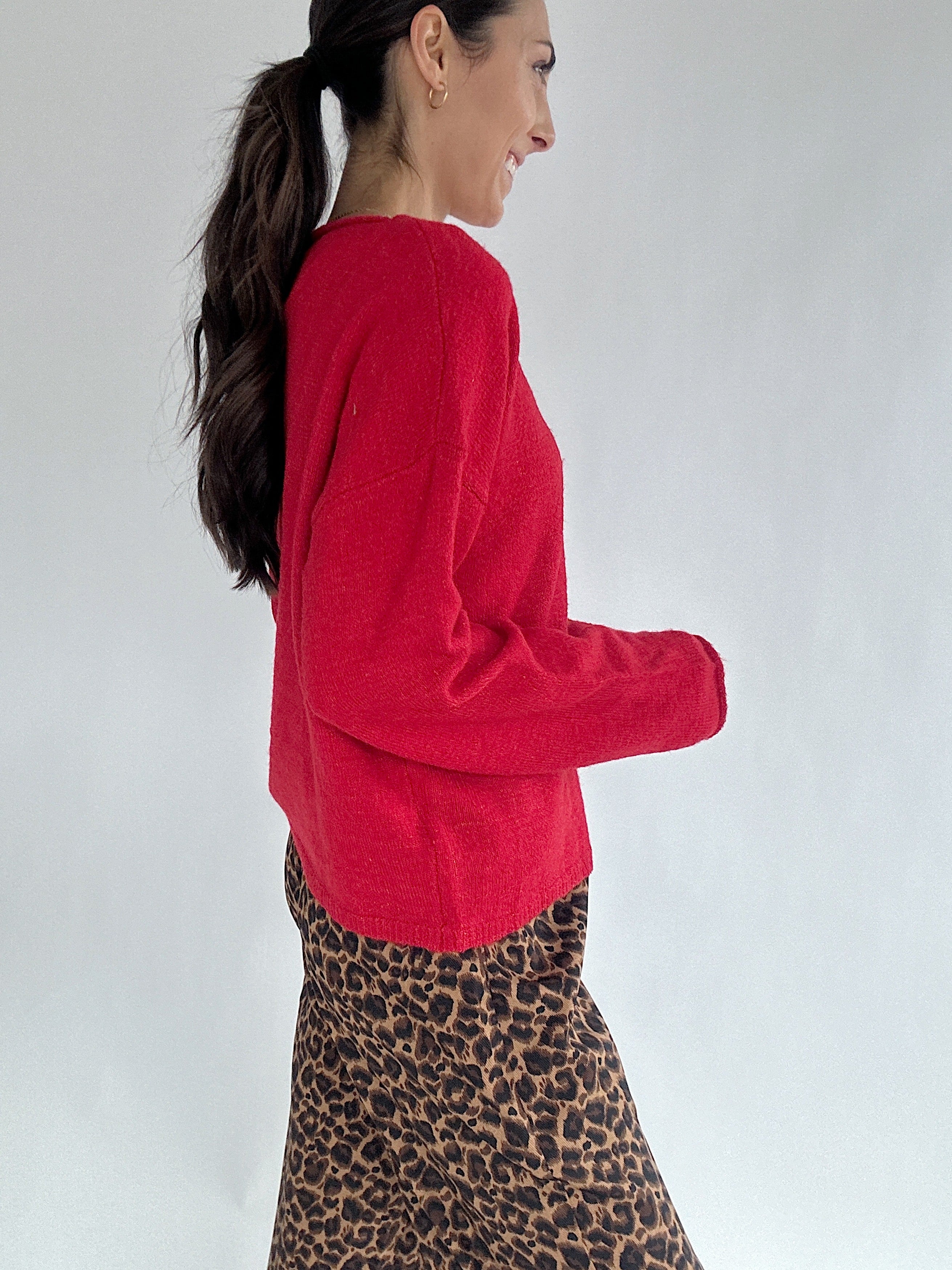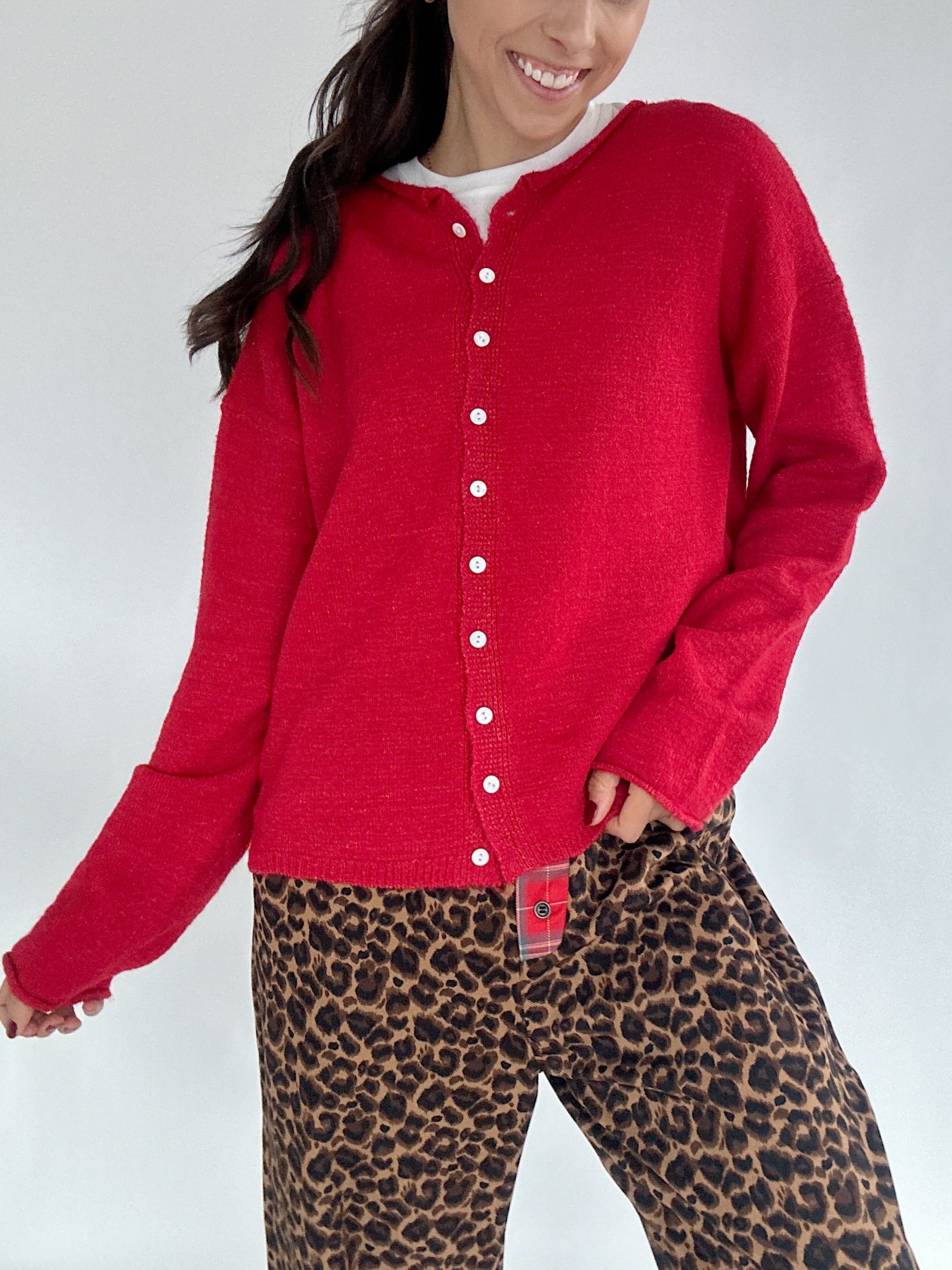 Timeless yet modern, the Jeanie Cardigan is the red staple you’ll reach for all year long. Featuring a rolled collar, button-down front, and long sleeves with dropped shoulders, it blends classic design with an easygoing, relaxed fit. The lightweight knit and ribbed hem detail make it versatile enough to wear on its own or layered as outerwear.