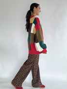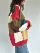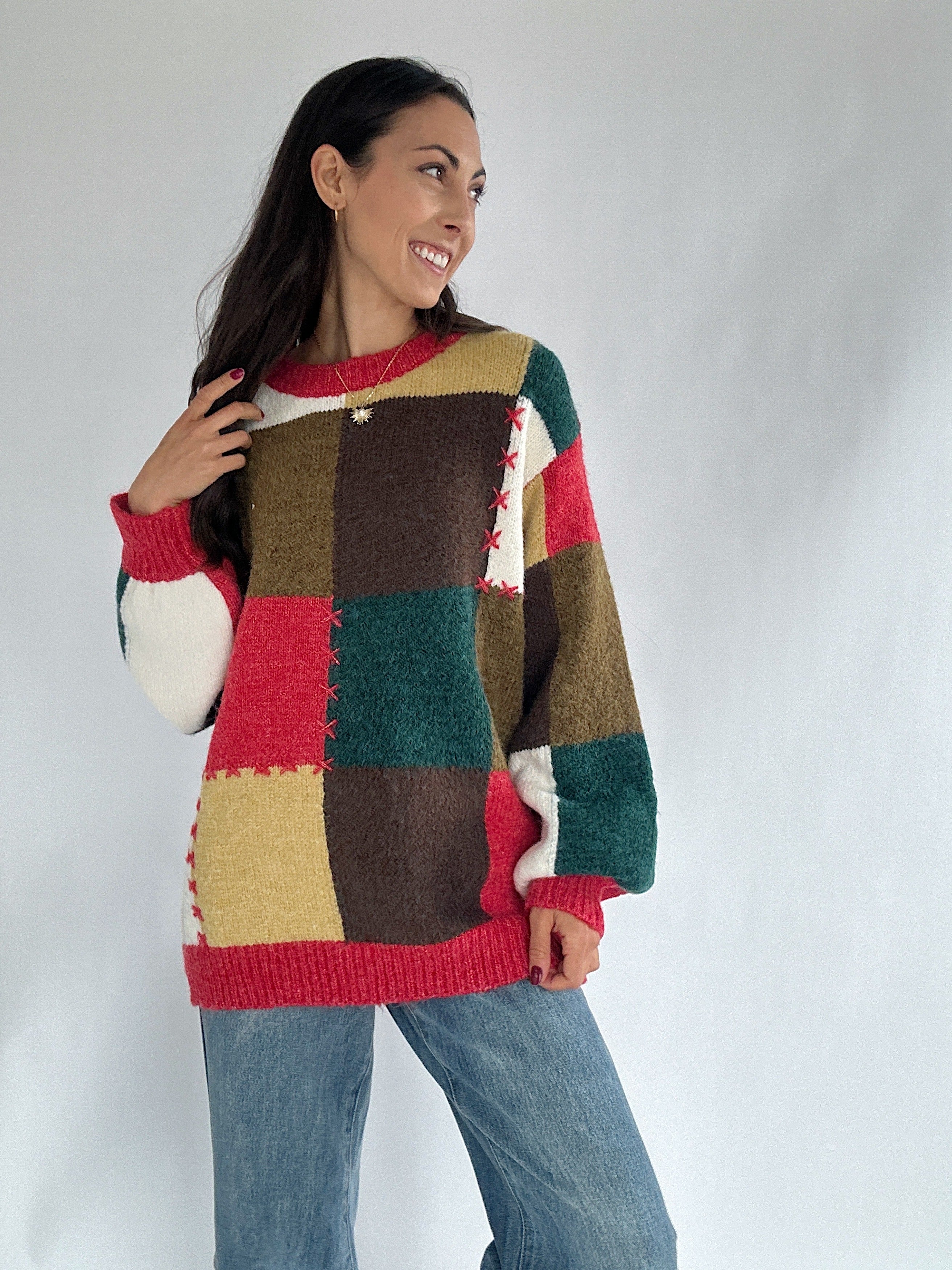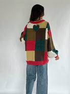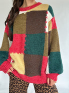 Retro-inspired and effortlessly cozy, the Marjorie Checkered Sweater is made for cool days with hot lattes and a good book. Designed in a bold mix of red, mustard, brown, teal, and cream, the checkered knit has a nostalgic, vintage feel. The crew neckline, ribbed hems, and balloon-style sleeves keep it classic, while subtle stitch accents and a sweet little heart detail on the back add a little personality. With its relaxed, oversized fit, this sweater is perfect for layering or wearing solo with leggings, jeans or wide leg pants.