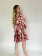 This red and white checkered tweed mini dress has a square neckline, 3/4 puff sleeves, a tiered bottom and side pockets. This would be so cute for the holidays!