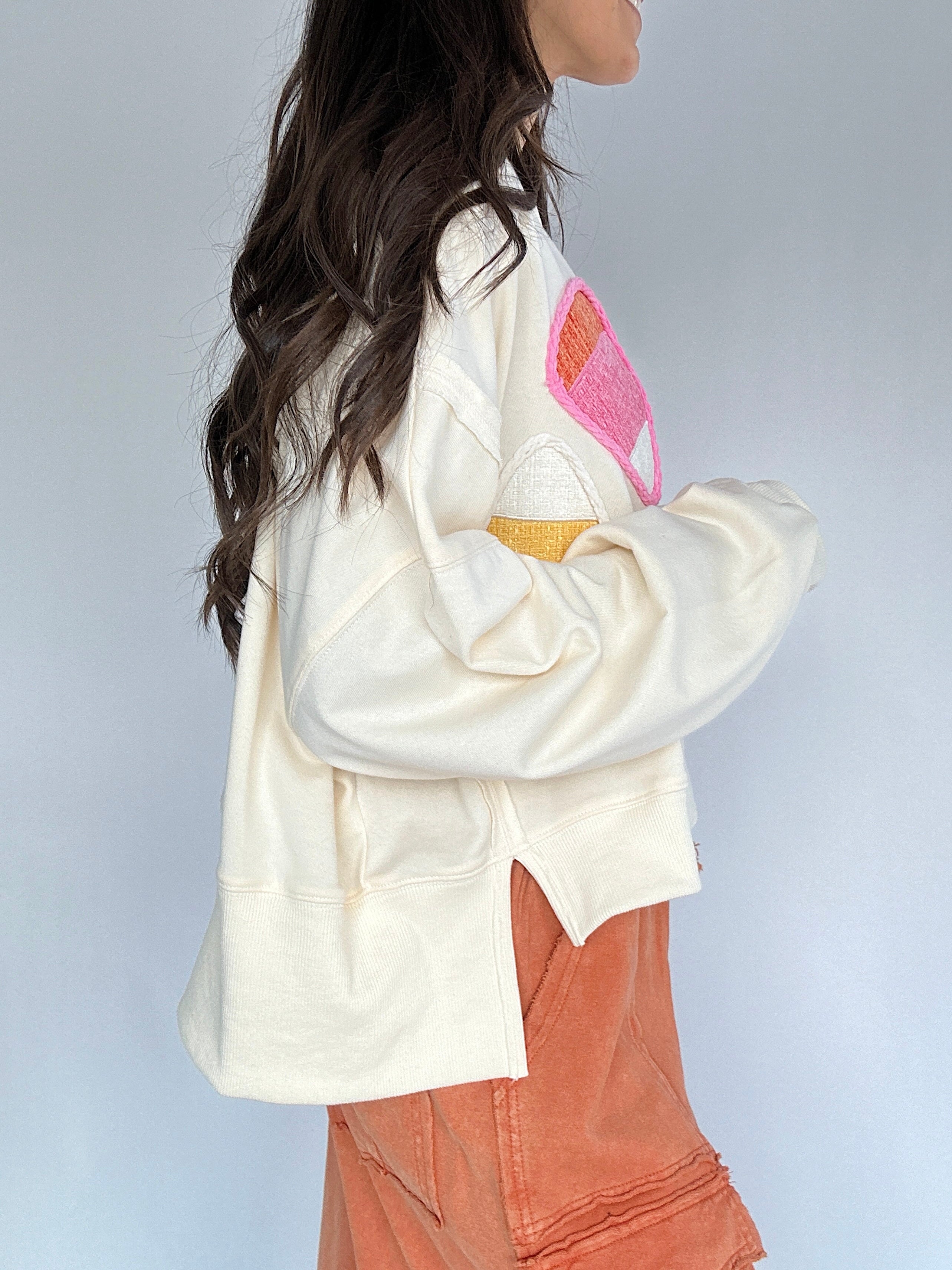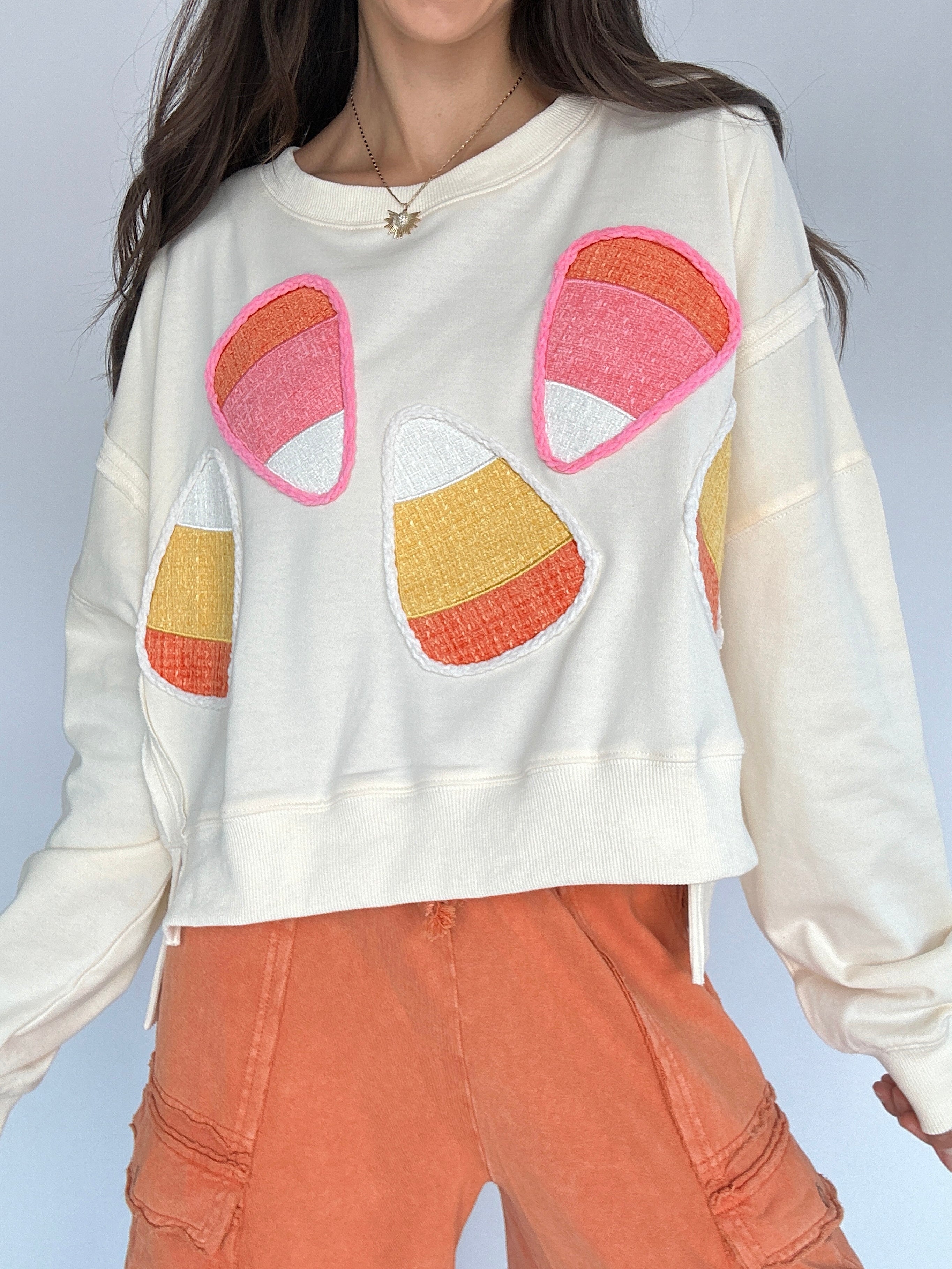 ✶ Cream terry knit with chenille candy corn patches