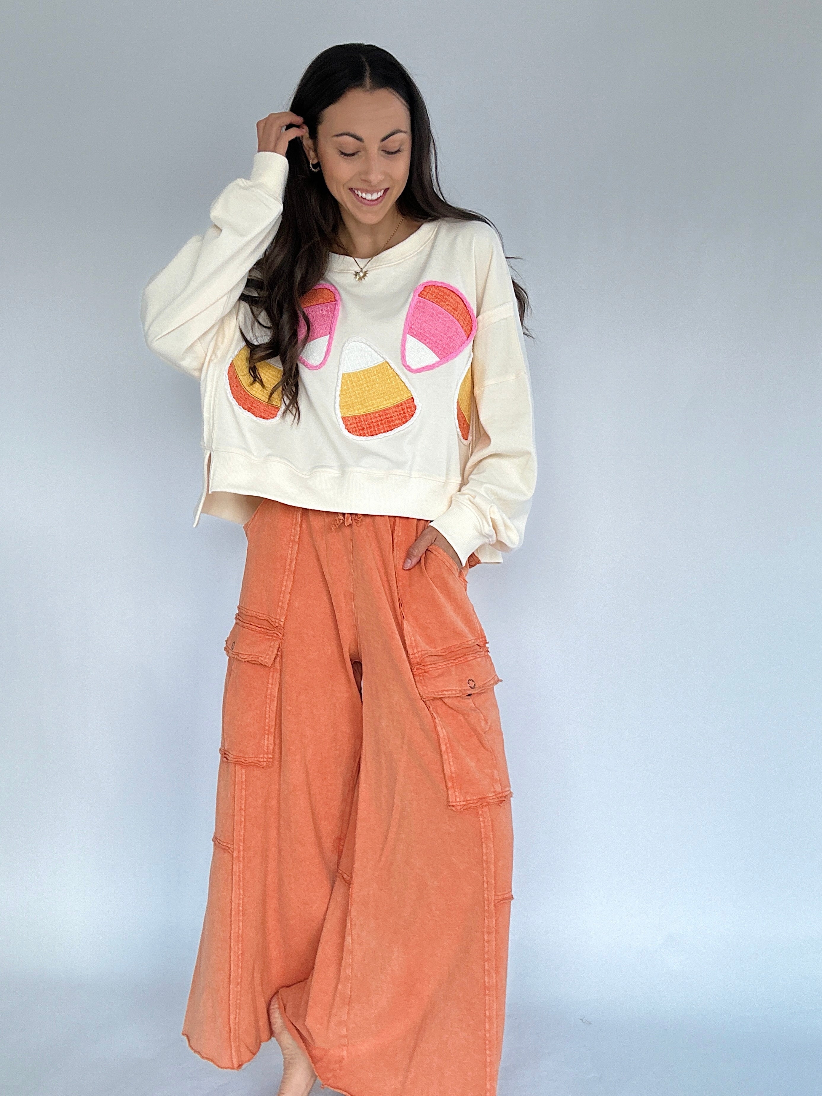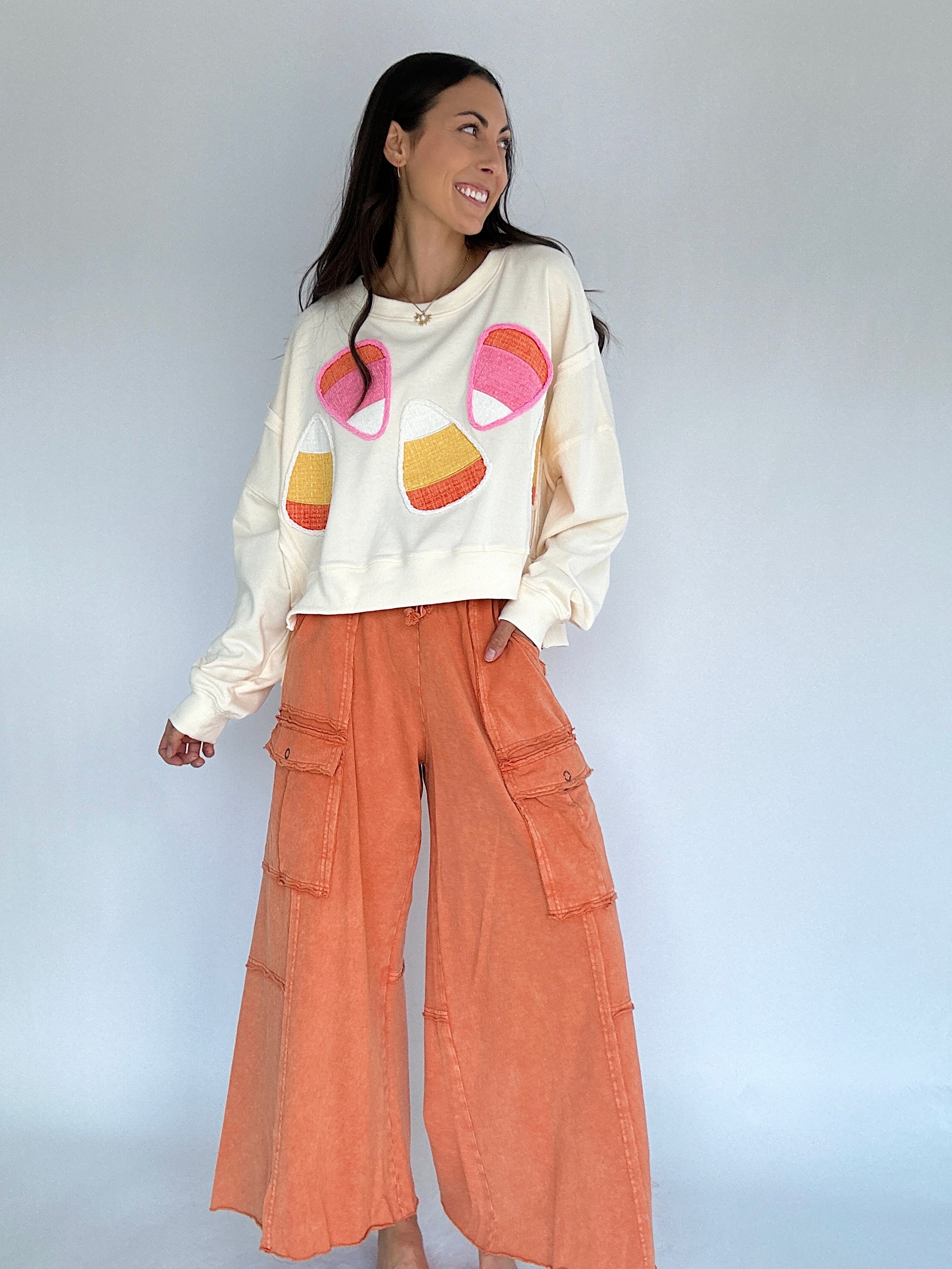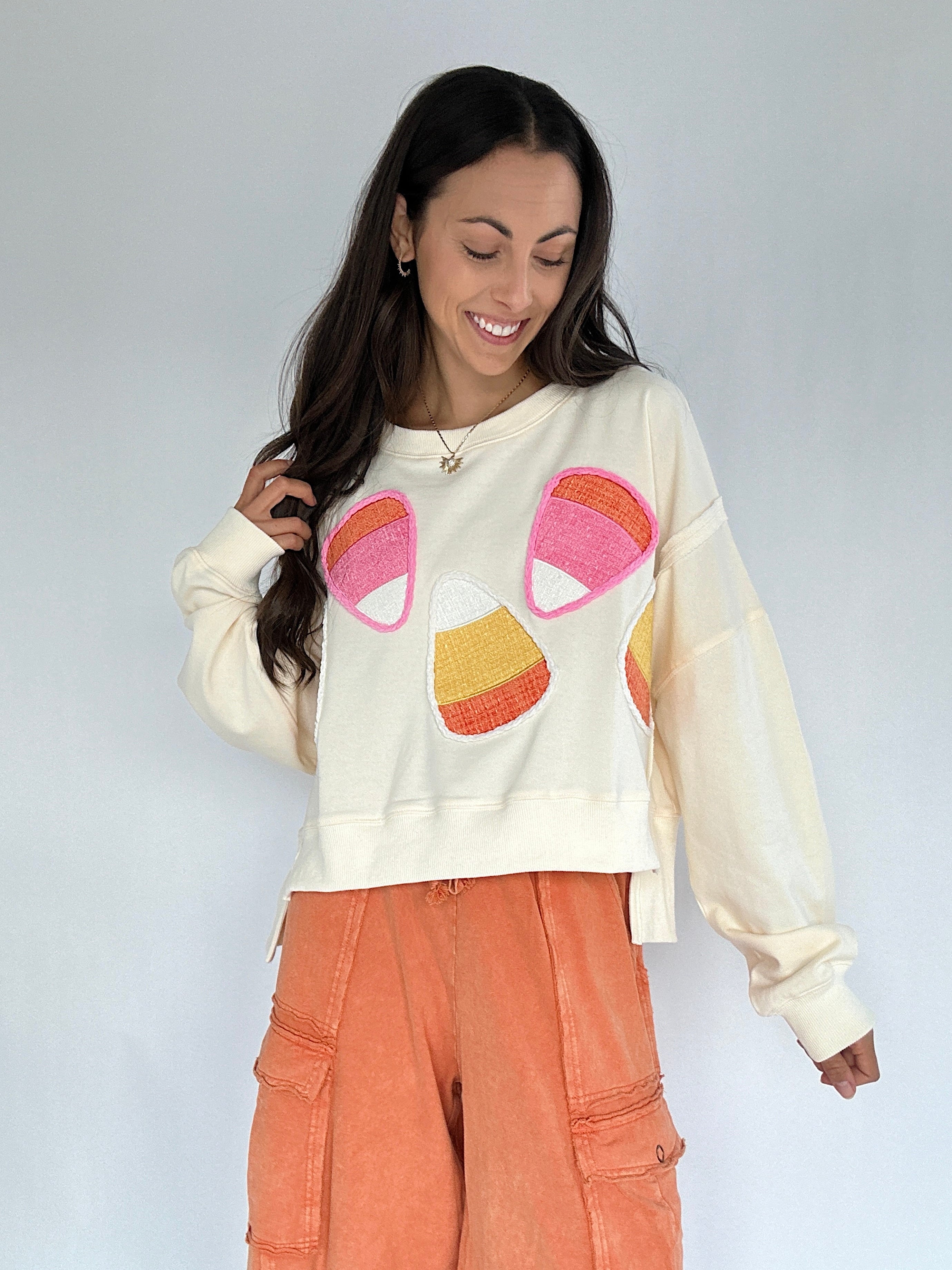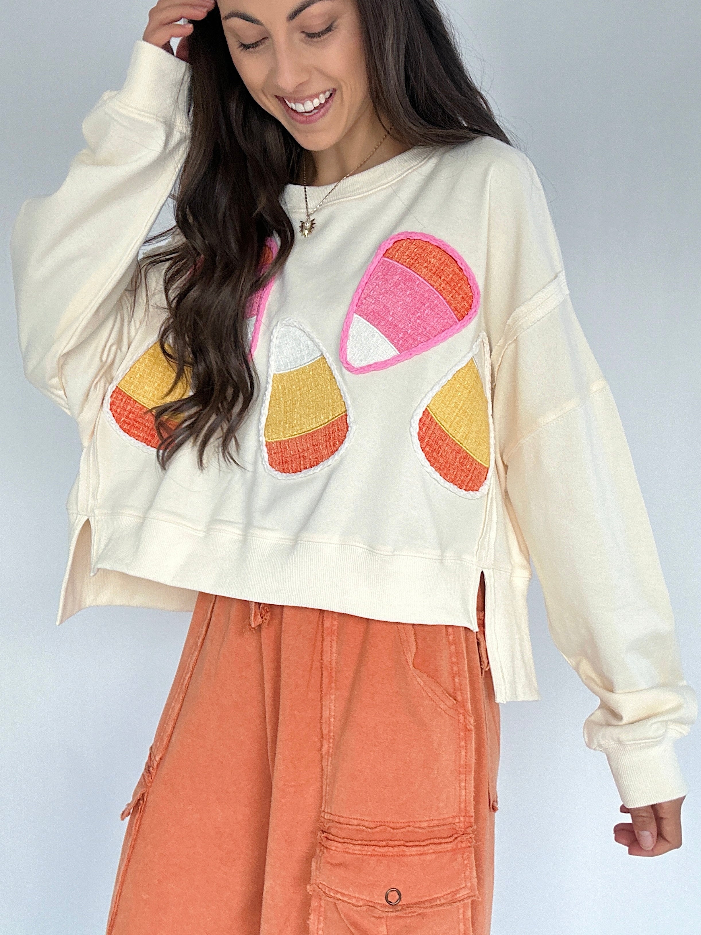 Cute, comfy + fun—the Candy Corn Cropped Pullover brings sweet fall vibes to your wardrobe. Cream terry knit with chenille candy corn patches makes it festive without being over-the-top, and the slightly cropped, boxy fit with side slits keeps it effortlessly wearable. Pair it with wide-leg sweatpants or your favorite jeans for a comfy, seasonal look!